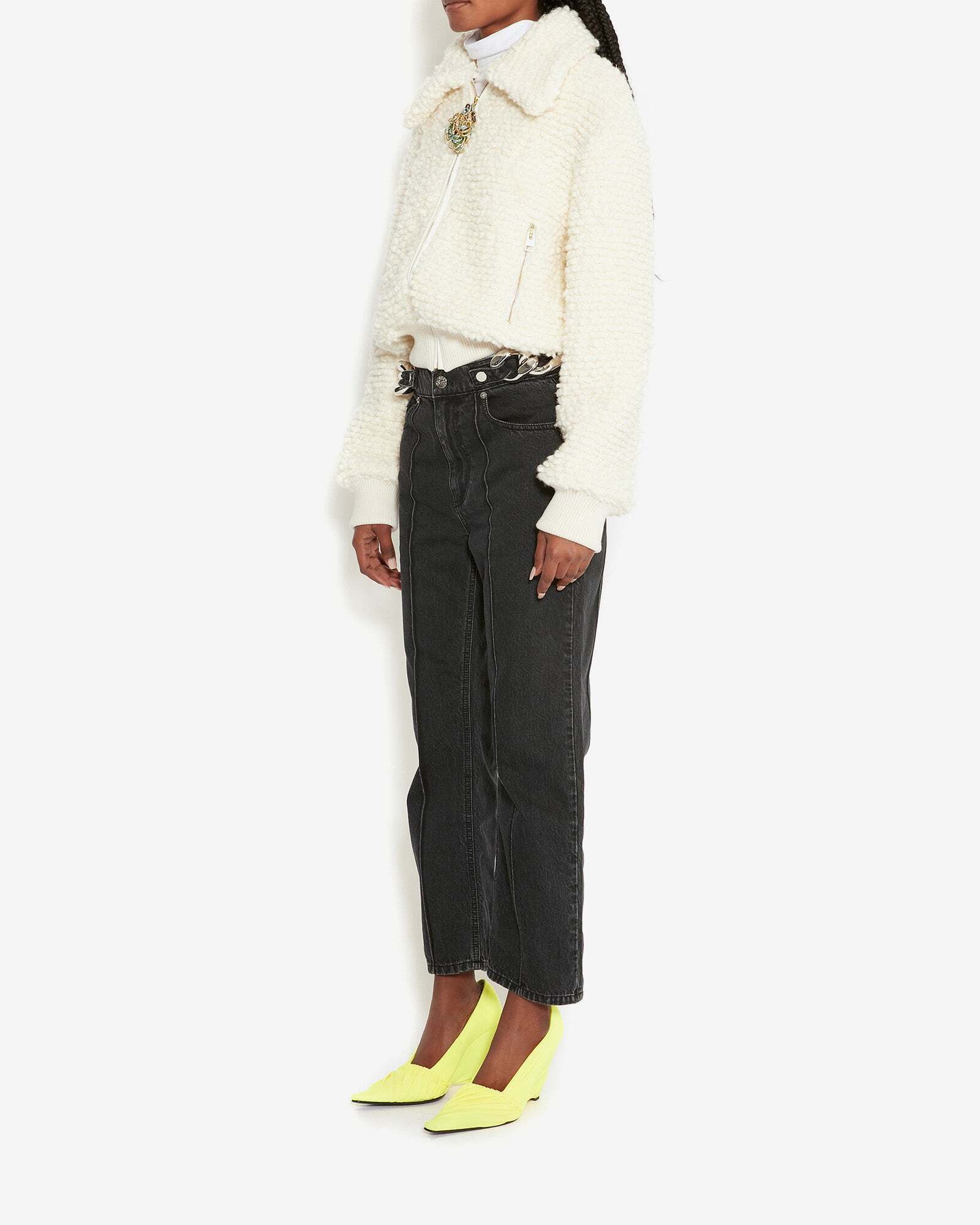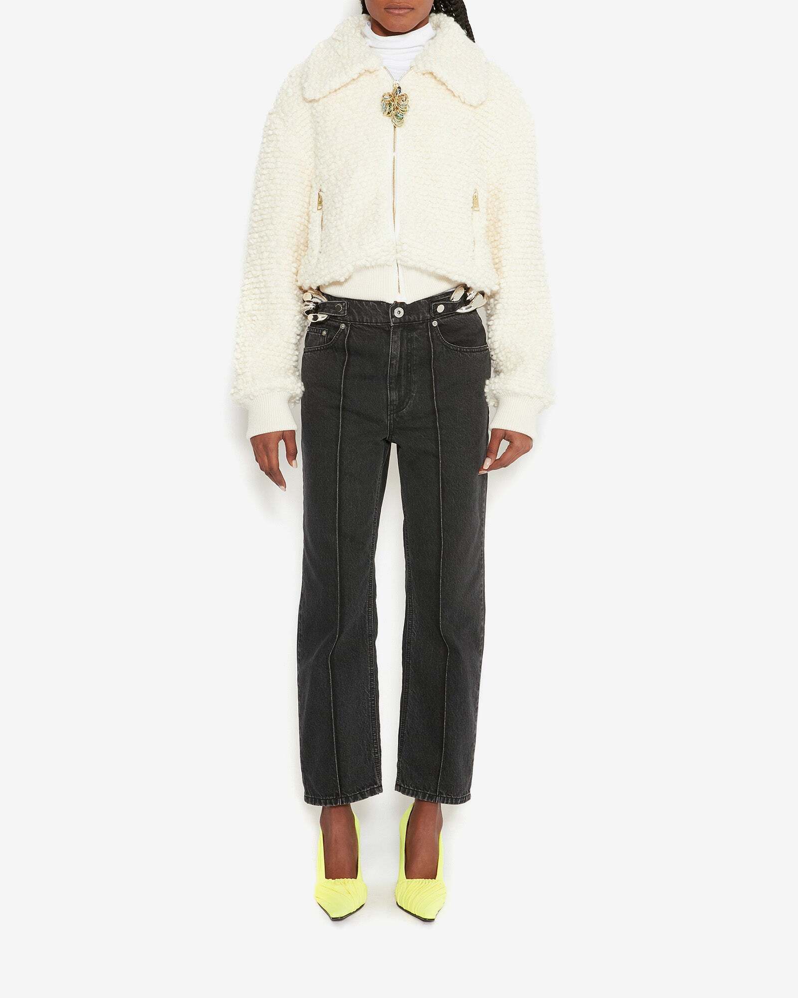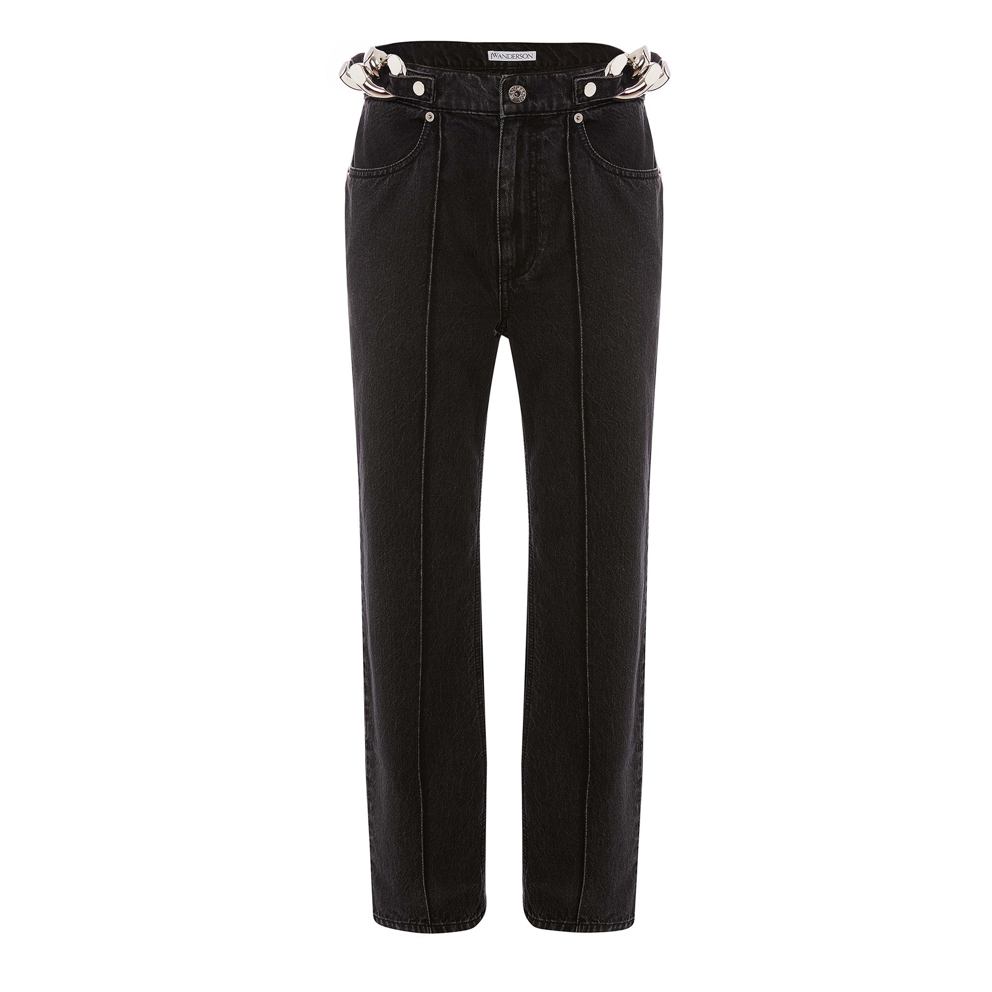 JW Anderson straight fit, cropped jeans crafted from black wash cotton with oversized silver hardware detailing on the waist