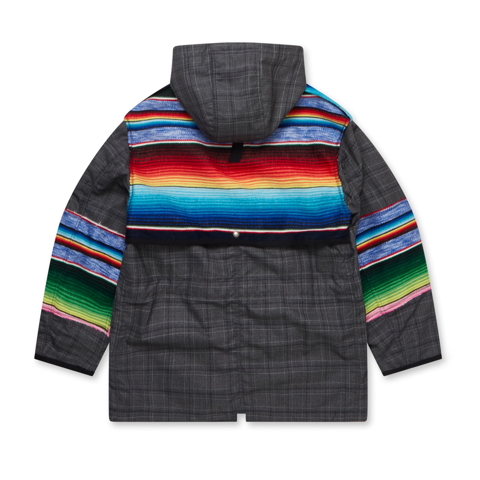 Junya Watanabe MAN wool polyester serape hooded jacket. Featuring multiple serape design panels, Jay Kay chest embroidery, concealed zip fastening and one chest pocket. Produced in collaboration with Jay Kay.