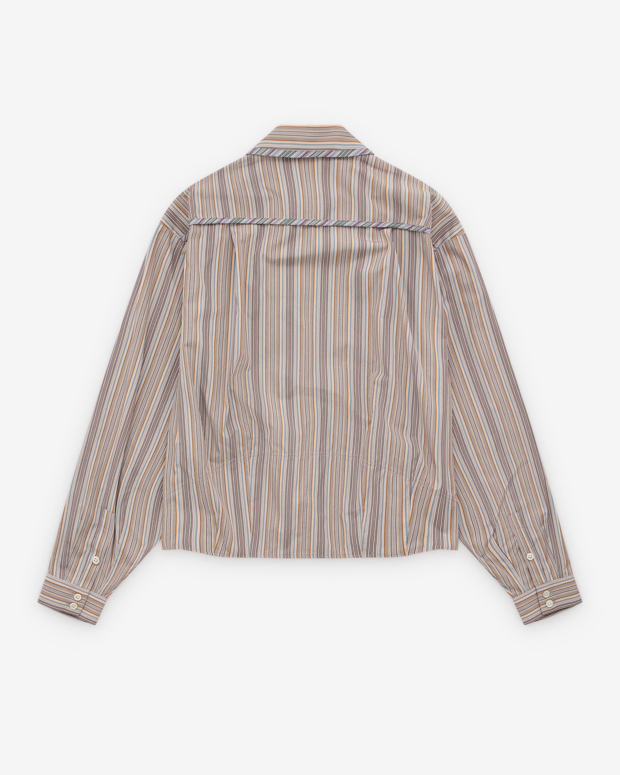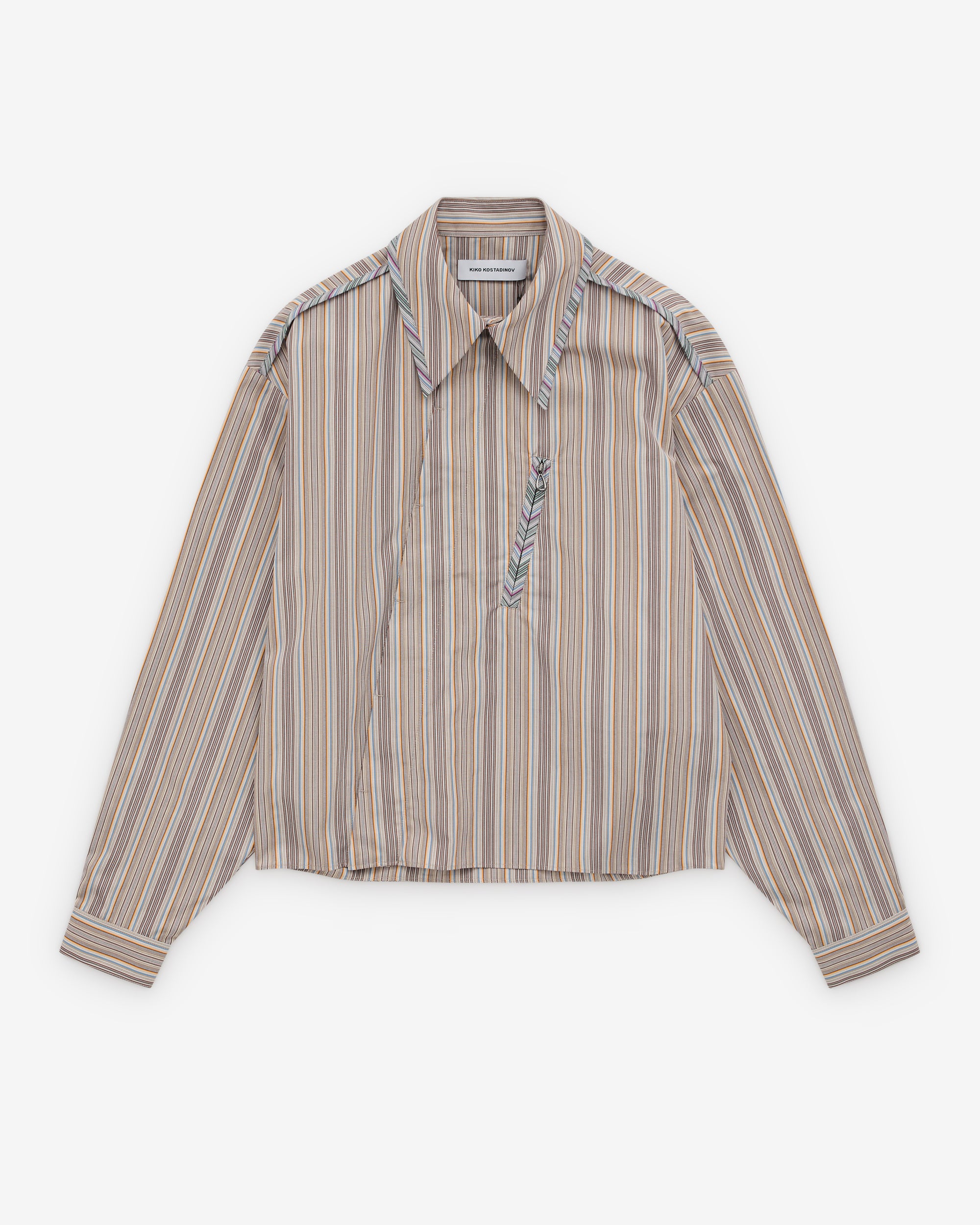 Asymmetrical button downConcealed front closureSlanted chest pocketContrast binding on the collar and along the shouldersBoxy fitDarted back construction