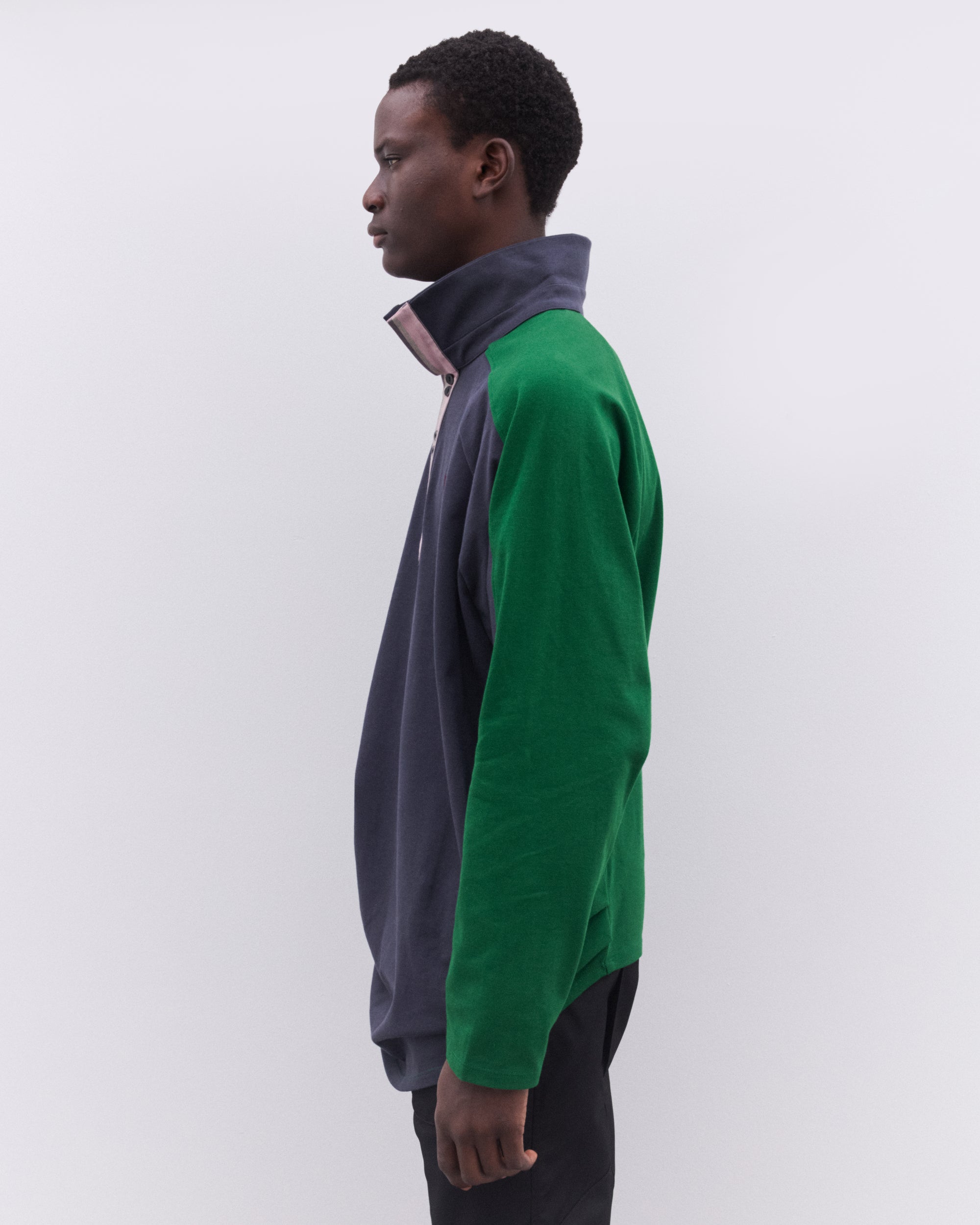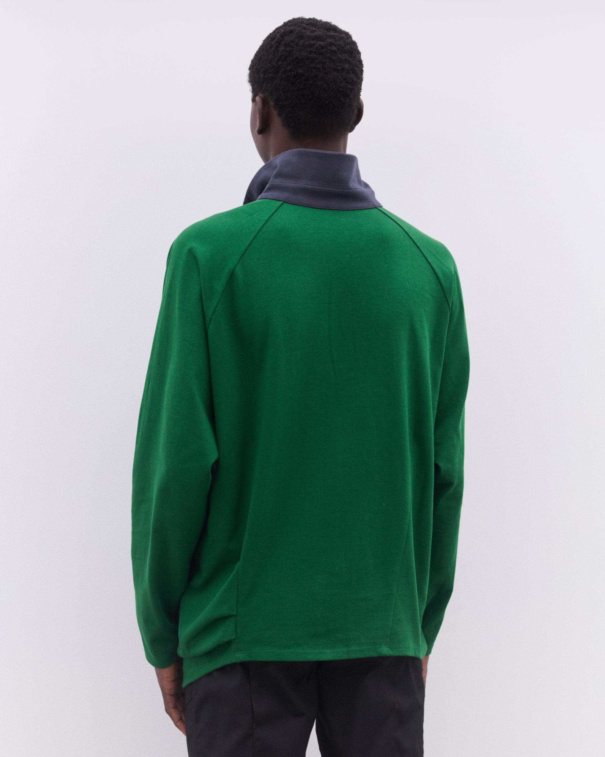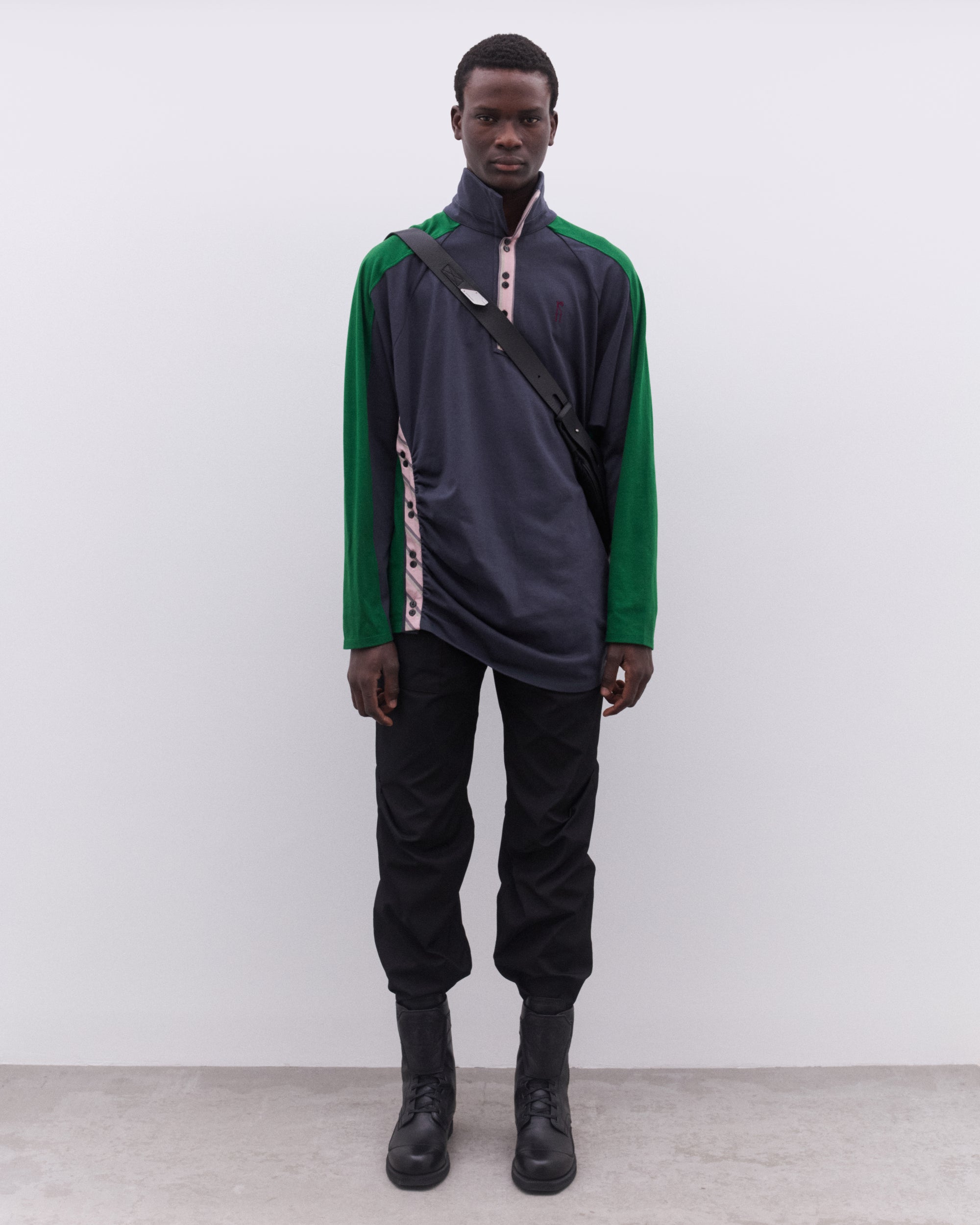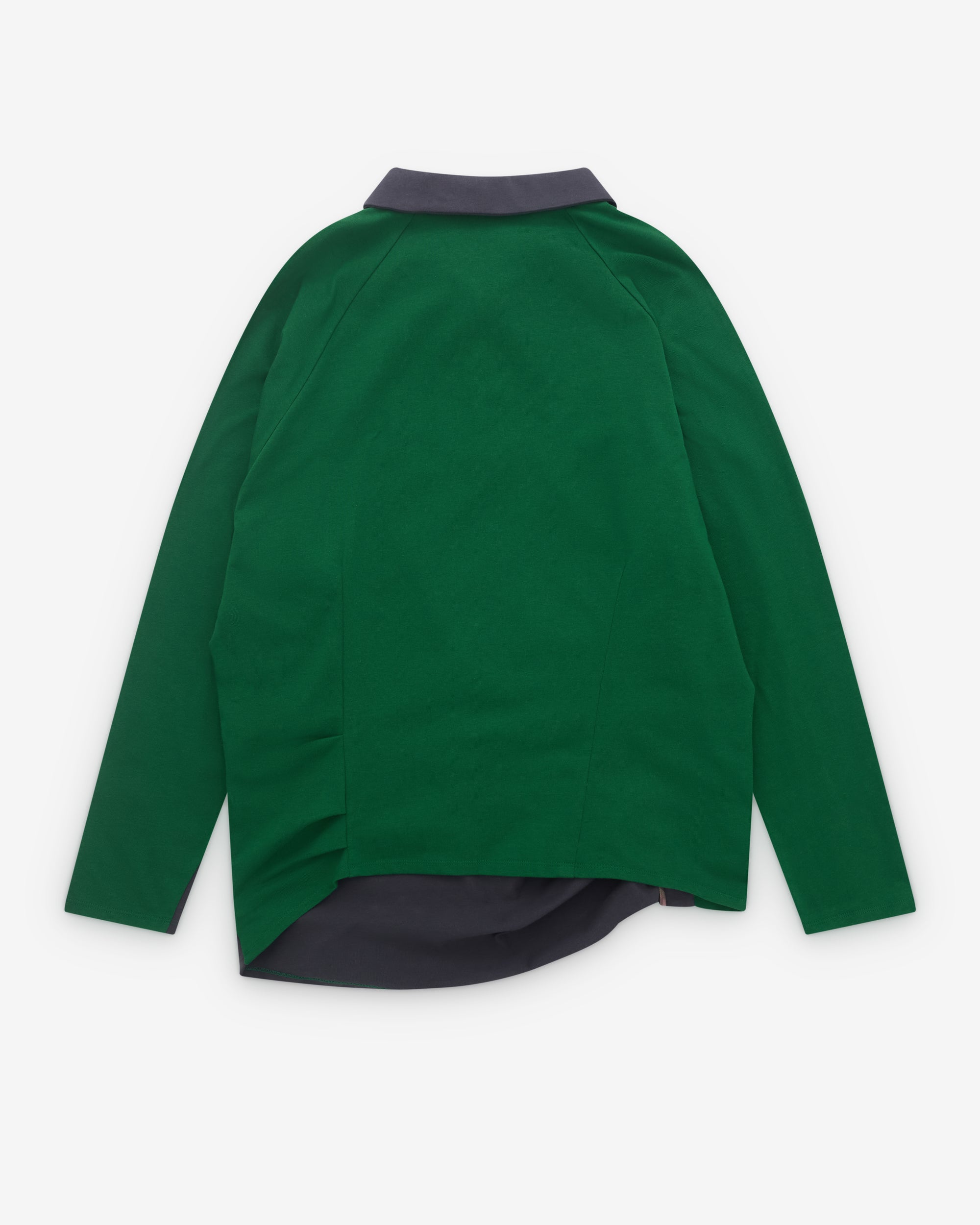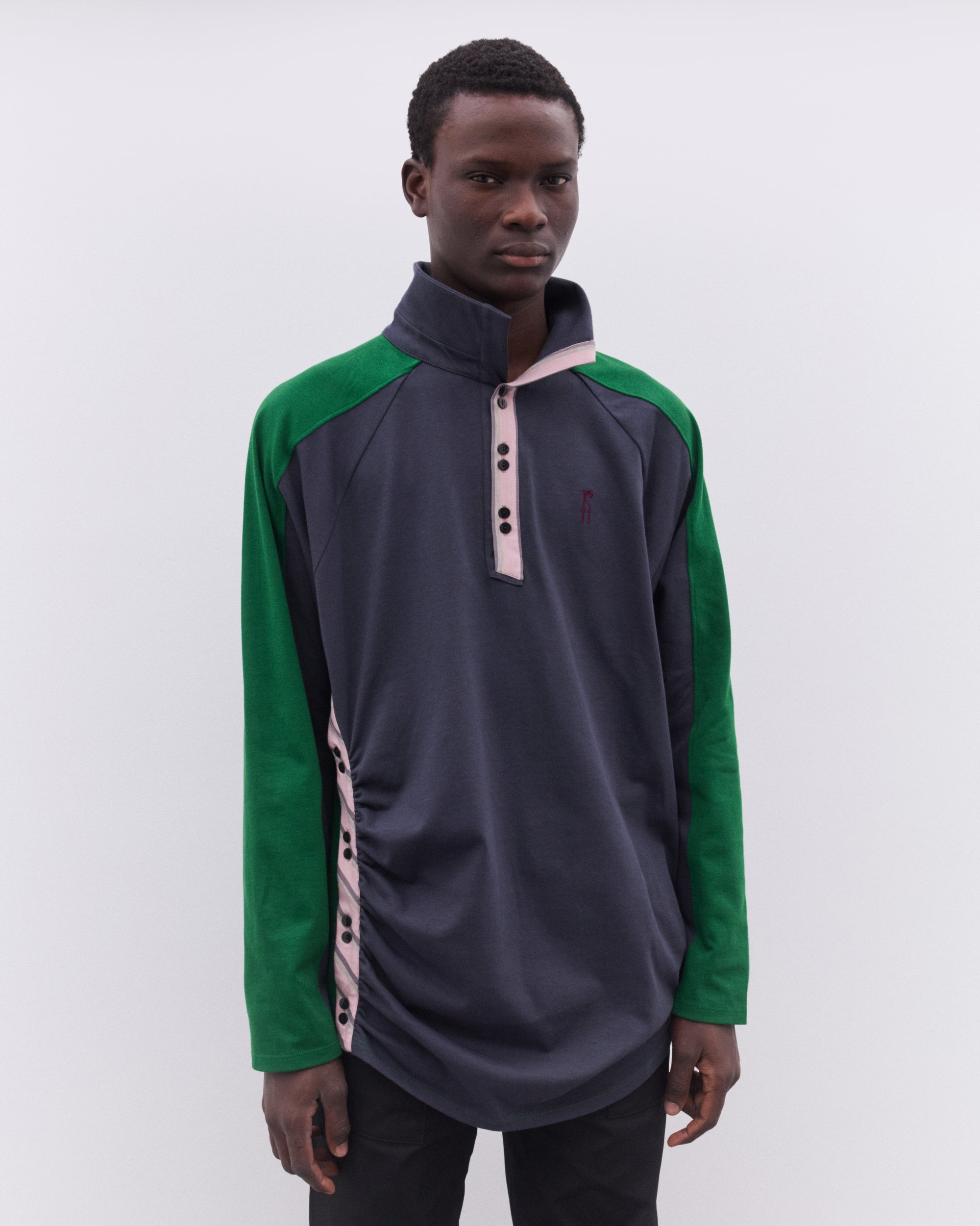 Point collarLong, raglan sleevesAsymmetric hemContrast tippingGathered front panelCrafted from three different cotton jerseys