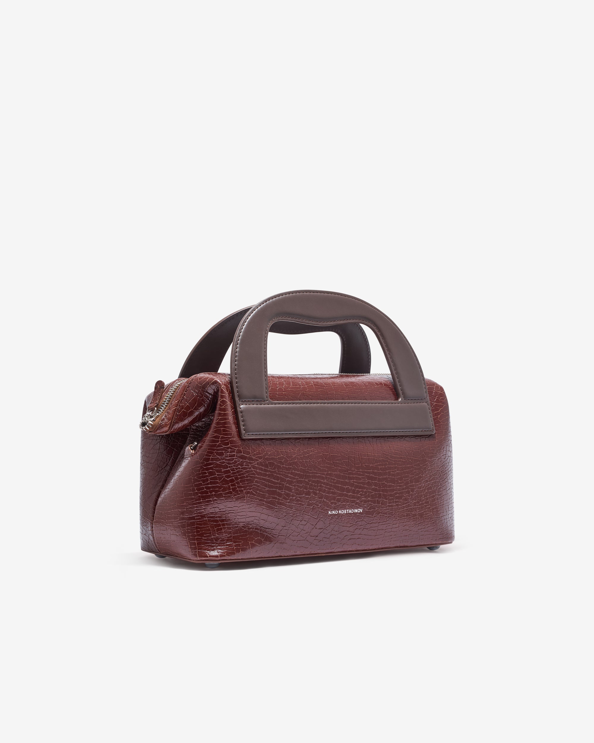 Patent cracked calf leatherSmooth bamboo handlesDetachable cross body strapInternal pocketZip top closureL: 36 X W: 14 X H: 21 cm