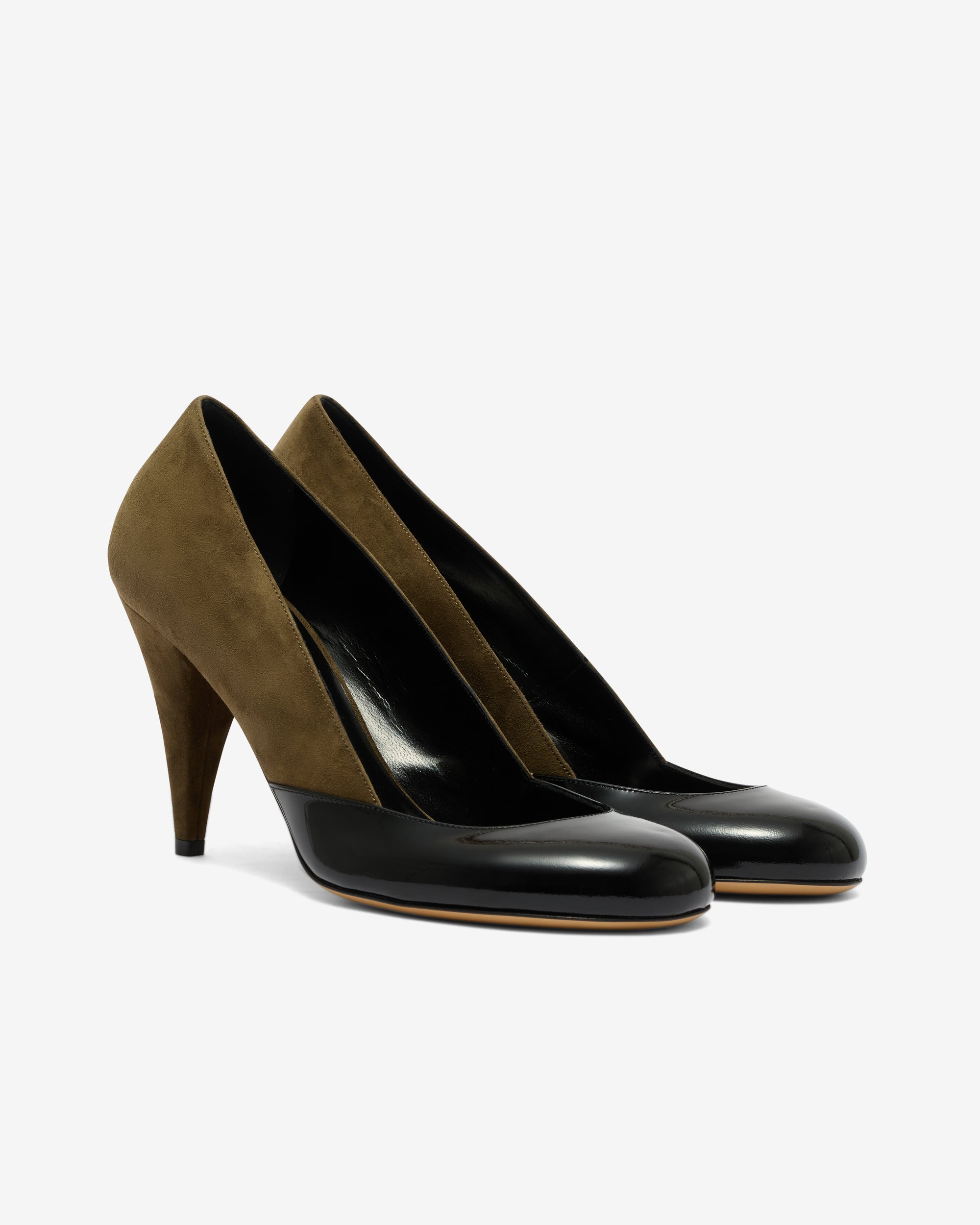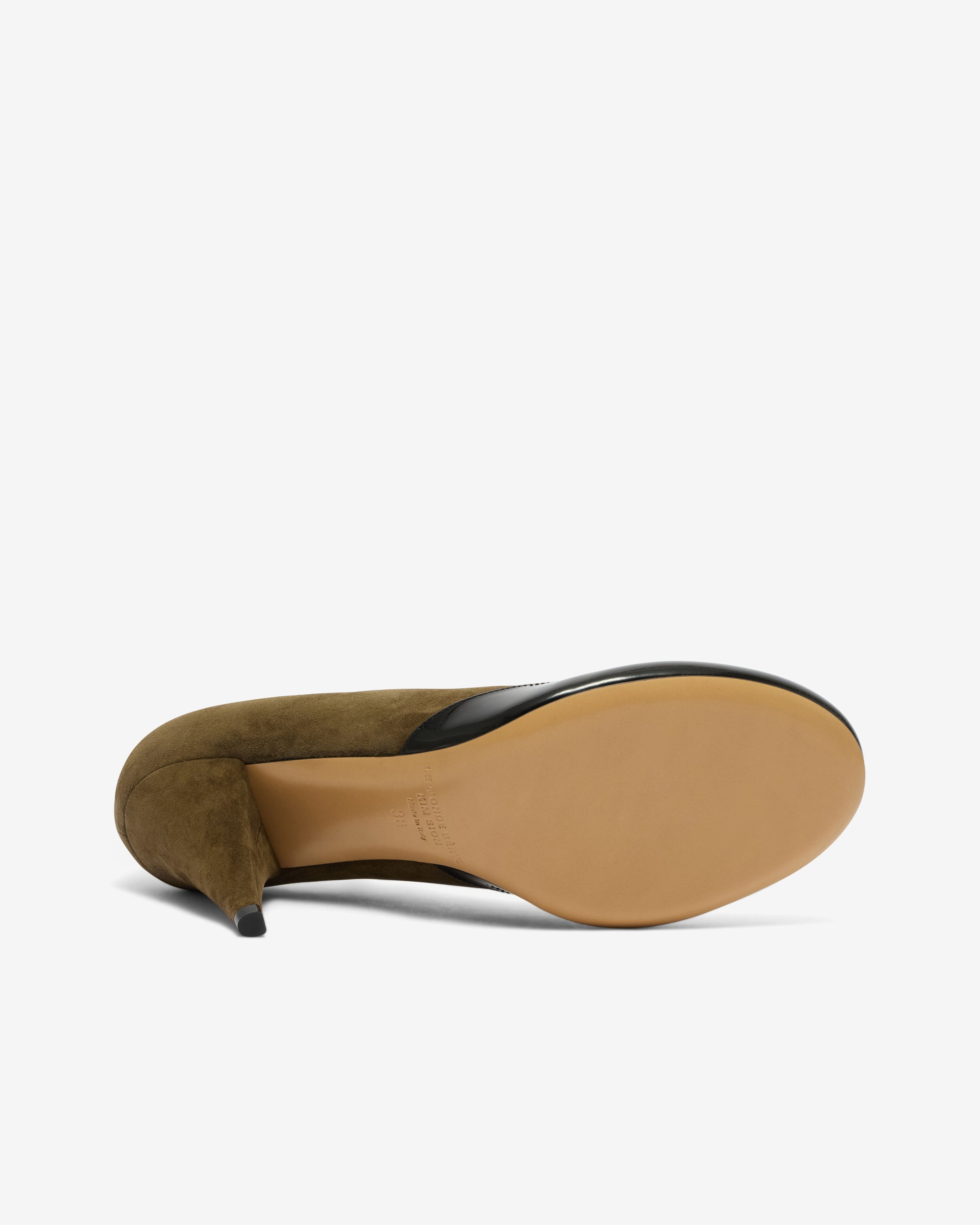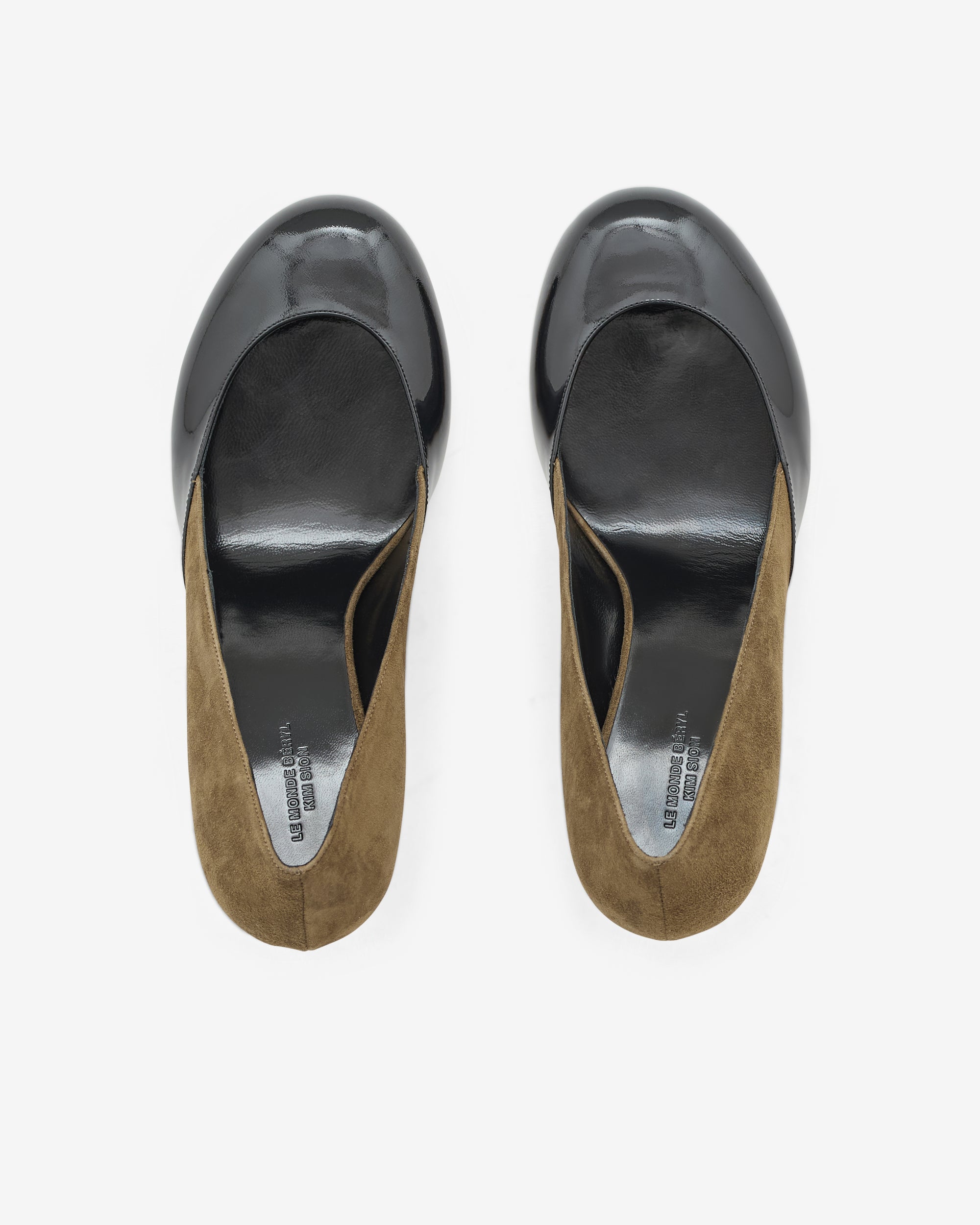 Leather and suede upperHeeled outsoleLeather cushioned insoleRounded toe95mm triangular wooden heel