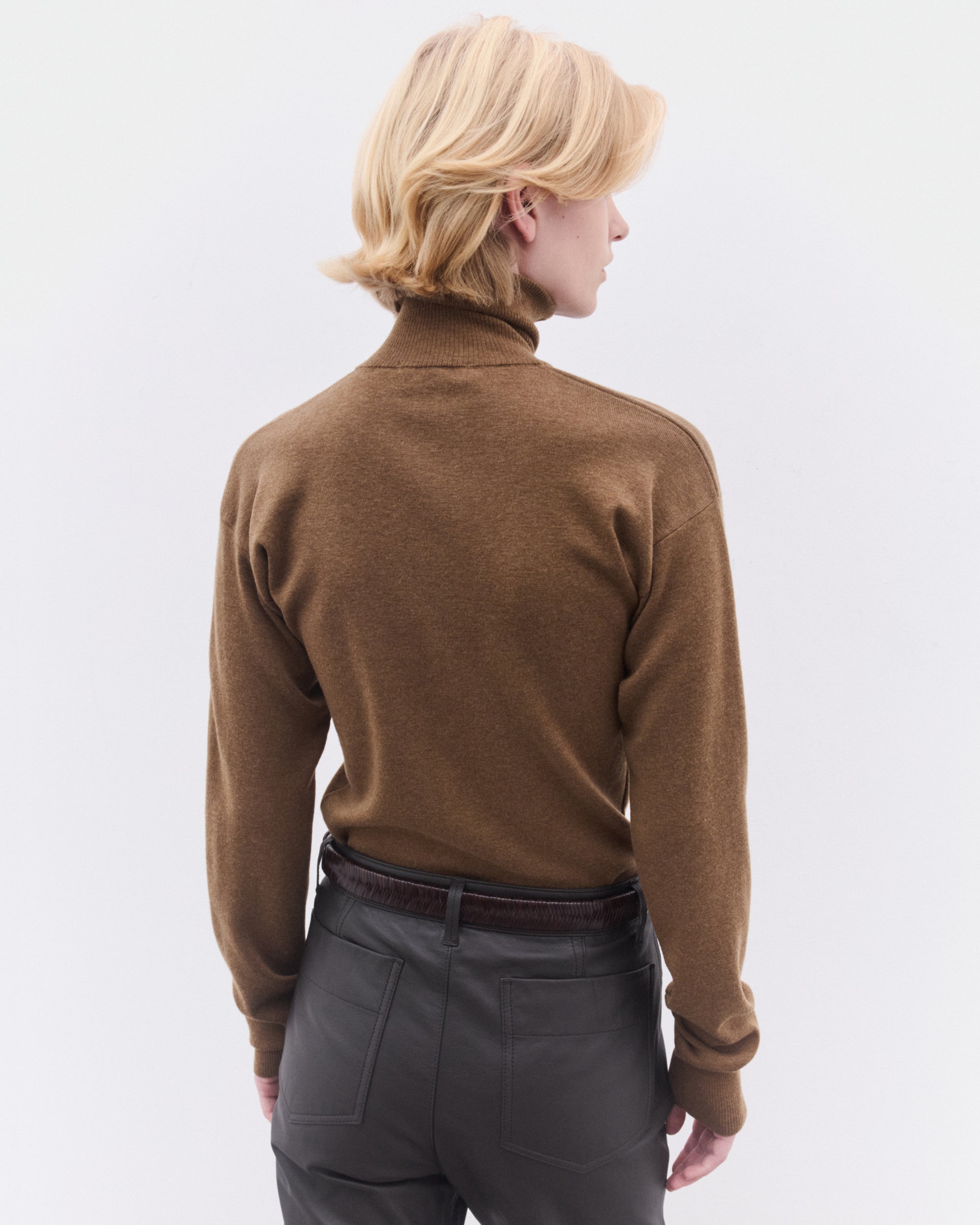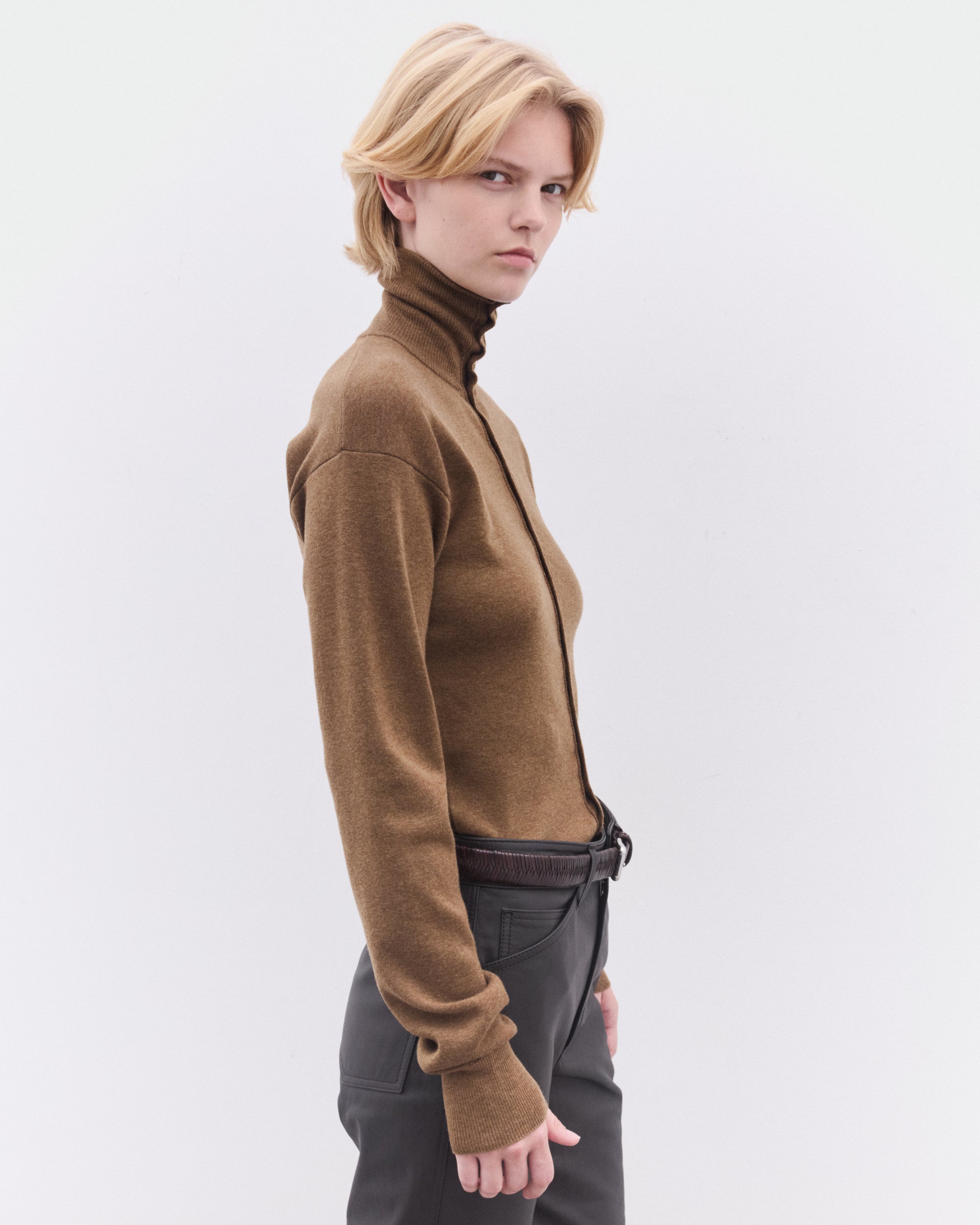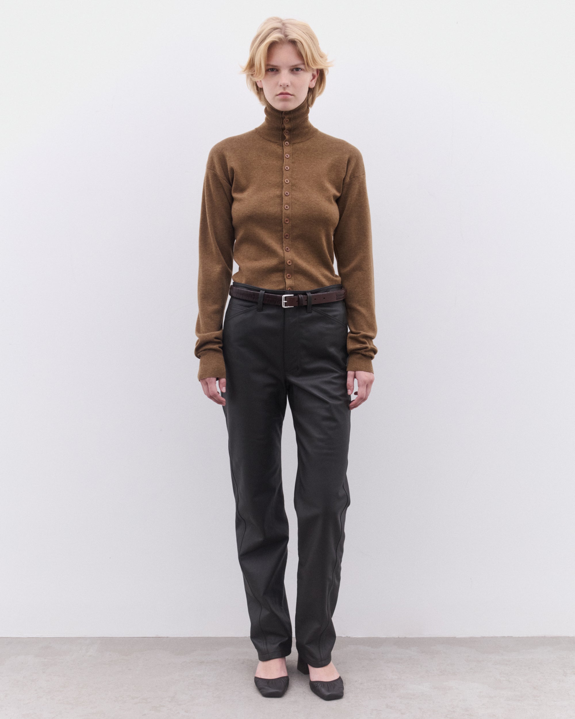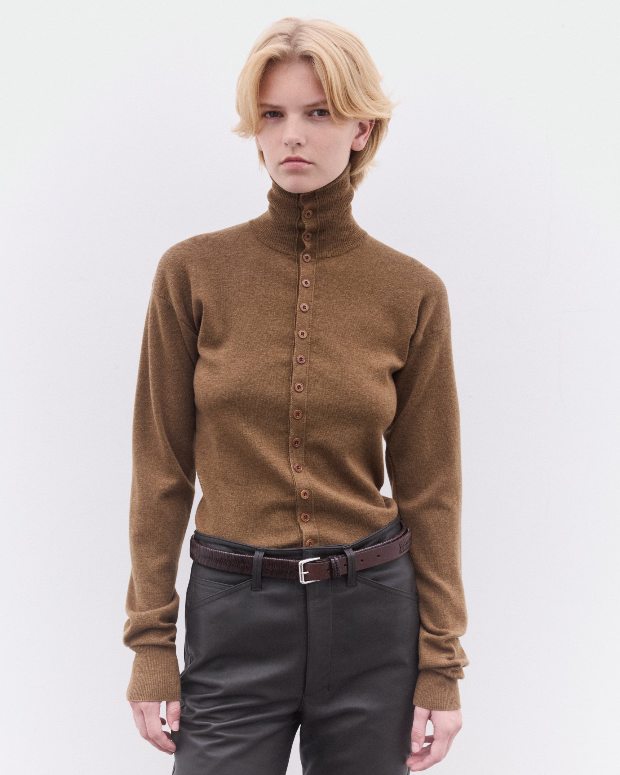 Stand collarLong sleevesLacquered button closureRib knit trims