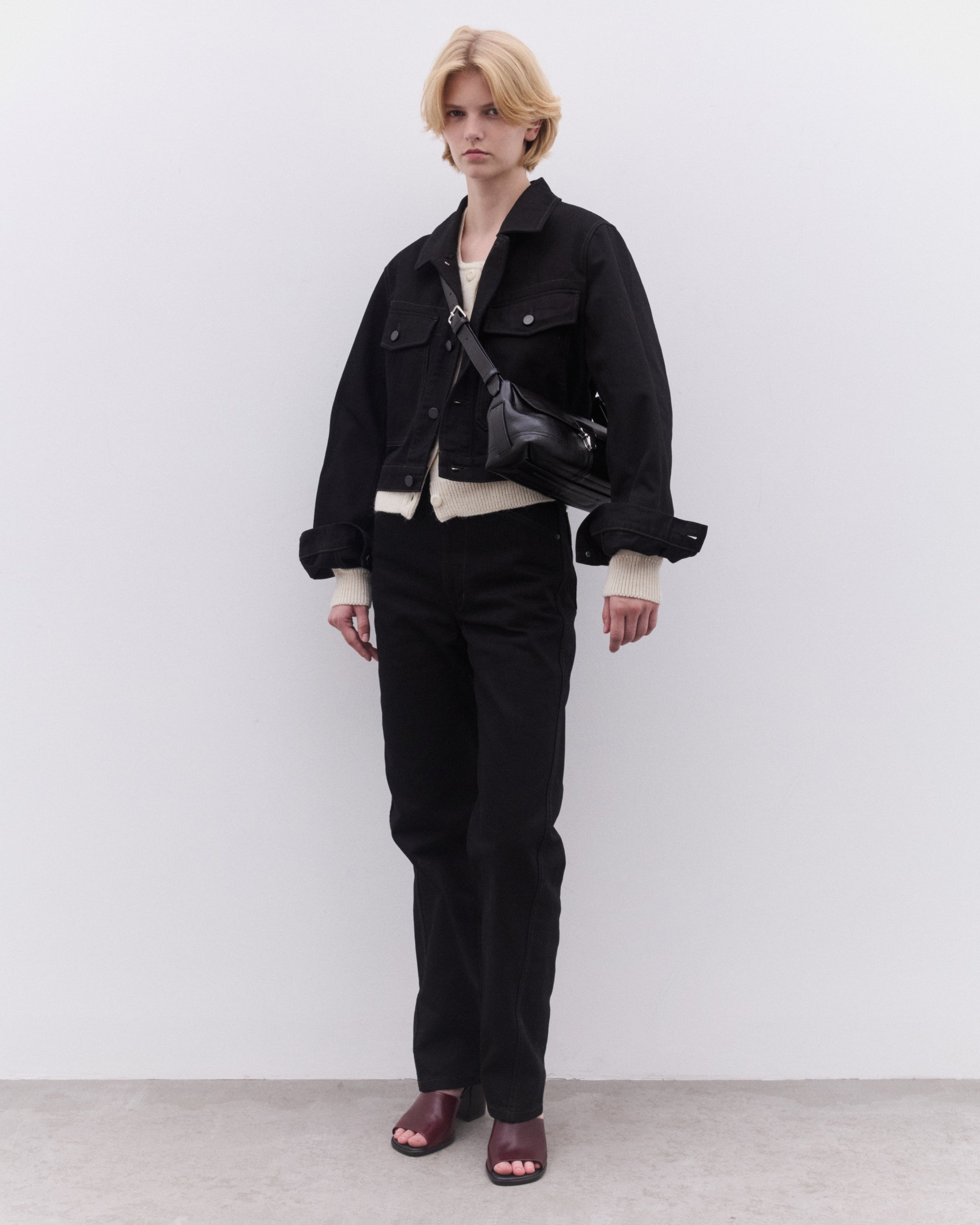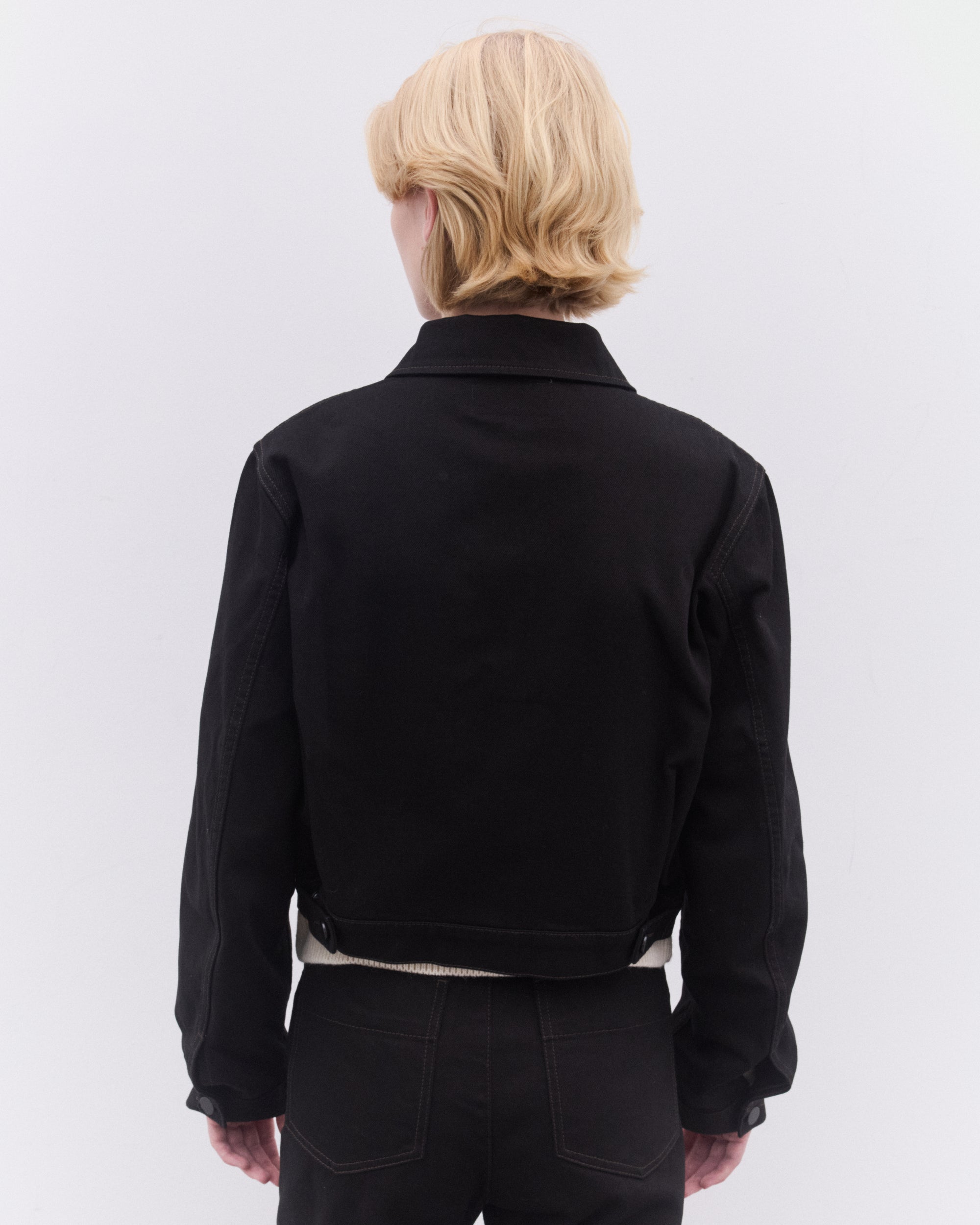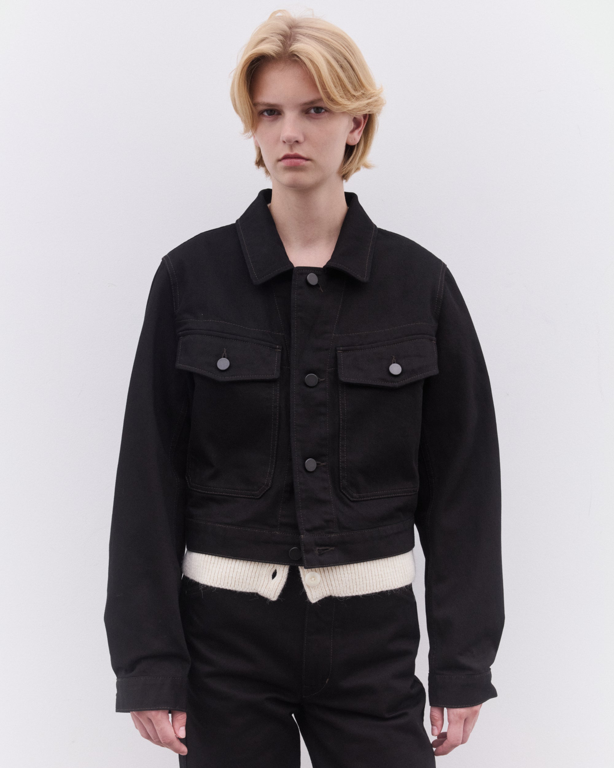 Button closureTwo chest pocketsClassic collarBoxy, cropped fitAdjustable button waist