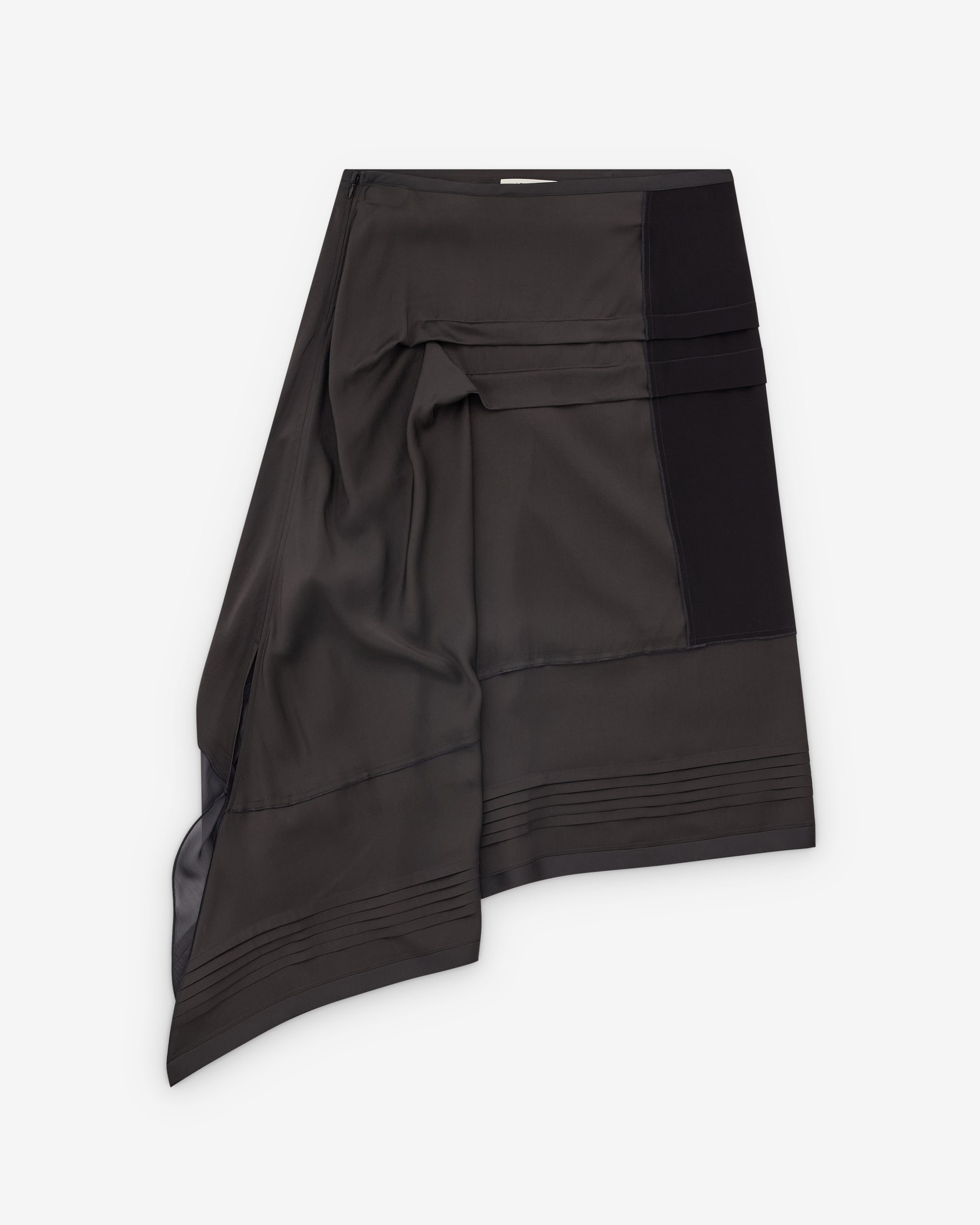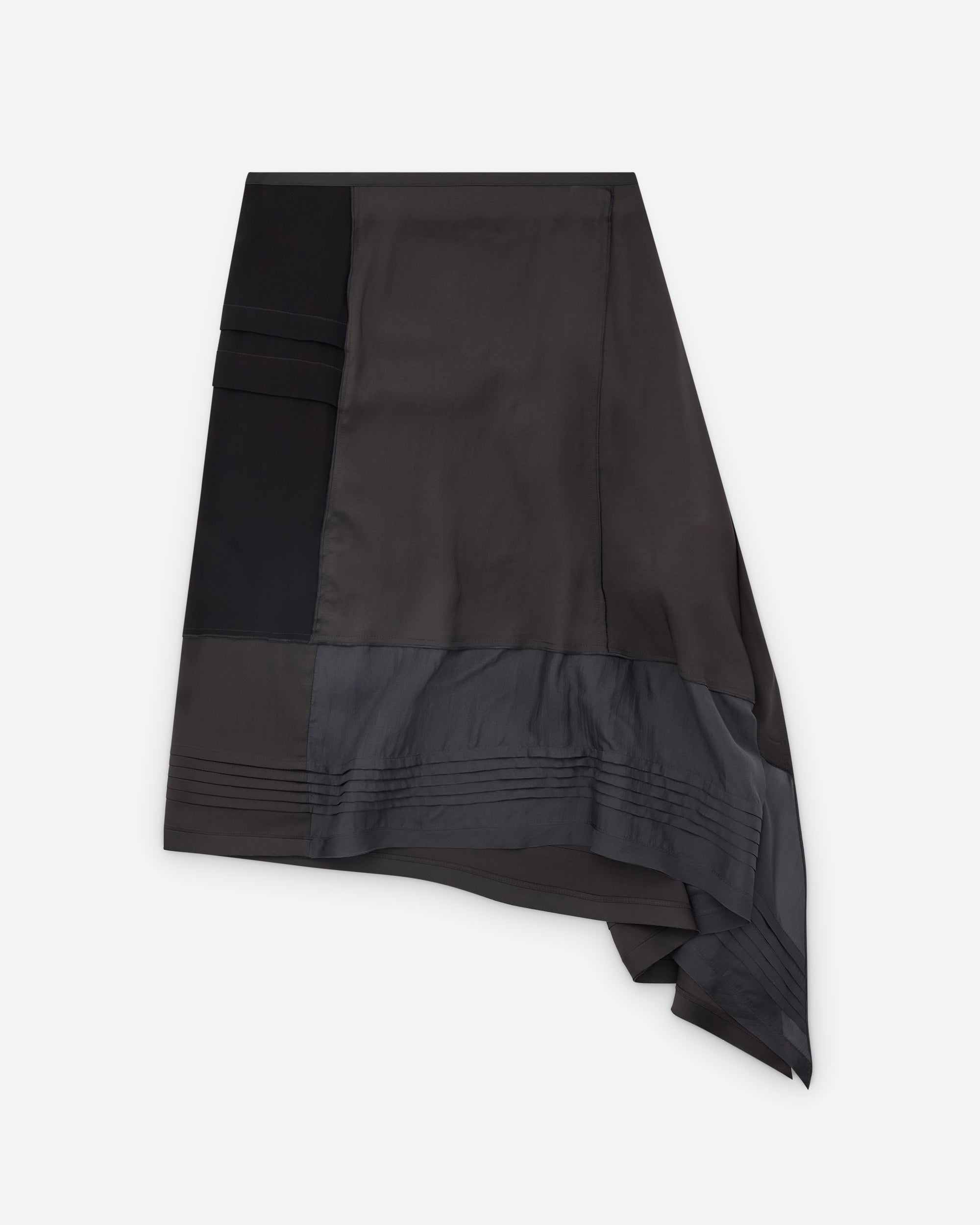 Skirt in patchwork fabrics including crepe de chine and parachute silk