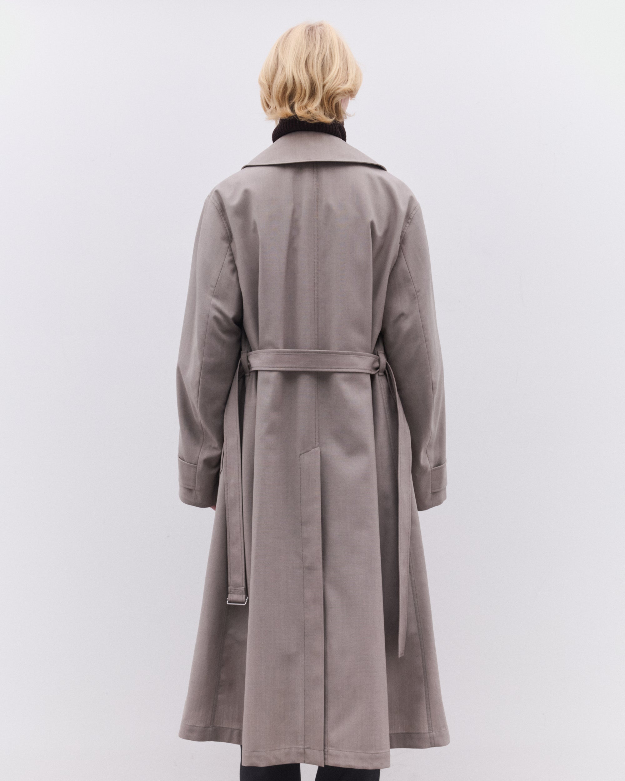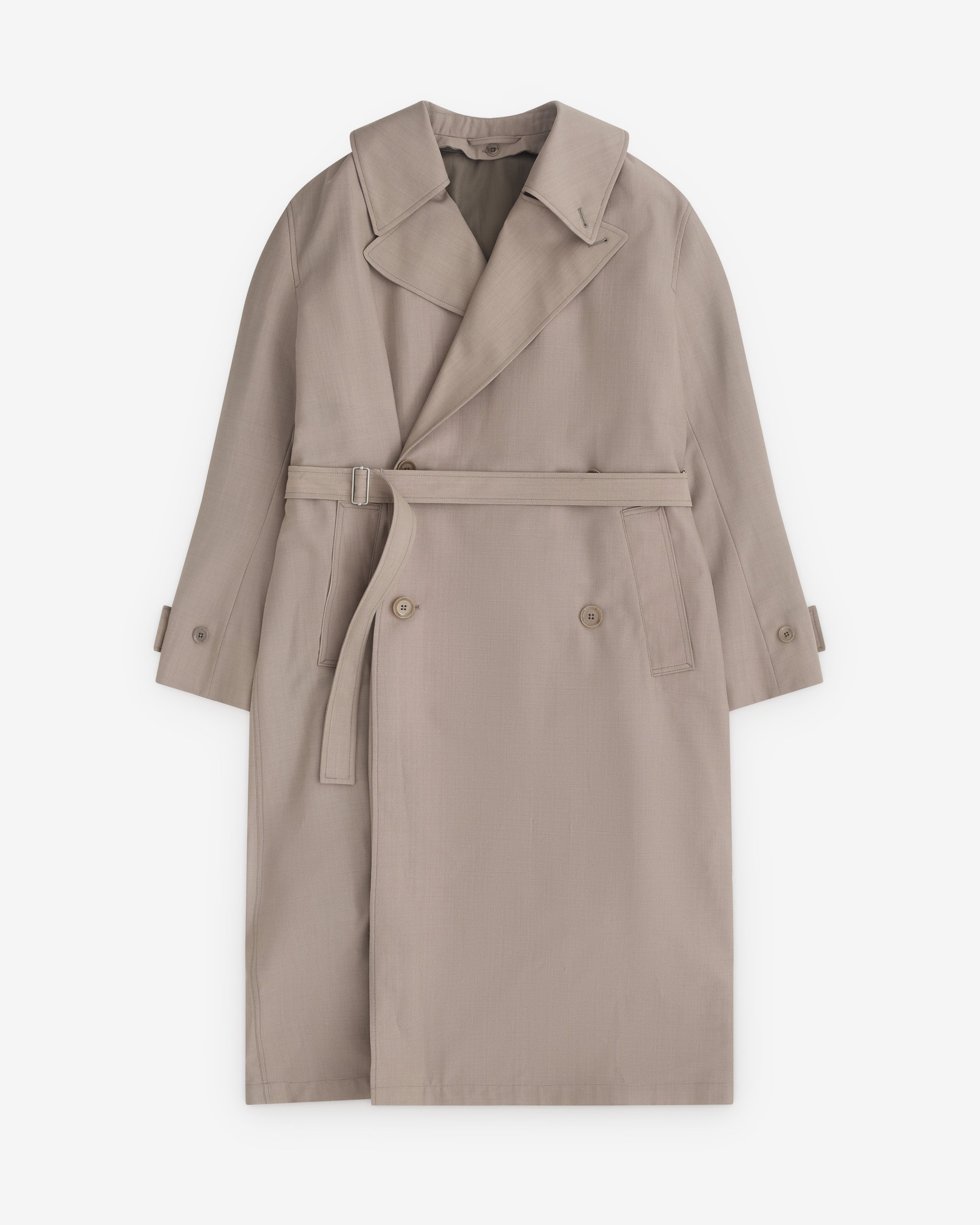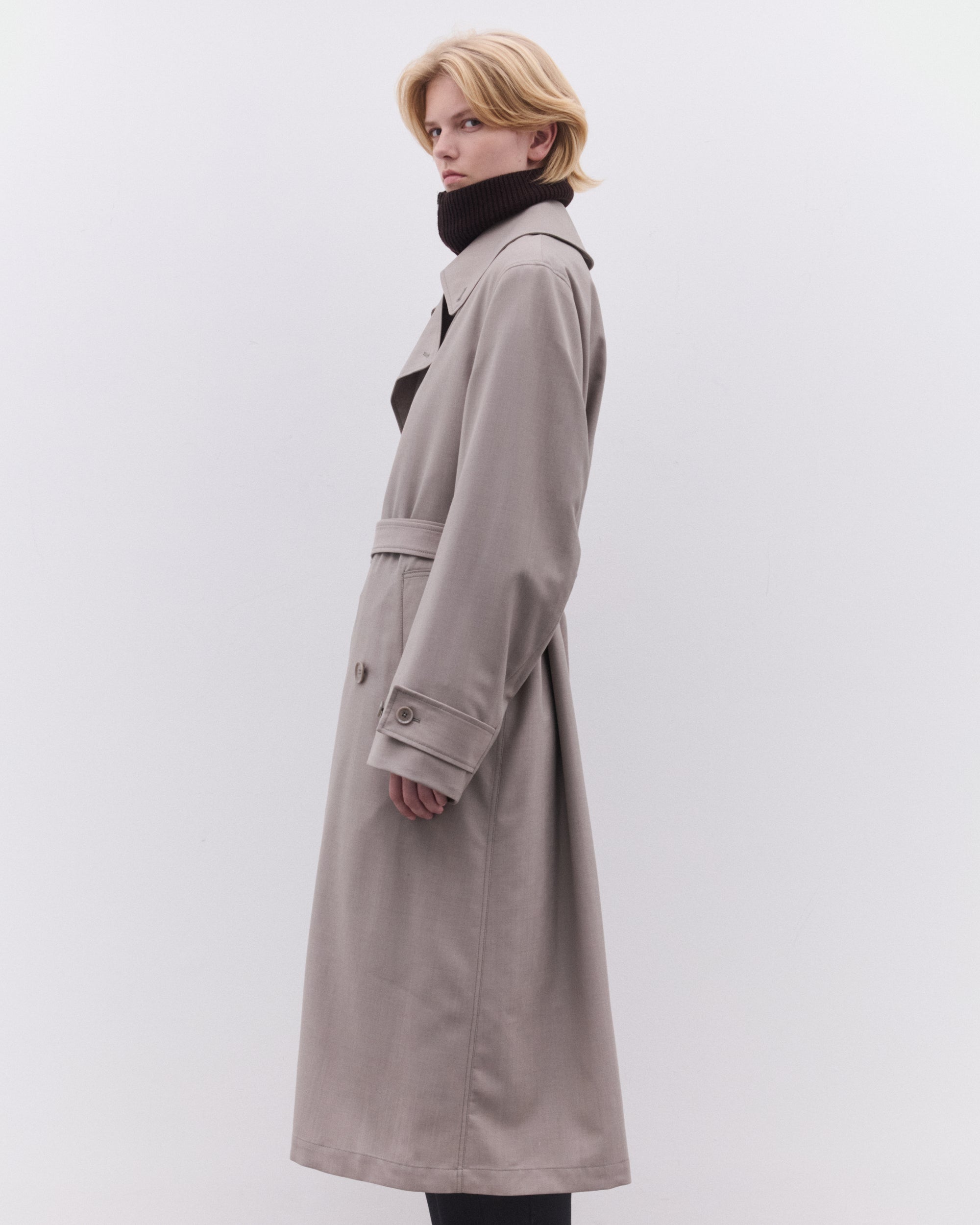 Open collarBeltedDouble breastedSide welt pocketsButton-out liningRear central vent