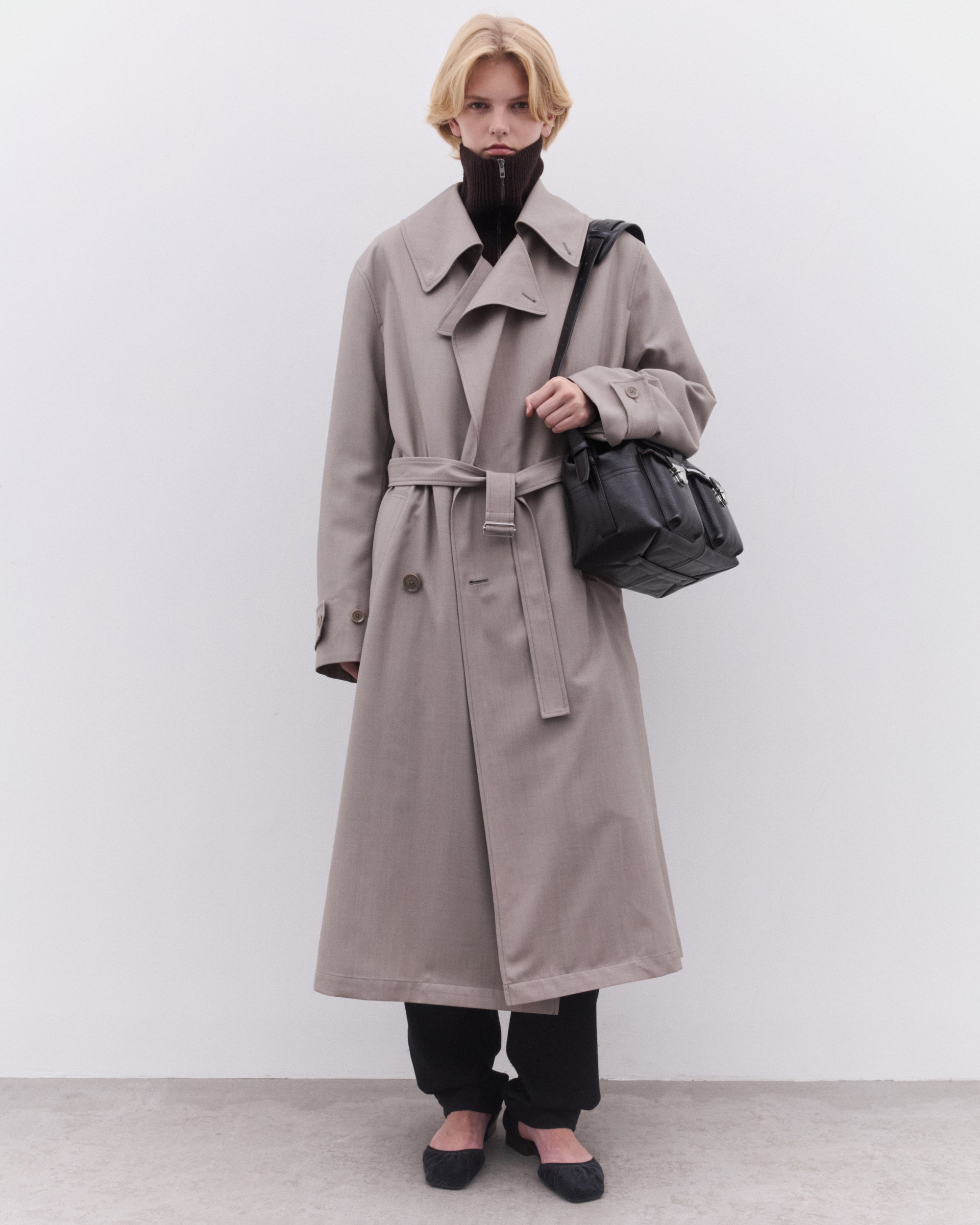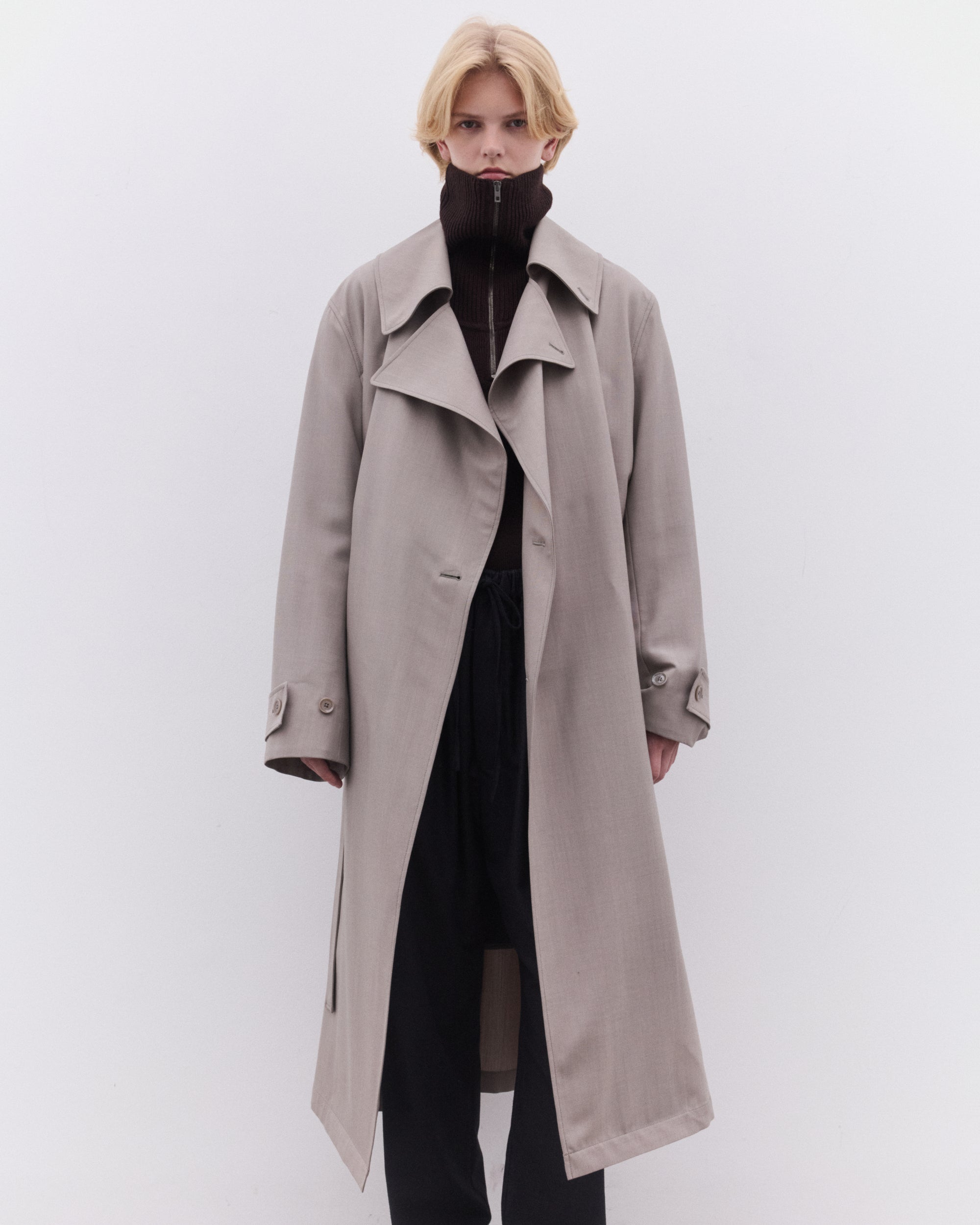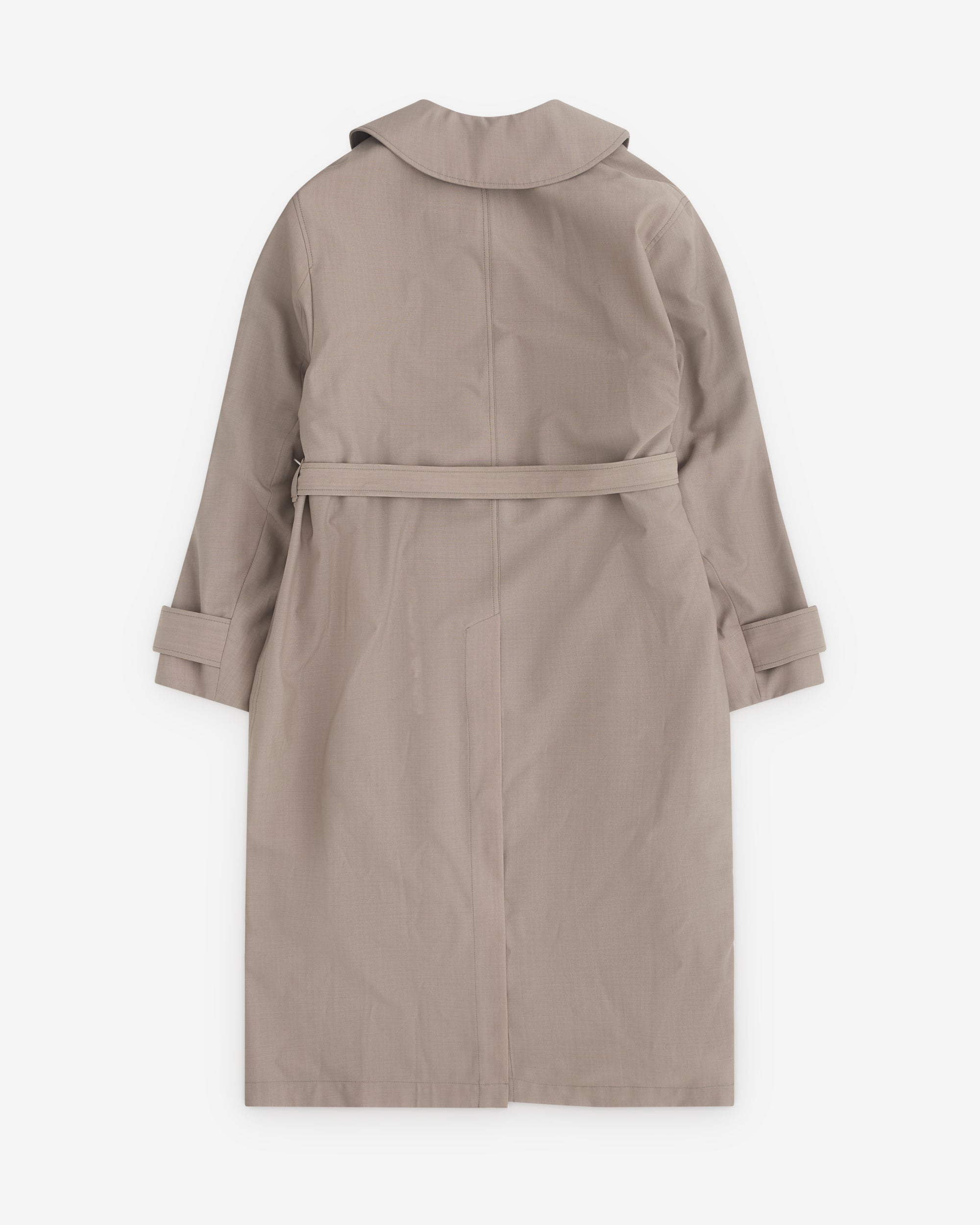 Open collarBeltedDouble breastedSide welt pocketsButton-out liningRear central vent
