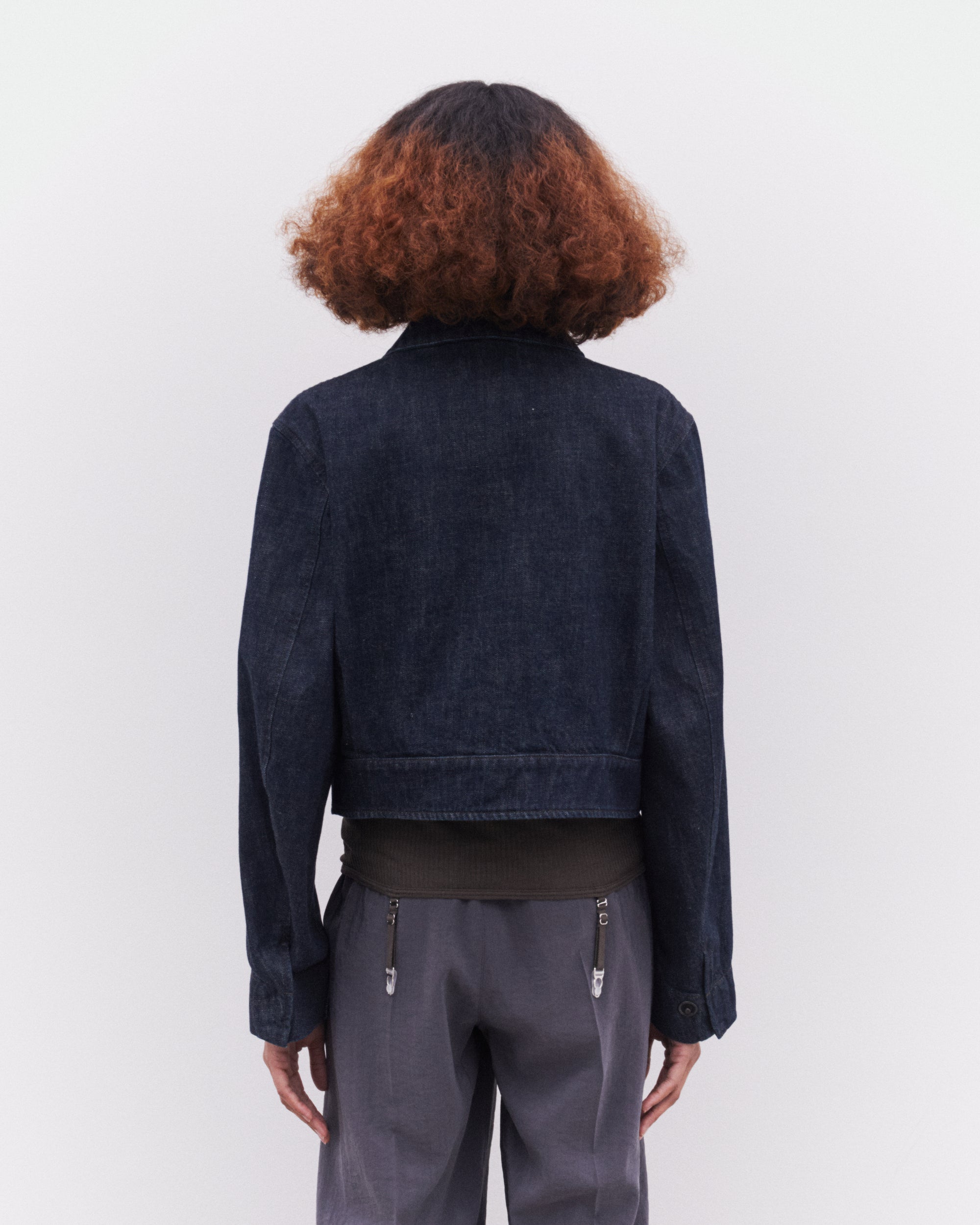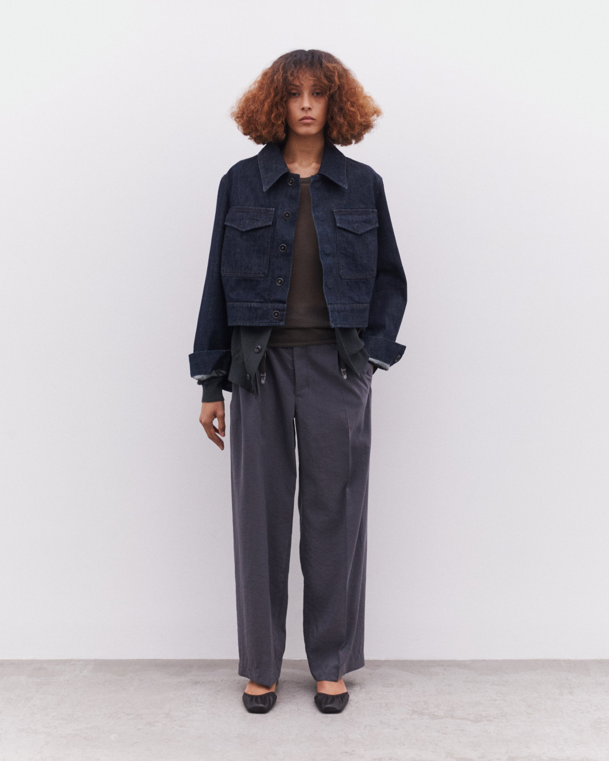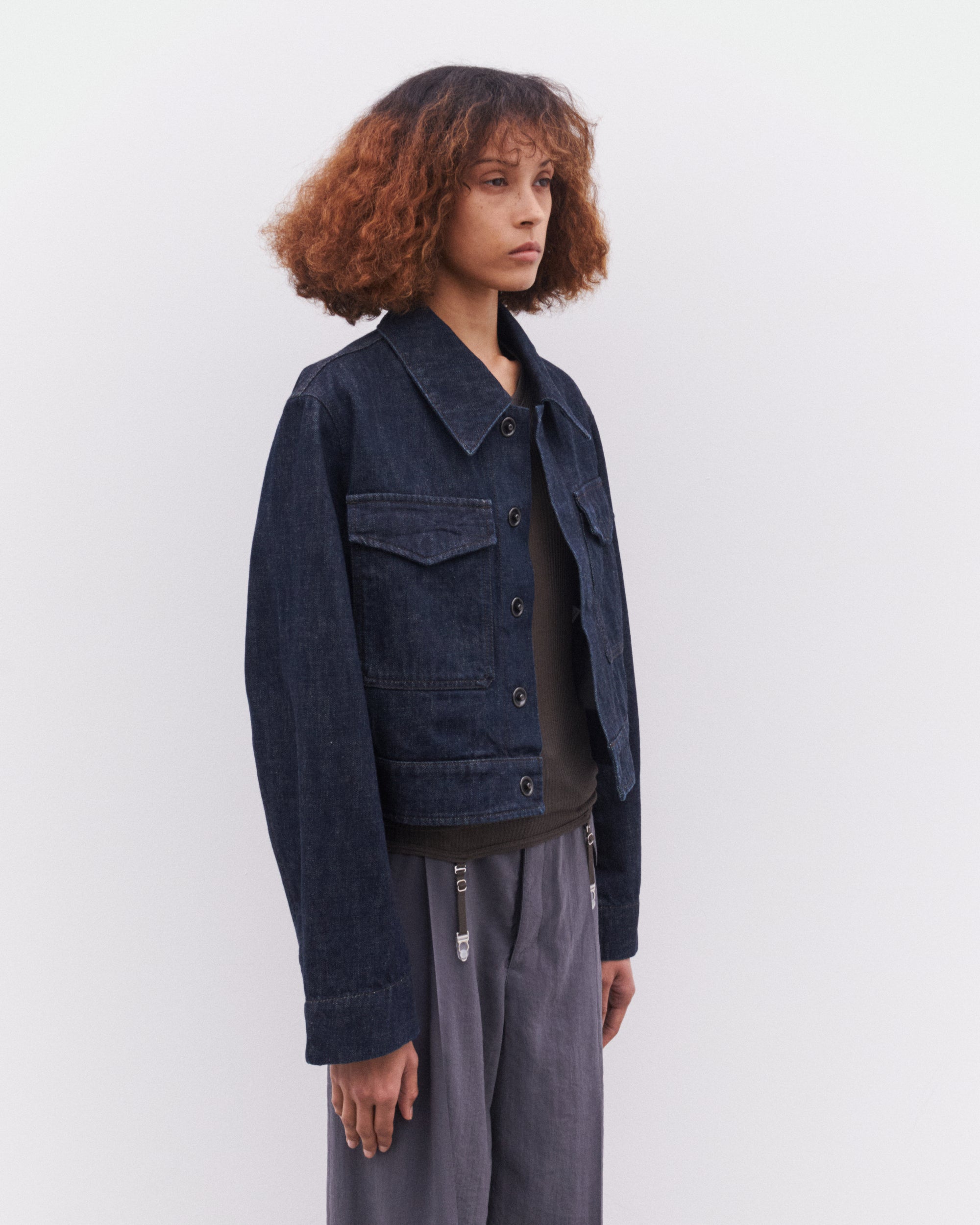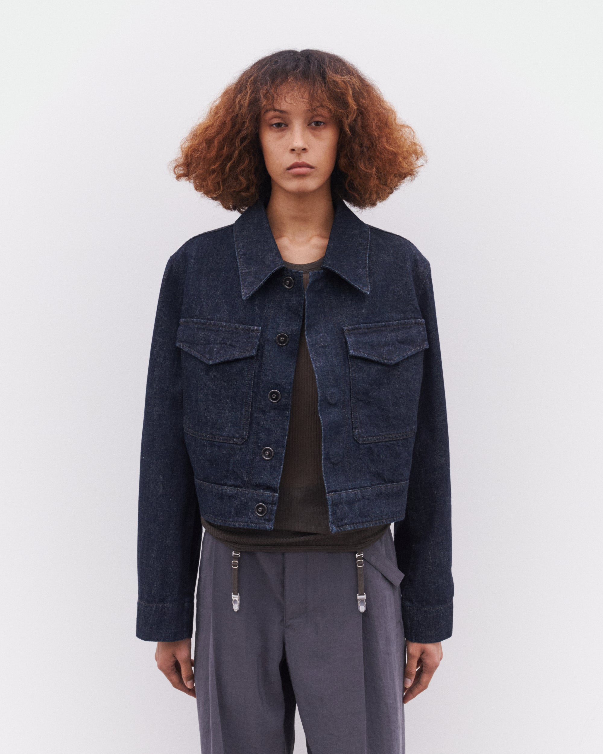 Relaxed fitCropped waistTwo flap patch pocketsHidden metal snapsContrast topstitching details