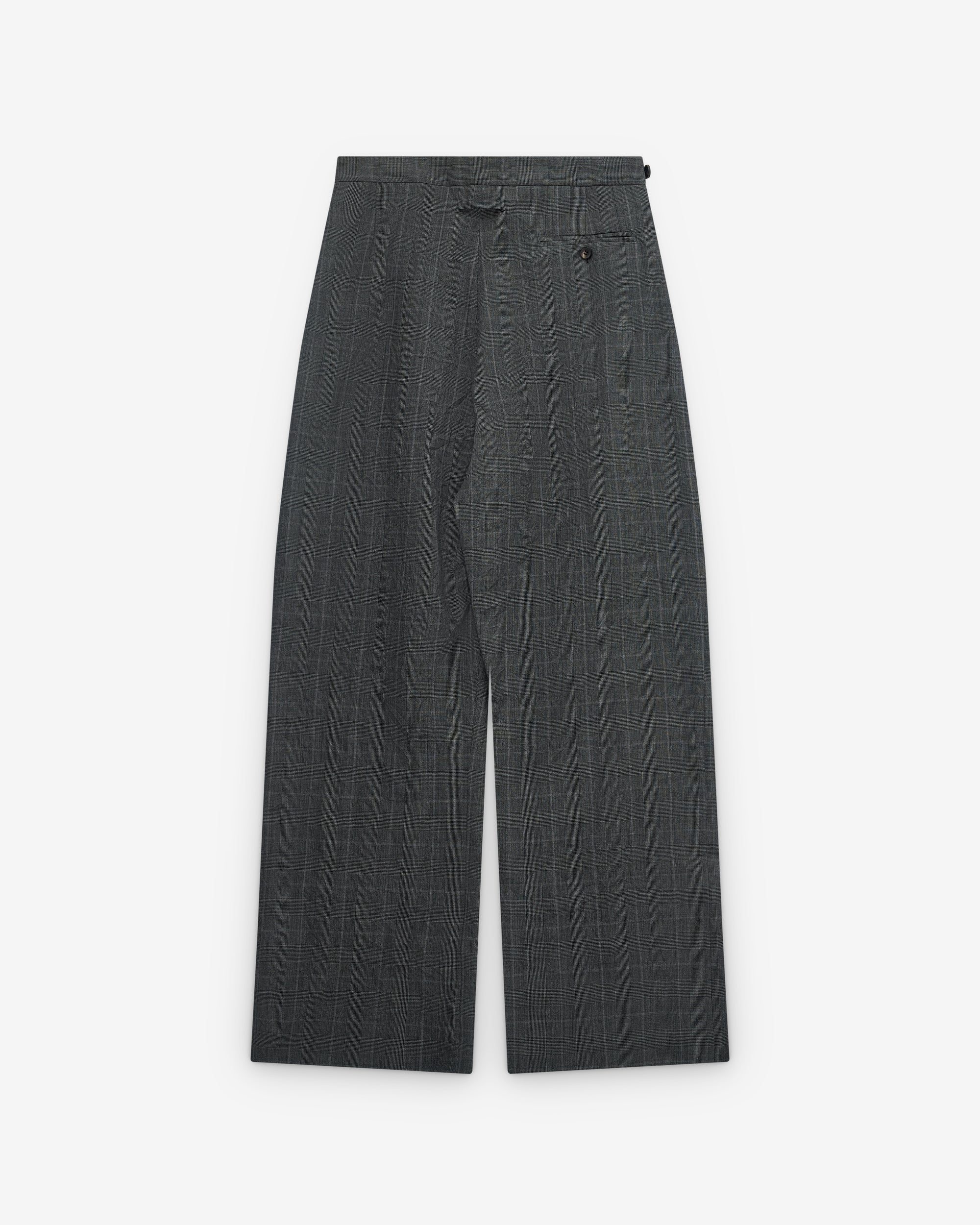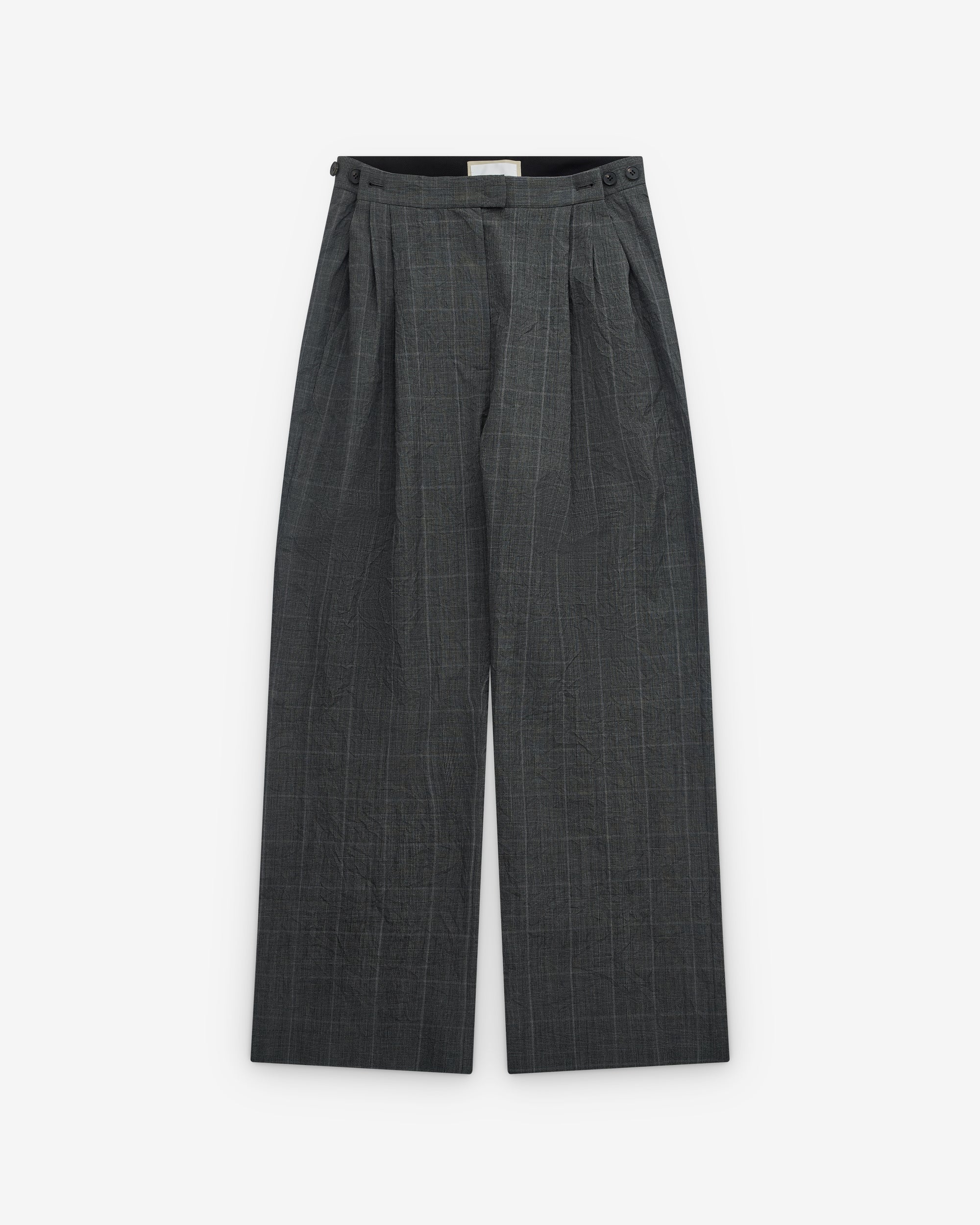 Front pleatsButton adjusters at waistWide, straight legRear welt pockets