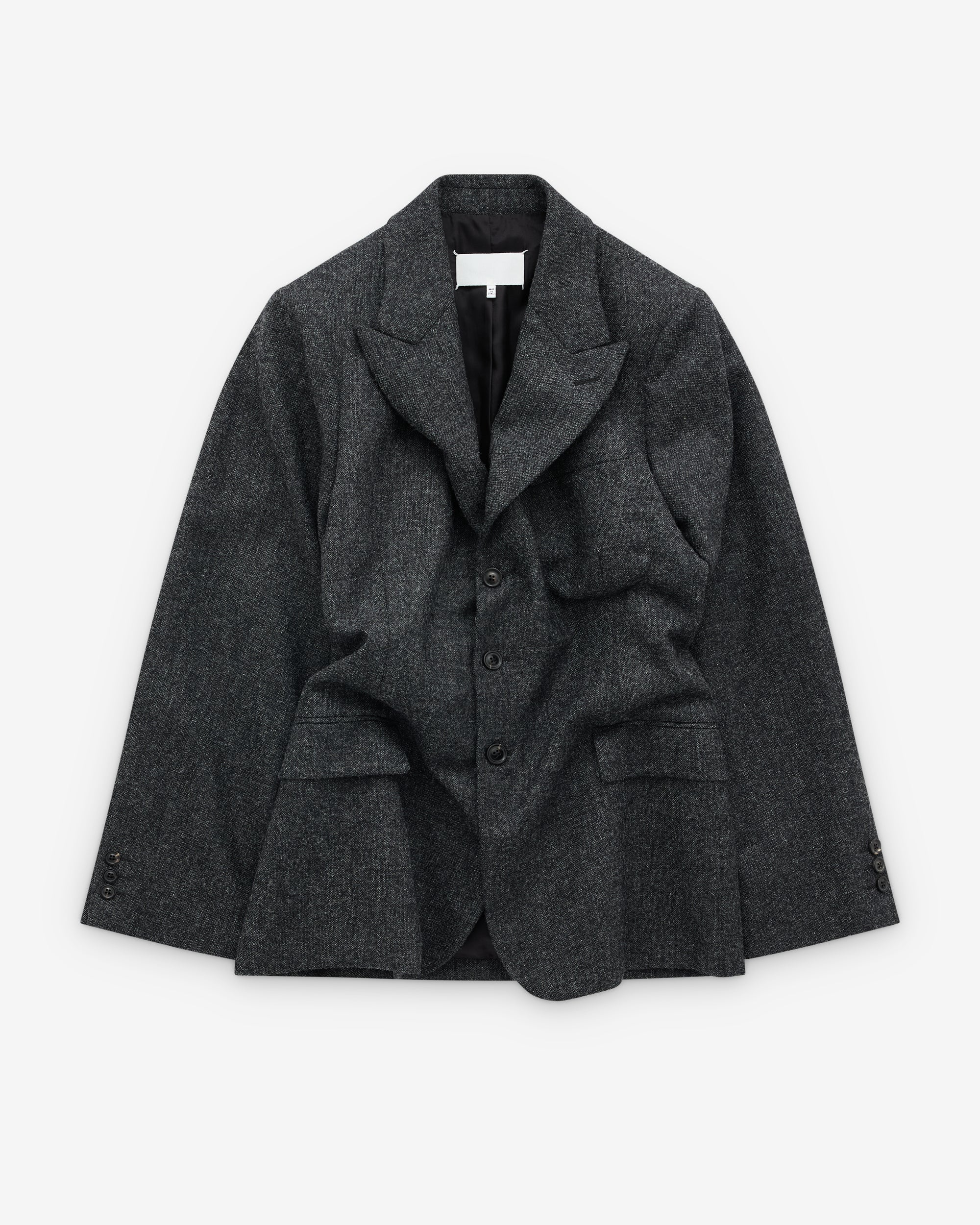 Single-breasted wool jacketNotch lapels with irregular curvatureChest patch pocket and two flap pockets at the waistButtoned cuffsFour stitches at the back