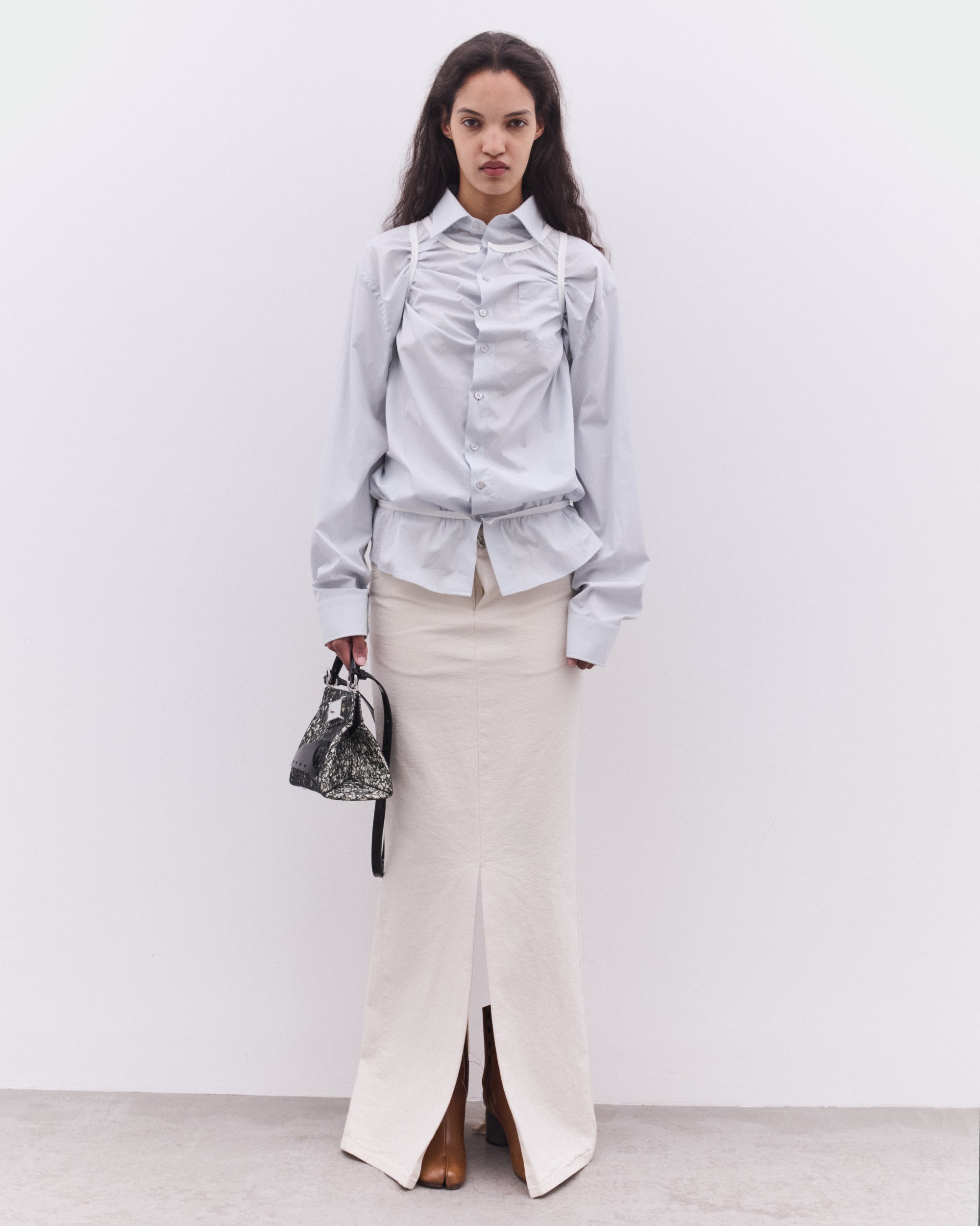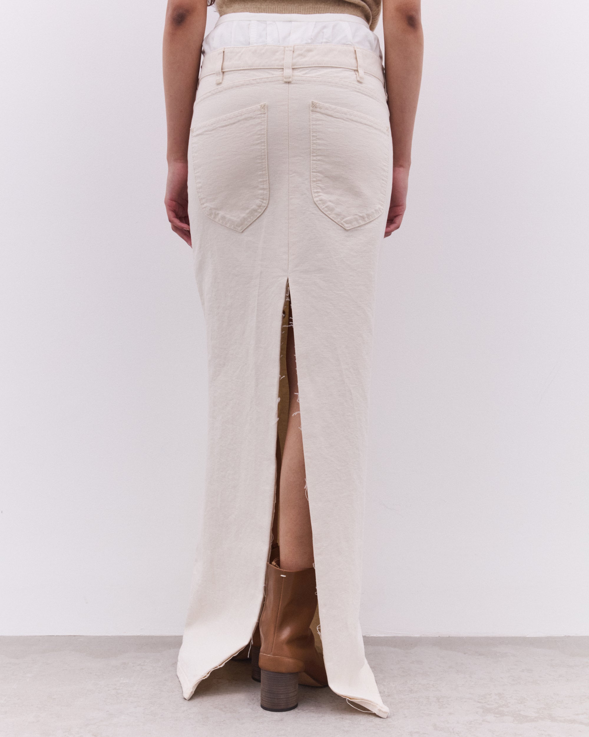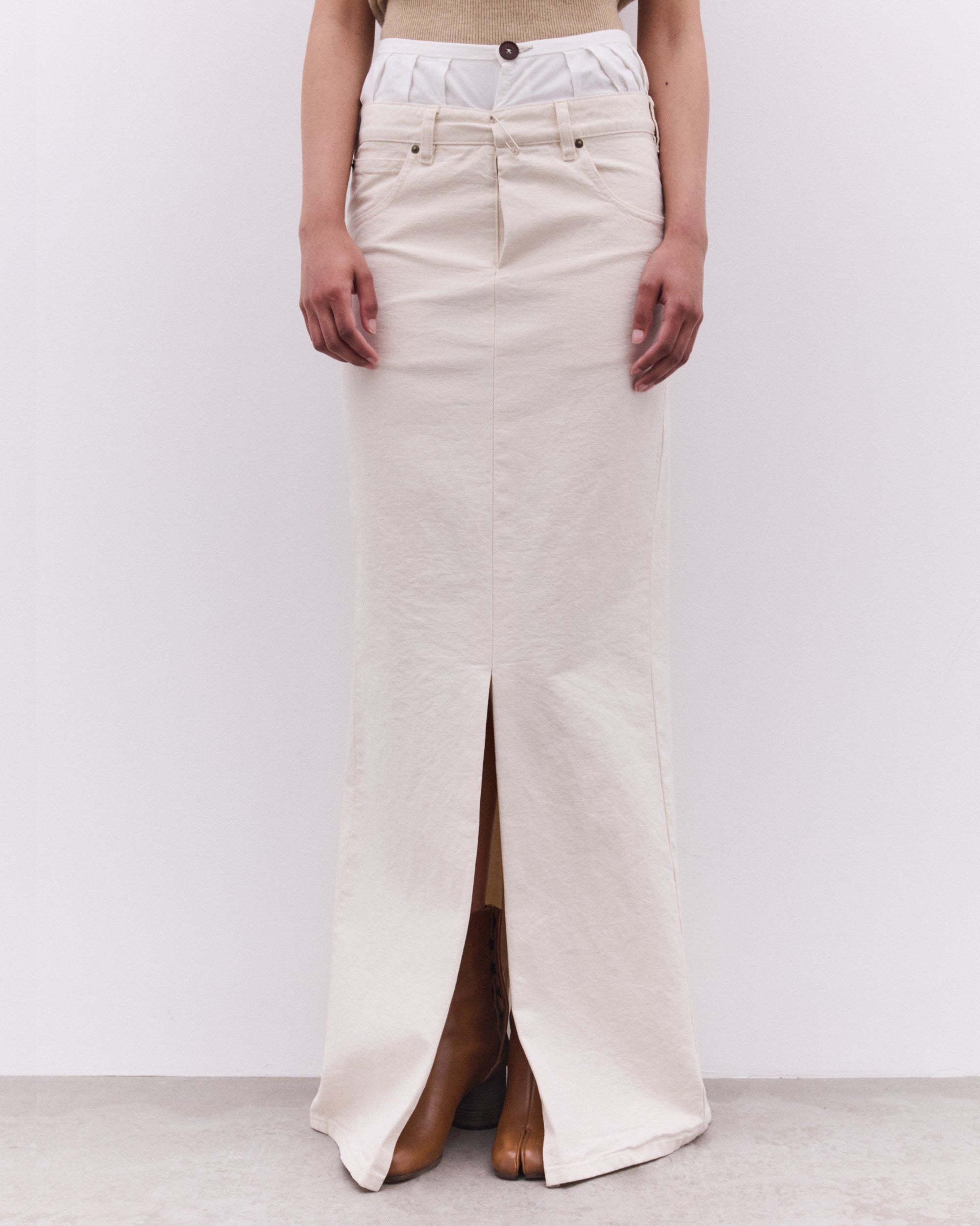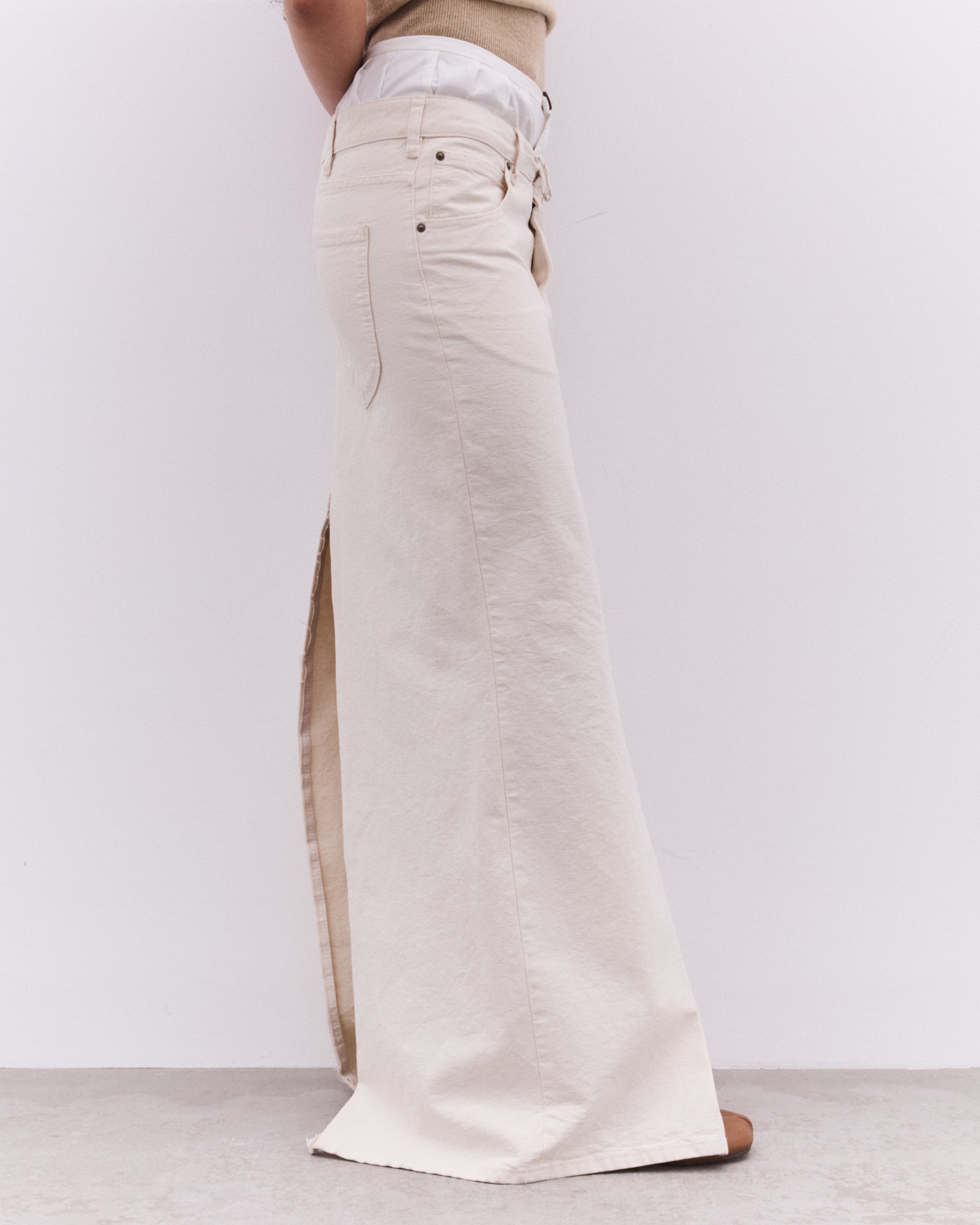 Denim fabricButton closureContrast poplin panel at waistFront and back pocketsSplit front and back seamsMaxi length