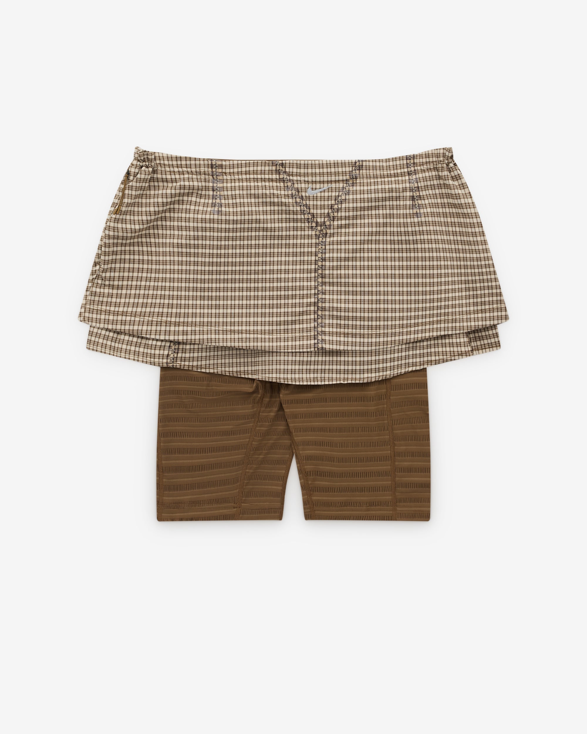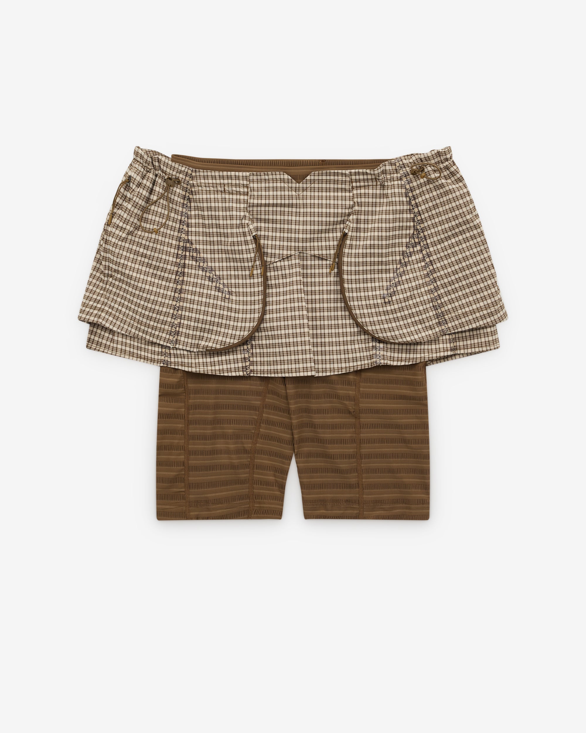 Reflective thread throughoutAll-over plaid printBungees cord detailsMultiple zippered pockets Layered shorts