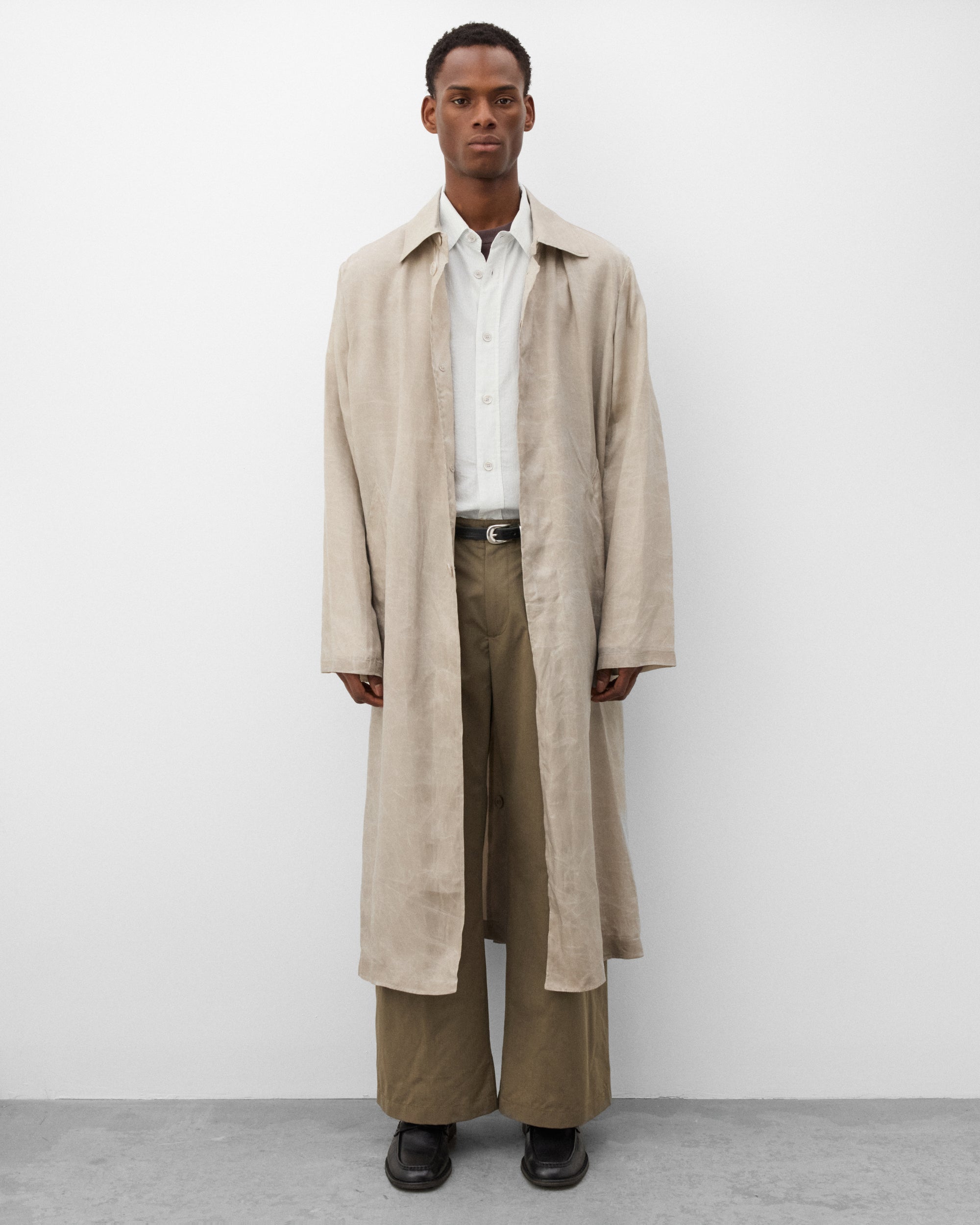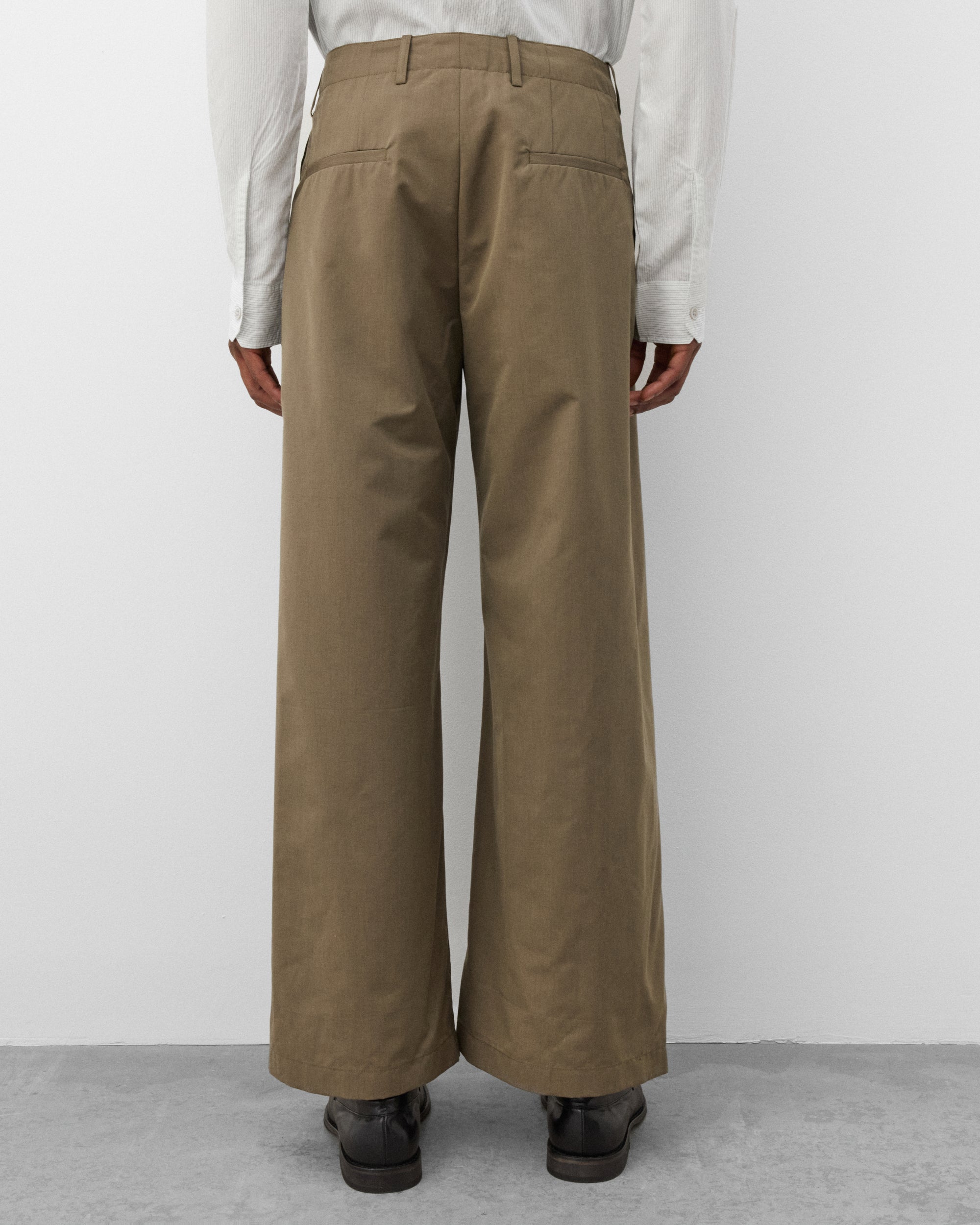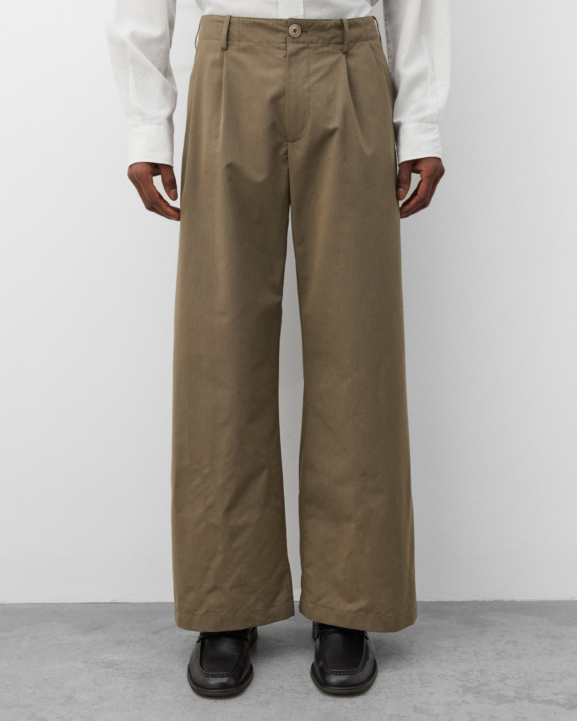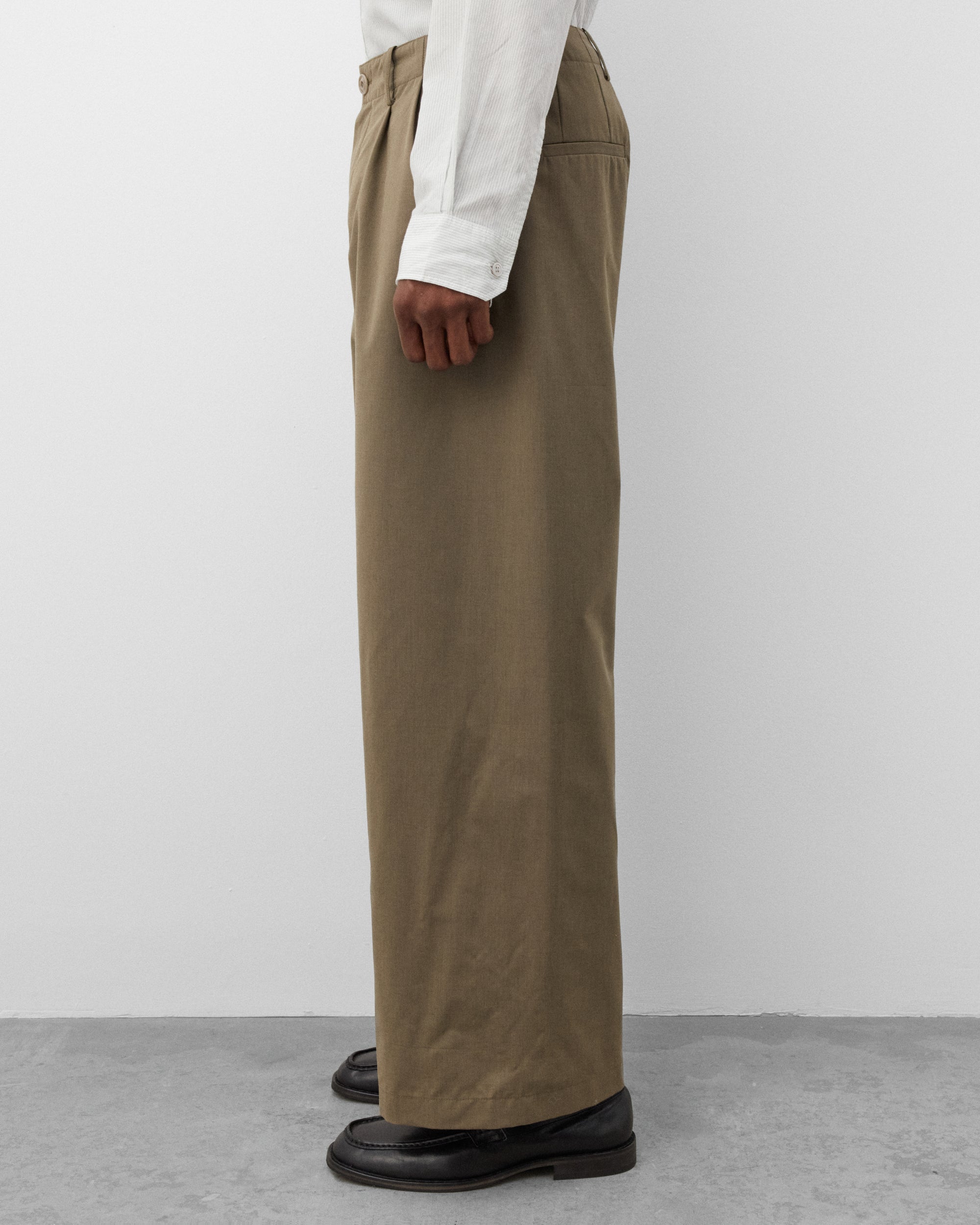 Double pleated front Corozo button closure Two front welt pockets No side seam Darted for shape Two back welt pockets YKK zip fly Wide legged relaxed fit