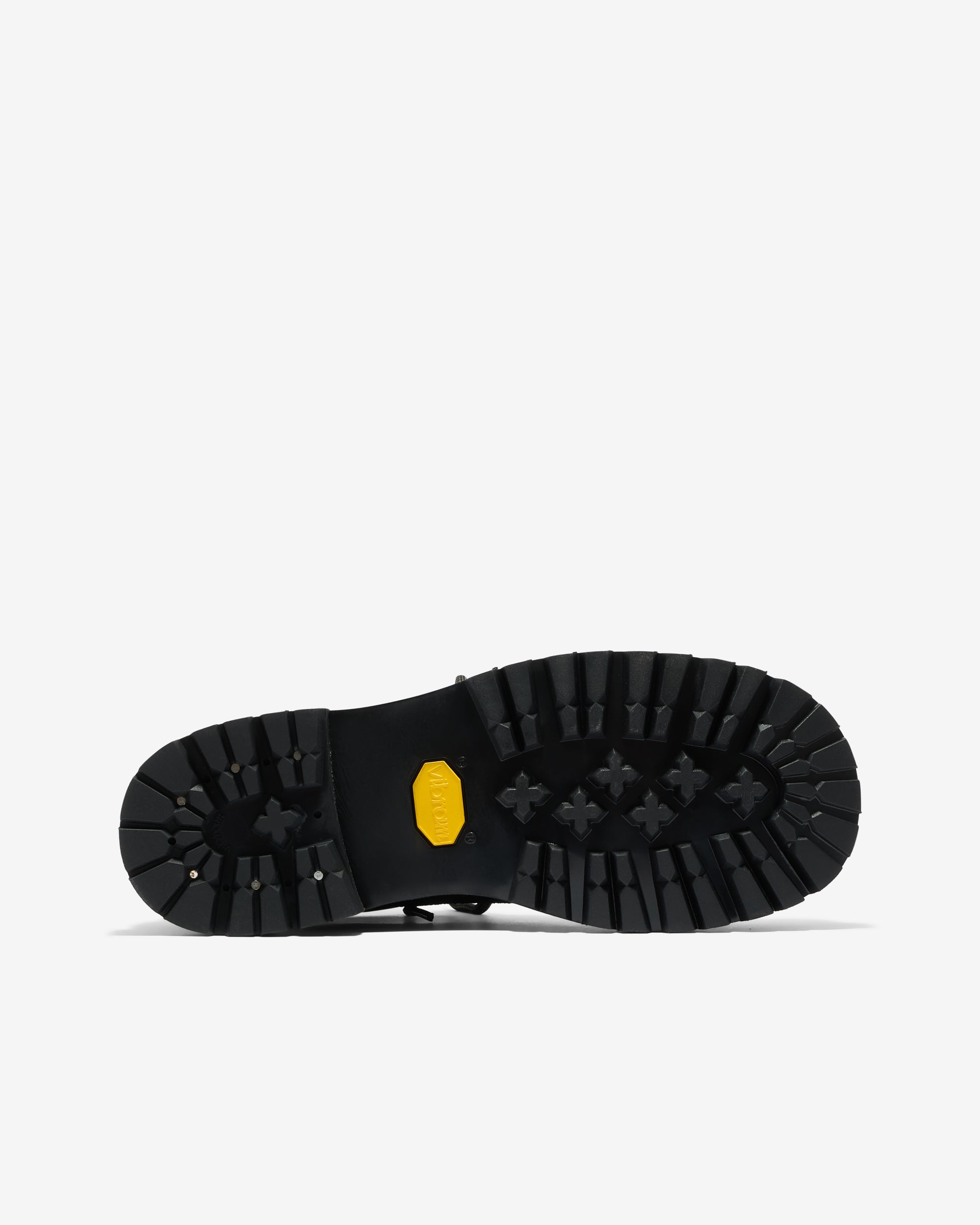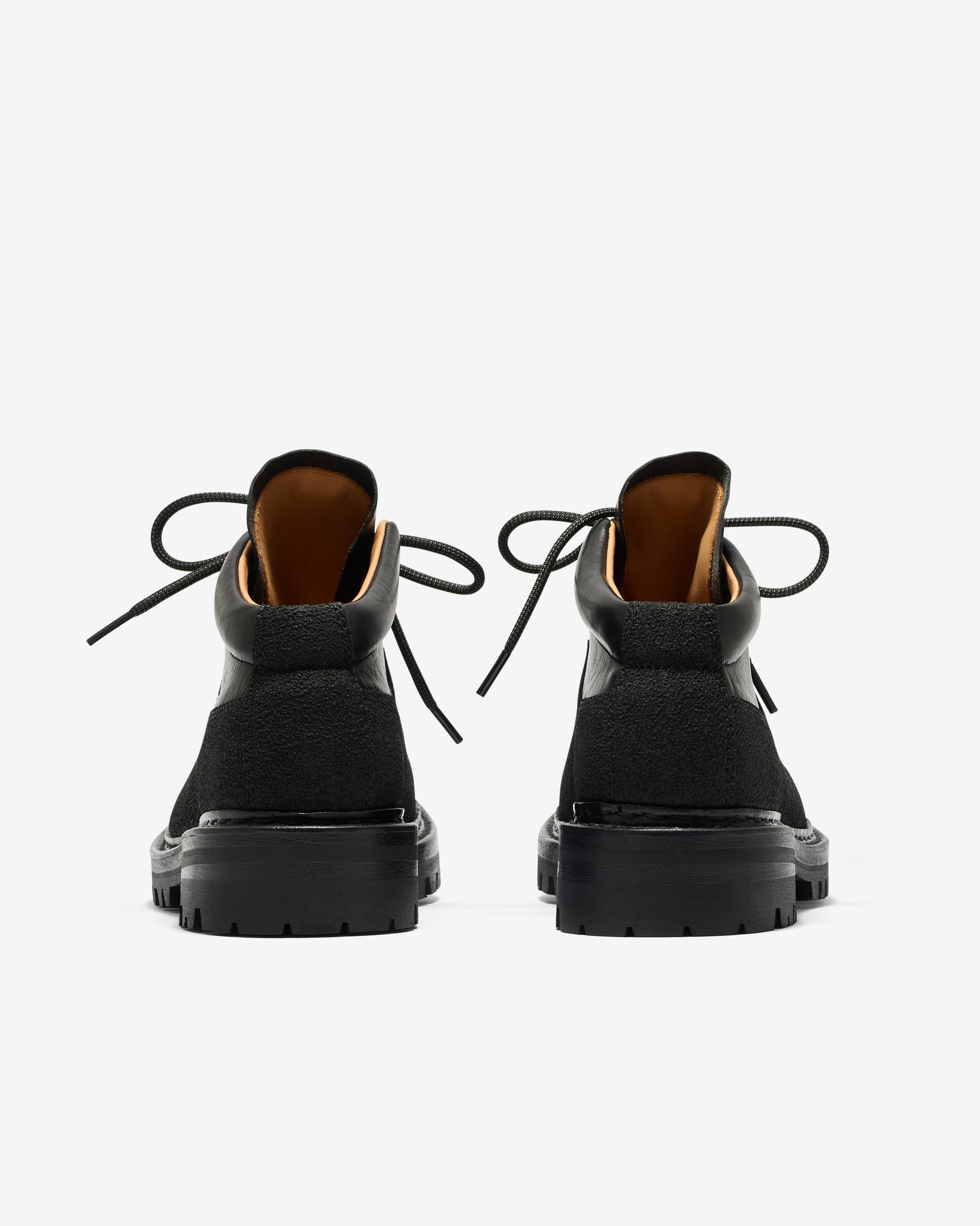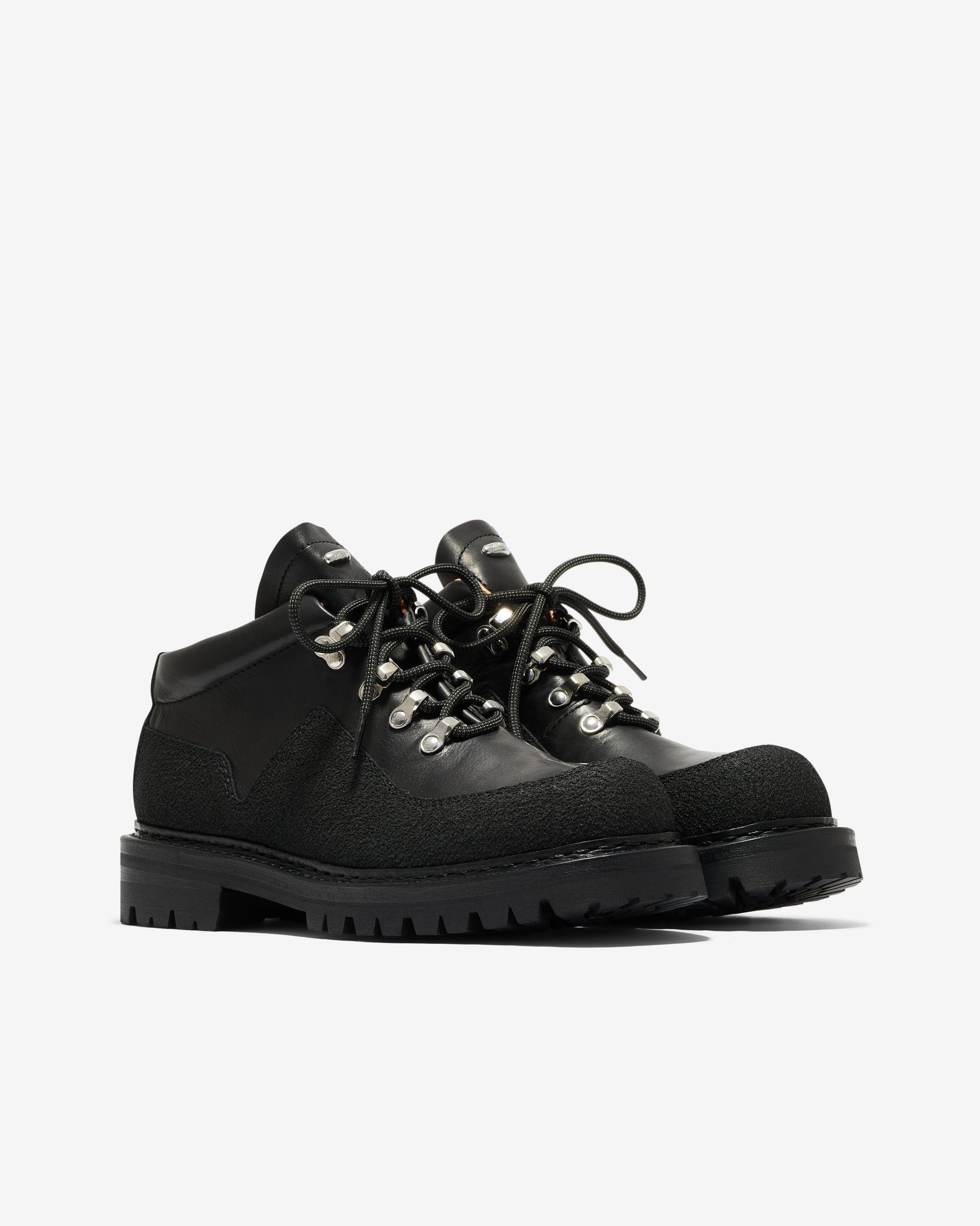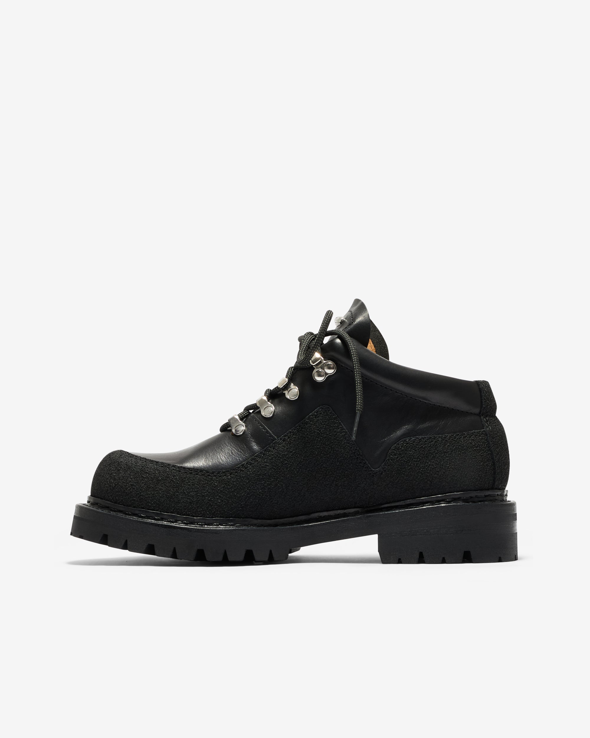 Italian leatherKevlar randMetal eyelets and speed hooksVibram lugged solePadded cuffMid-height shaftHiking boot inspiration100% LeatherMade in Portugal