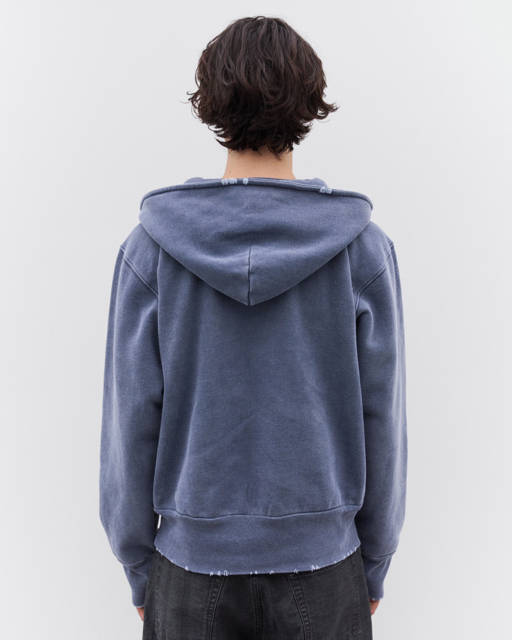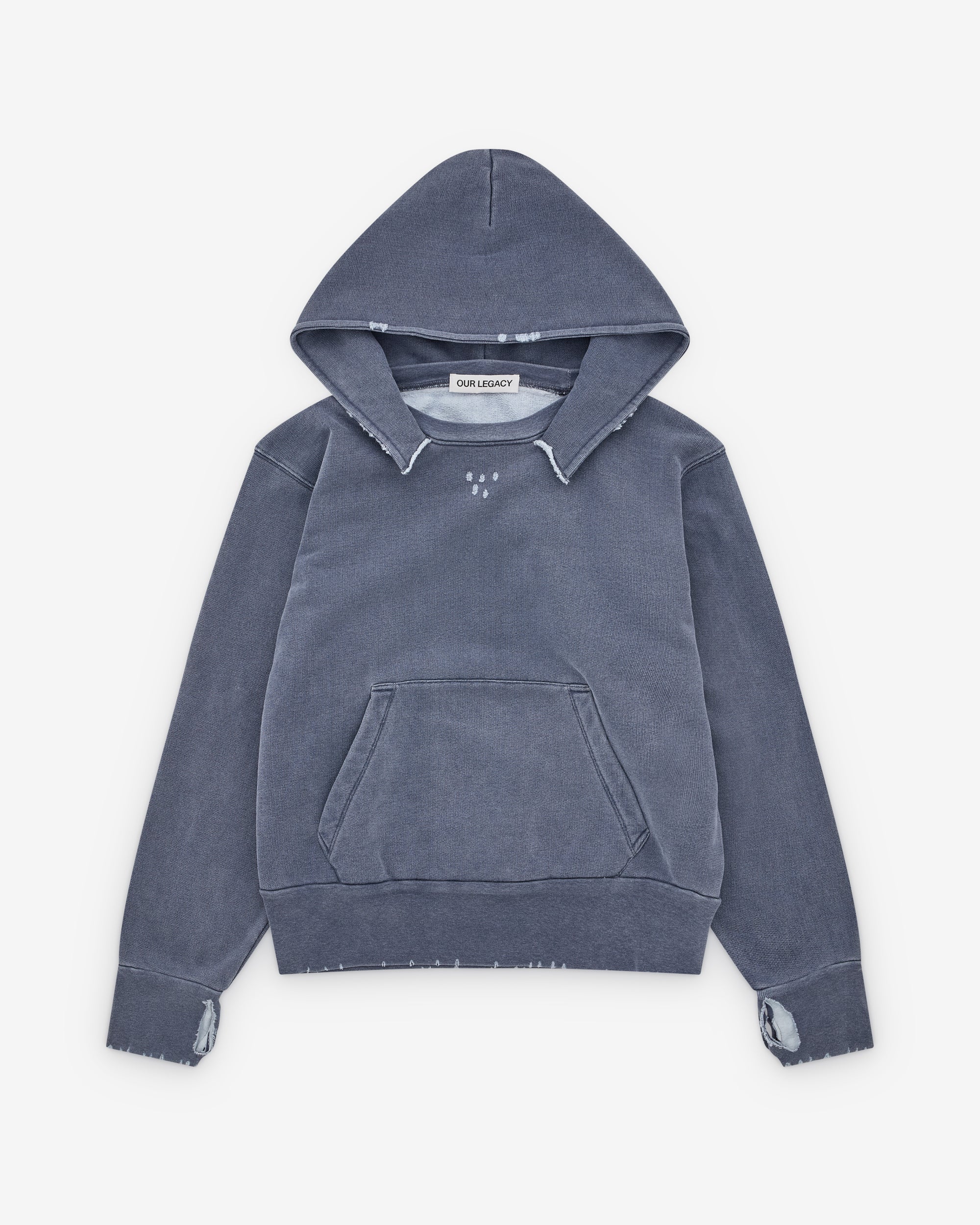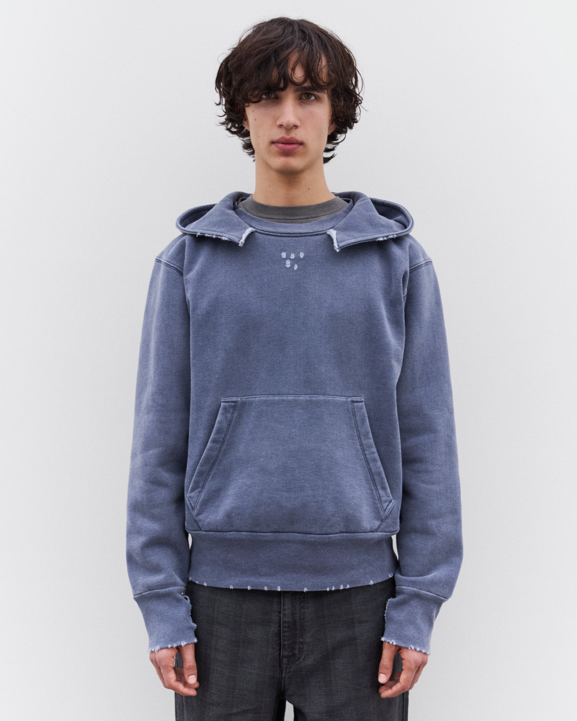 Pigment printedDistressed detailsWide ribbed necklineOpen hood with raw edgesRibbed hem and cuffsDistressed thumb openingsKangaroo pocketBoxy fit