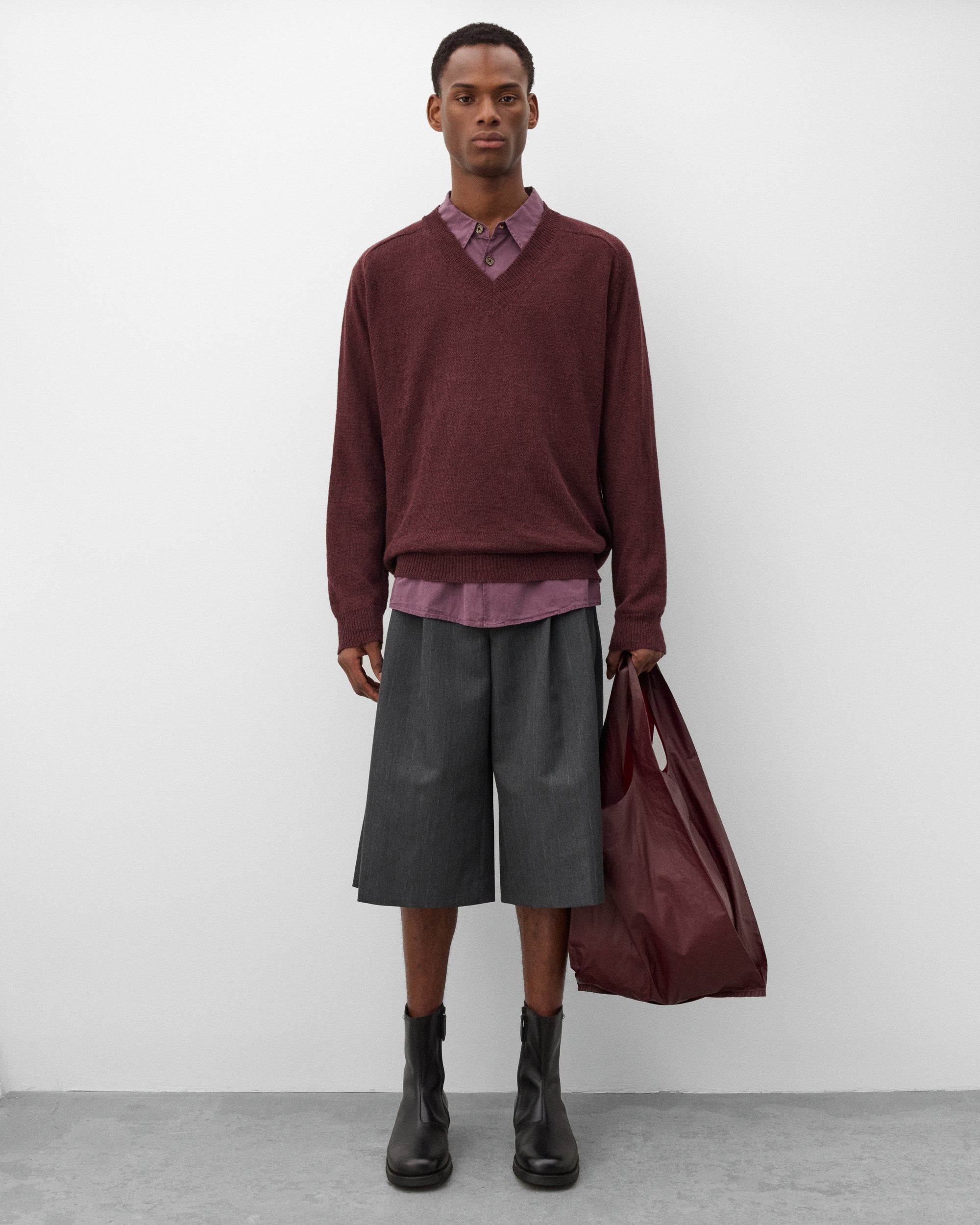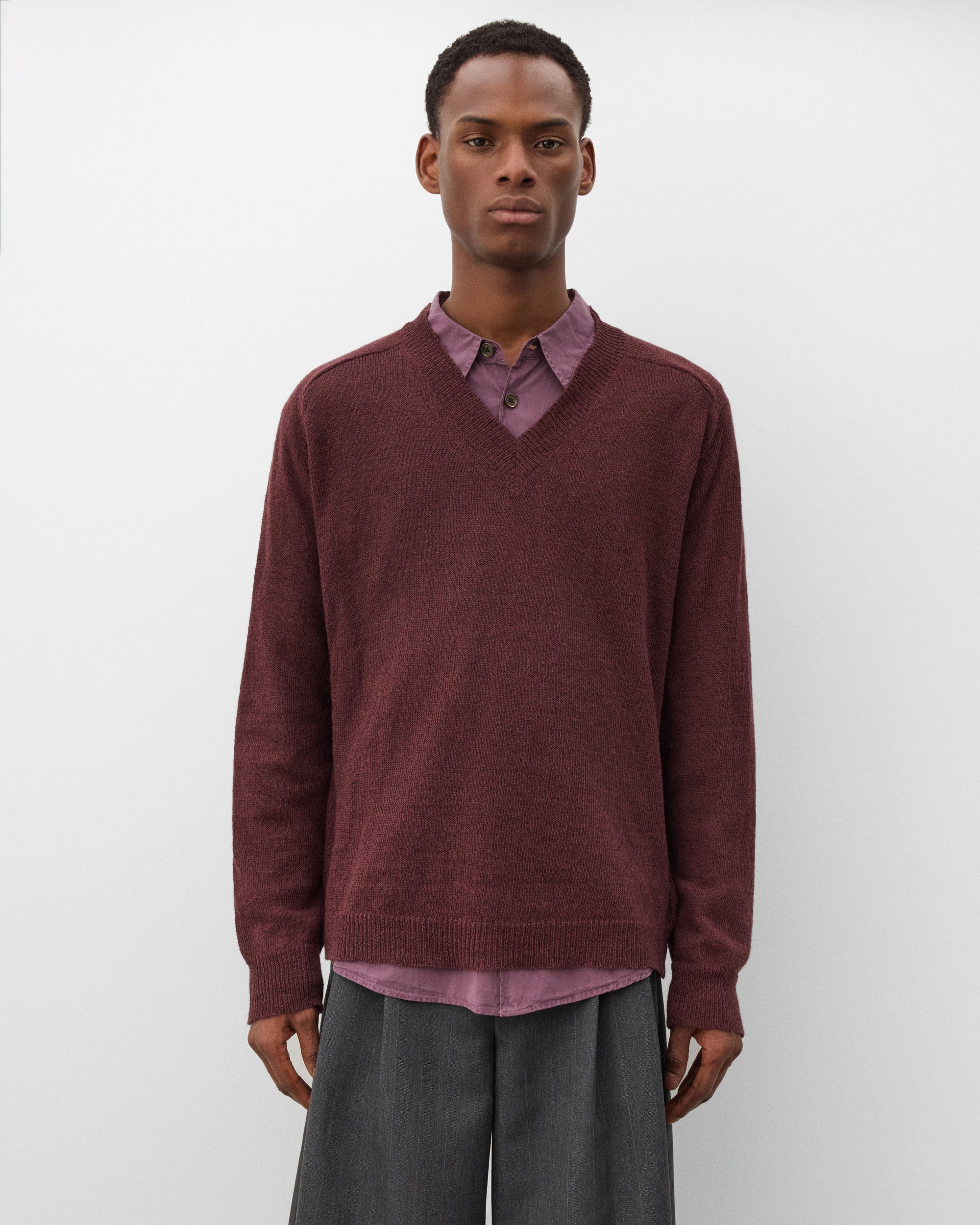 Airy plain knitRibbed V-neck collarSaddle sleevesRibbed cuffs and hemRelaxed, boxy fit