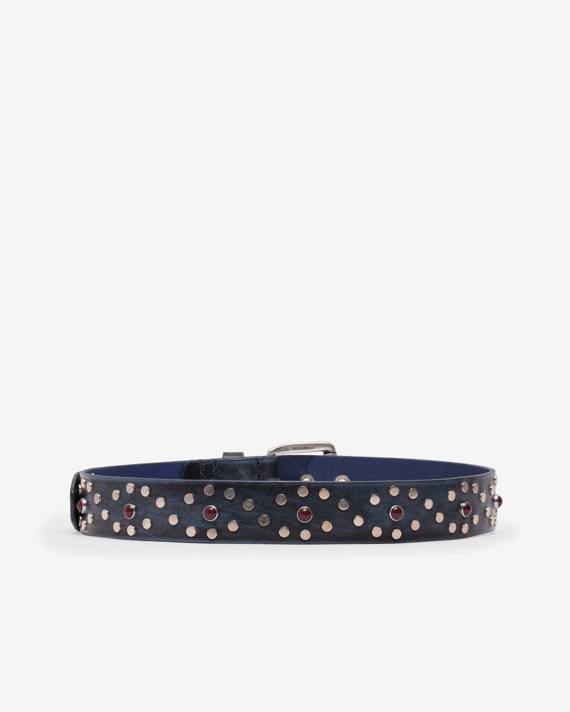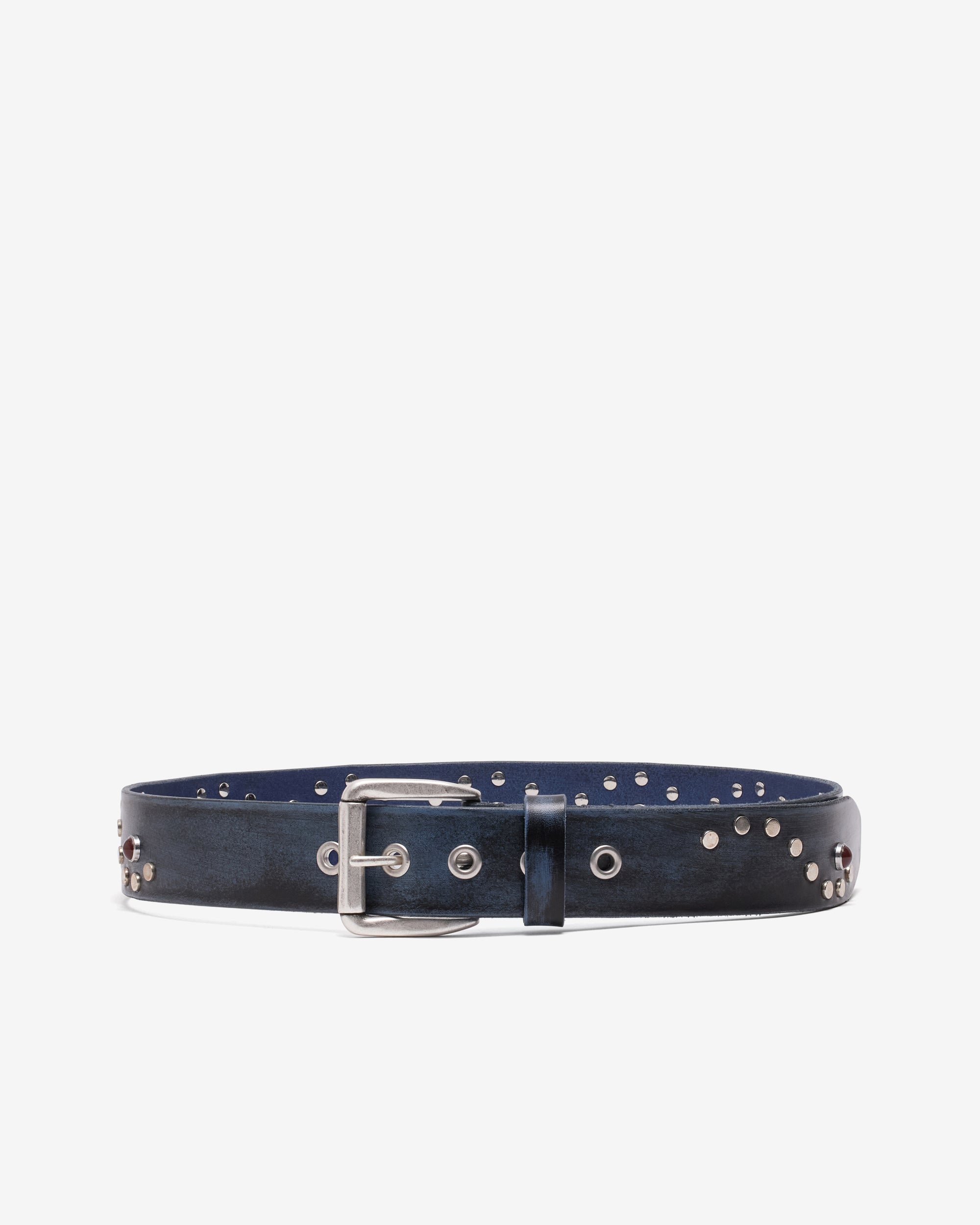 Italian cow leatherAbrasion finish4 CM belt baseRepetitive spiral rivet patternContrast-colored studs at spiral centersStiff hand feel