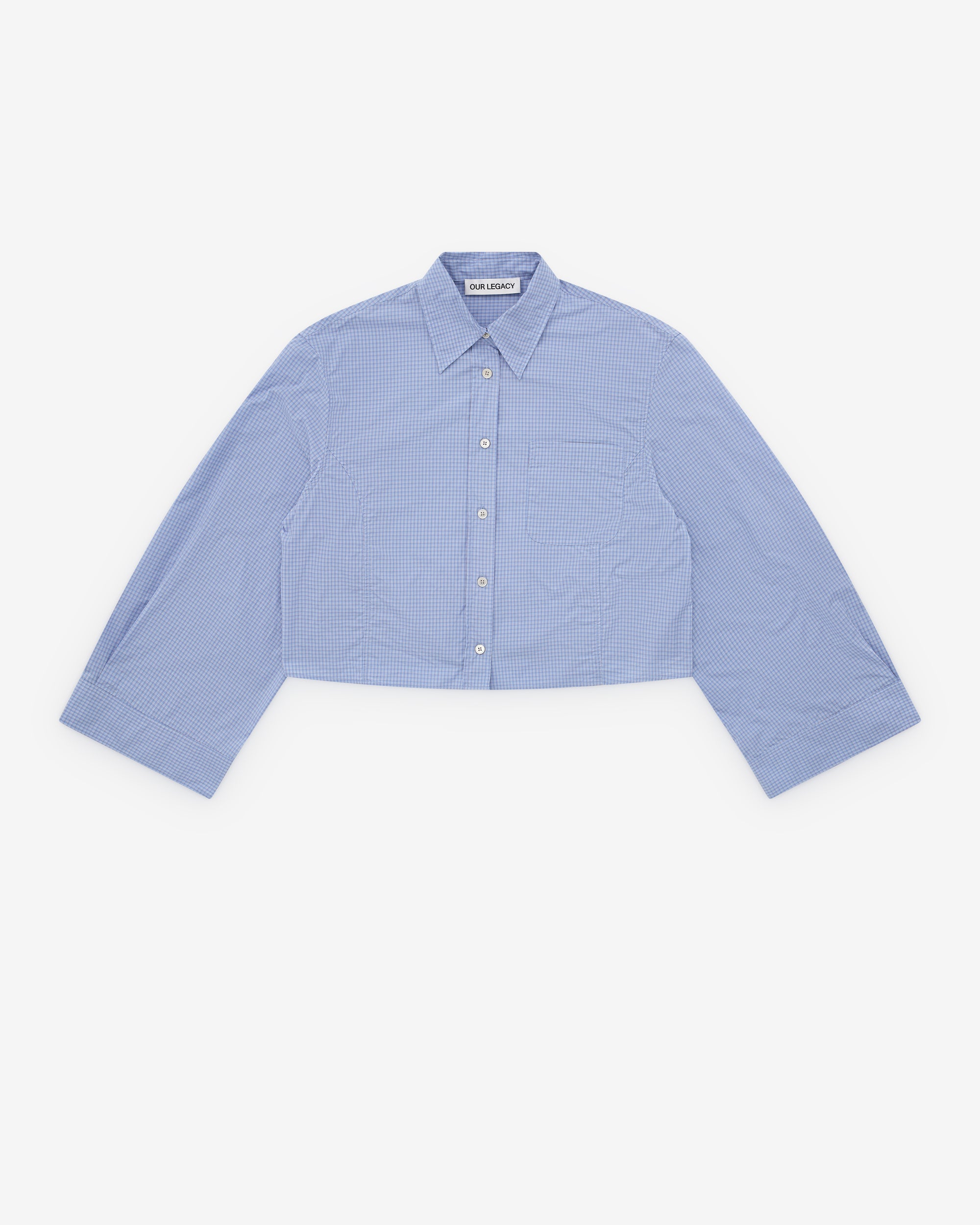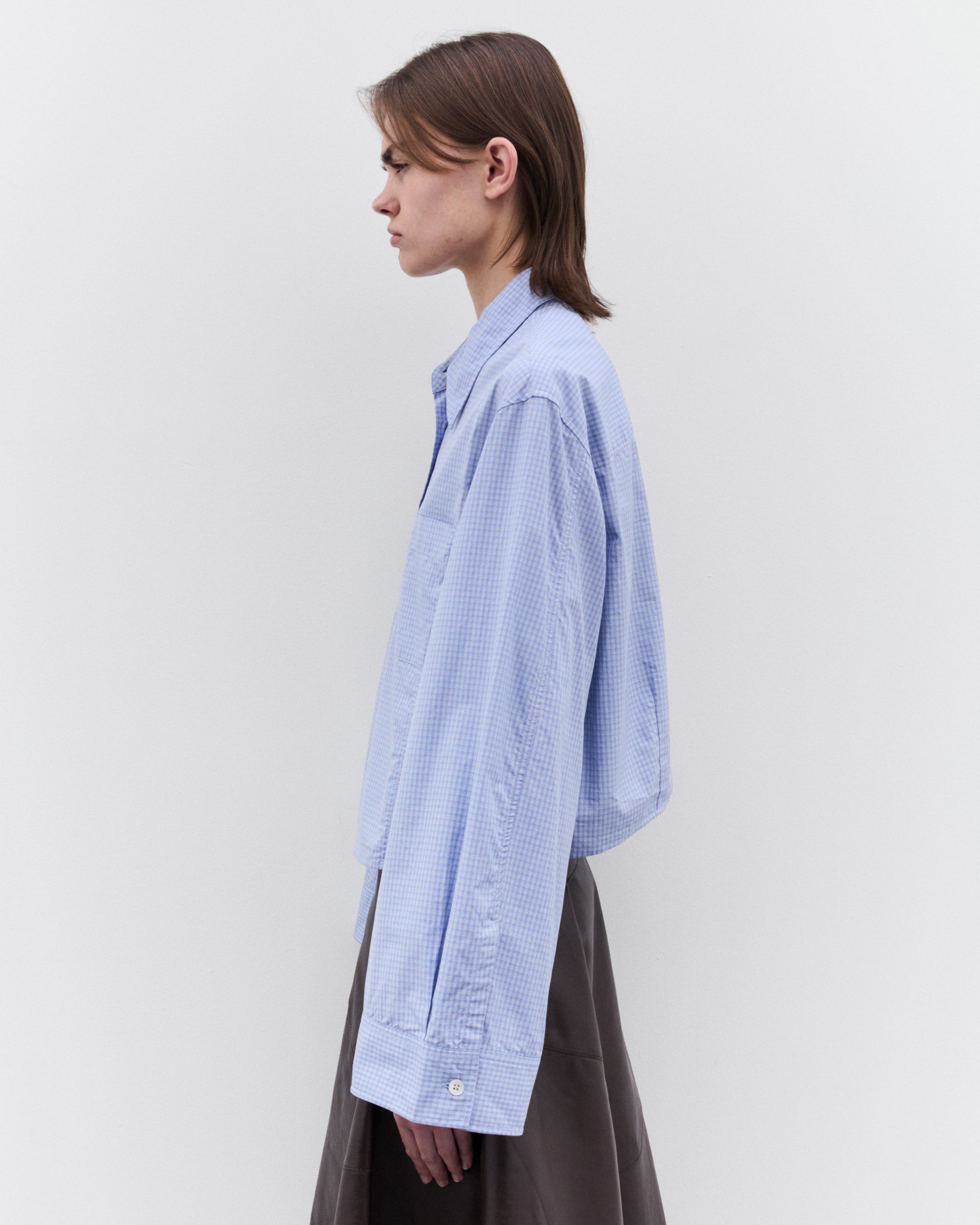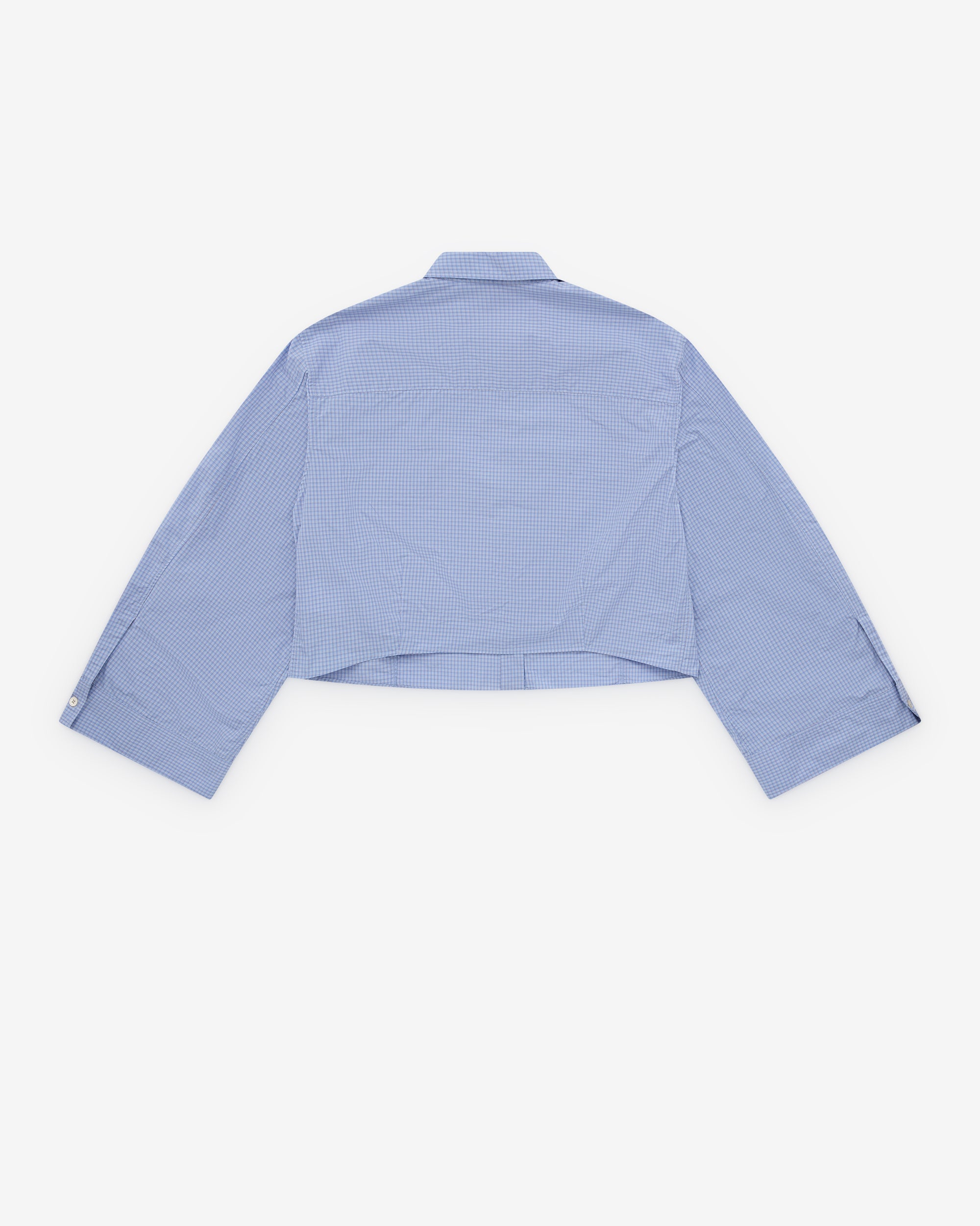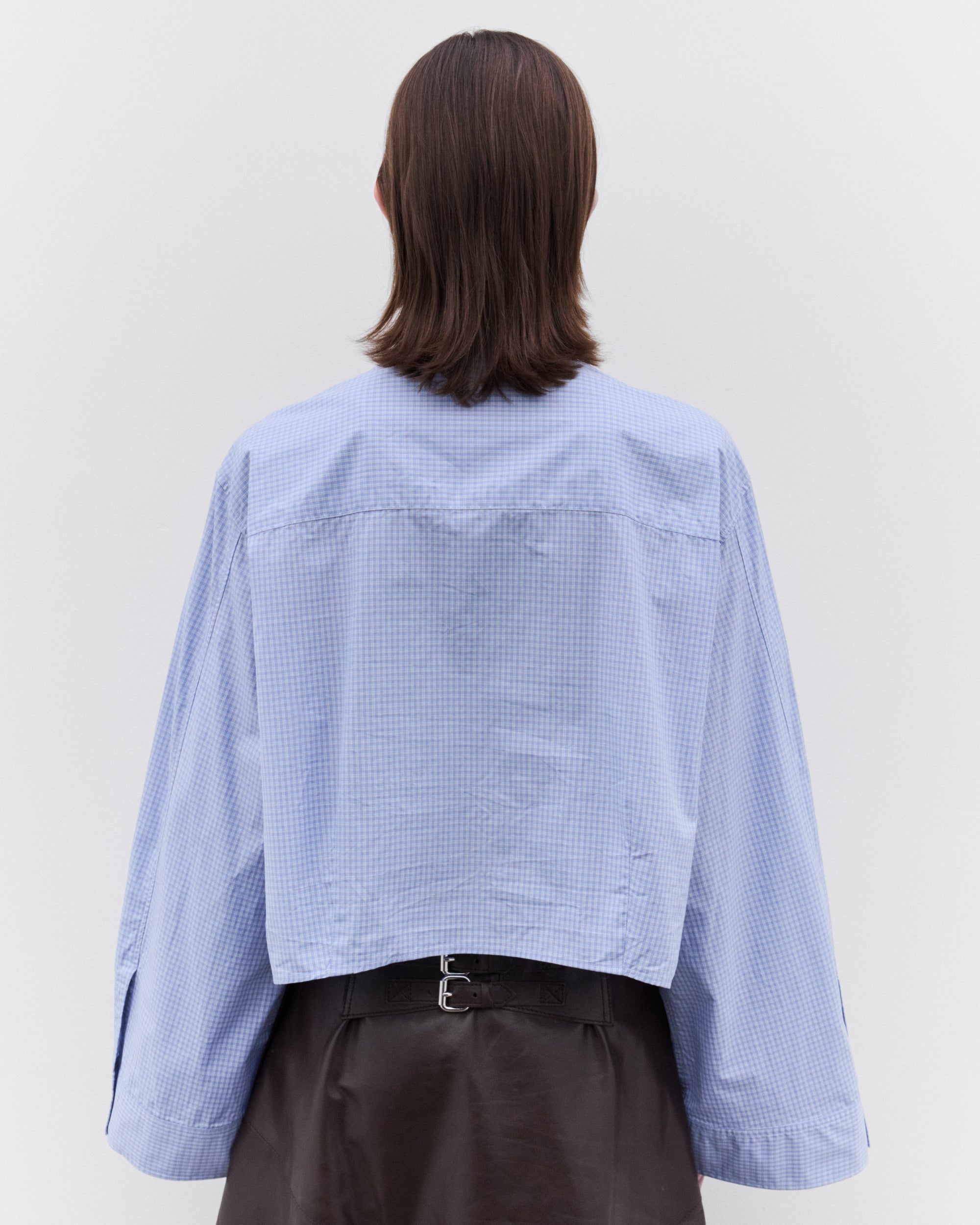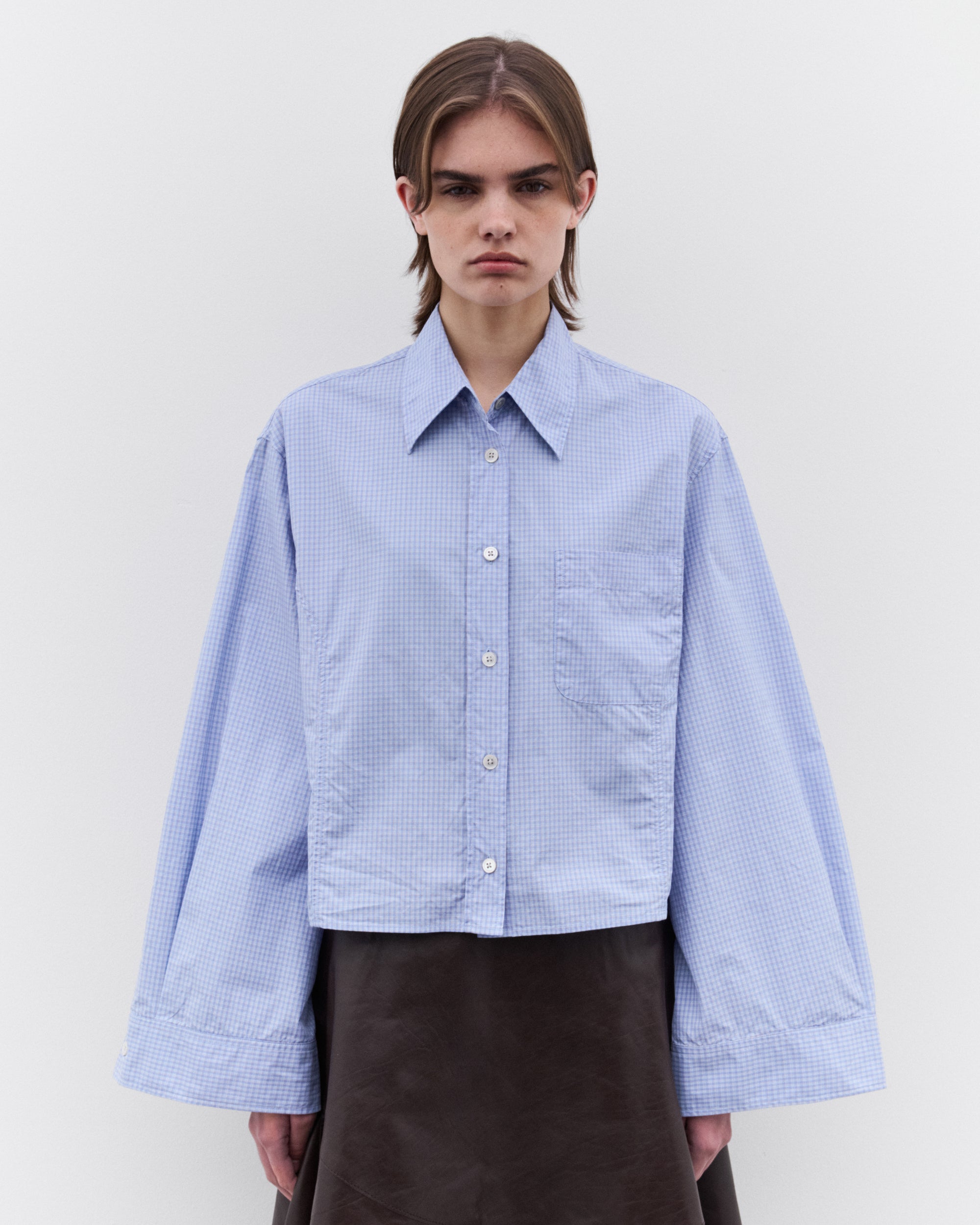 Micro check fabricClassic collarFront button closureExaggerated sleevesStraight hemBoxy, cropped fitChest pocket