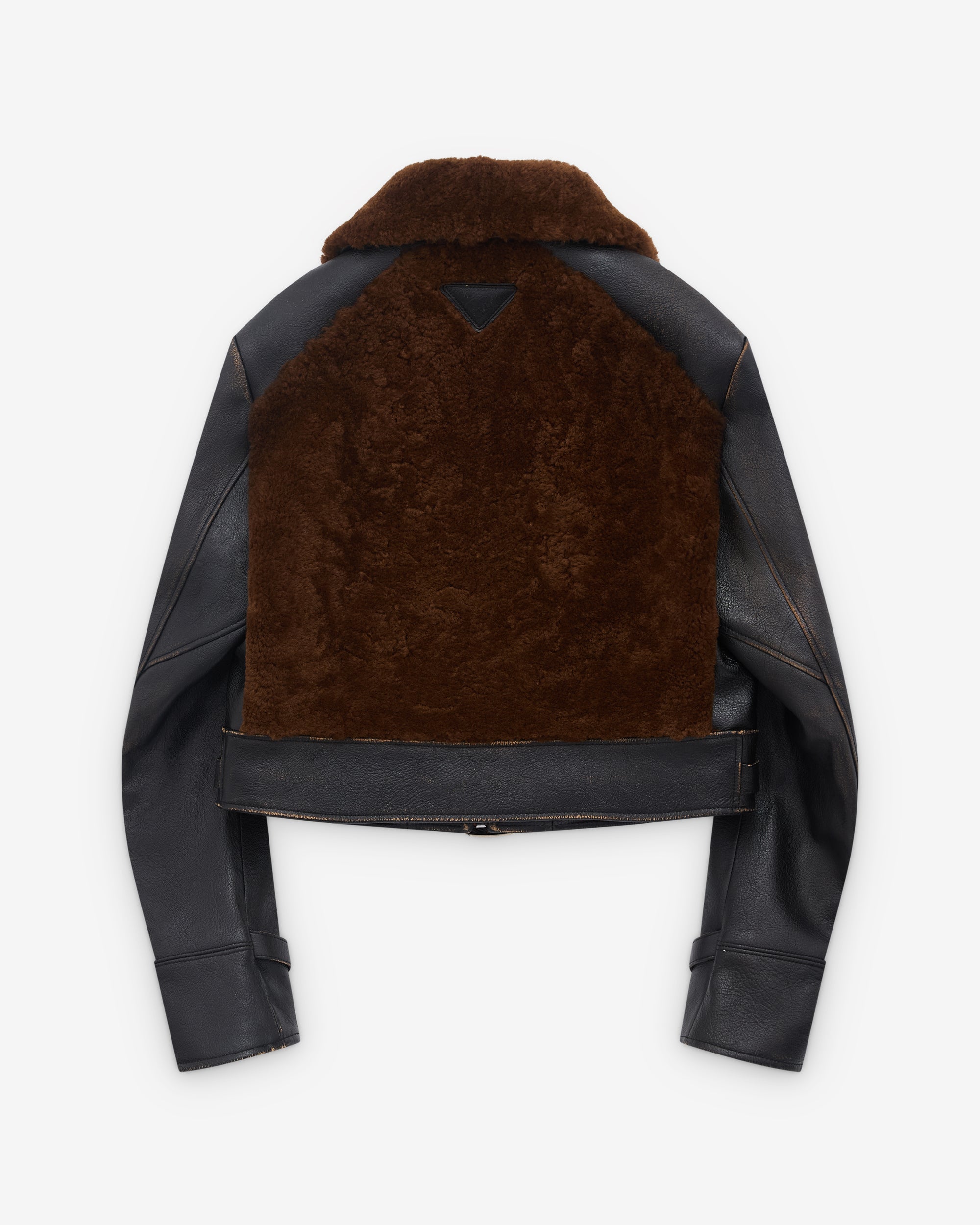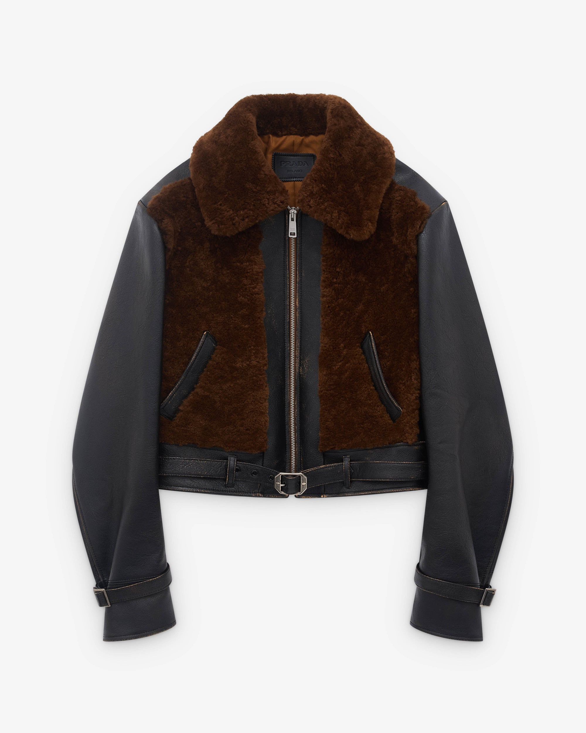 Classic jacket collarShearling and leather panelsFull length metal zipperFront pocketsInternal liningBelted waist lineAdjustable straps at cuffsLeather Prada triangle logo at back neck