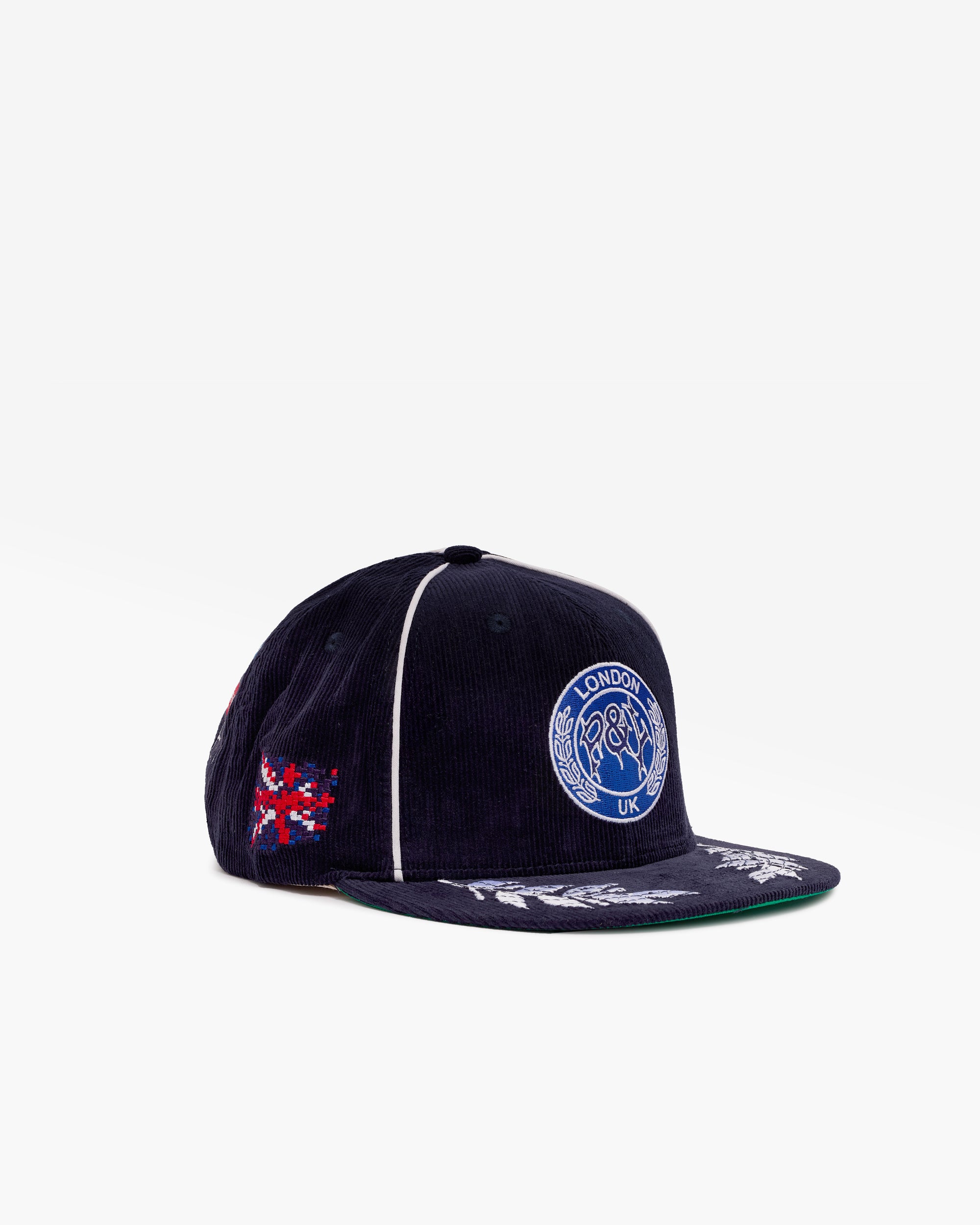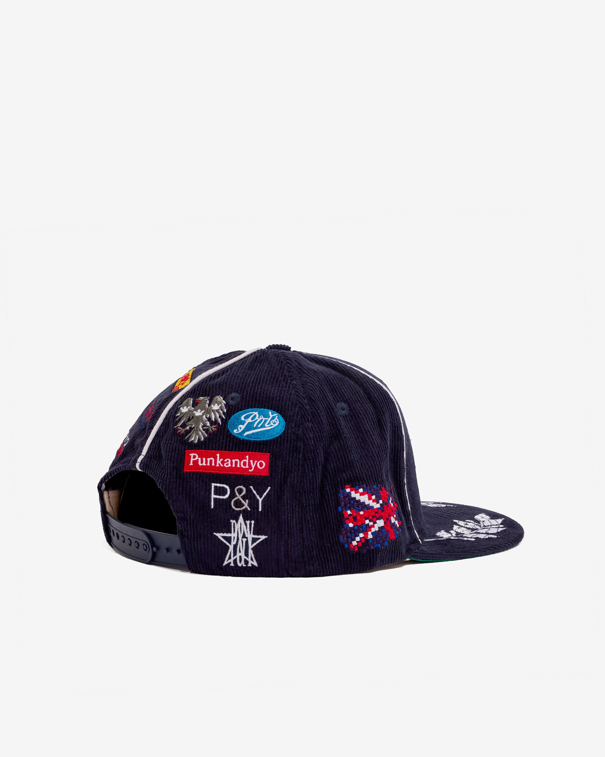 SnapbackCorduroy fabricationEmbroidered patchwork throughoutFlat peakImported