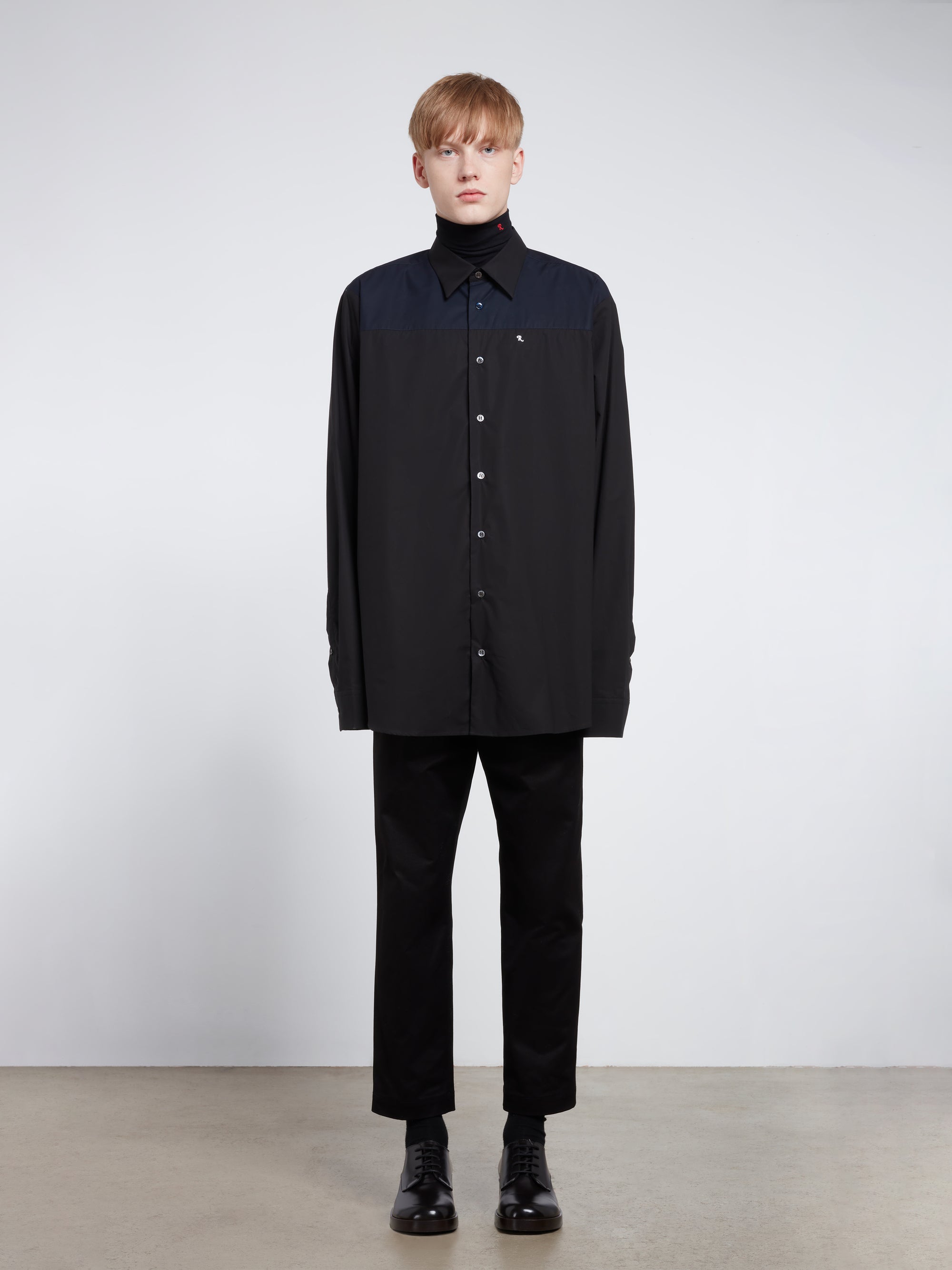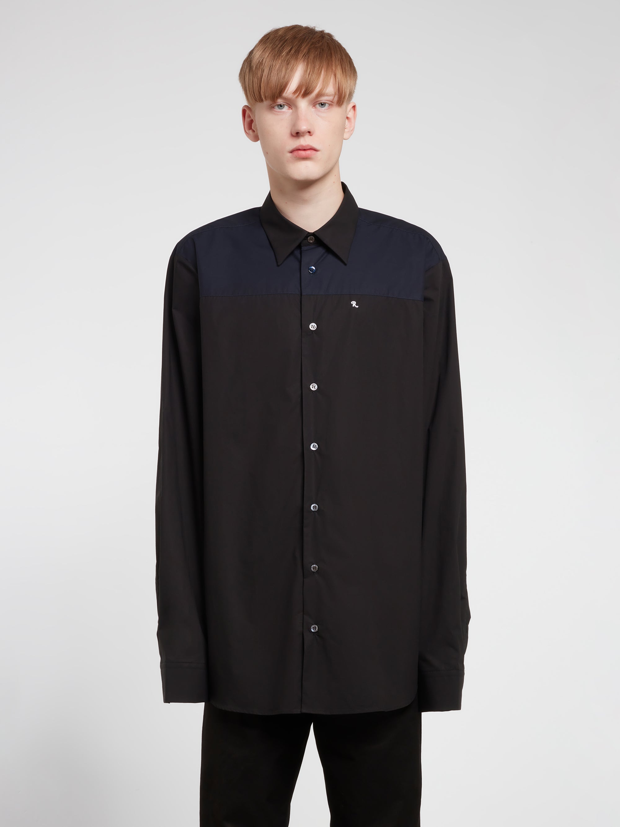 This Raf Simons Men's cotton shirt offers a fresh take on a classic with subtle bicolour panelling. The design features a point collar, a contrasting navy panelled upper, a button placket and long sleeves with button cuffs. The statement design is finished with a small 'R' embroidered to the chest.
