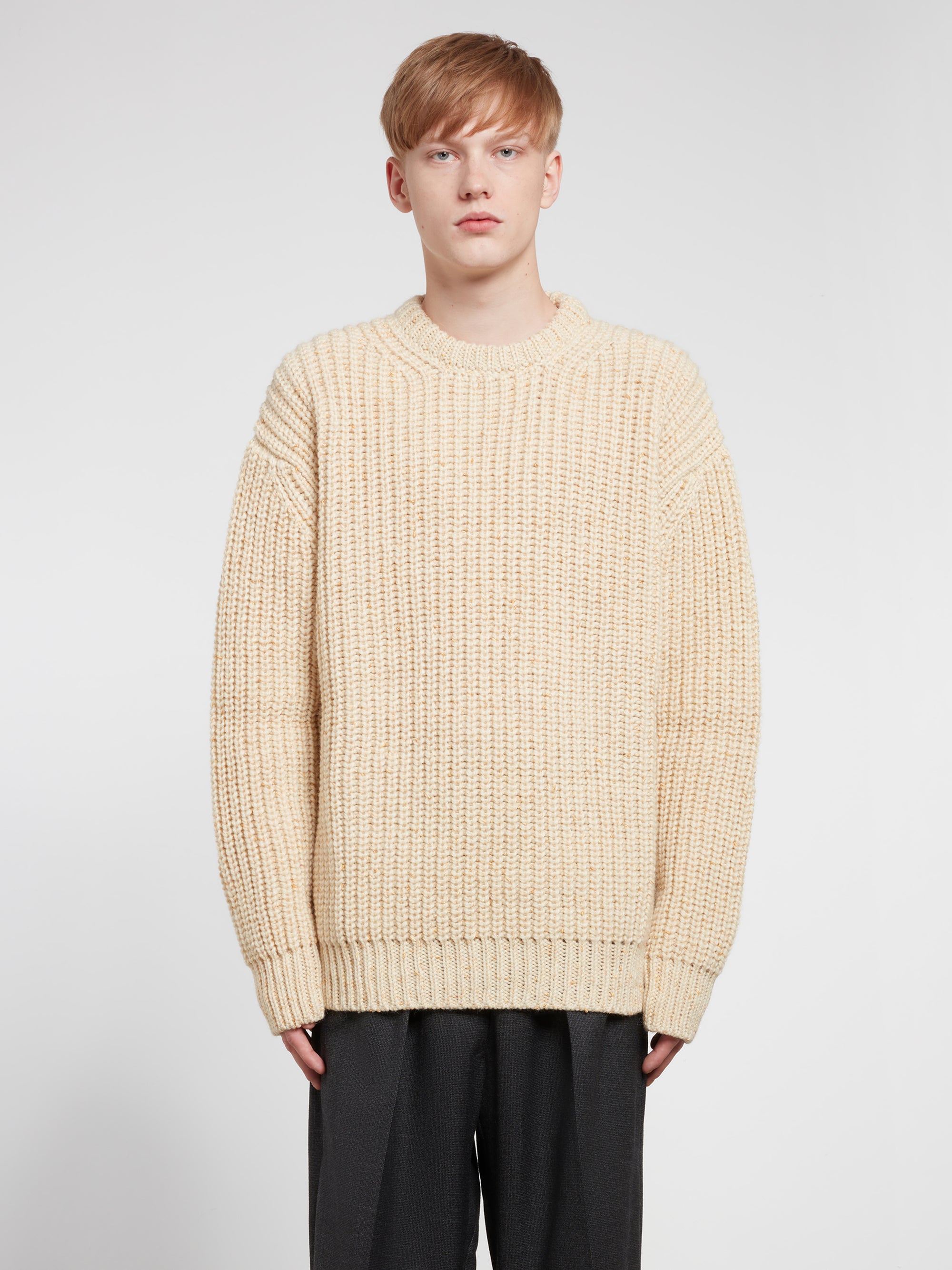 Raf Simons Men’s Bulky Pearl Ribbed Roundneck Sweater Ecru Yellow