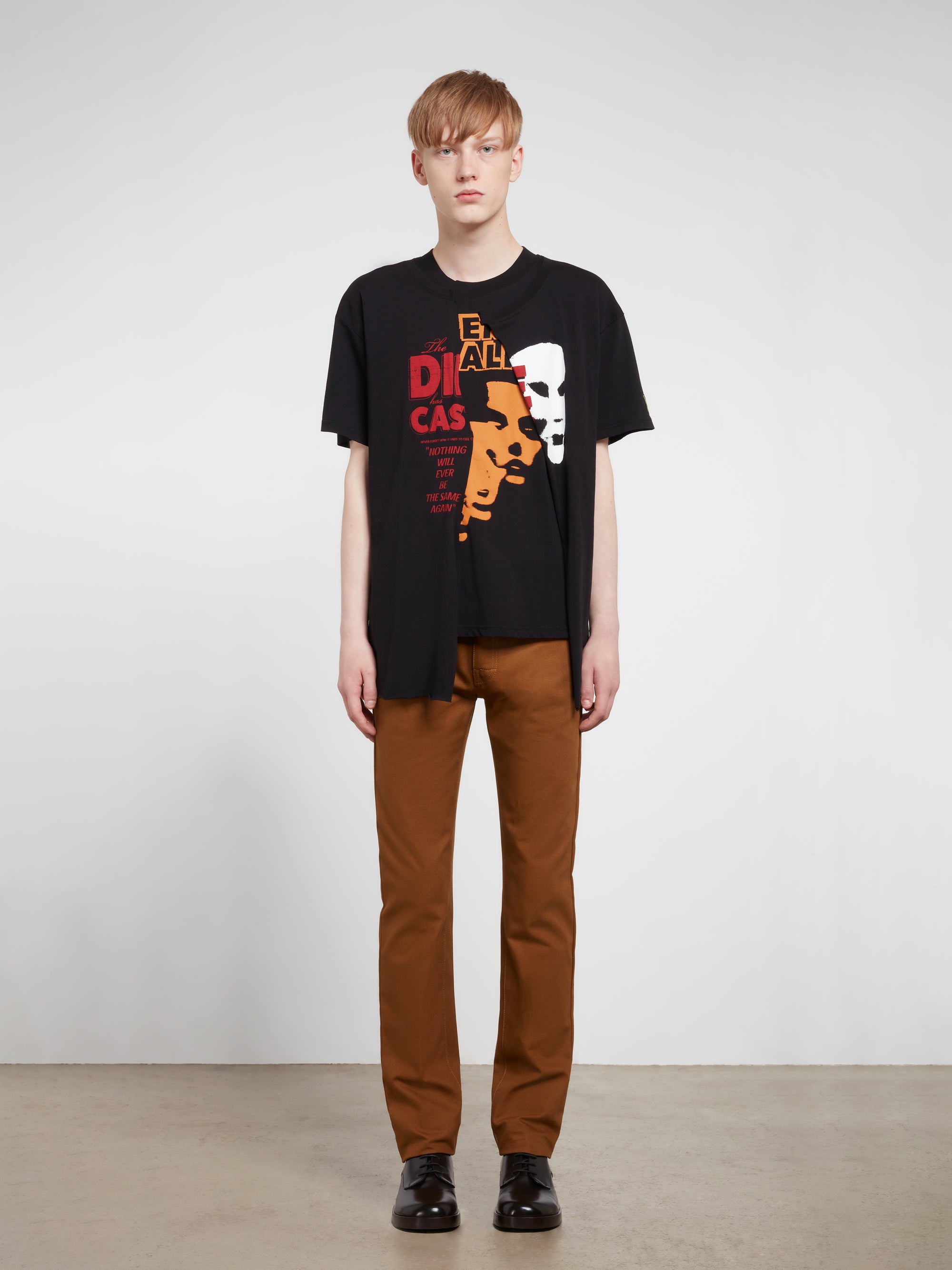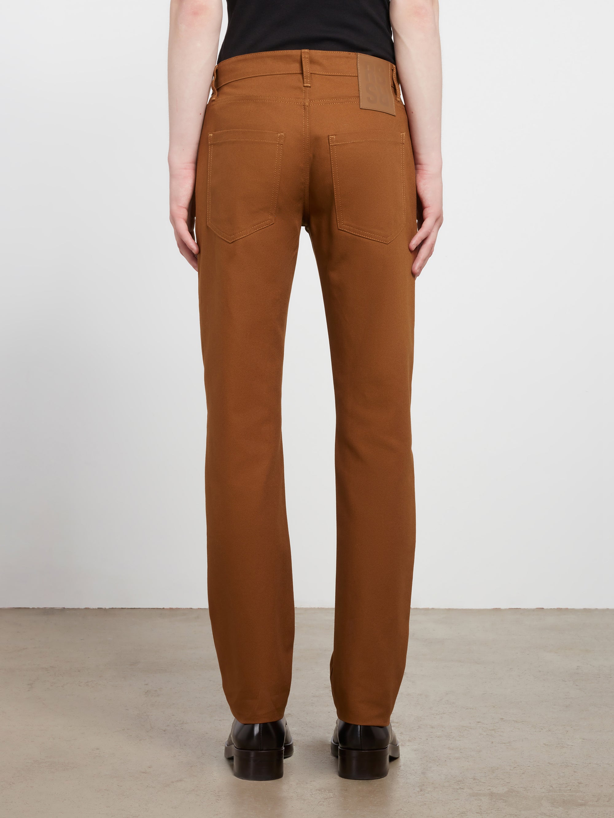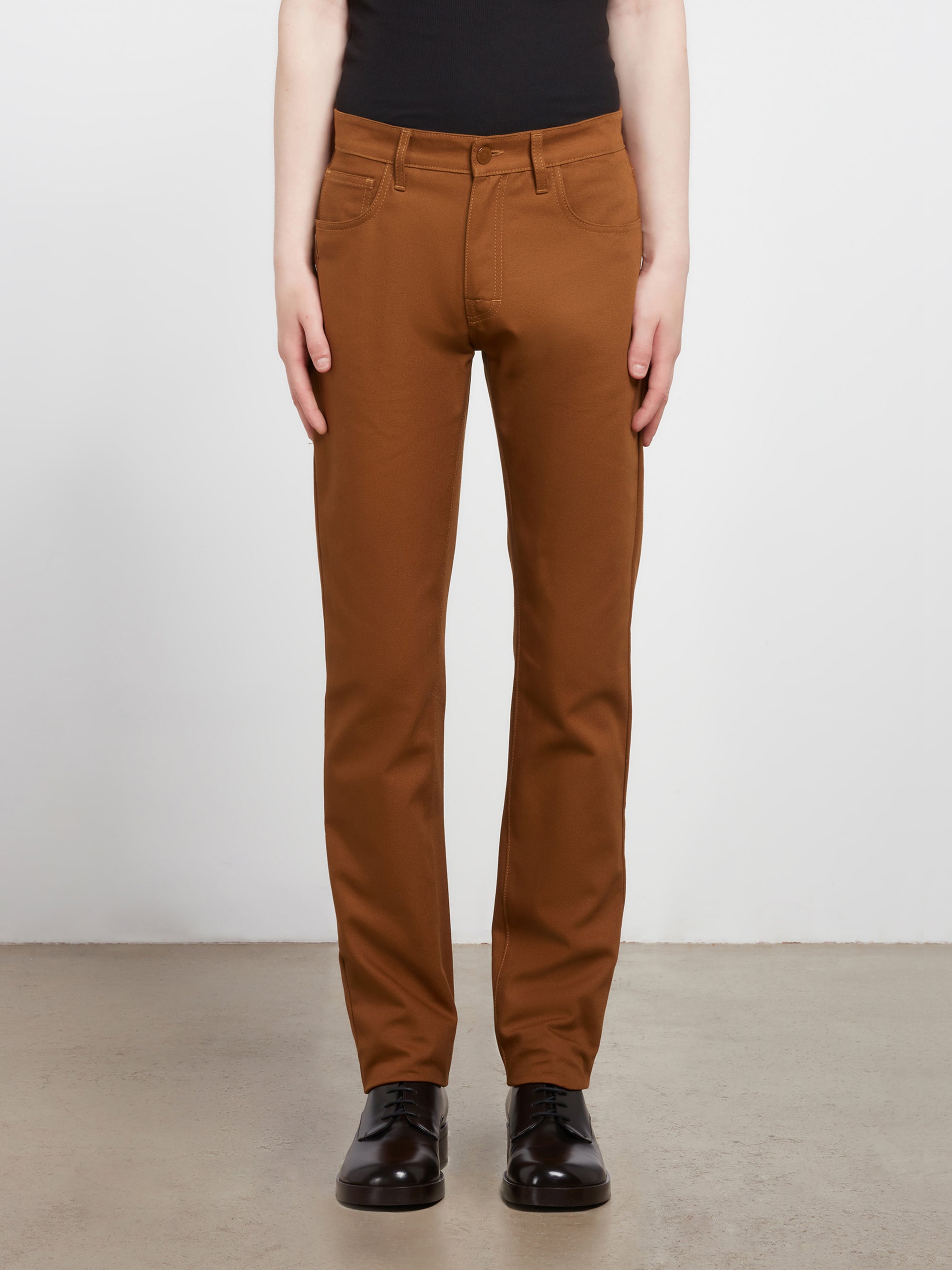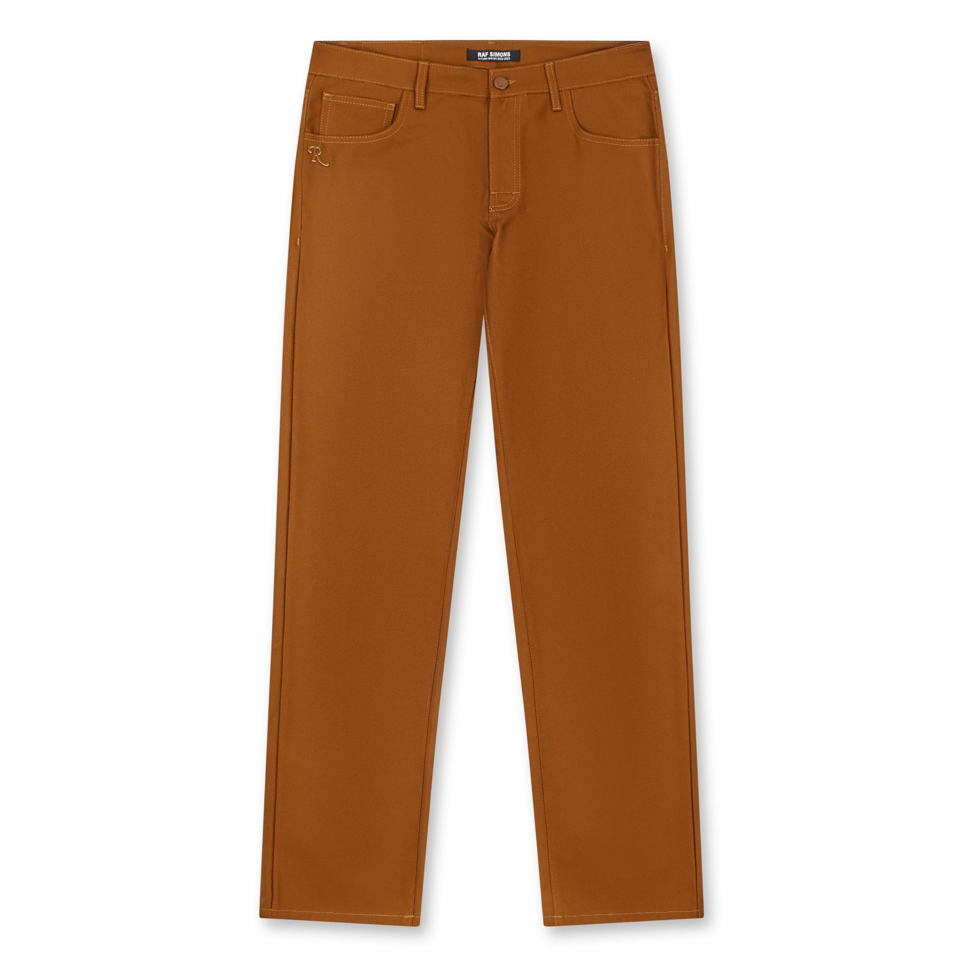 These Raf Simons workwear inspired pants are crafted from denim in a warm shade of brown. The trousers boast a mid-rise with a slim fit and straight cut legs. The design is finished with button fastening, a zip fly, belt loops and five pocket construction.