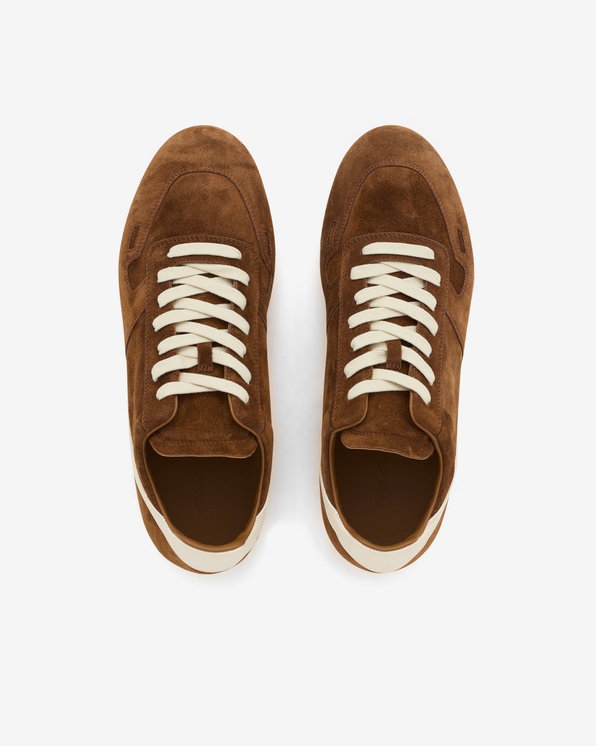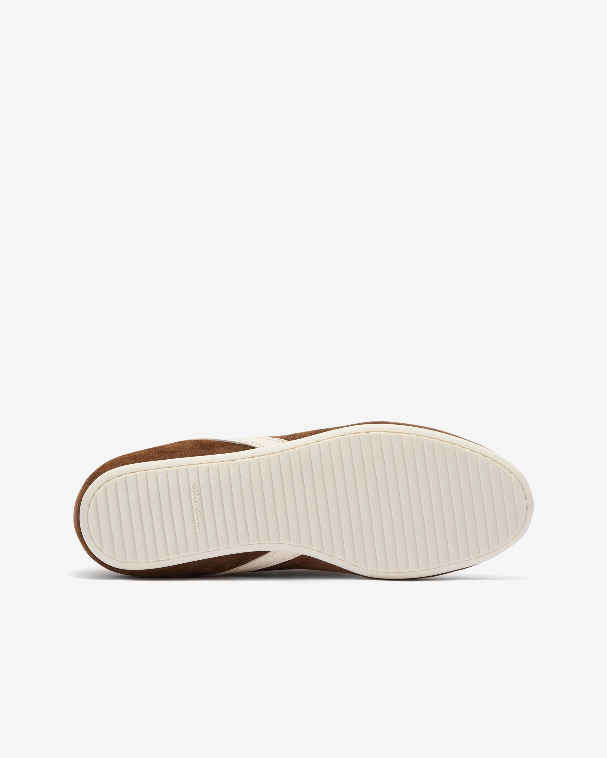 Thin shark tooth soleSix eyelets lace closureIntegrated angled contrast colour side stripeMediumweight full grain cow leather