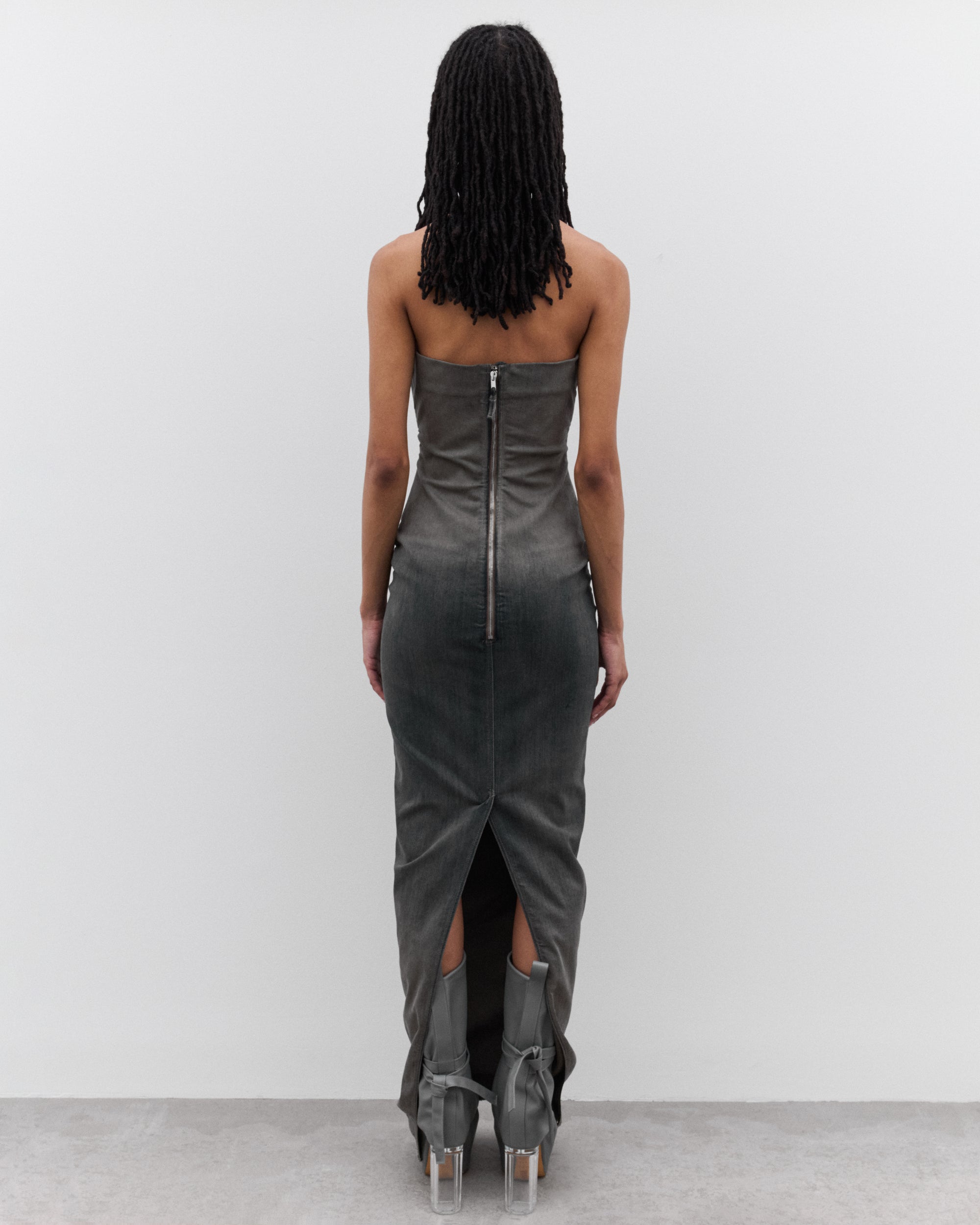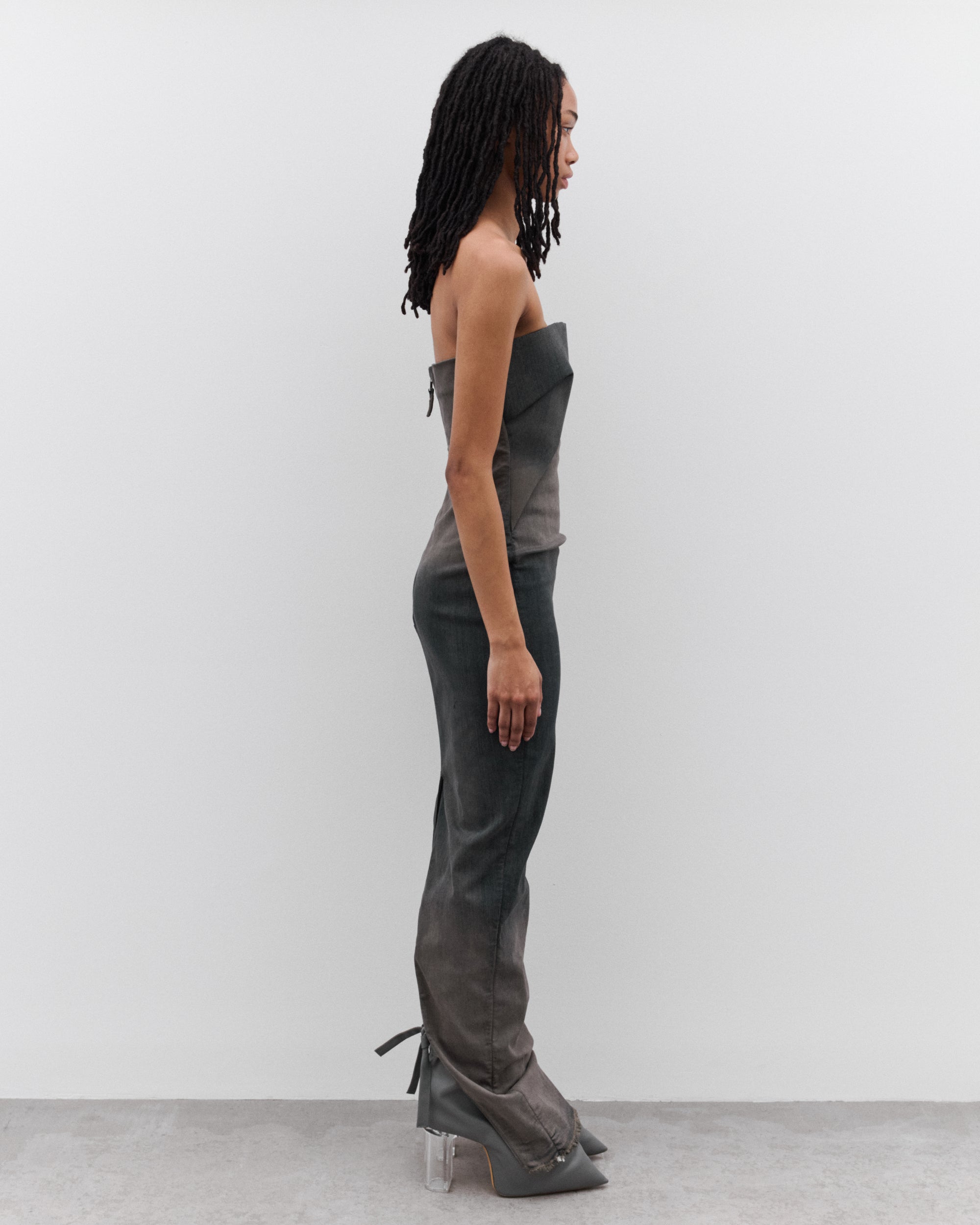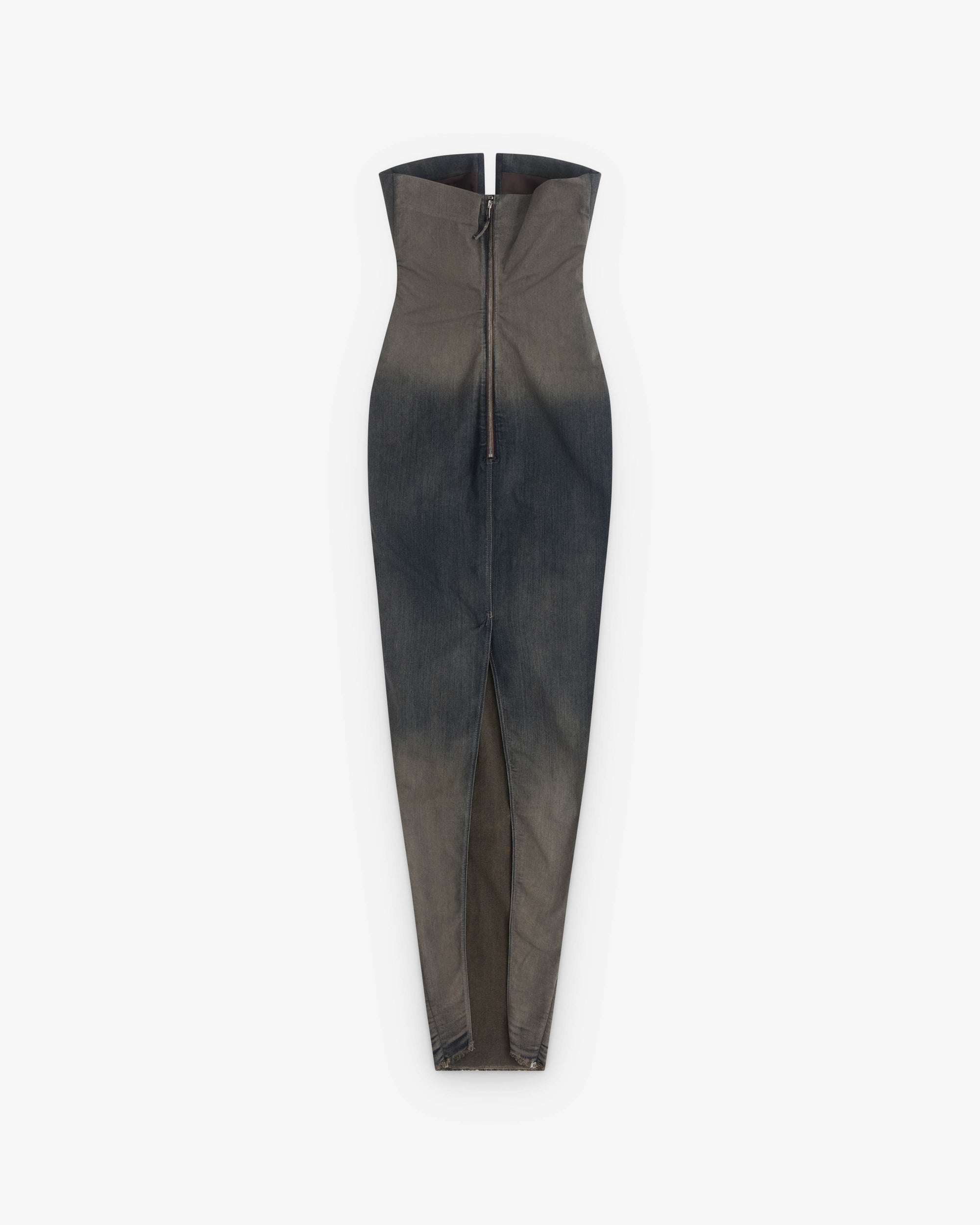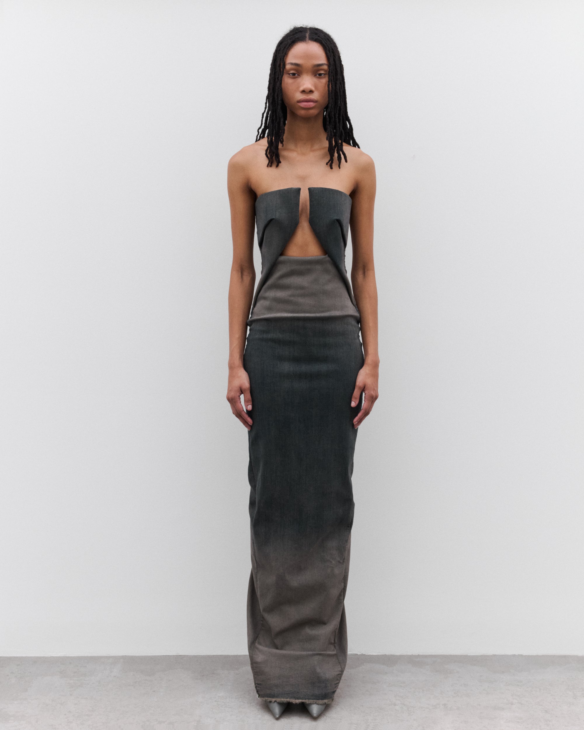 Floor-lengthStrapless structured bodiceBoned geometric cutout frontFolded bust detailTight fitting skirt thatHigh center back splitExposed zipper closure