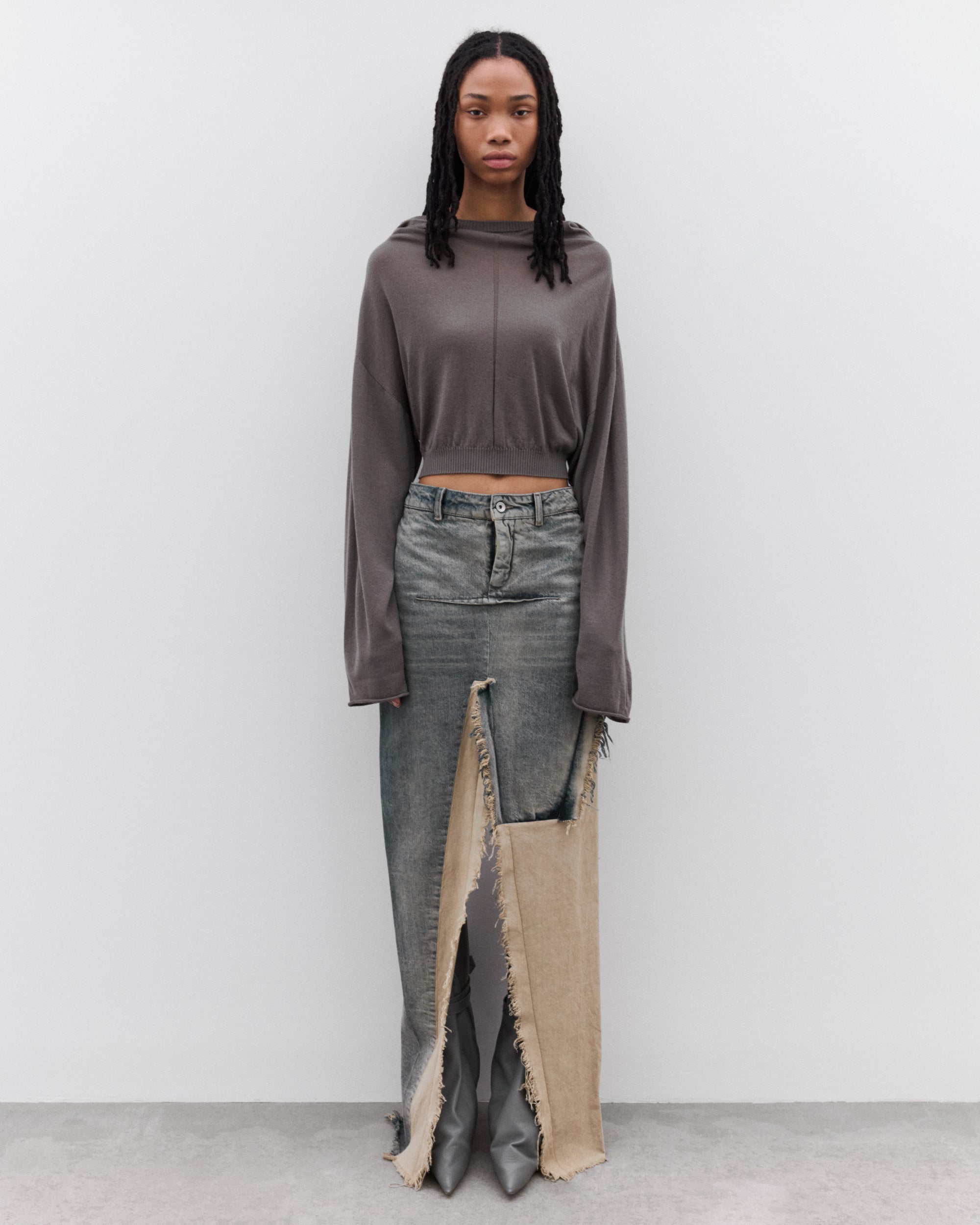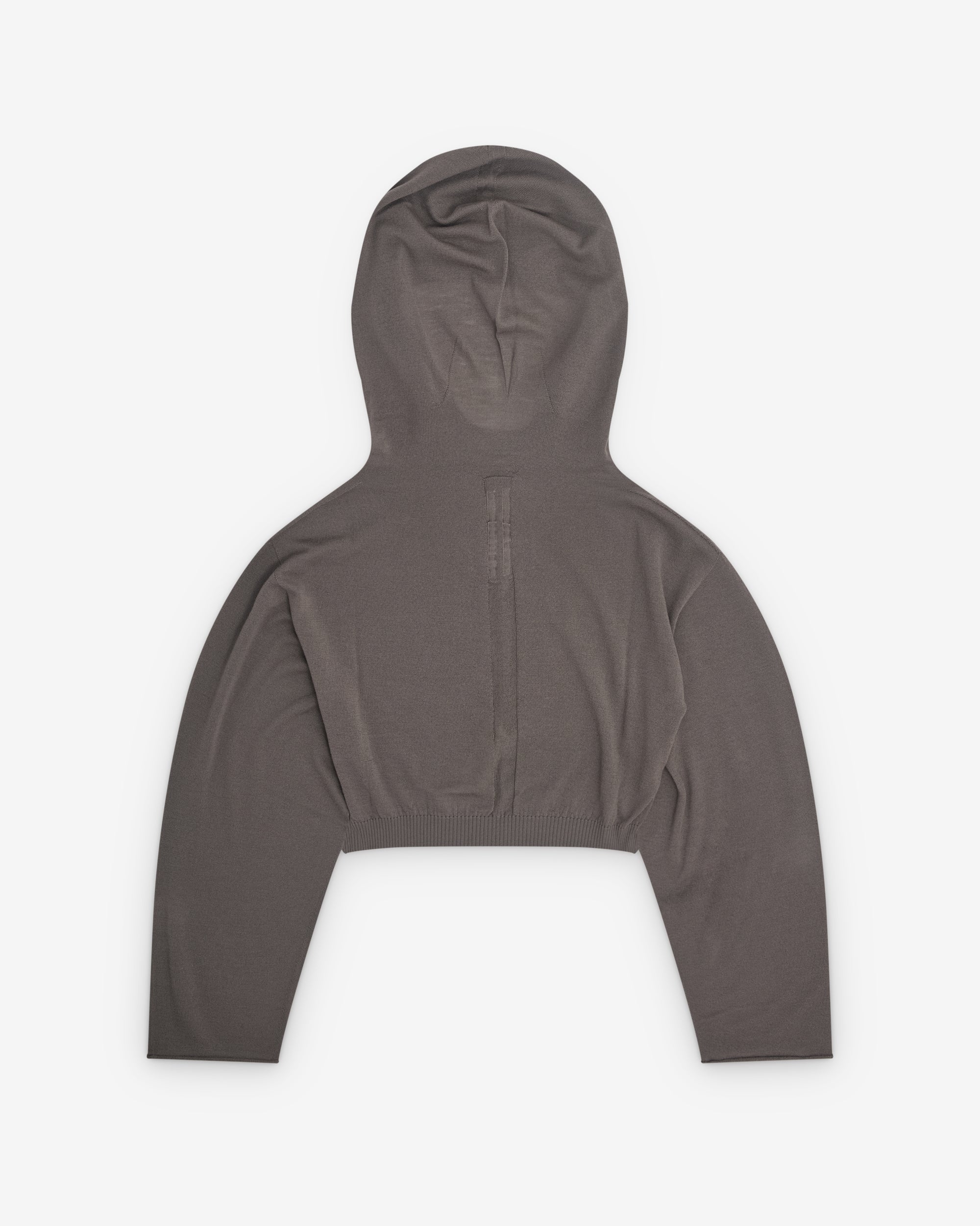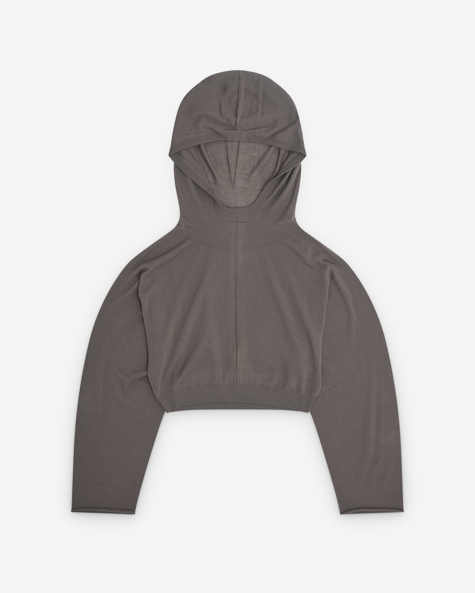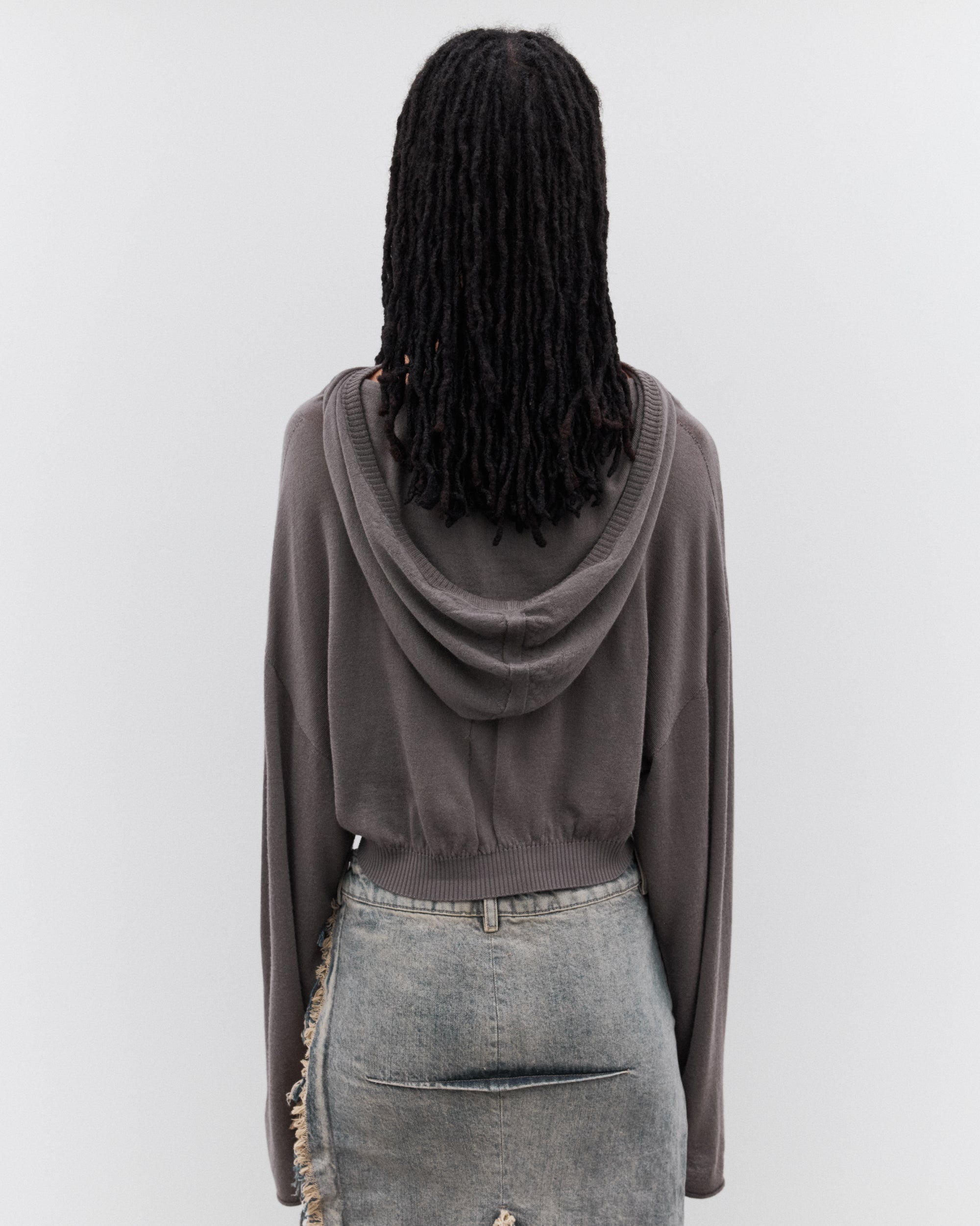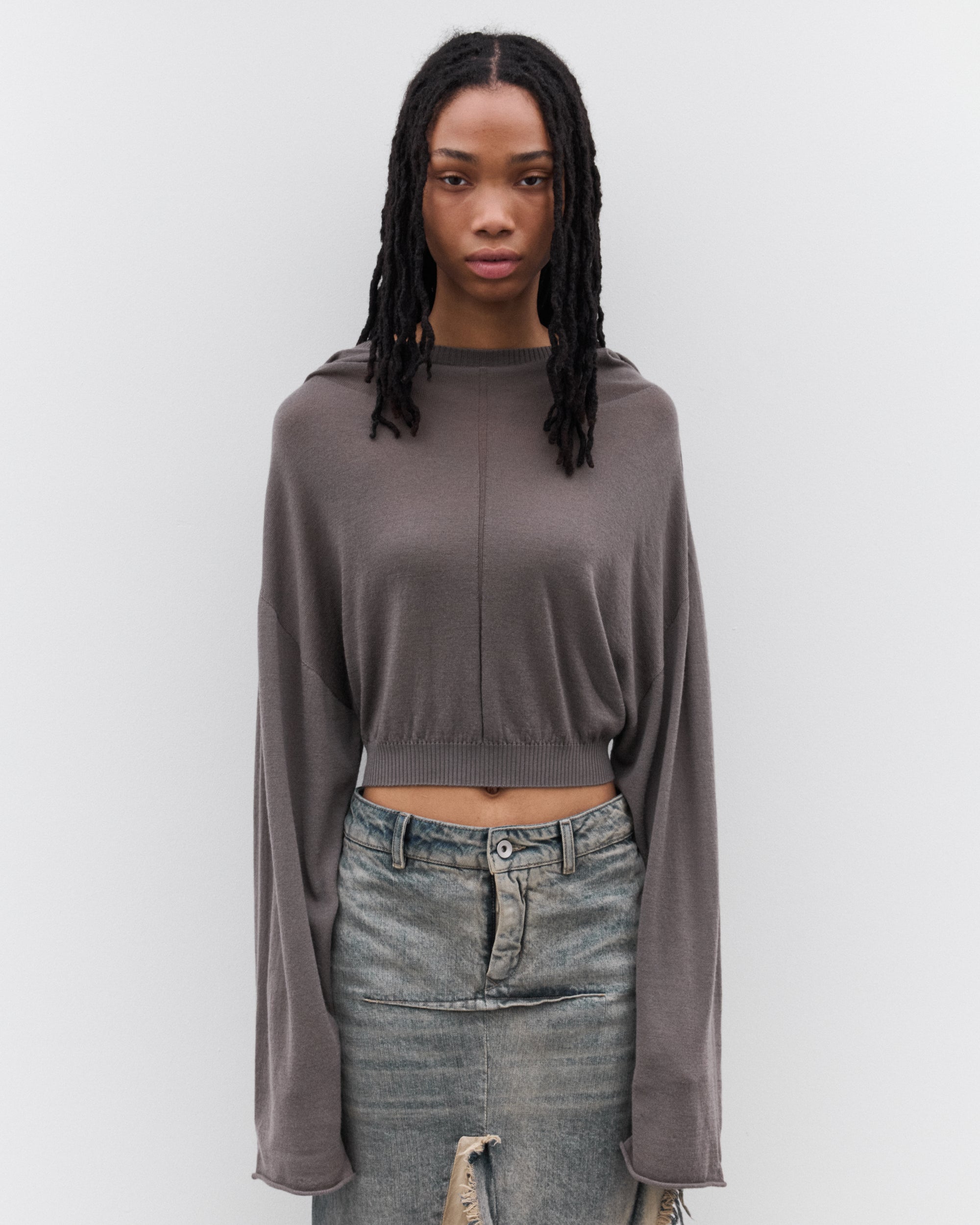 Large hoodRib knit neckGathered waistbandWide sleevesCropped