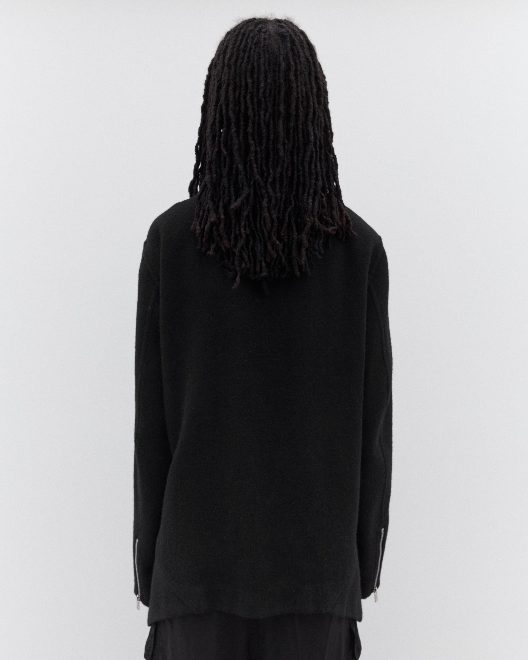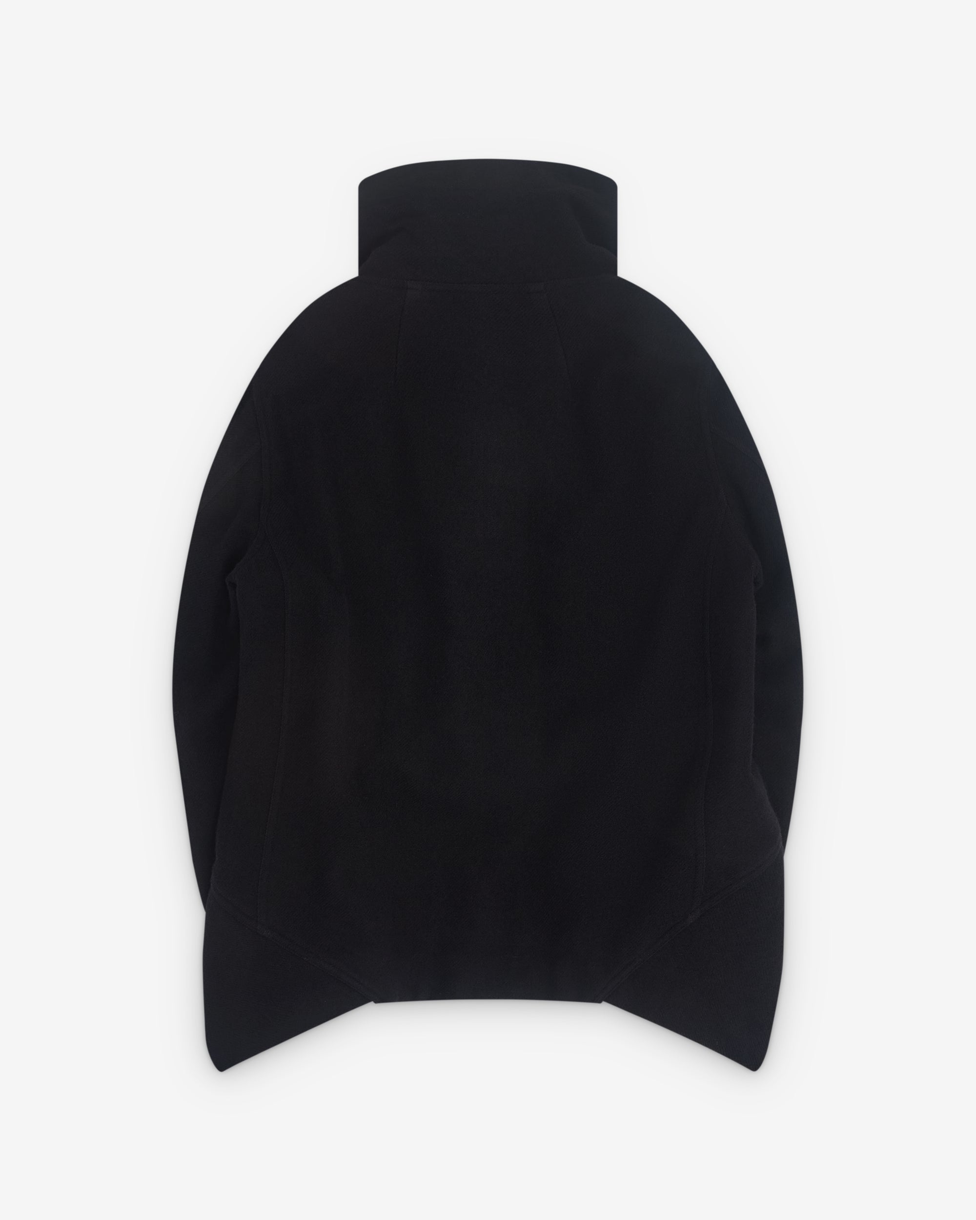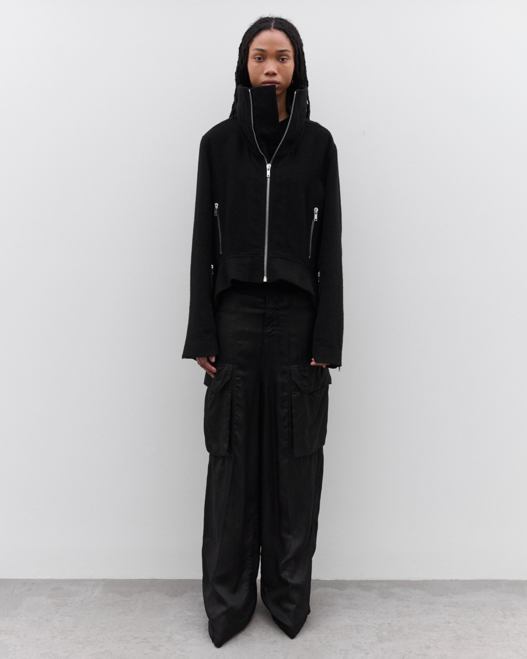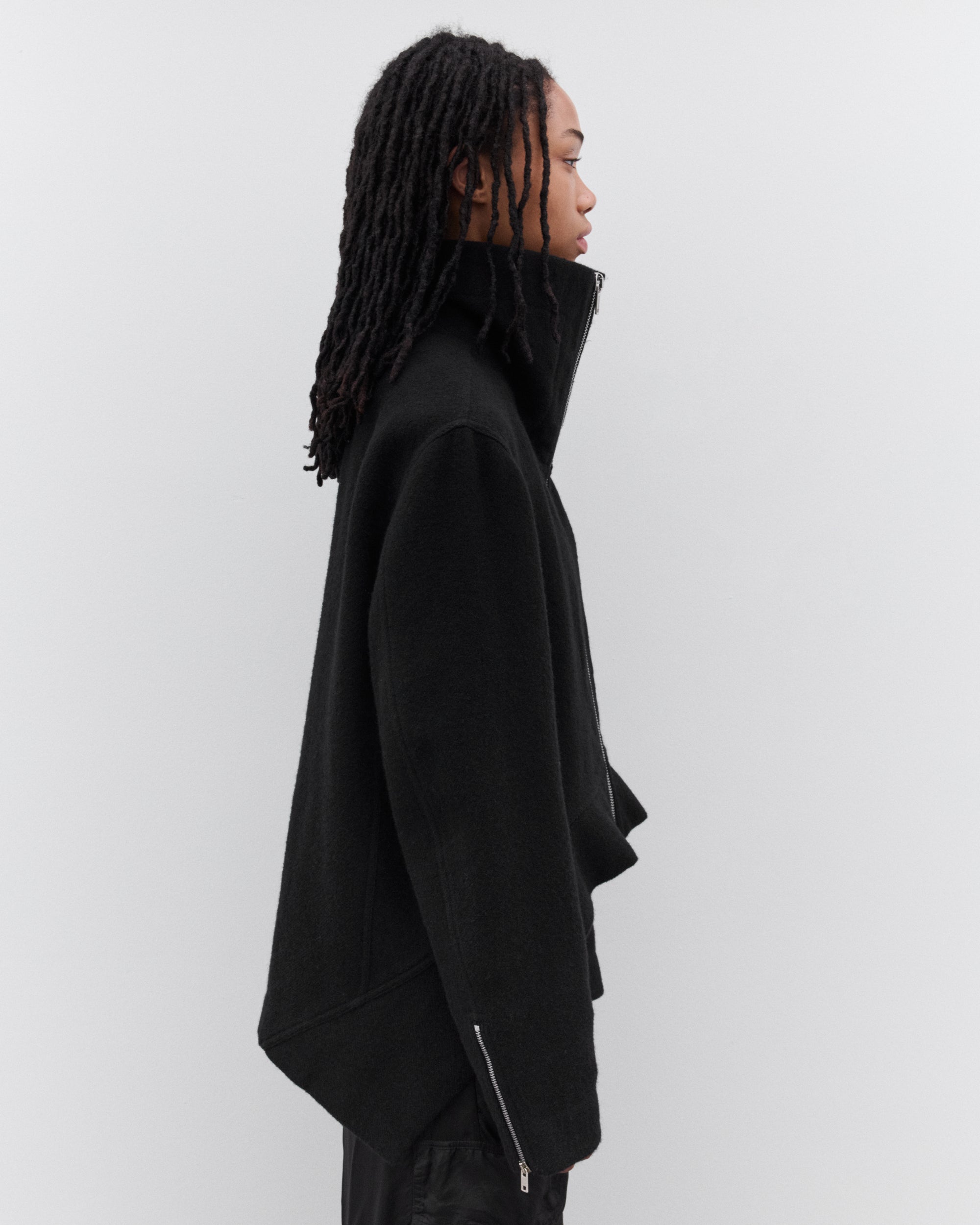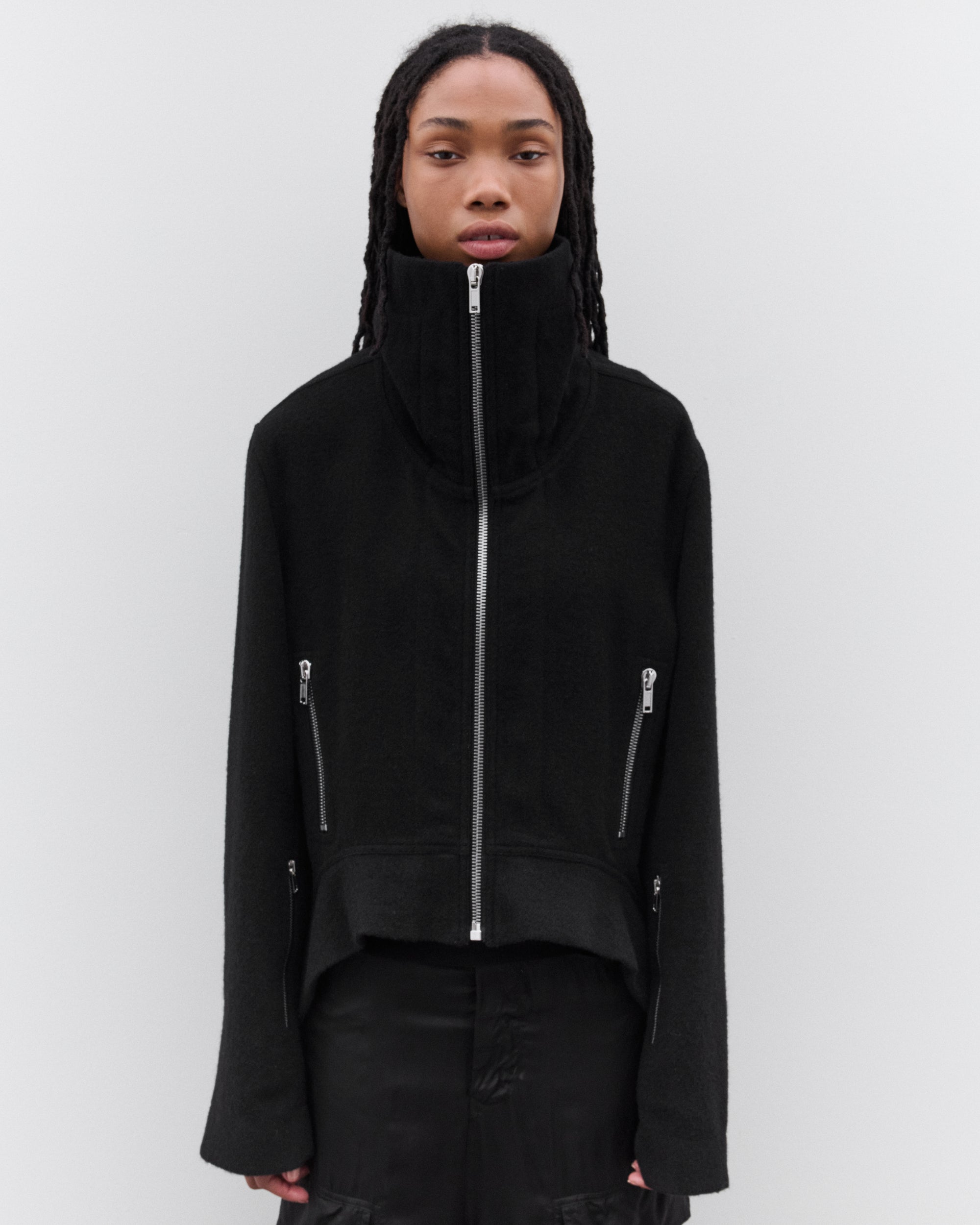 Zip fasteningZip cuffs and front zip pocketsHigh neckCurly fur liningReversibleCurved, lifted front hem