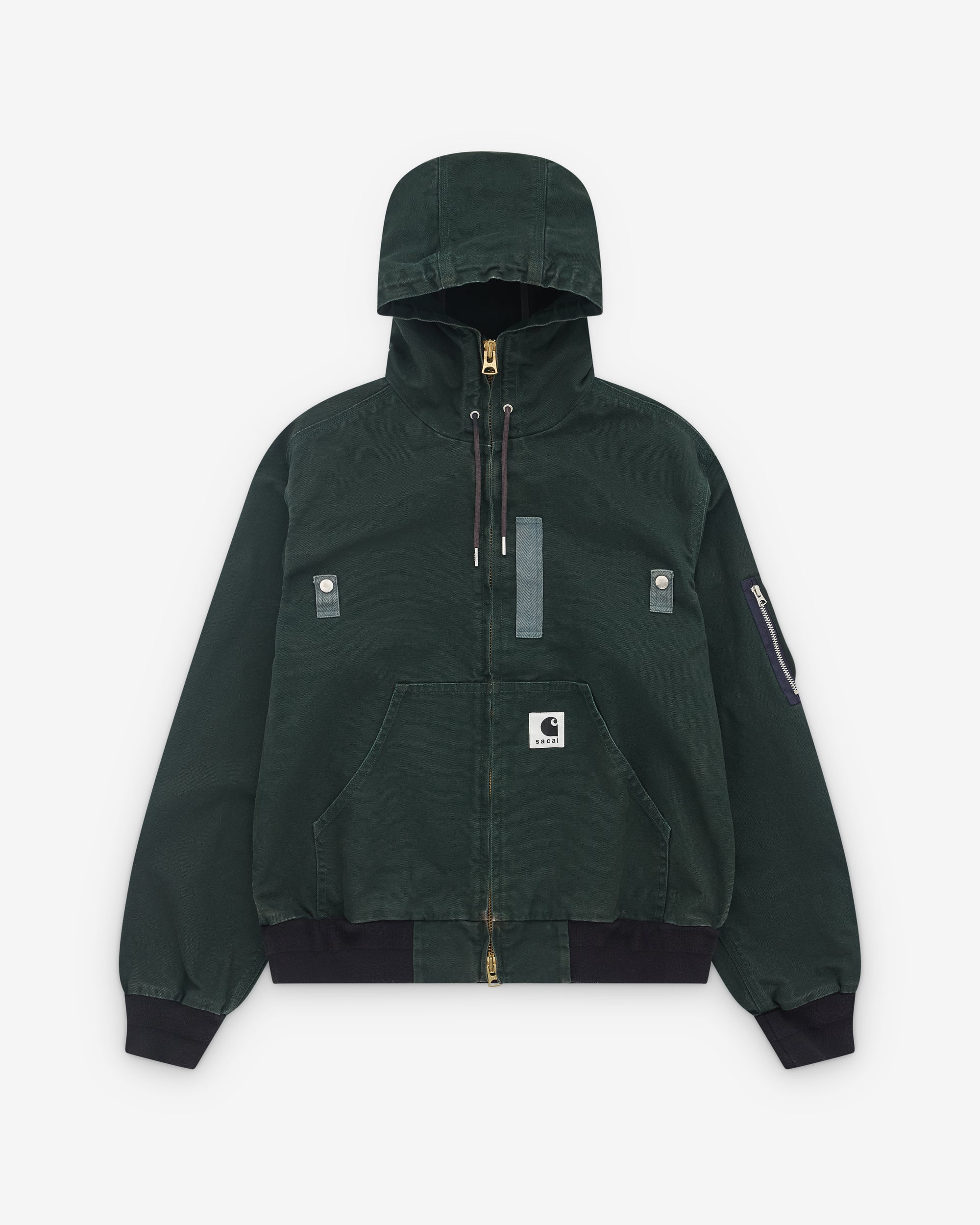 Drawstring hoodTwo way zip closureFront pouch pocketDual branded patchRibbed cuffs and hemArm zip pocket