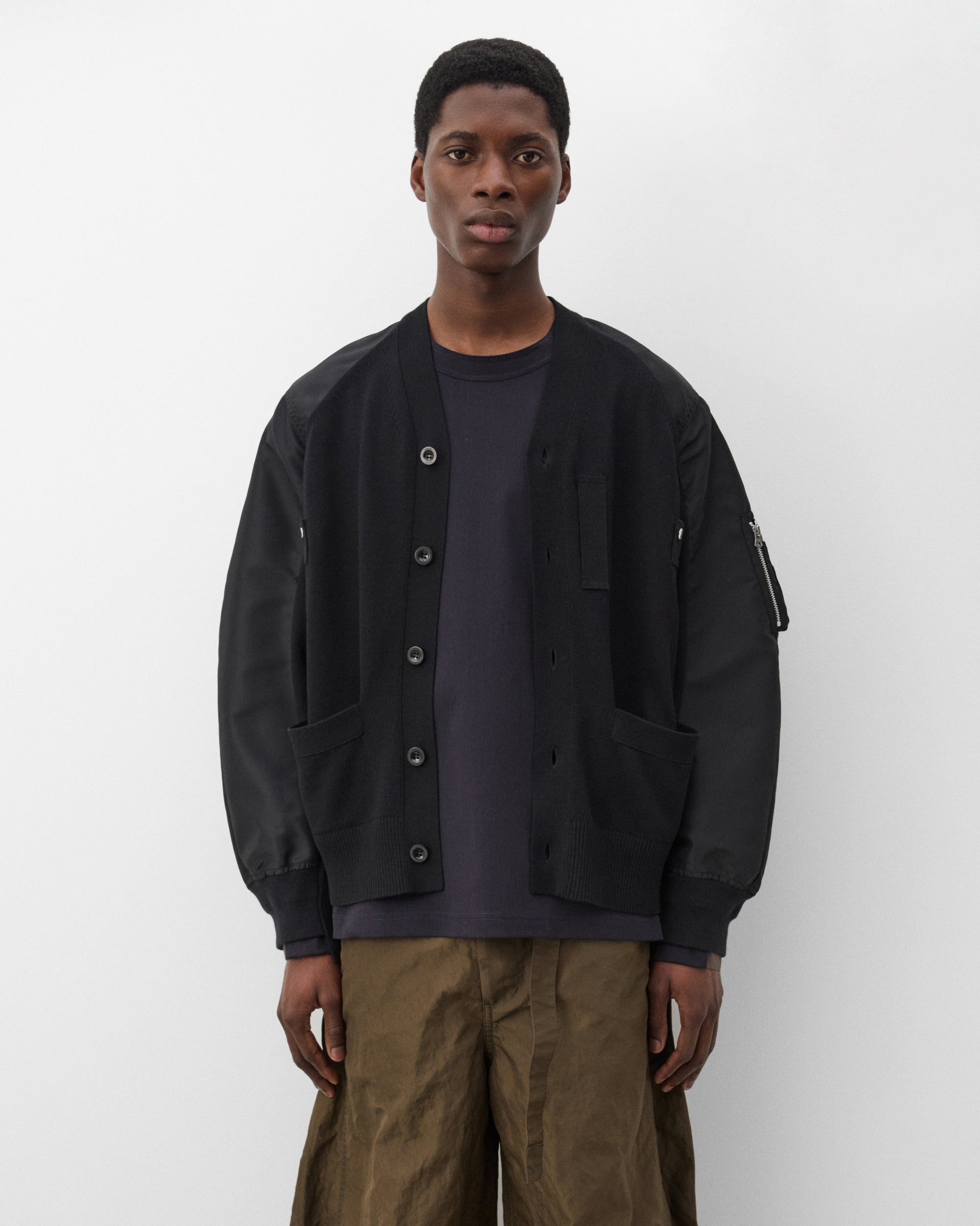 V-neckButton fasteningPanelled constructionWelt pocketsContrast sleeves and rear panel57% Cotton, 43% PolyesterMade in China