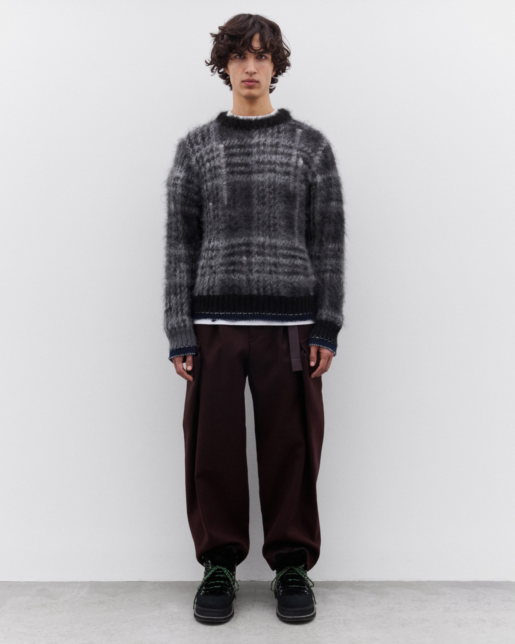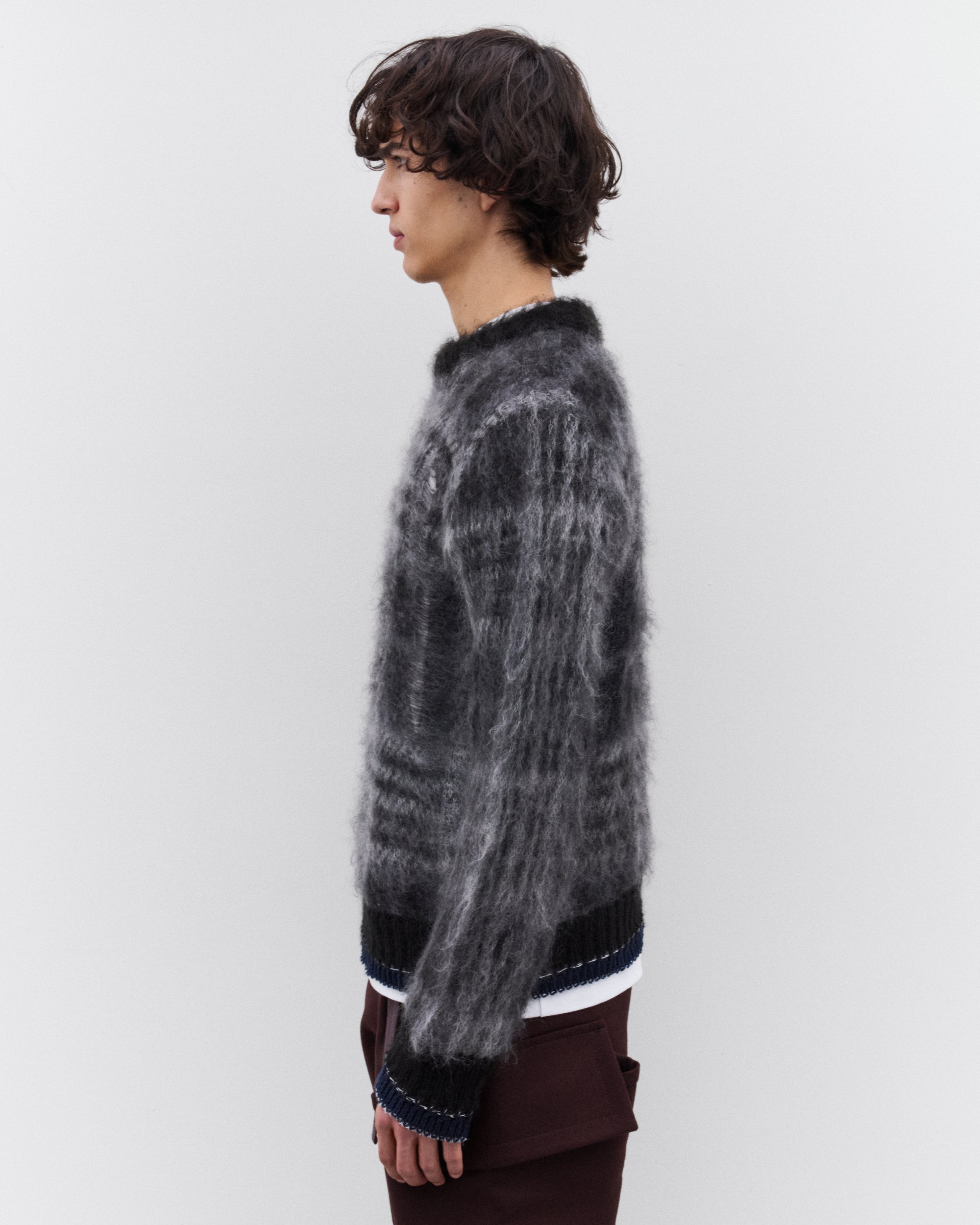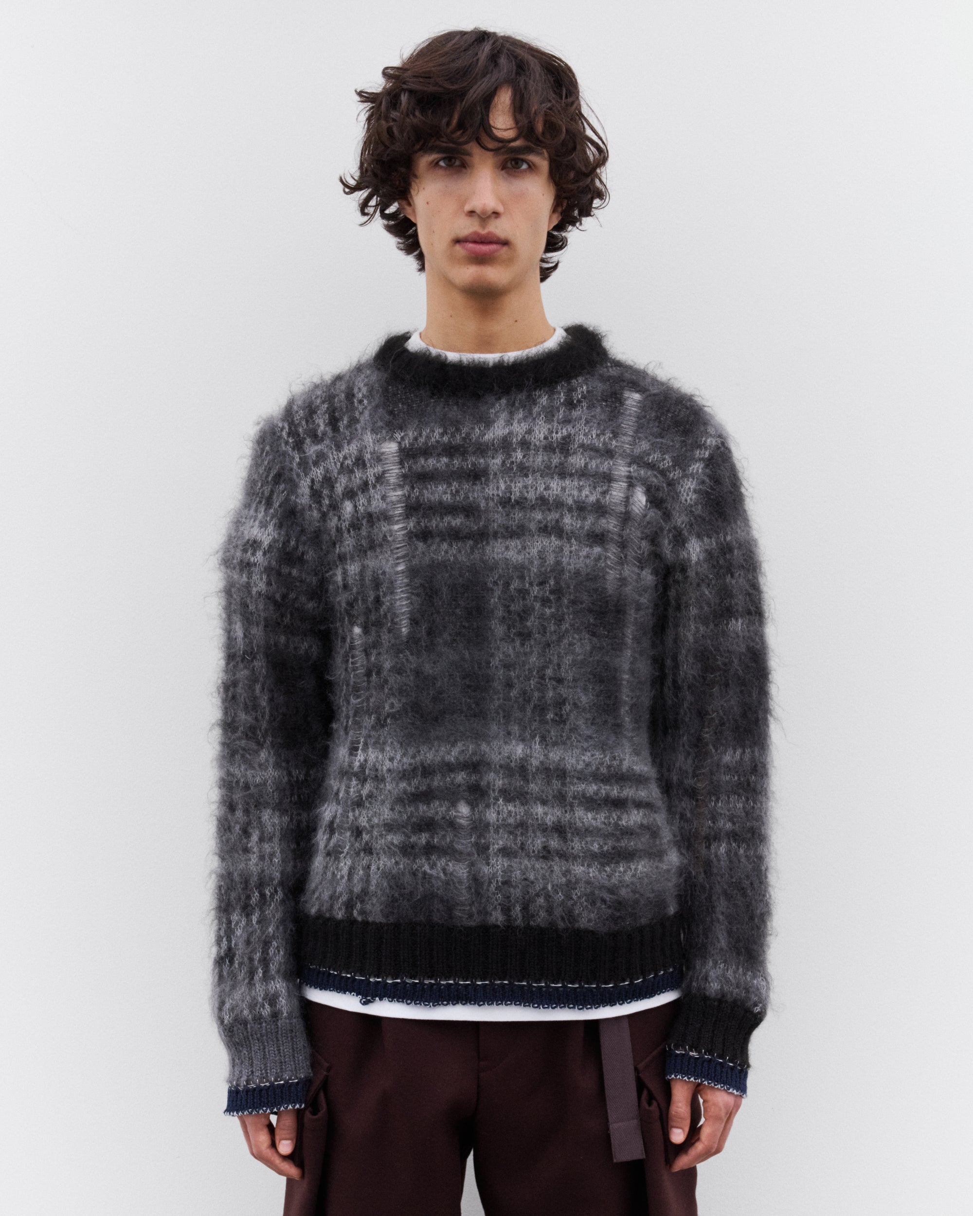 Rounded necklineBrushed mohair check fabricRibbed cuffs and hemLong sleevesBoxy fit