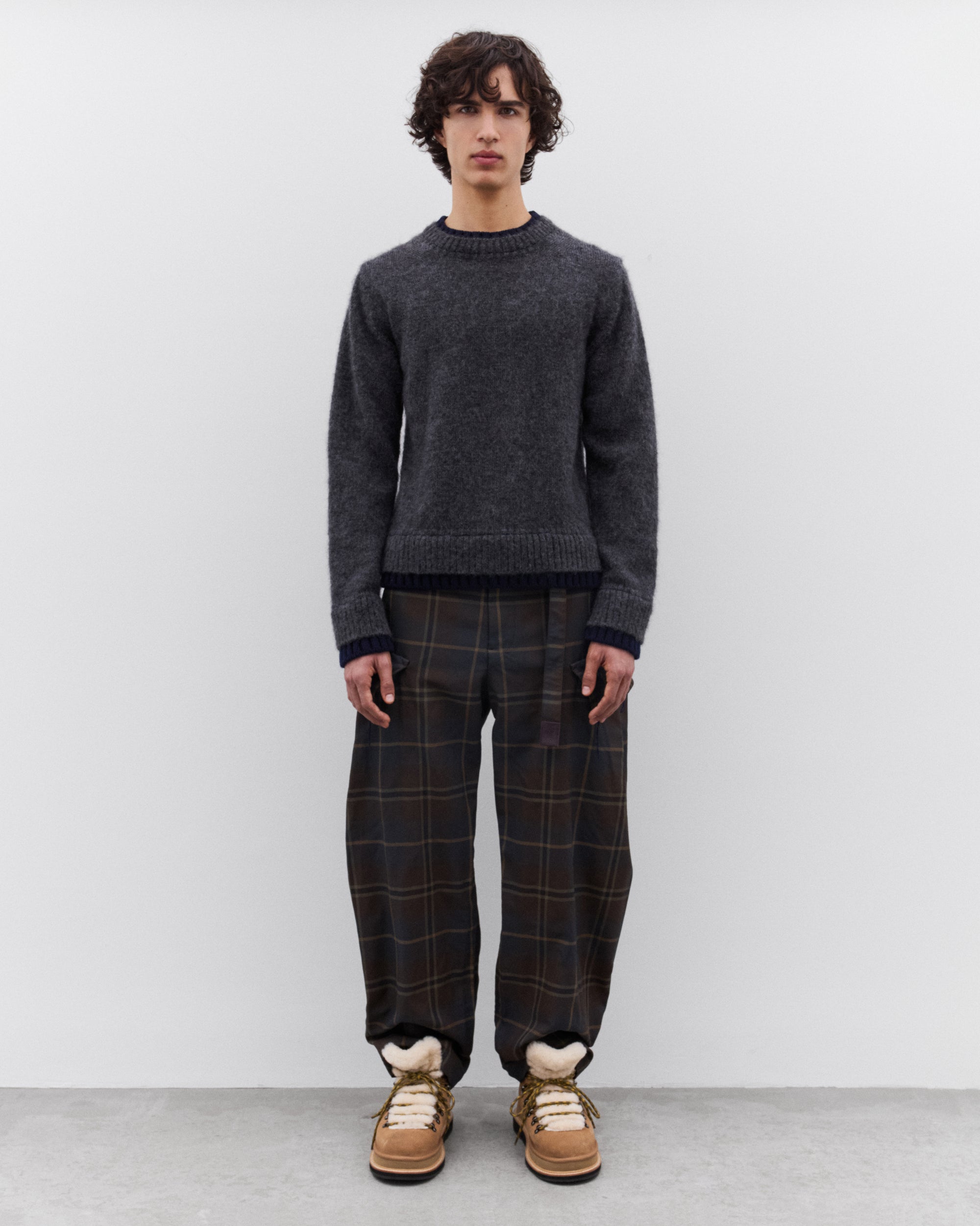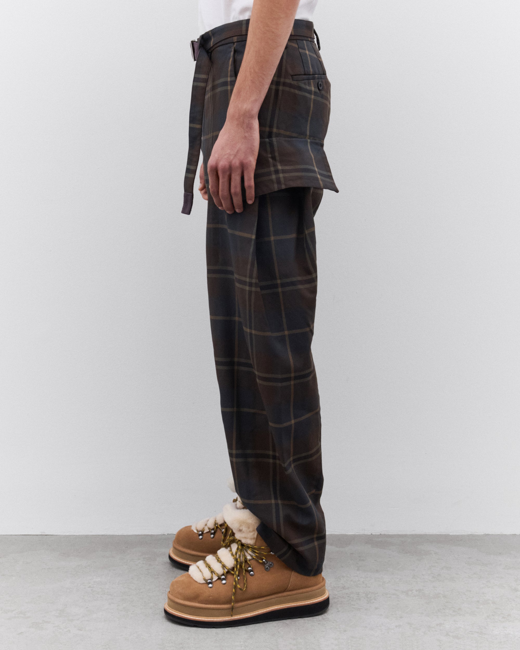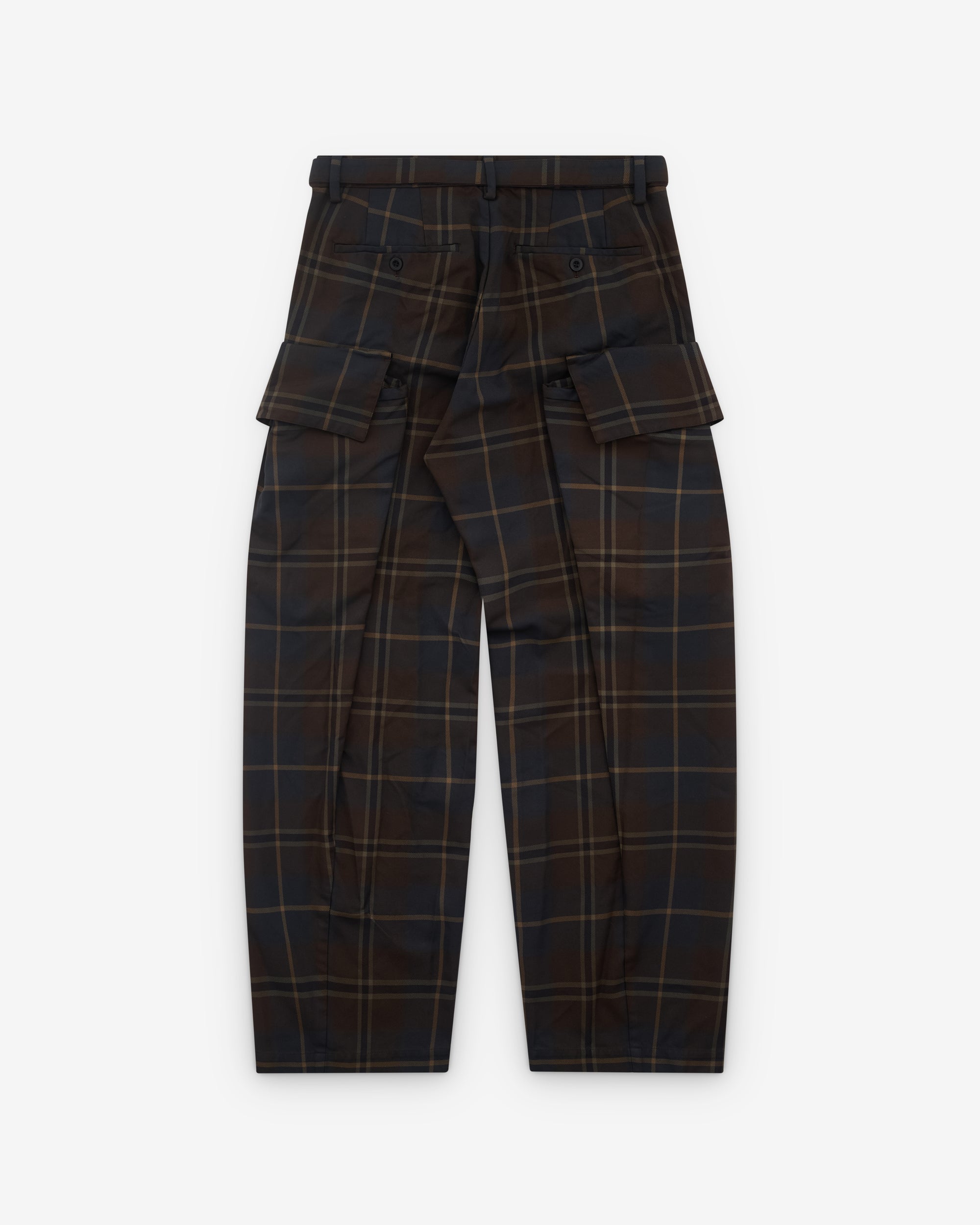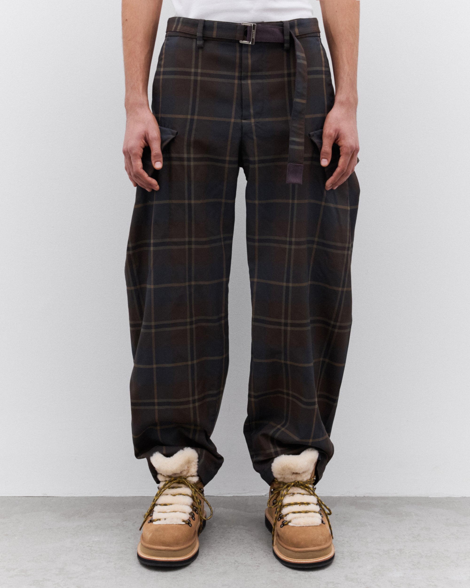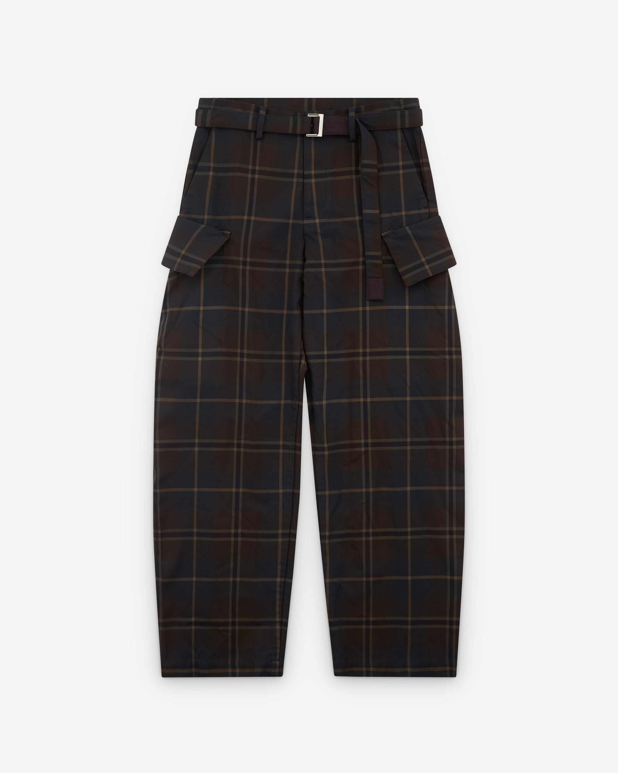 Plaid check fabricBelted waist Side seam pocketsCargo pockets at legStraight legTwo rear pockets