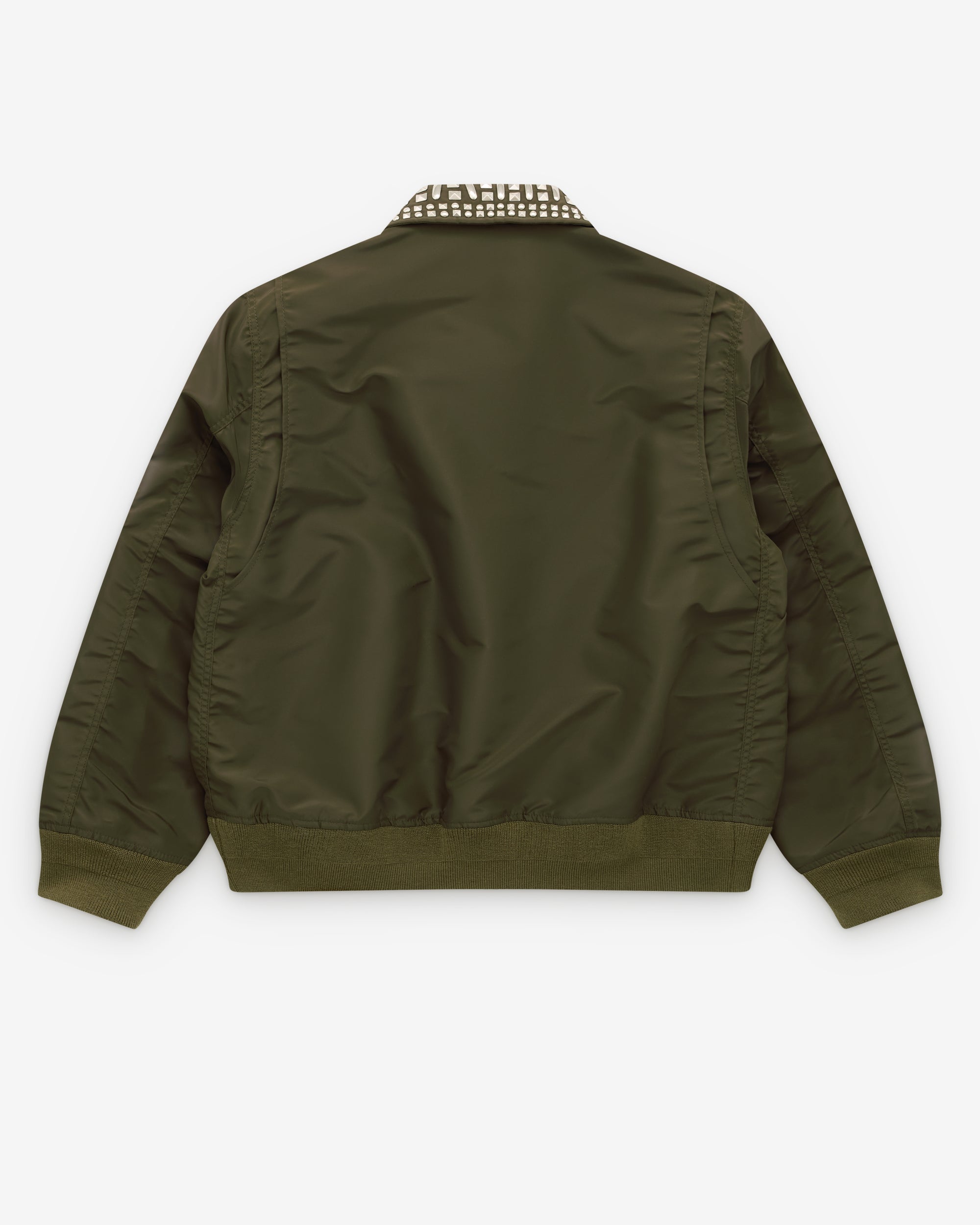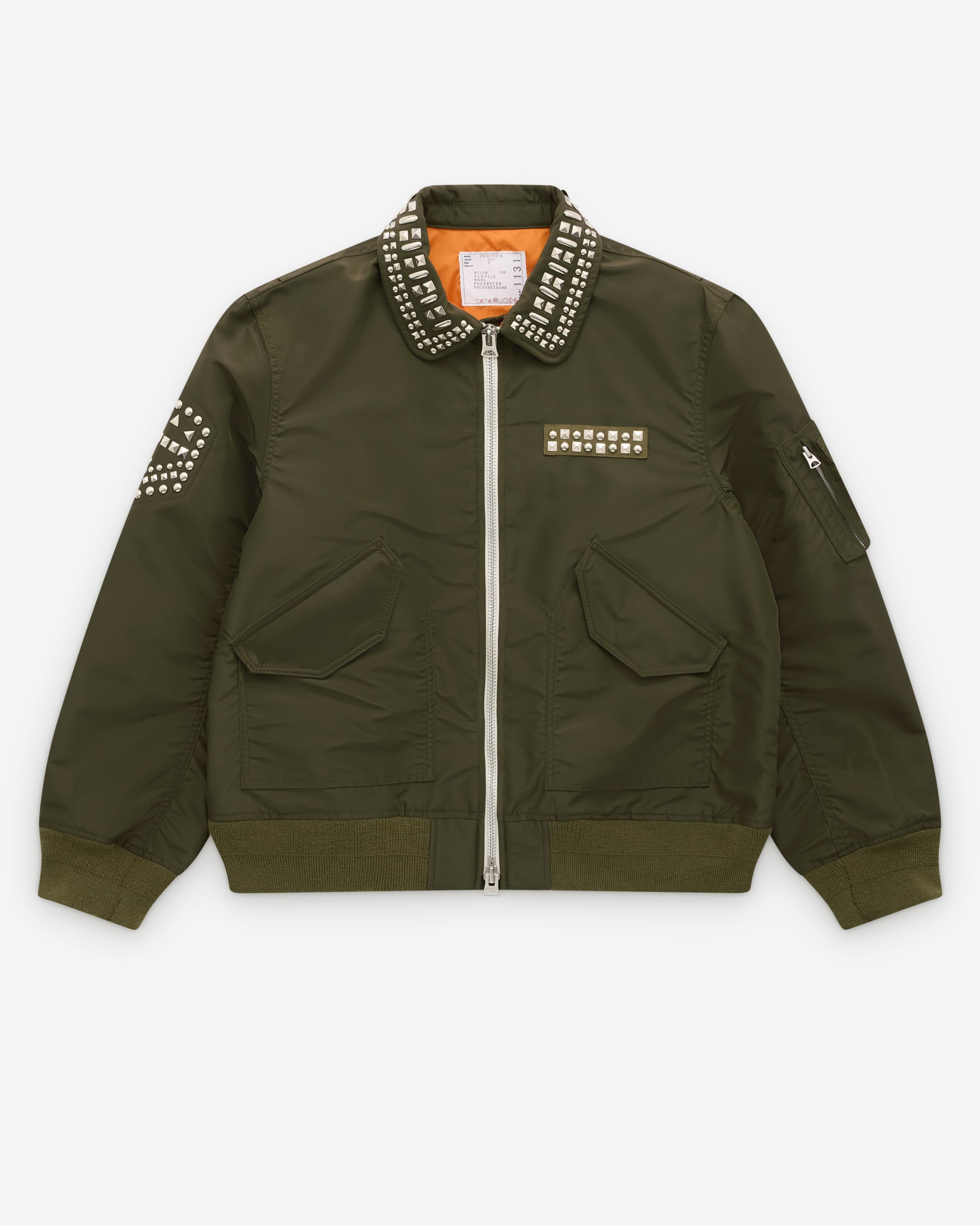 Classic jacket collarFront two way zip closureStudded detail at collar, chest and armTwo front flap close pocketsZip arm pocketRibbed cuffs and hemInternal lining