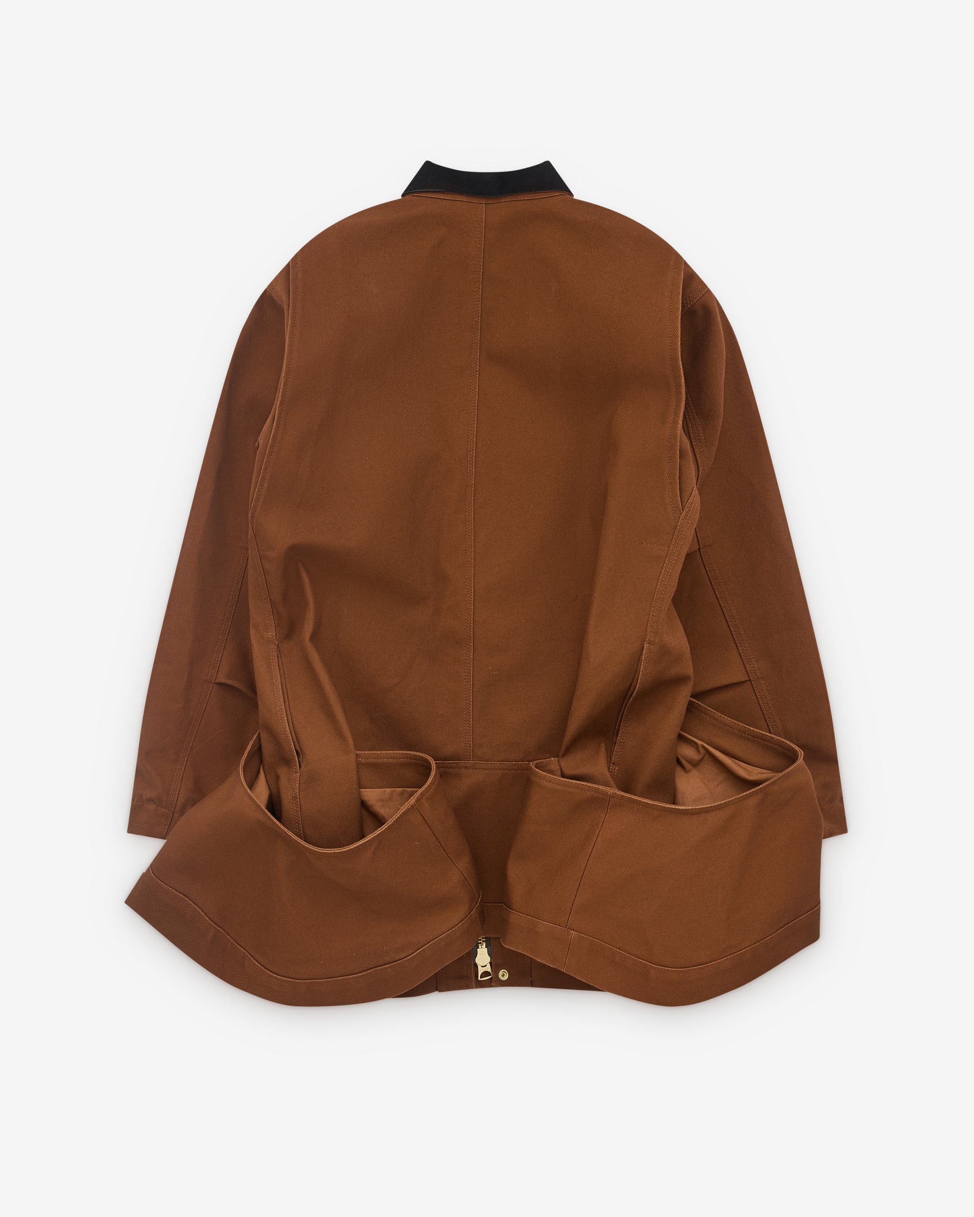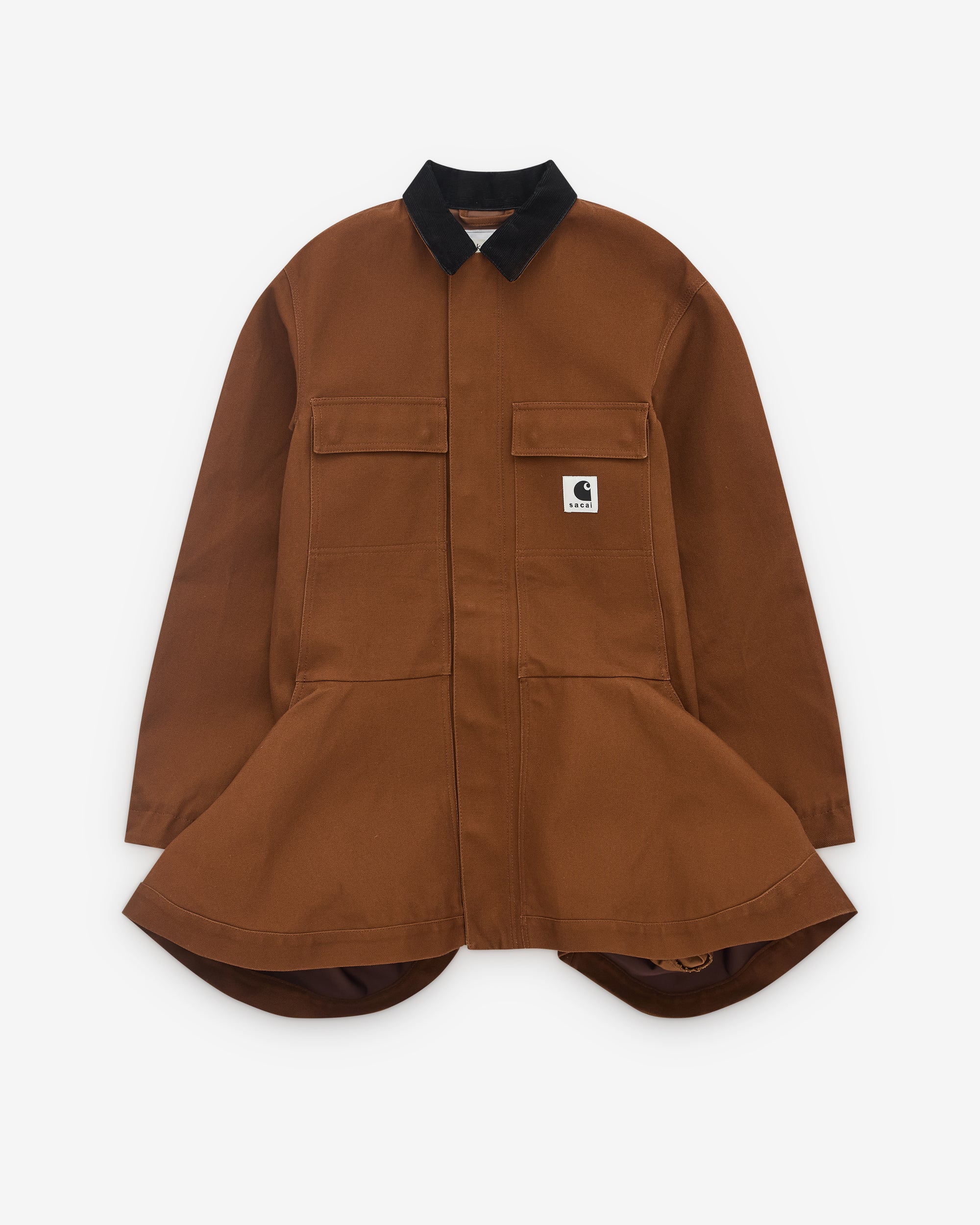 Corduroy collarTwo front flap pocketsDual branded patch at chestThigh lengthLong sleevesFull internal lining