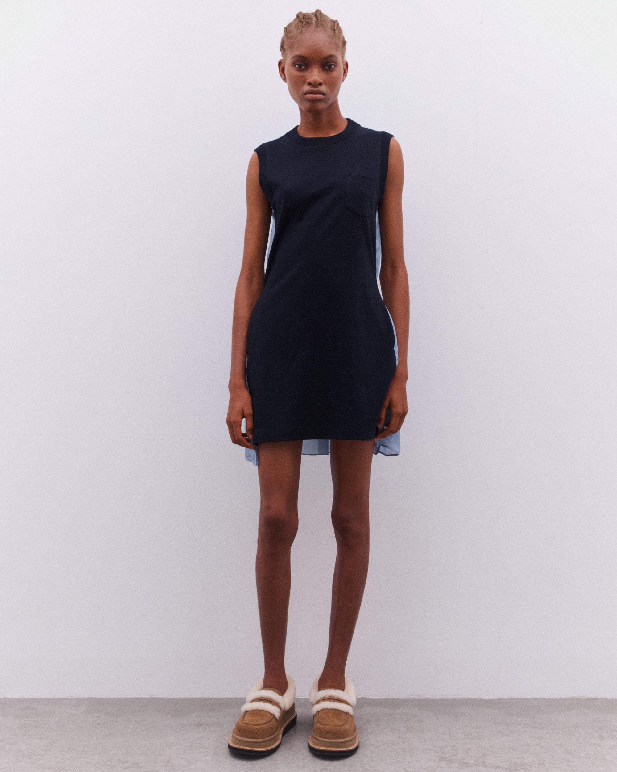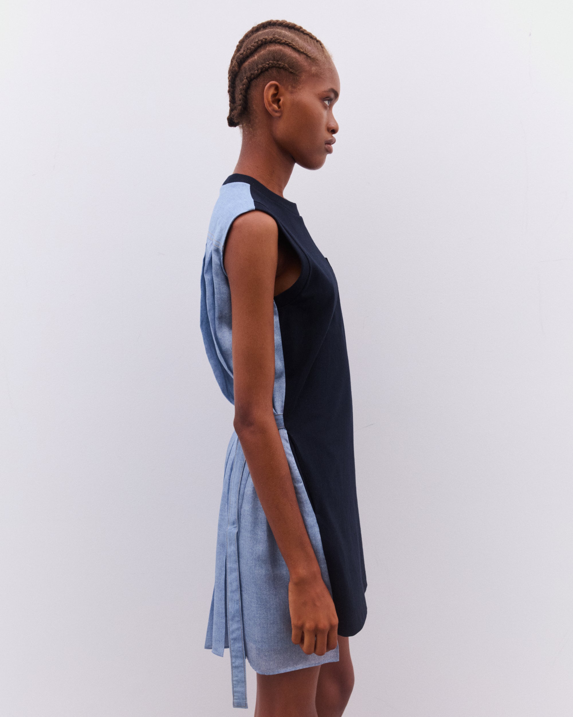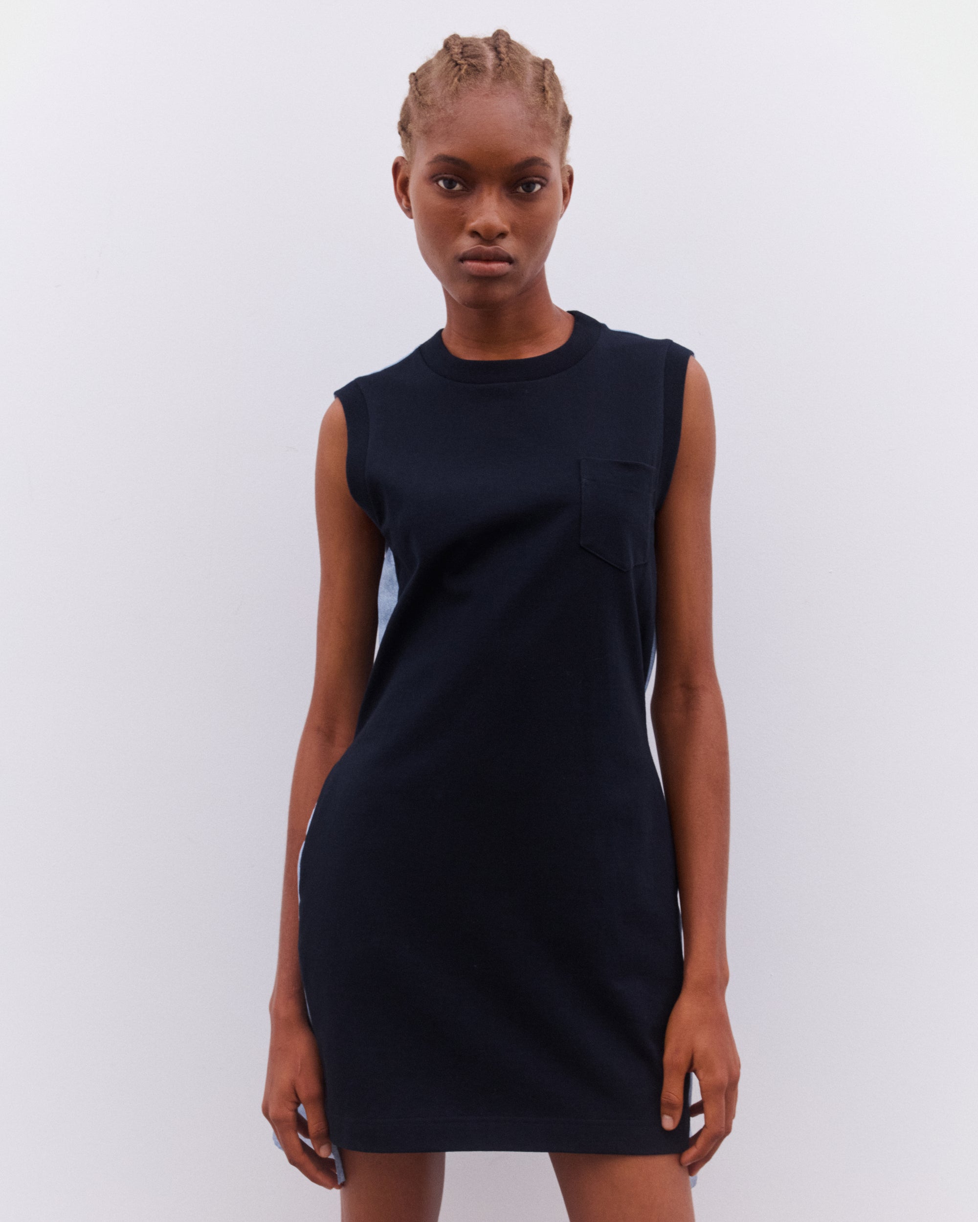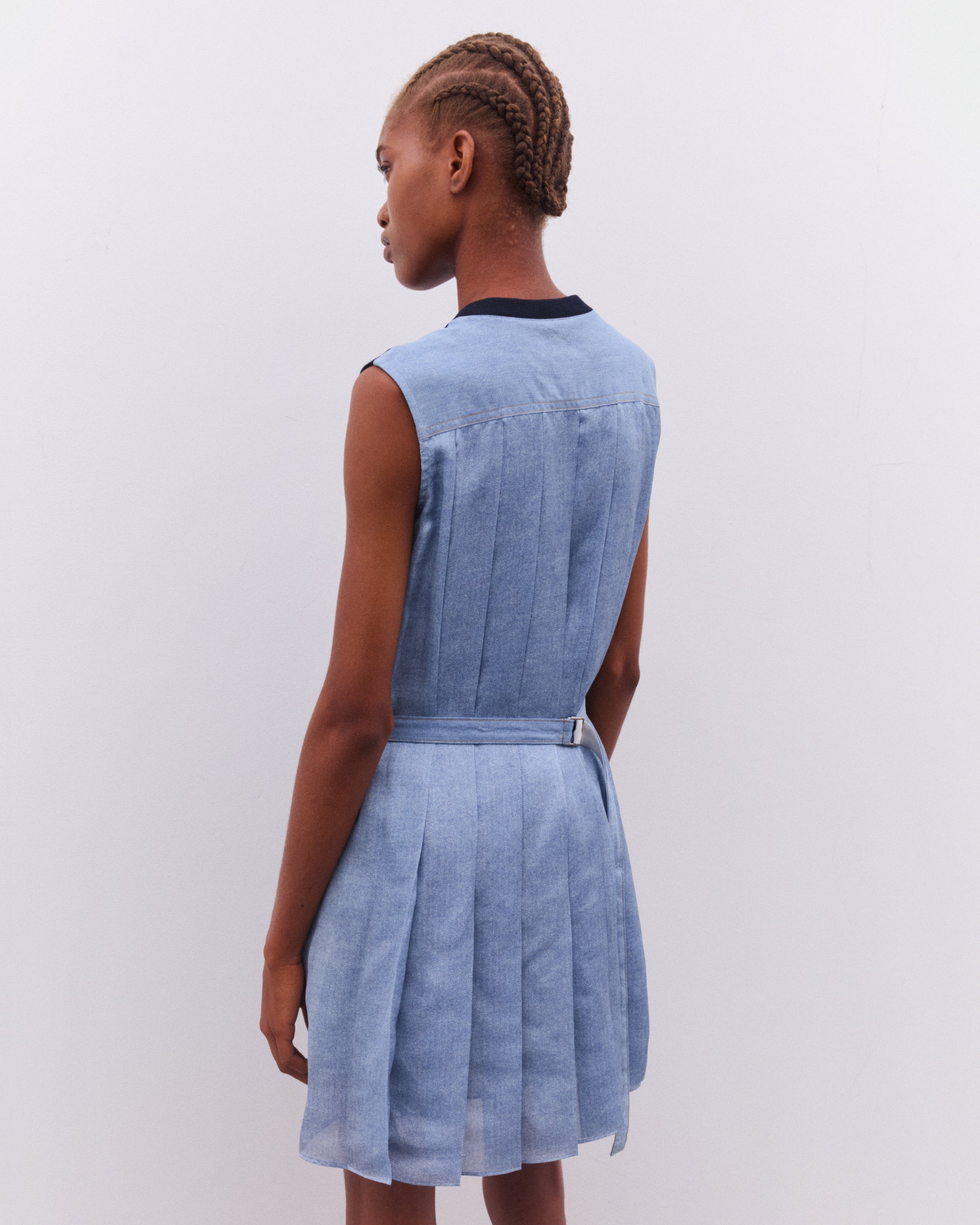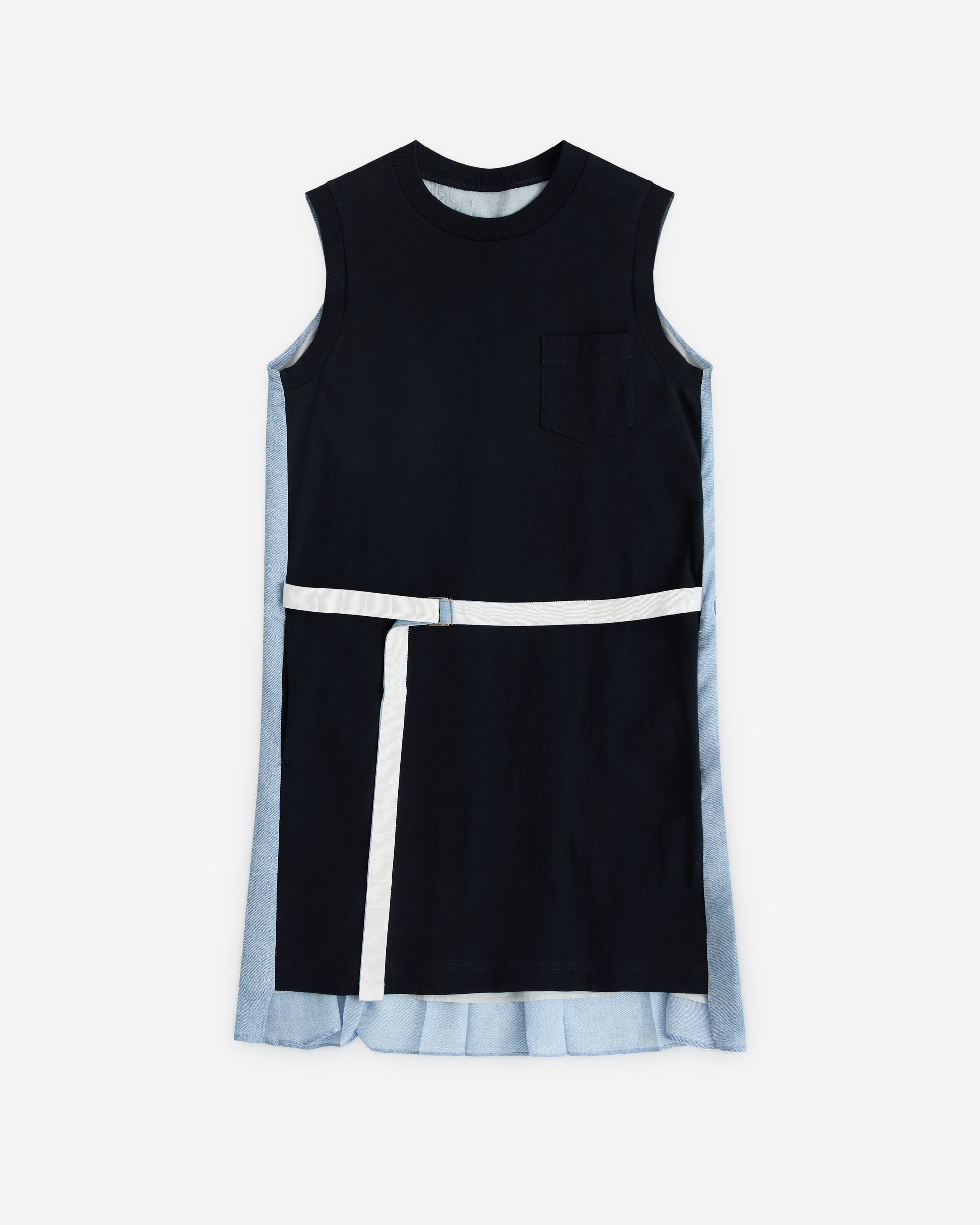 Crew necklineSleeveless styleSingle chest pocketBelted waistDenim back panelPleated skirtThigh length