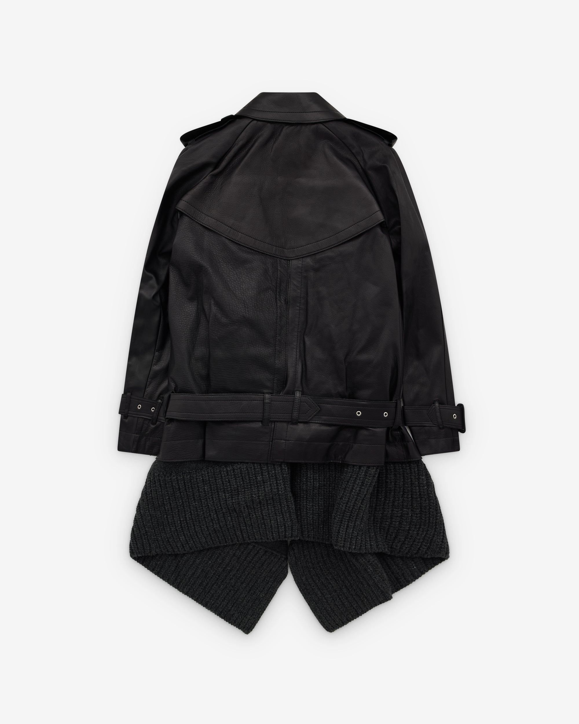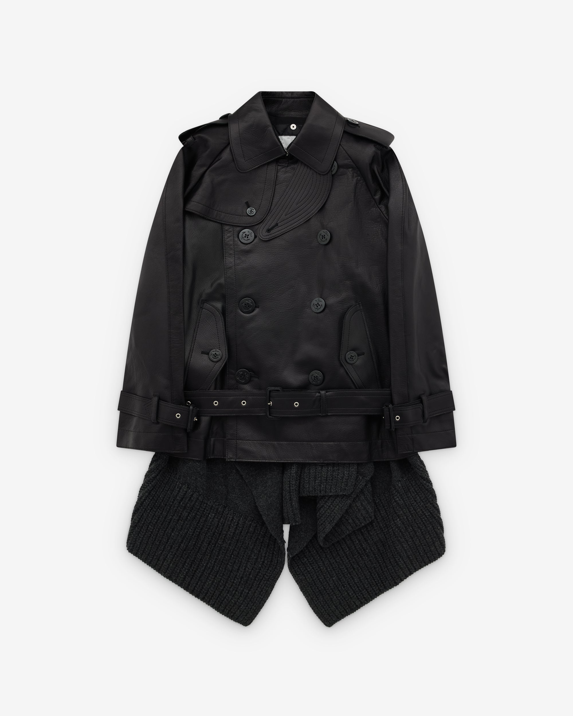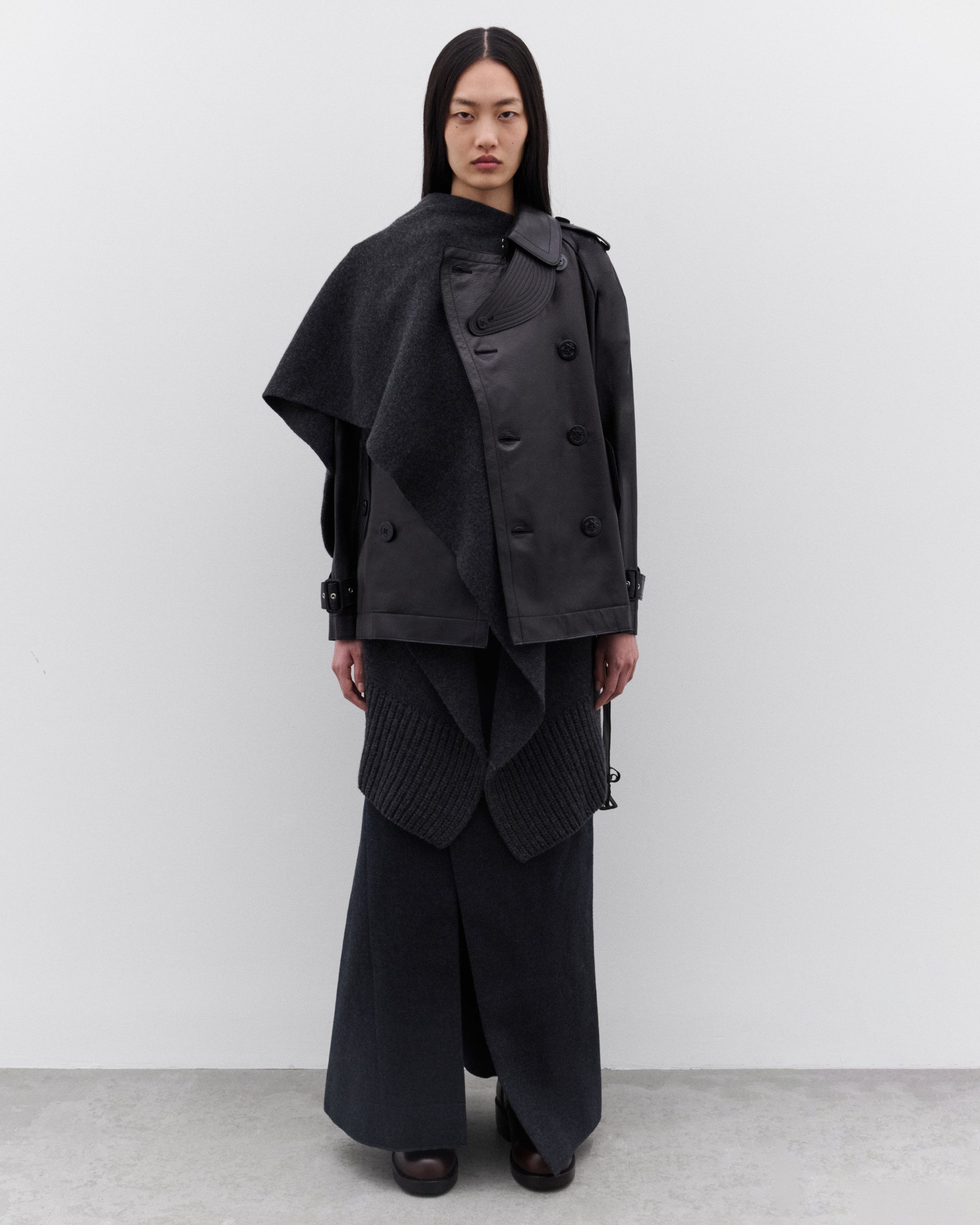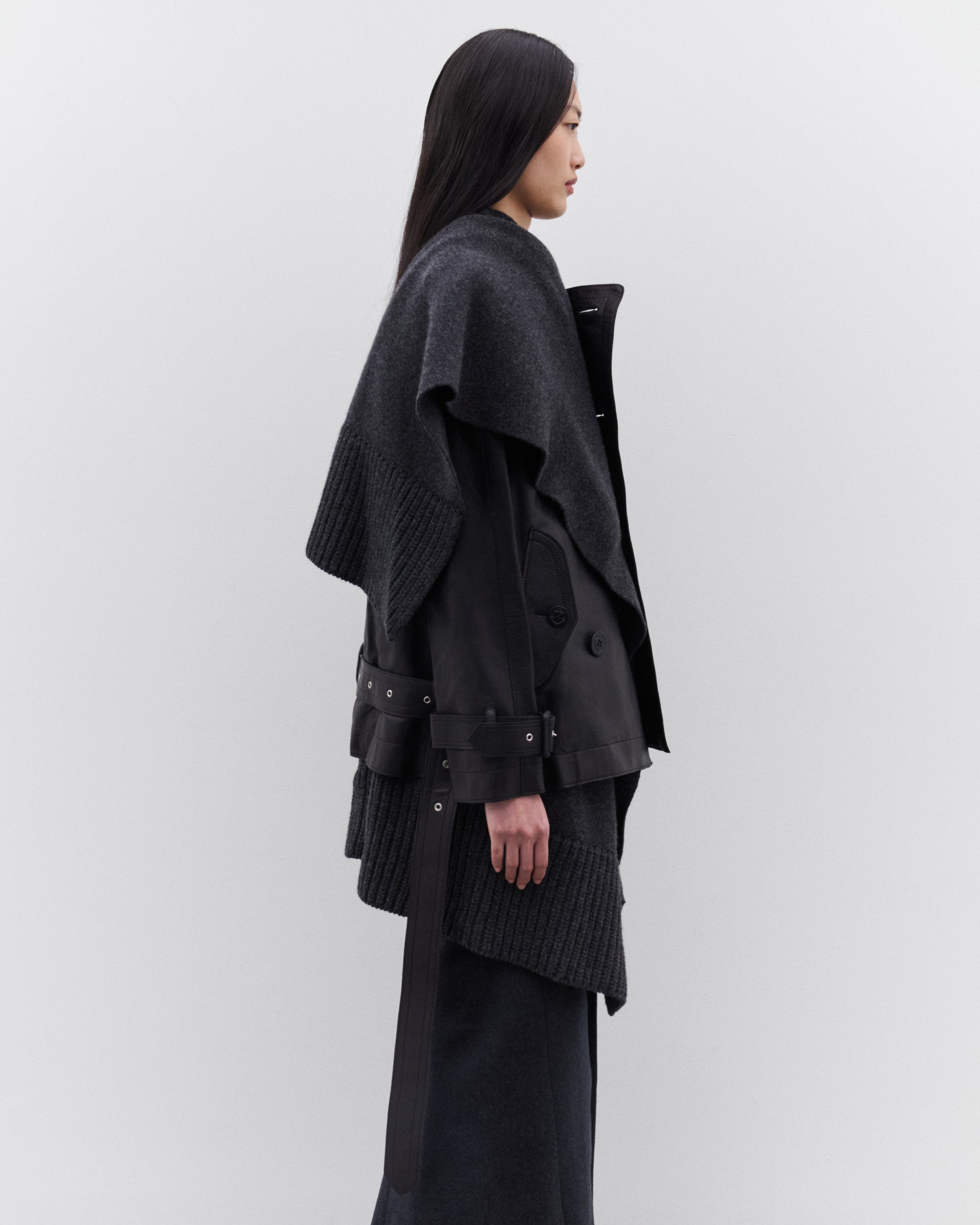 Double breastedStorm strapButton flap pocketsBeltedKnitted panel at hem