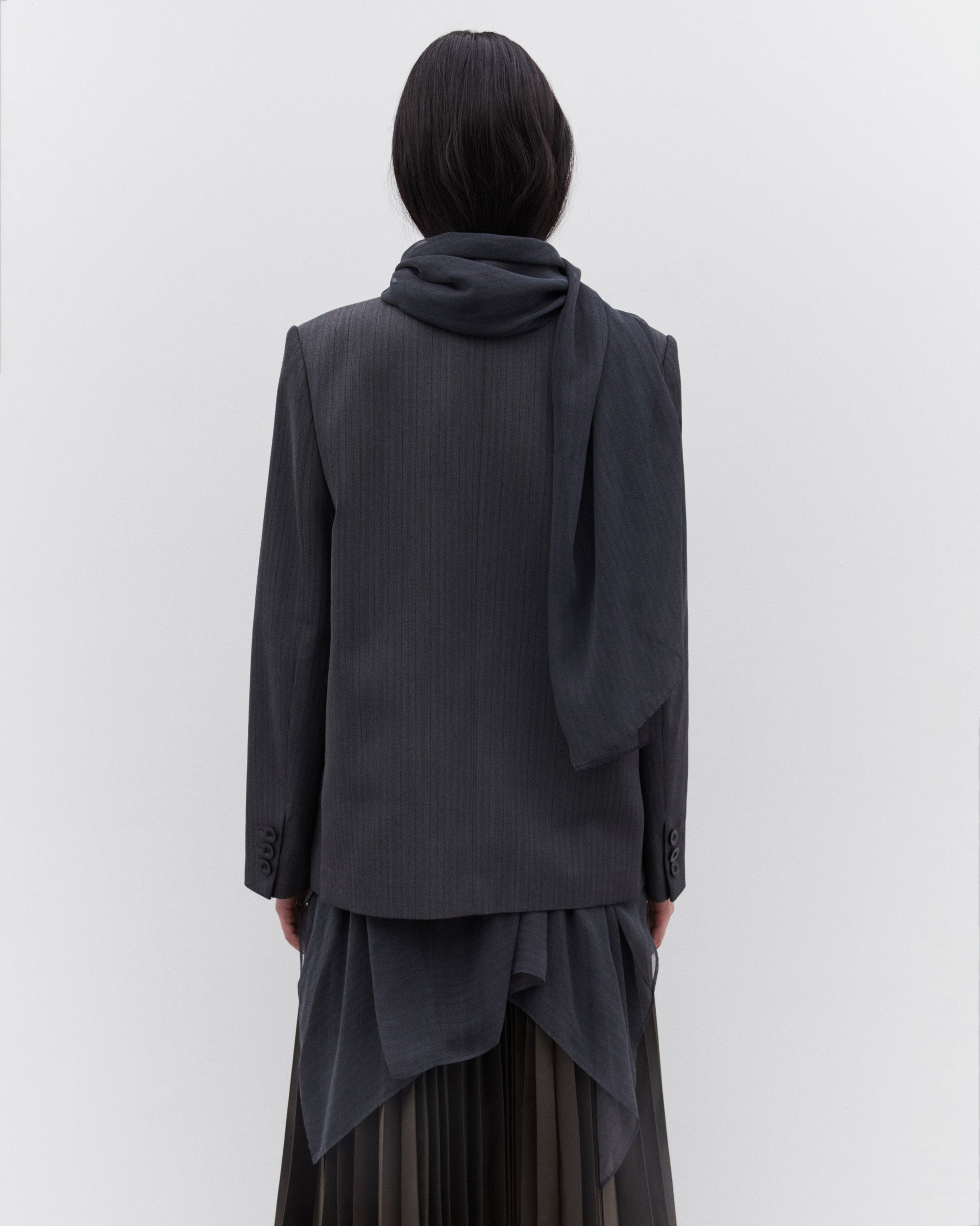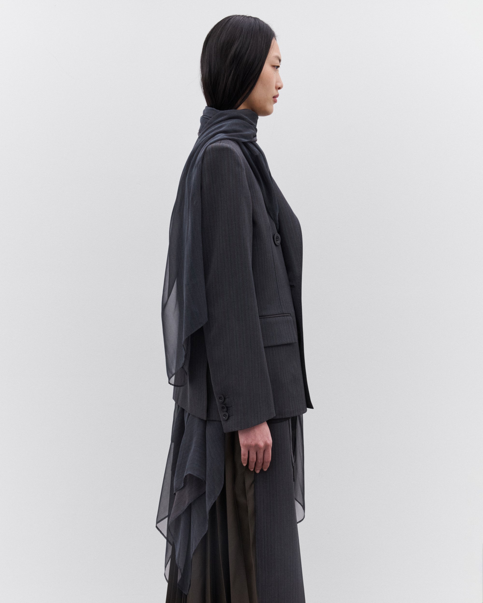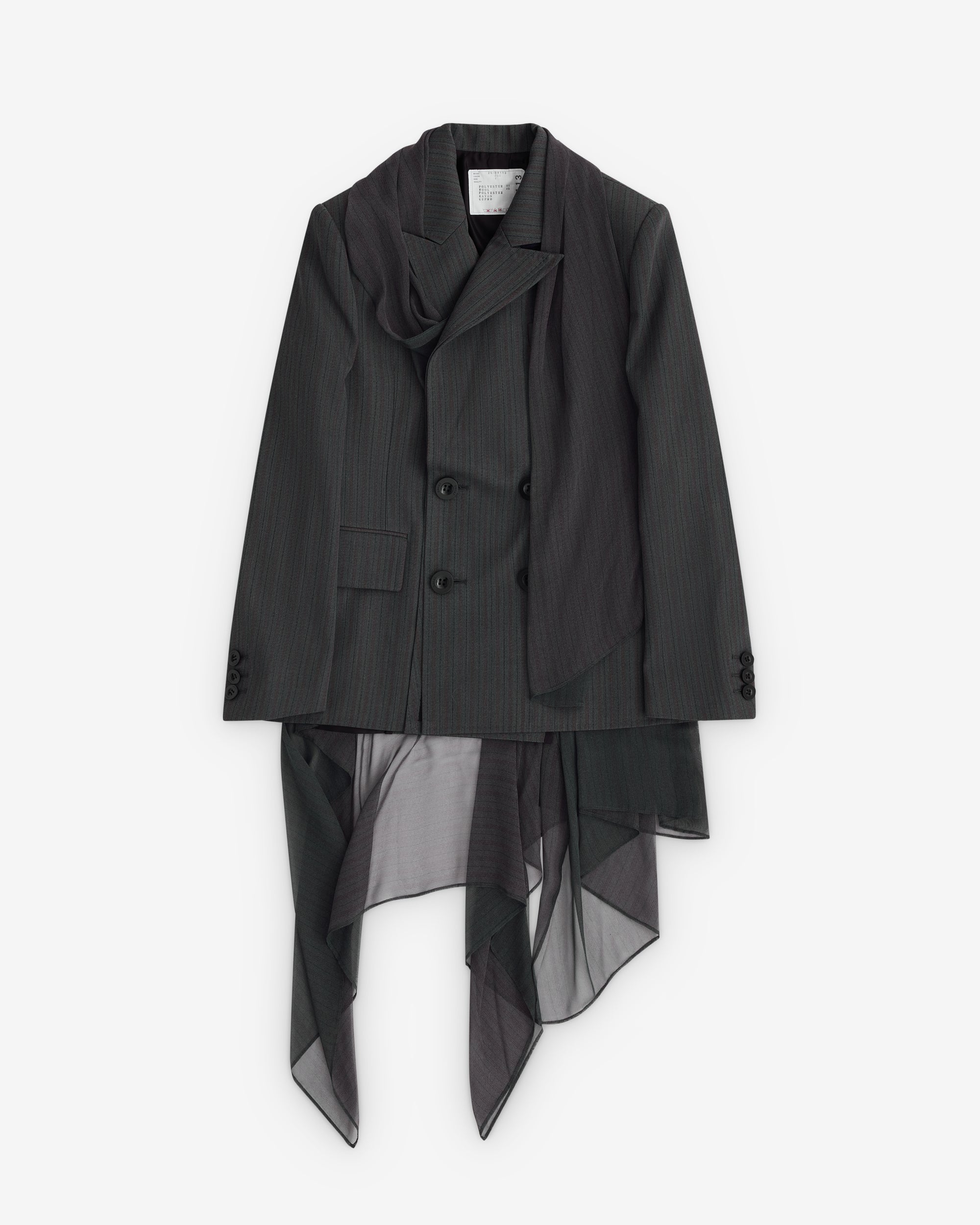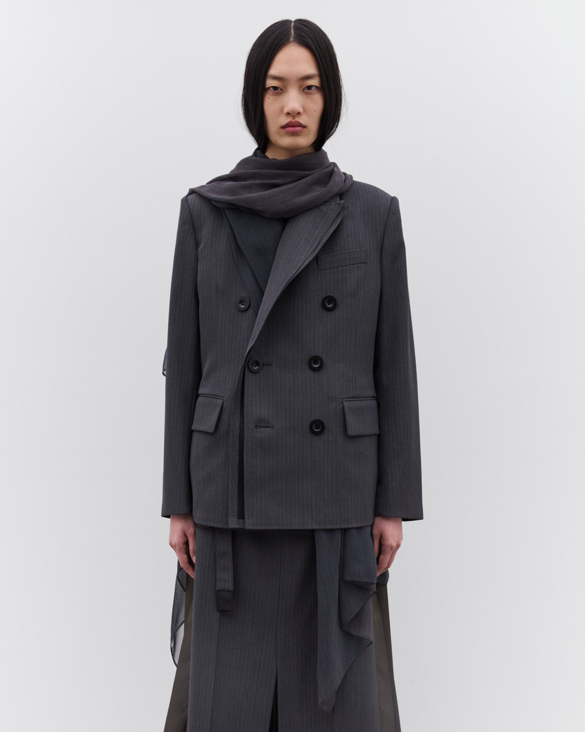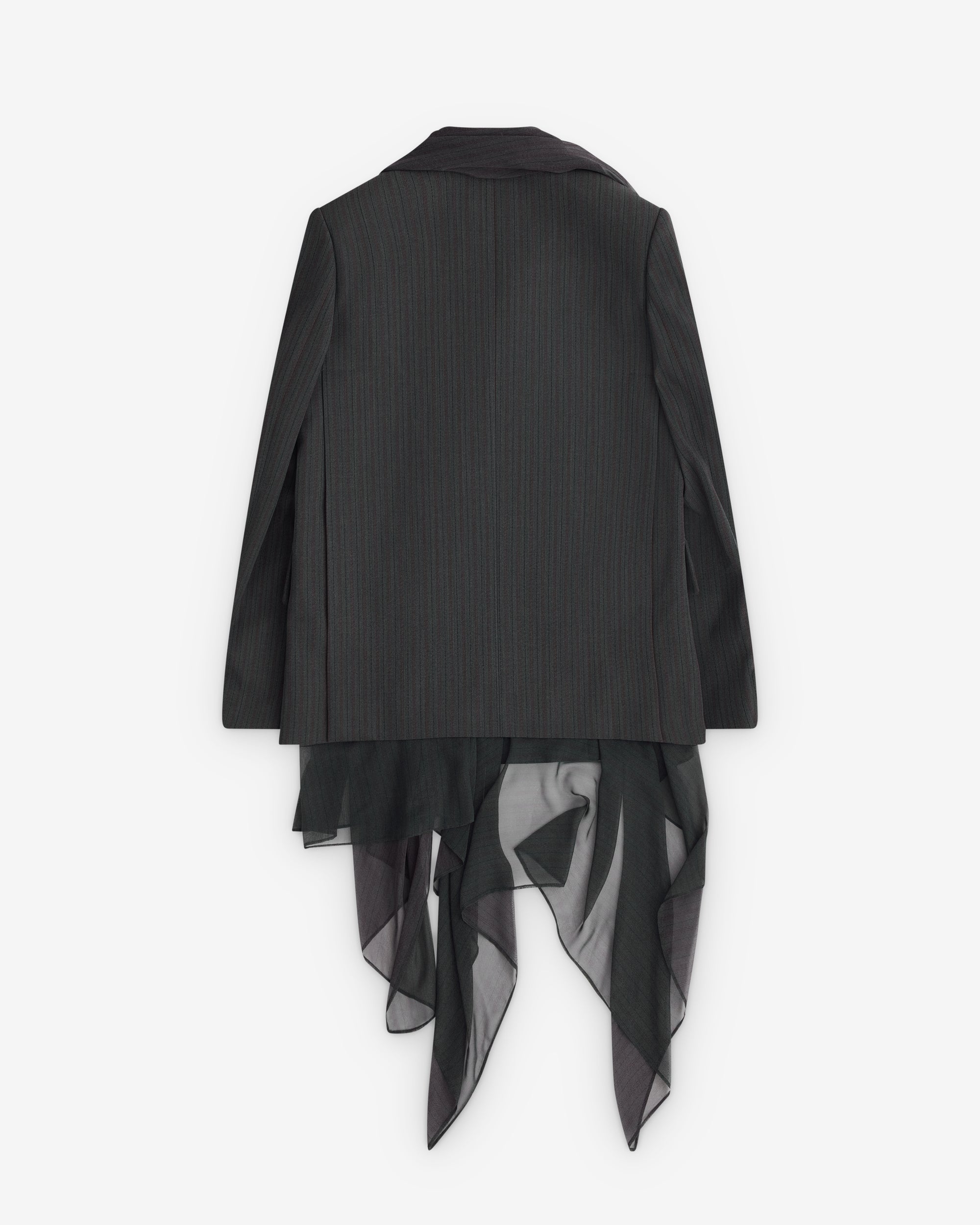 Double breastedClassic notch lapelsFront flap pocketsLayered constructionTulle draping at shoulder and hemLined