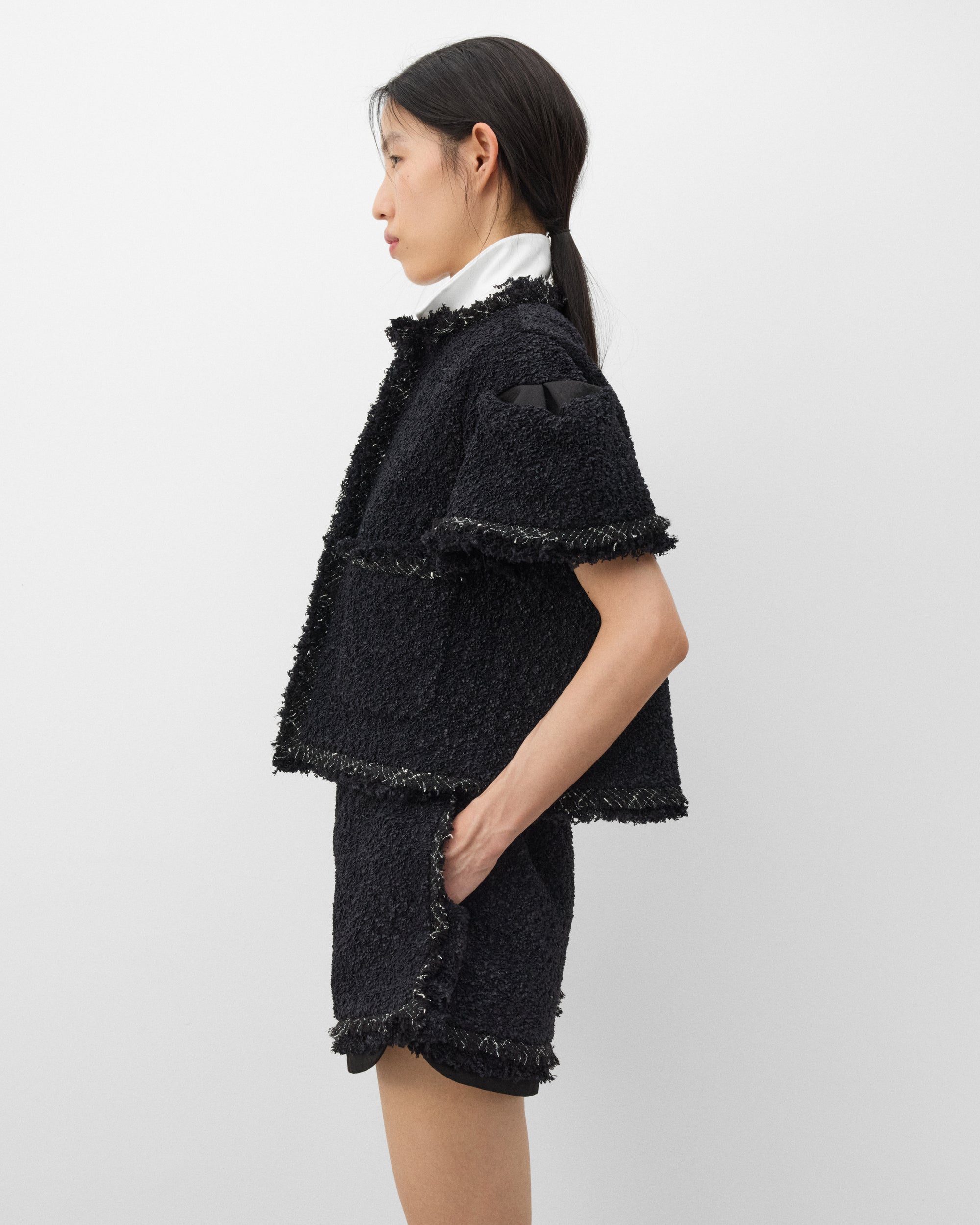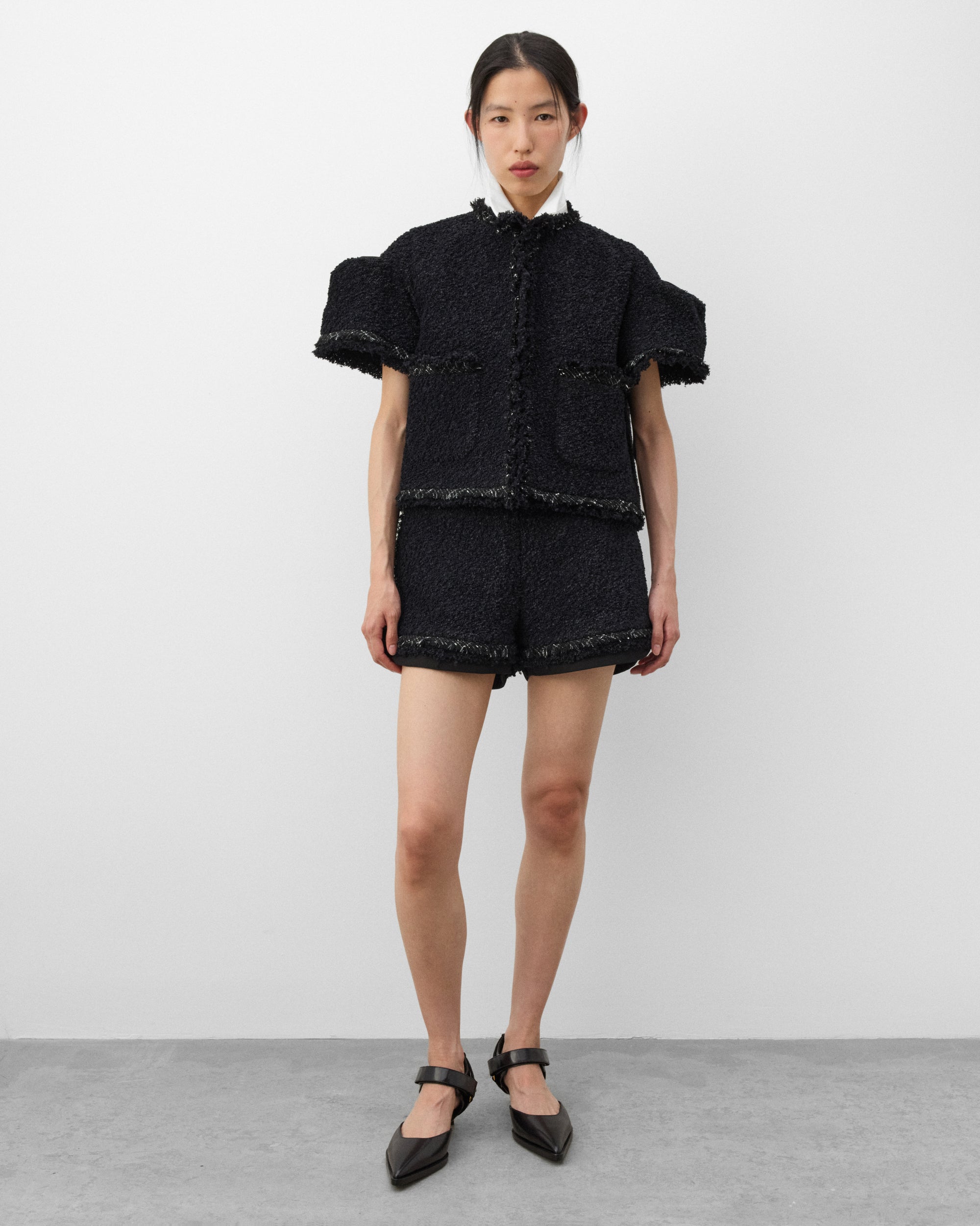 Round neckConcealed fasteningShort, voluminous sleevesCroppedContrast tippingFront patch pockets