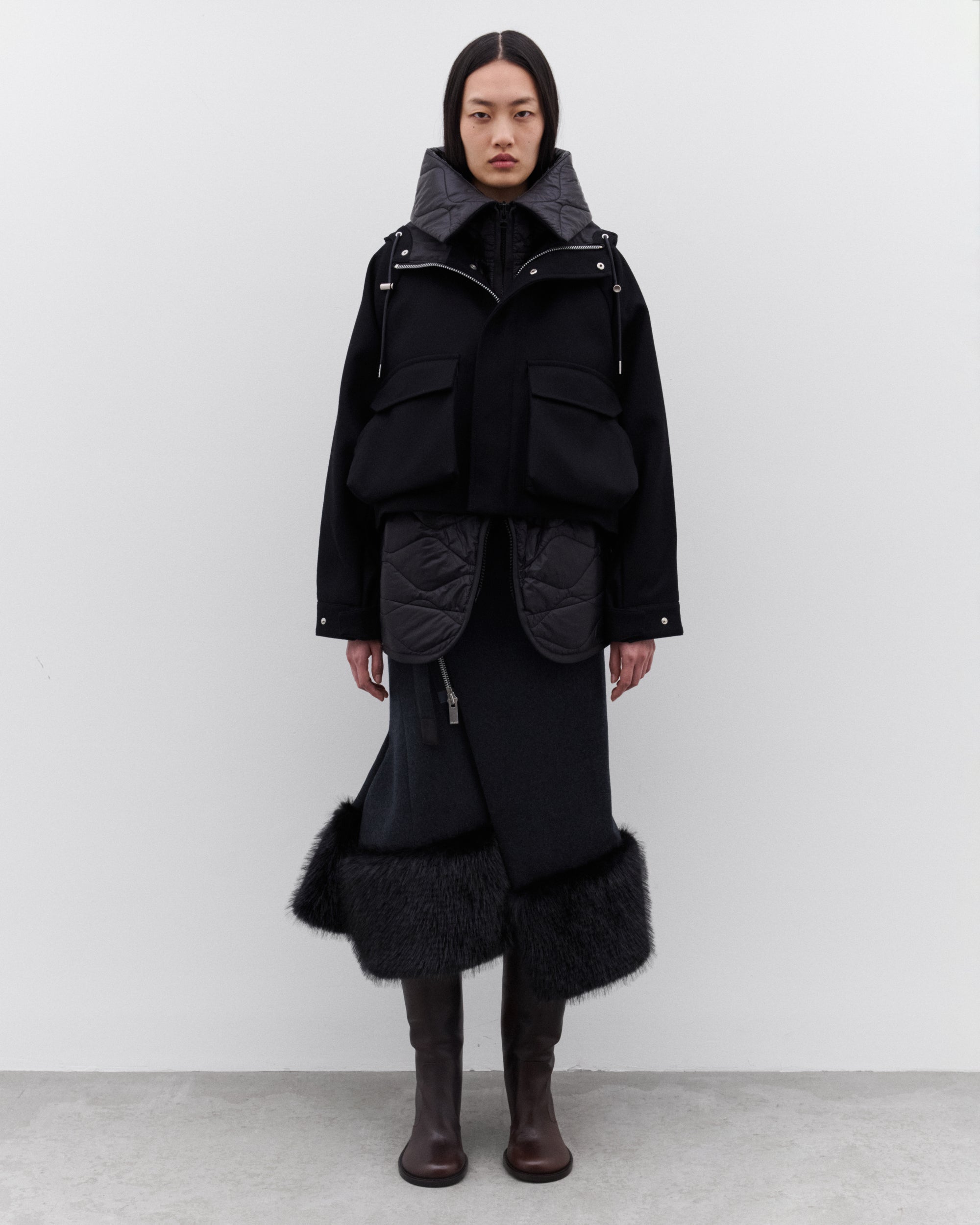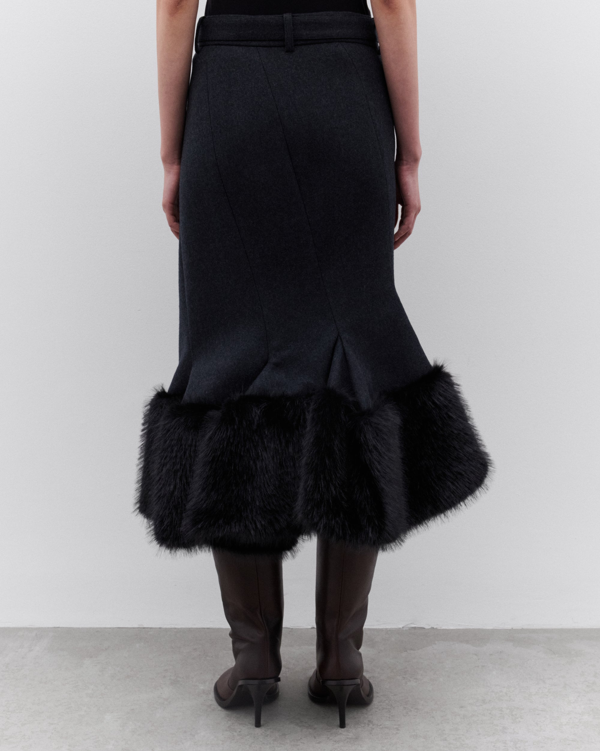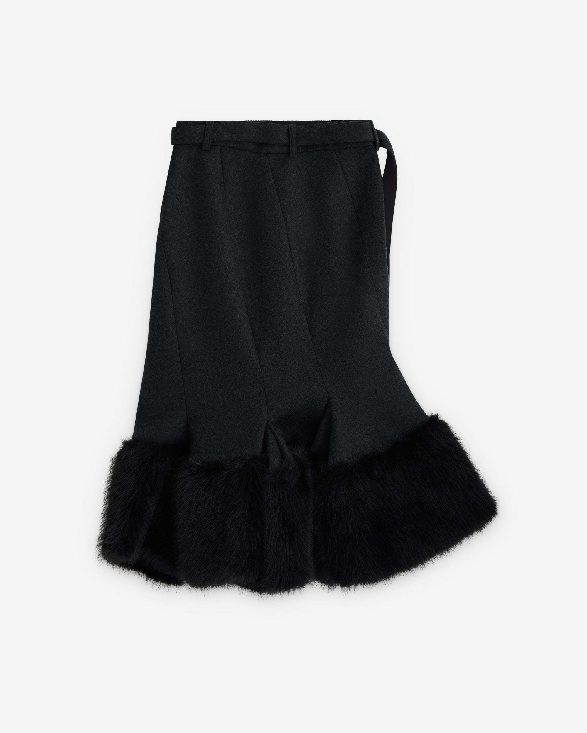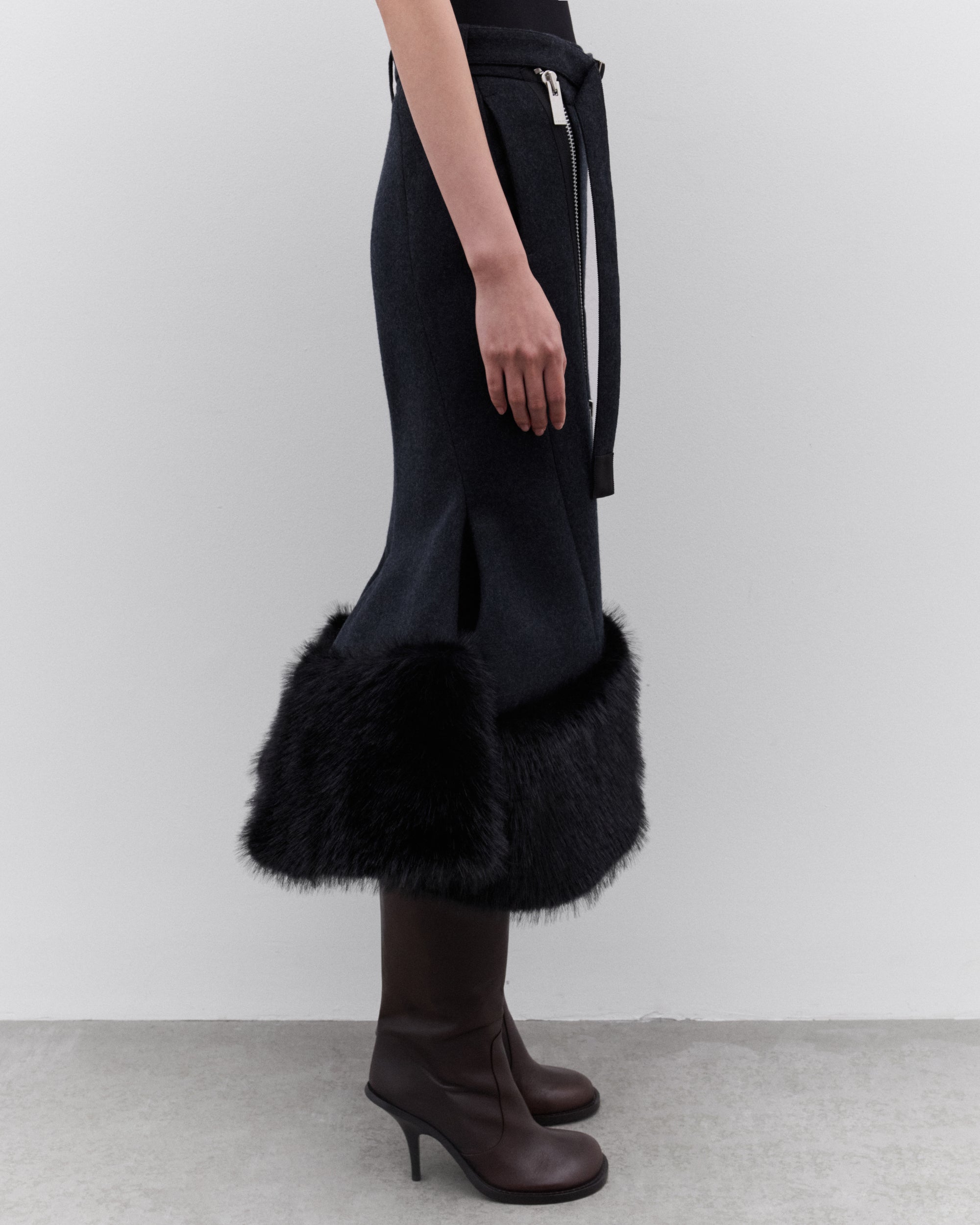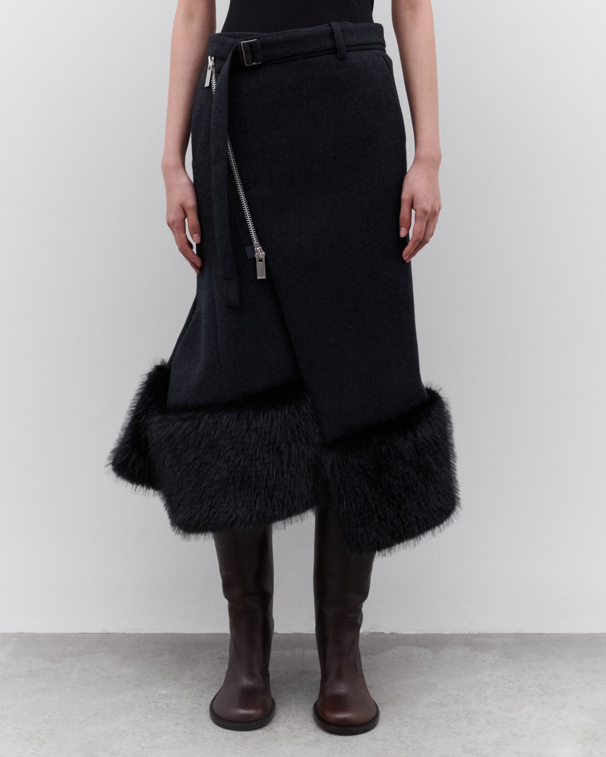 Asymmetric two-way zip fasteningFaux fur trim at hemLinedDetachable beltMid-length