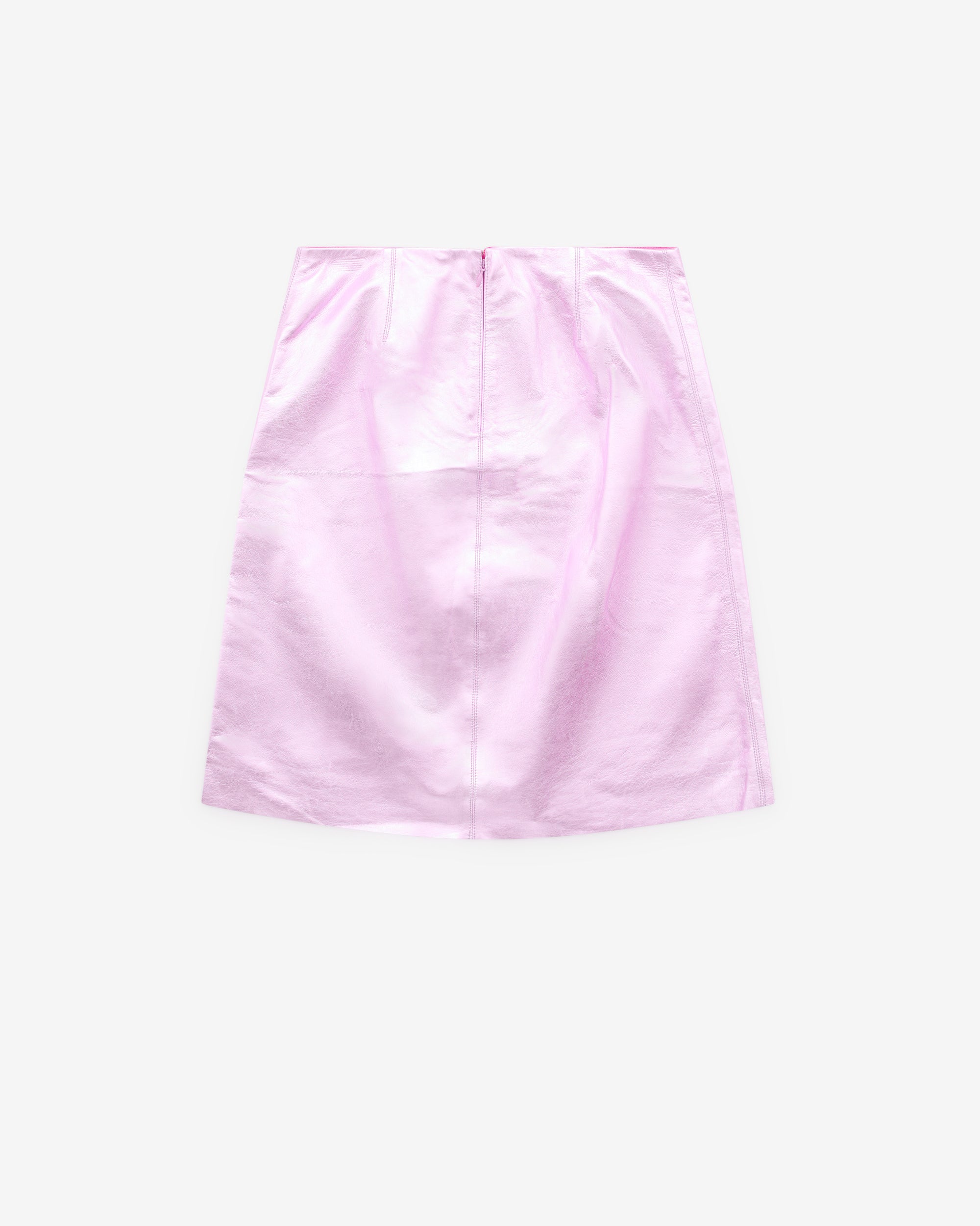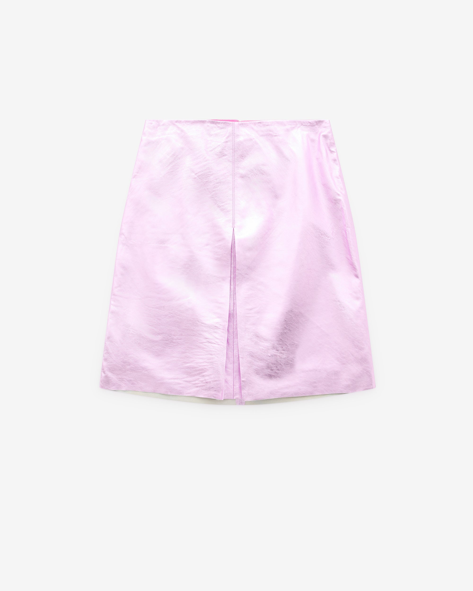Knee length lambskin leather skirt in Pink MetallicFeatures a pleat at frontConcealed zipper at backFully lined
