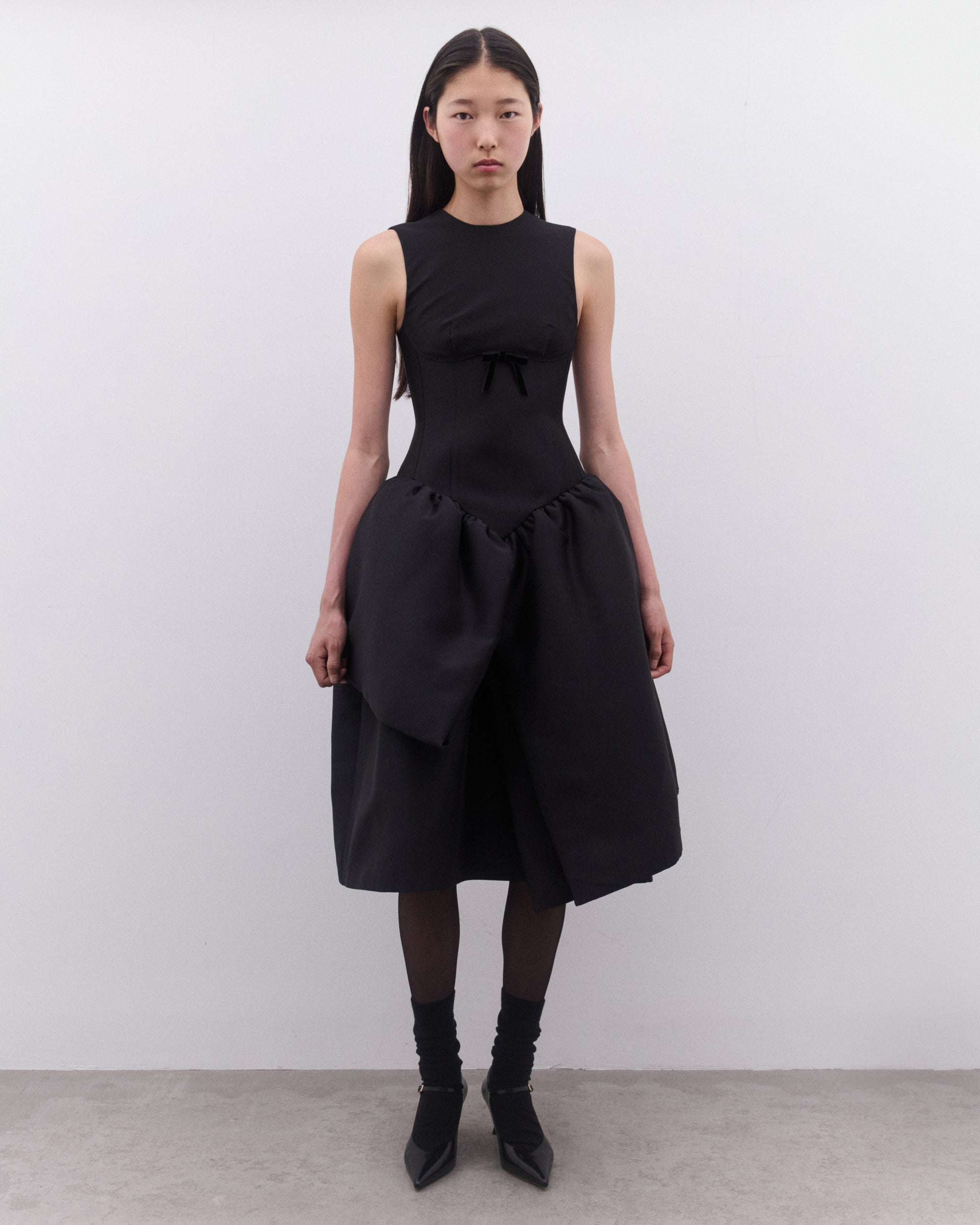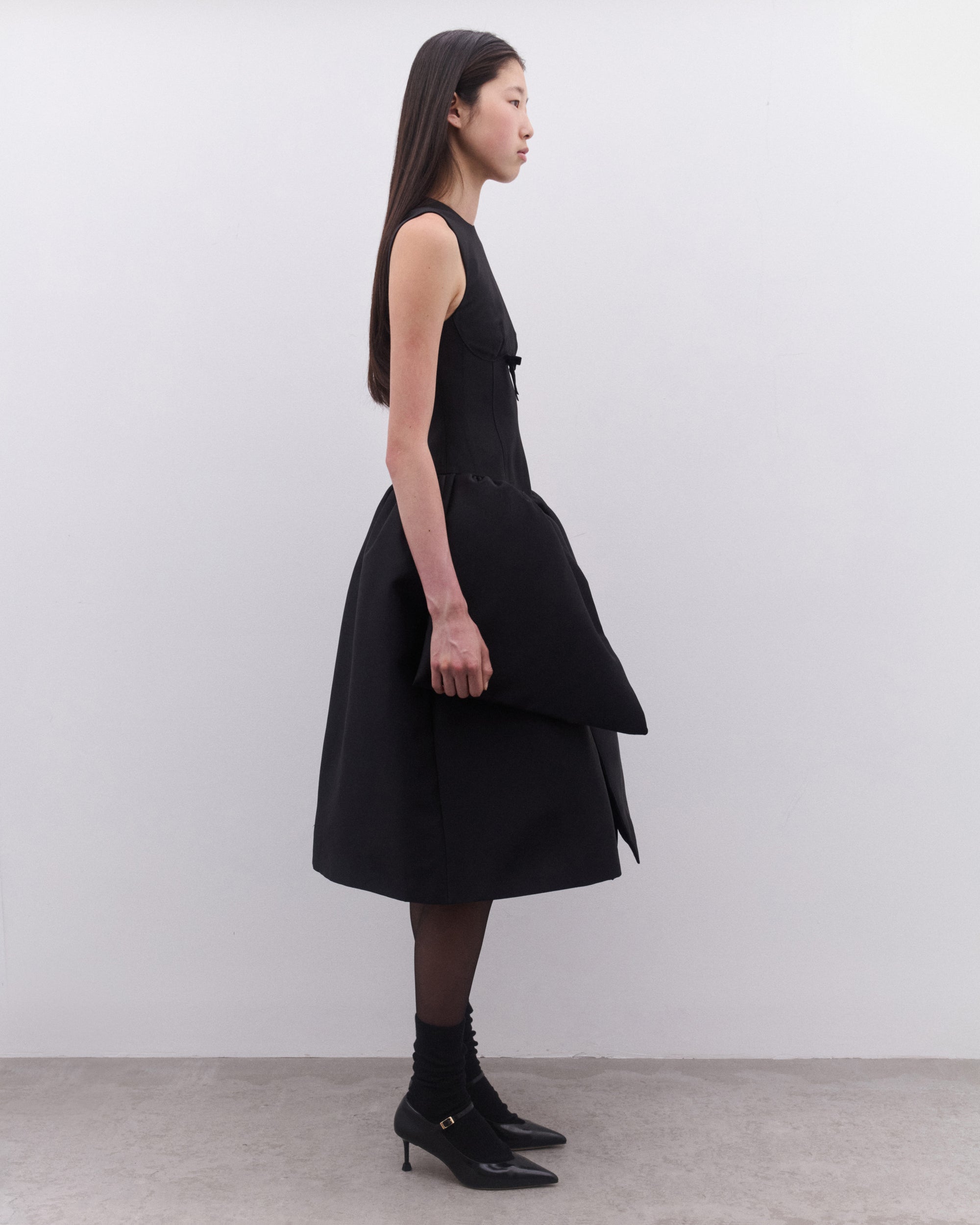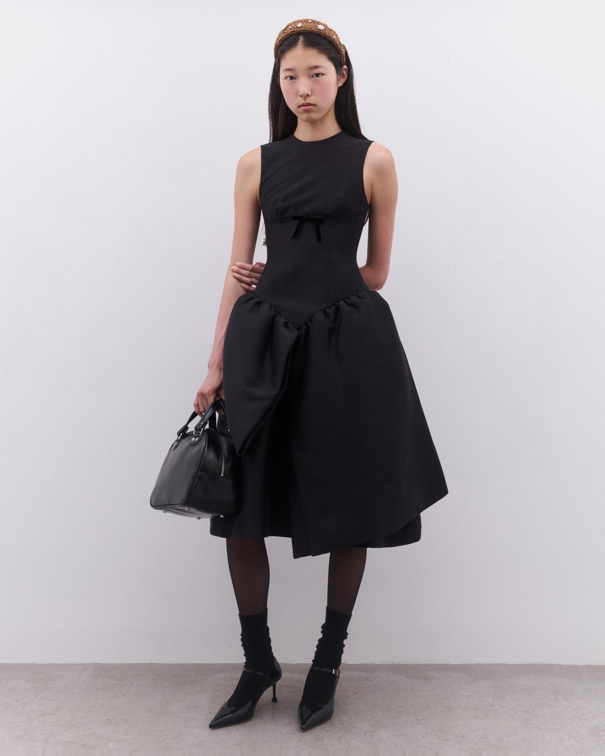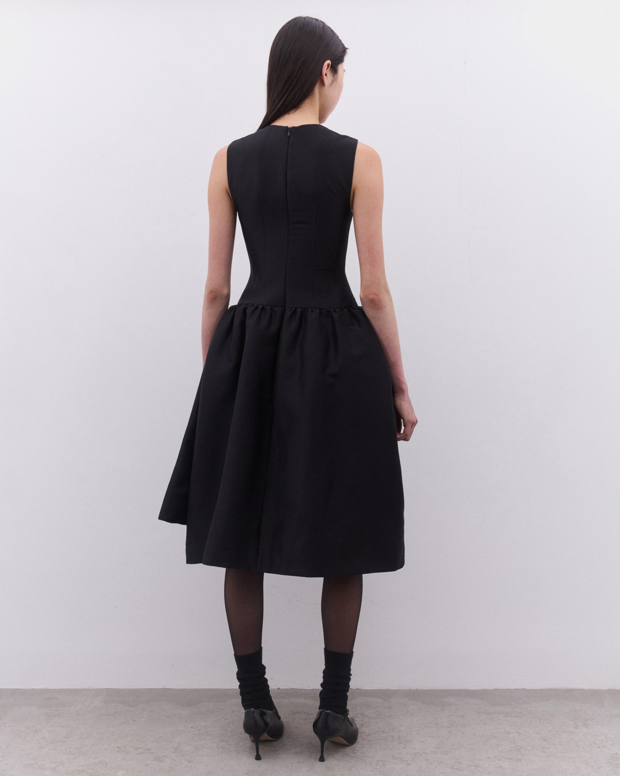 Rounded necklineSleeveless Back zip closureInternal bodice at waistA-line skirt silhouette Partial liningBow detailing