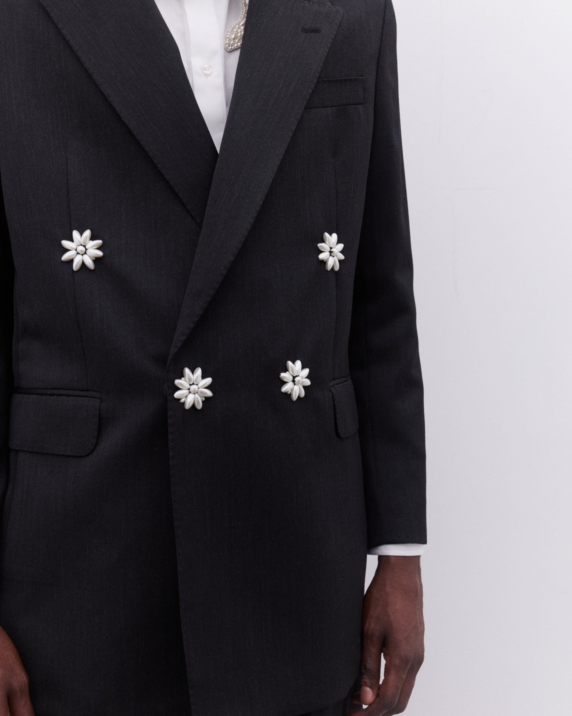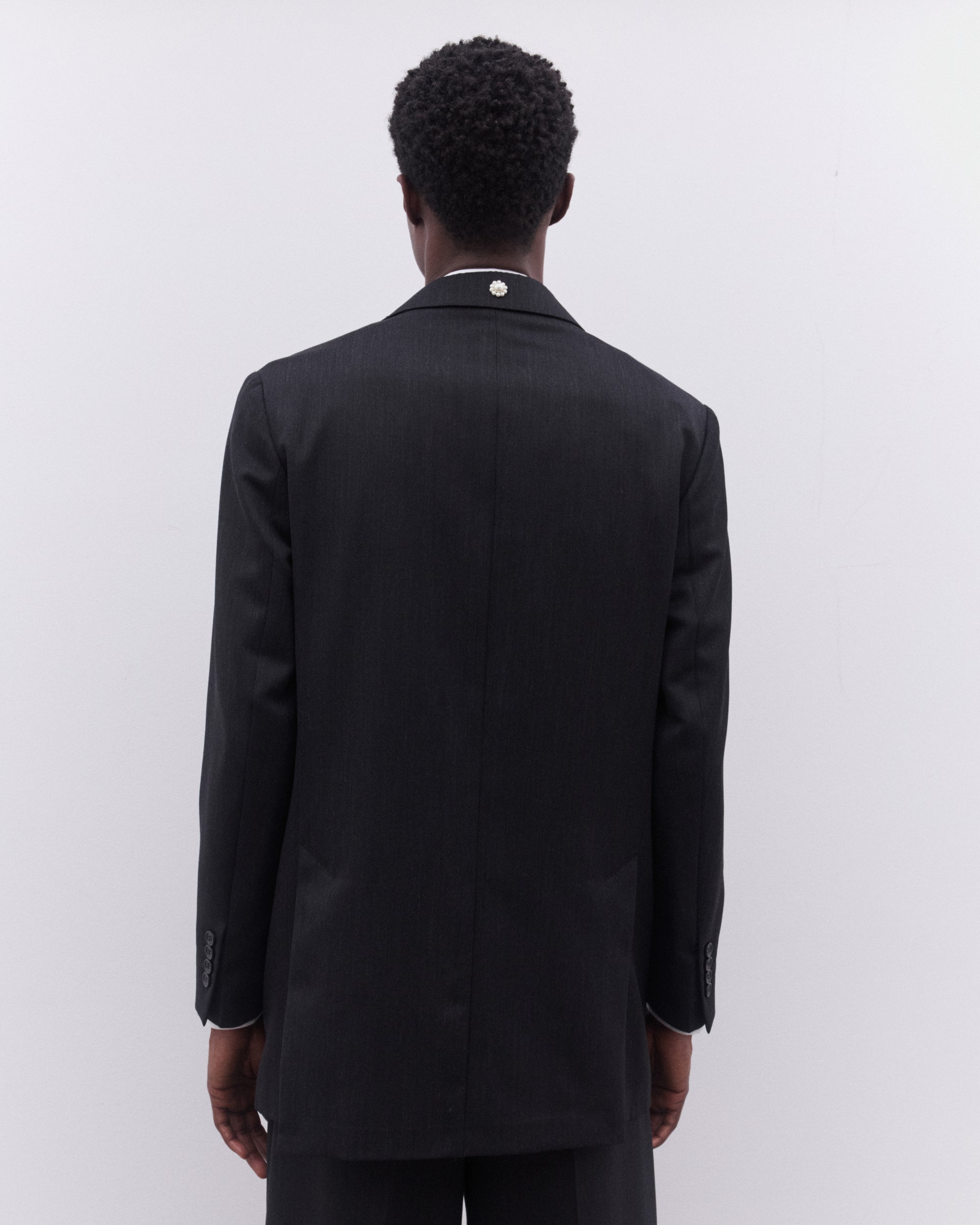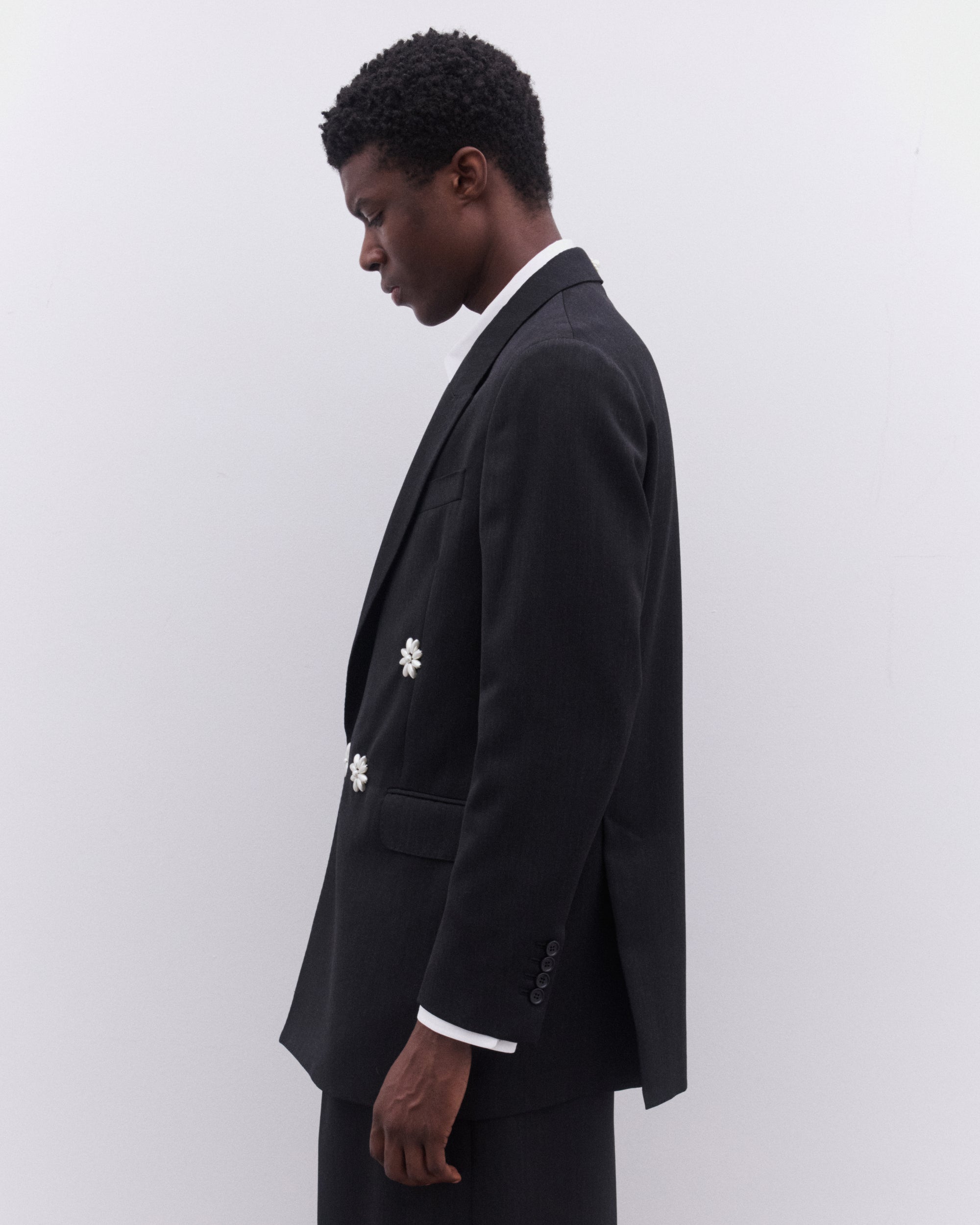 Exaggerated notch lapels with button holePearl buttonsWelt pocket at chestFlap front pocketsButtoned cuffsRear double ventEmbellishment at nape45% Wool, 55% PolyesterMade in Portugal