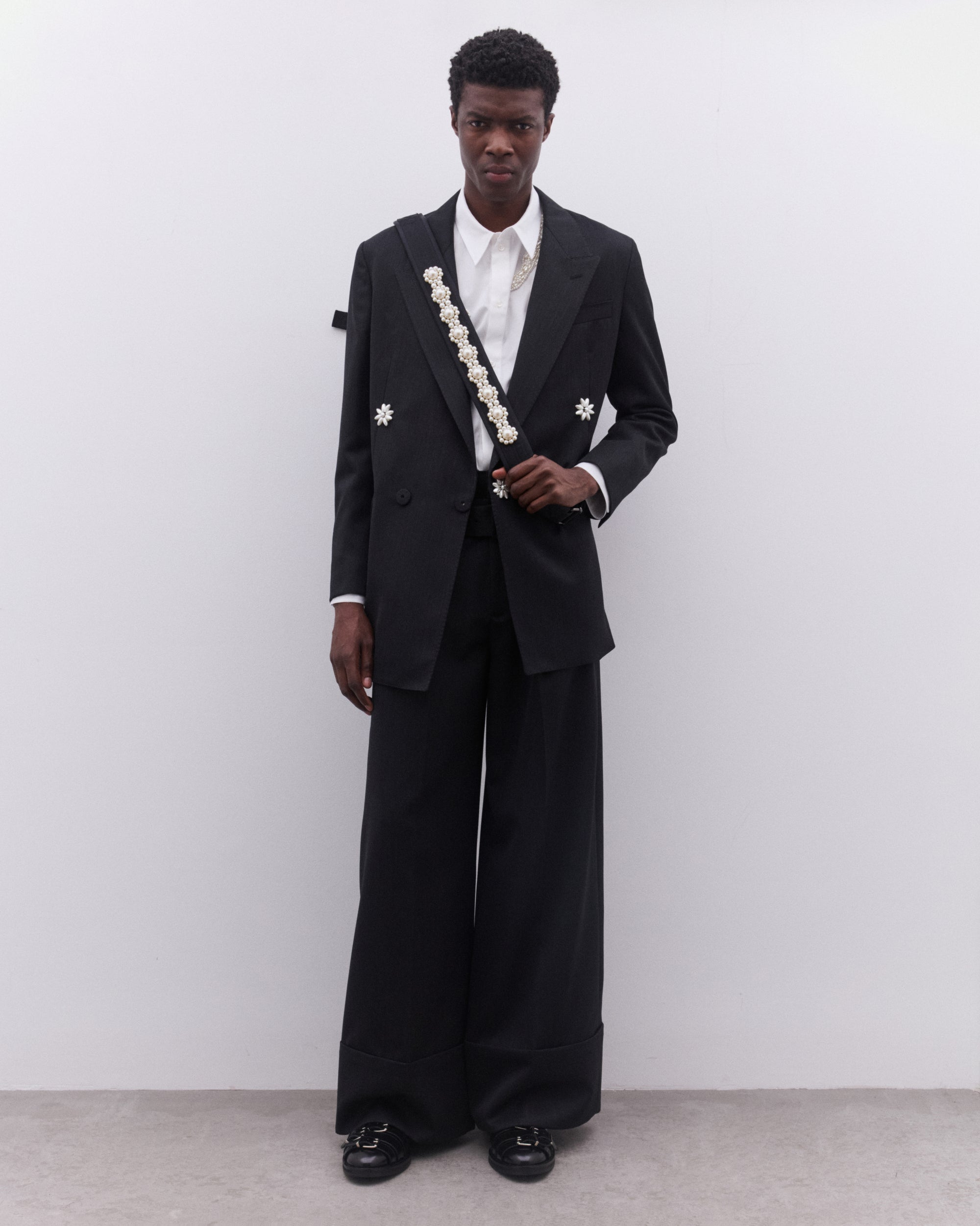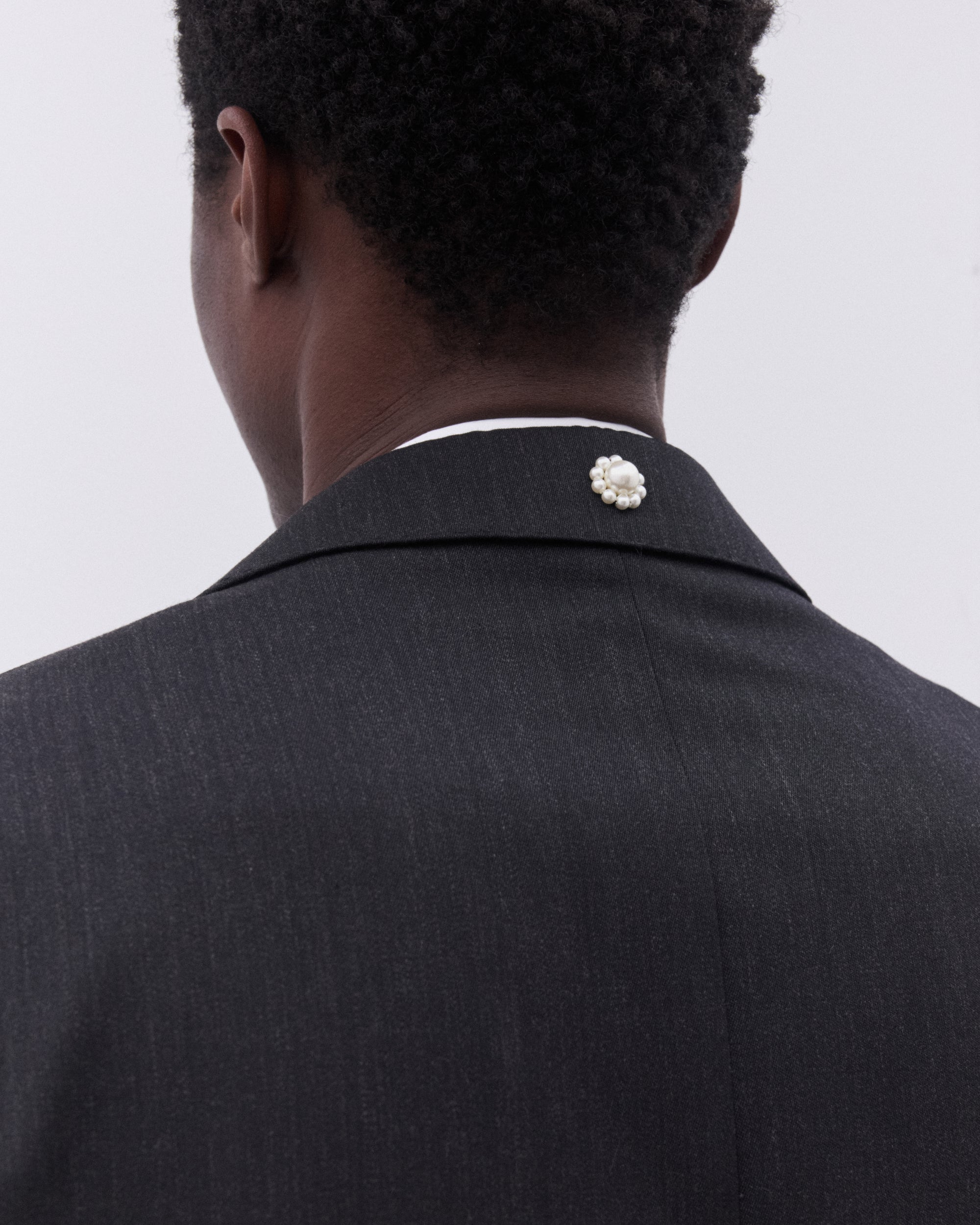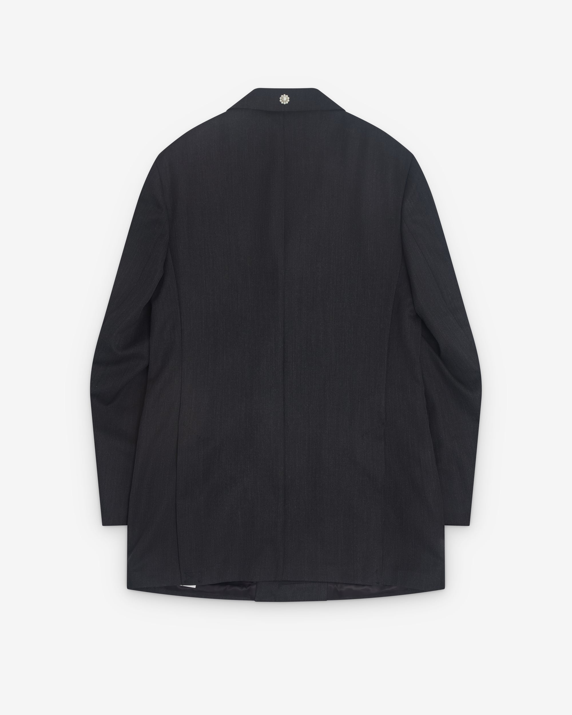 Exaggerated notch lapels with button holePearl buttonsWelt pocket at chestFlap front pocketsButtoned cuffsRear double ventEmbellishment at nape45% Wool, 55% PolyesterMade in Portugal