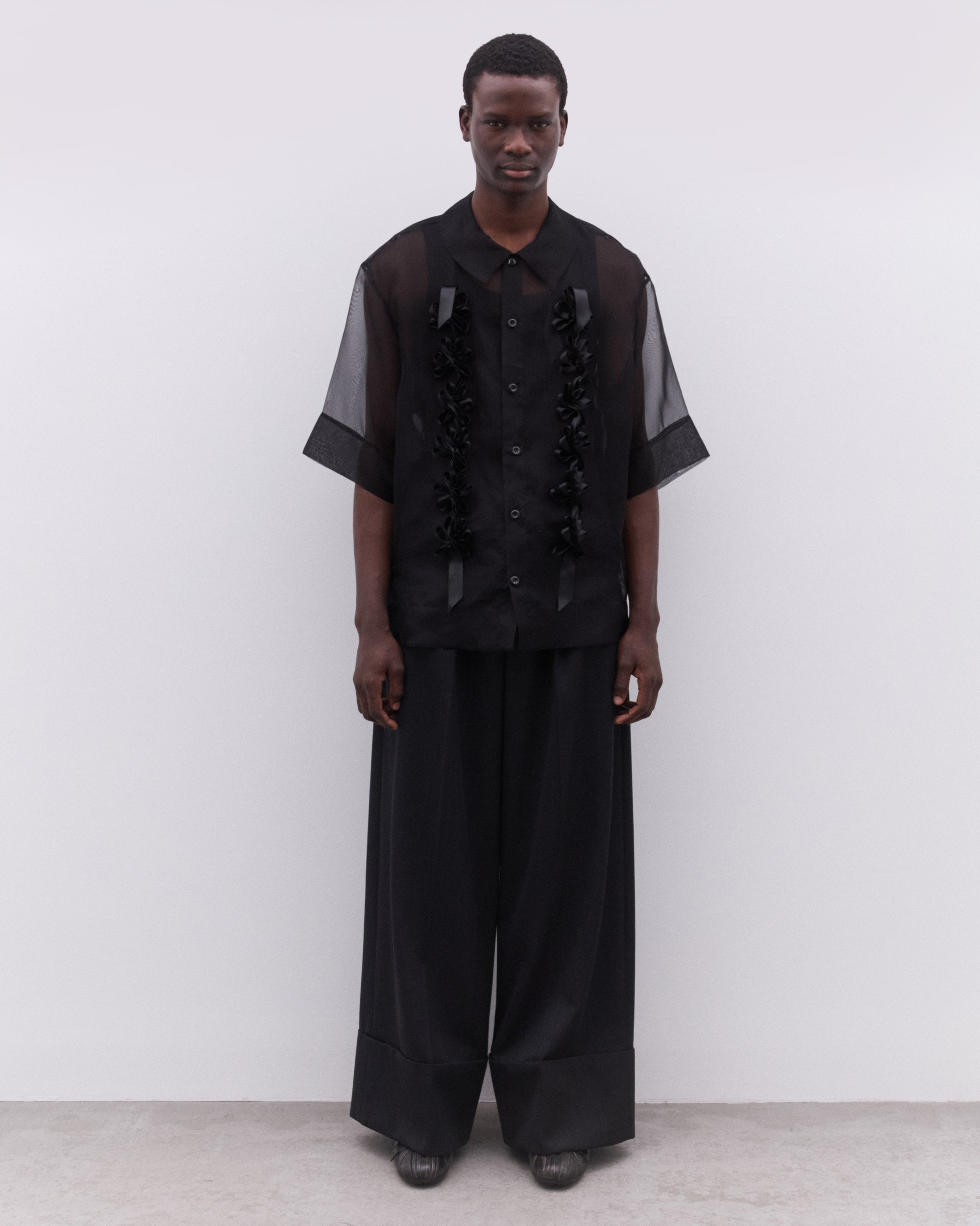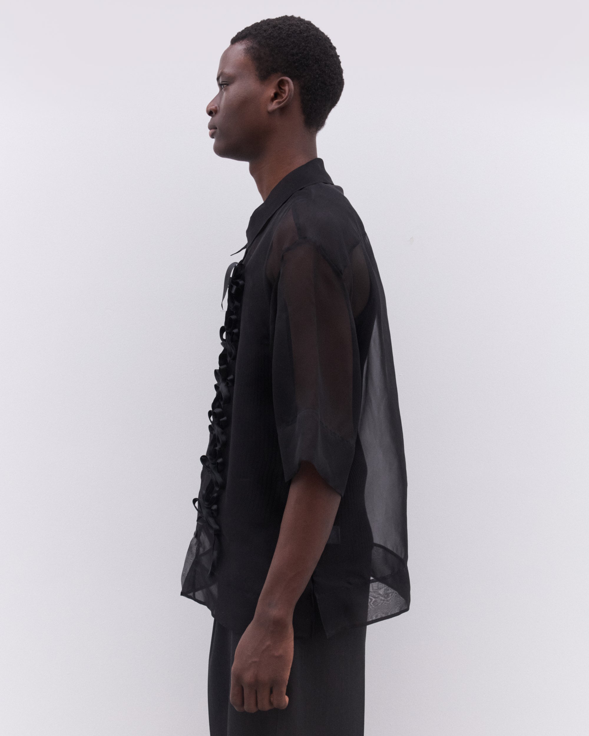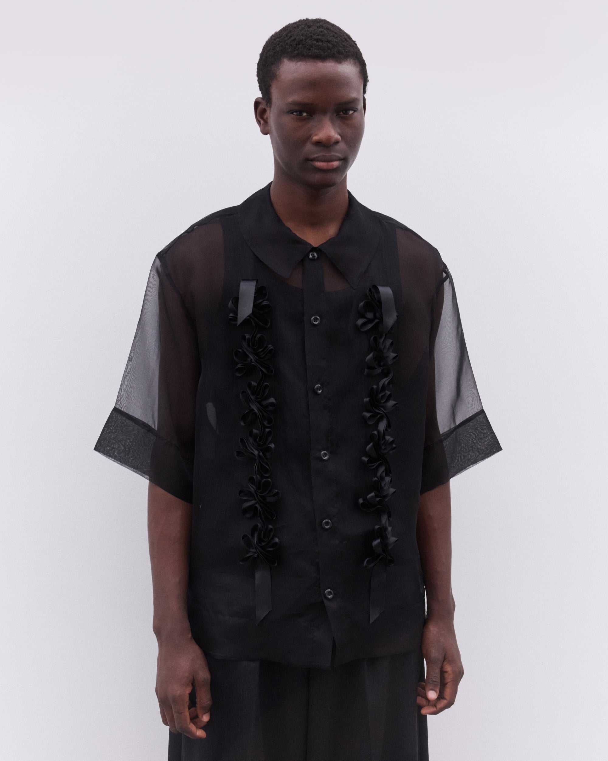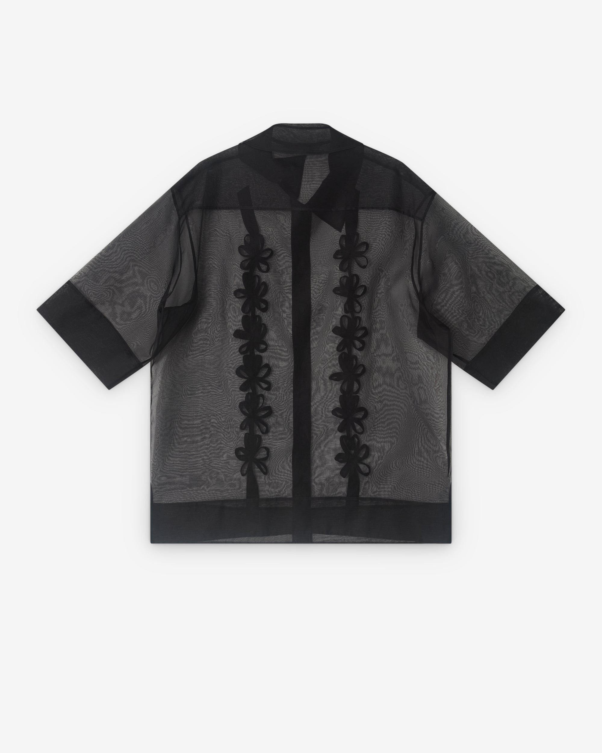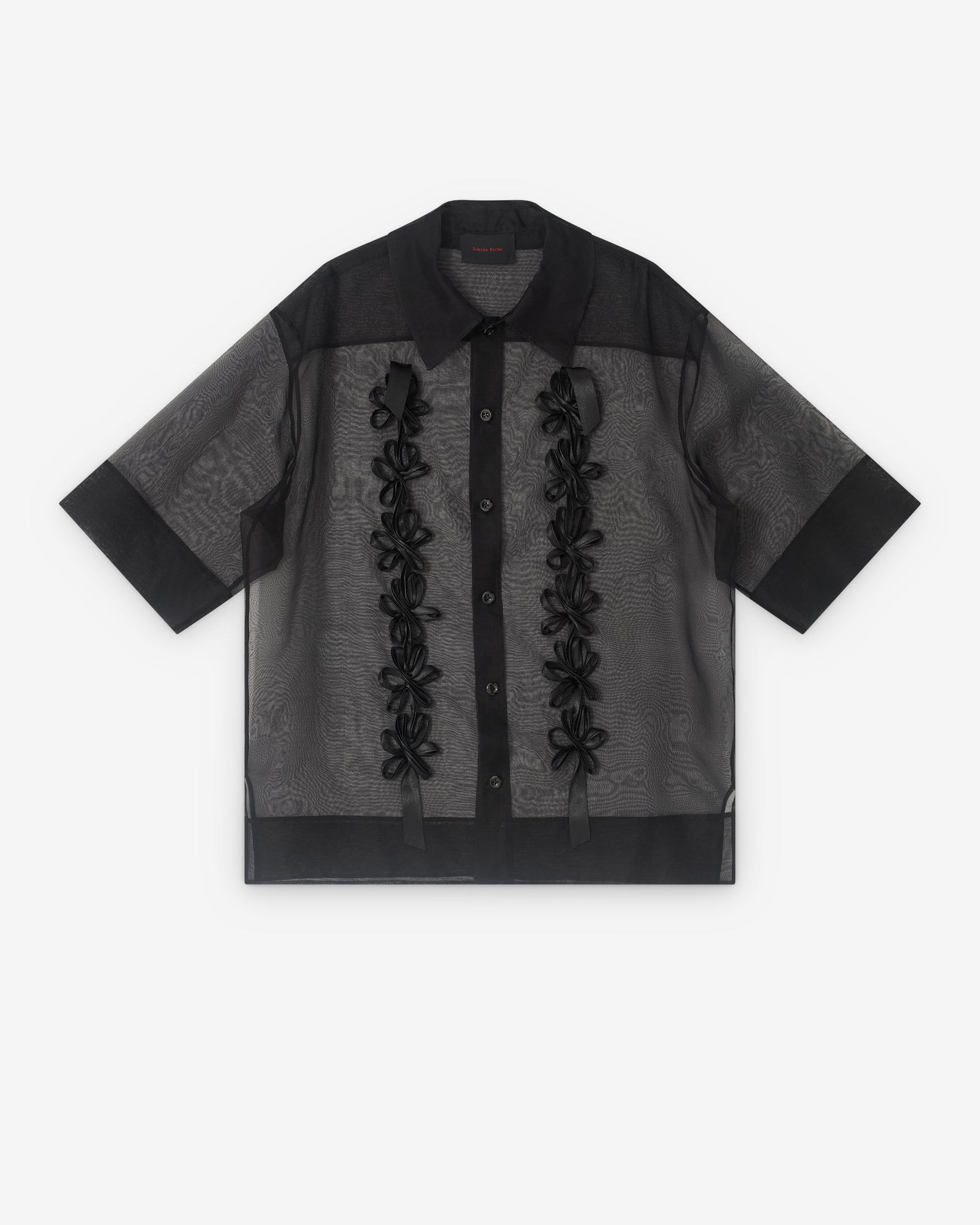 Sheer silk organza button-up shirtRibbon appliqué at frontOpen collarBoxy fit