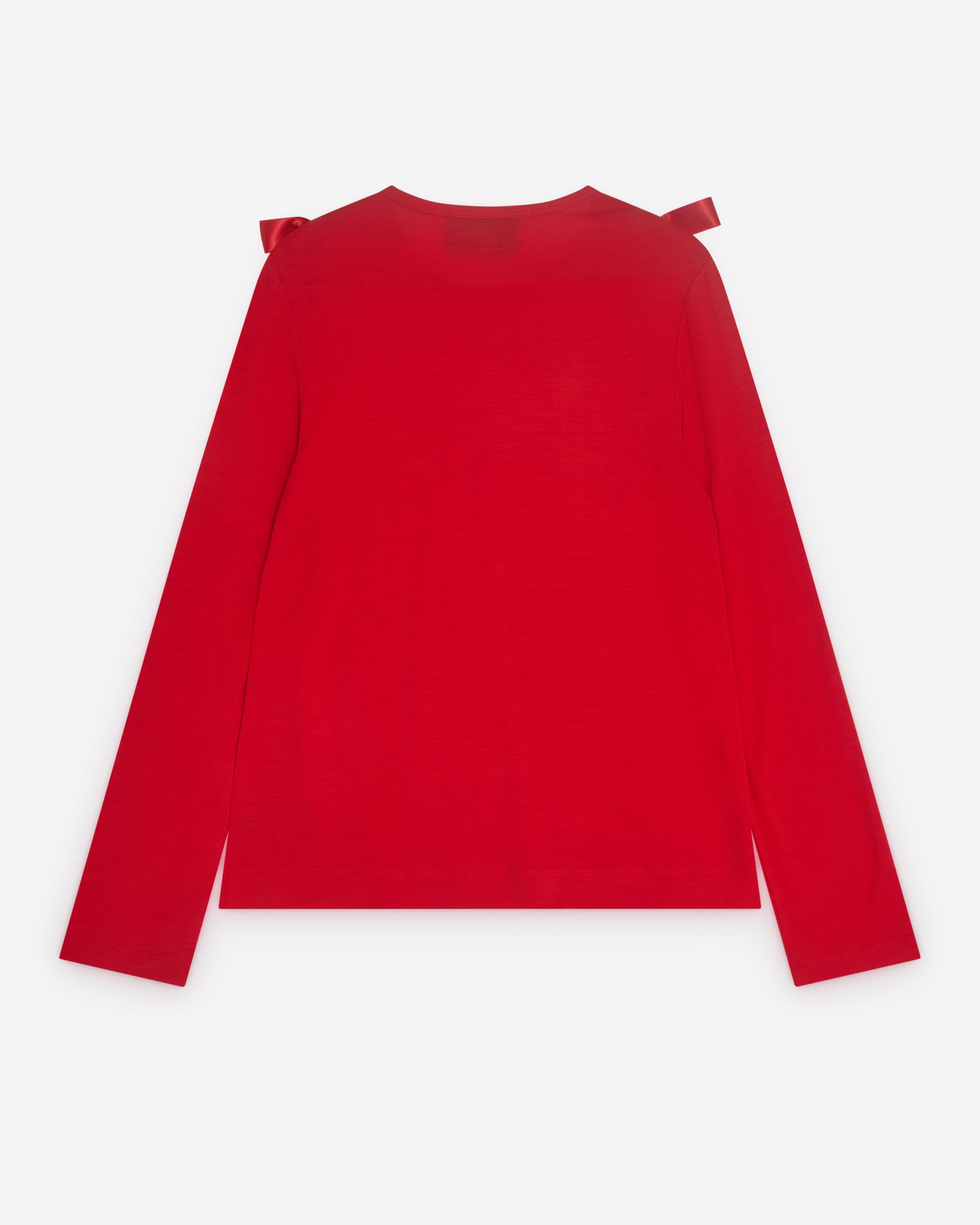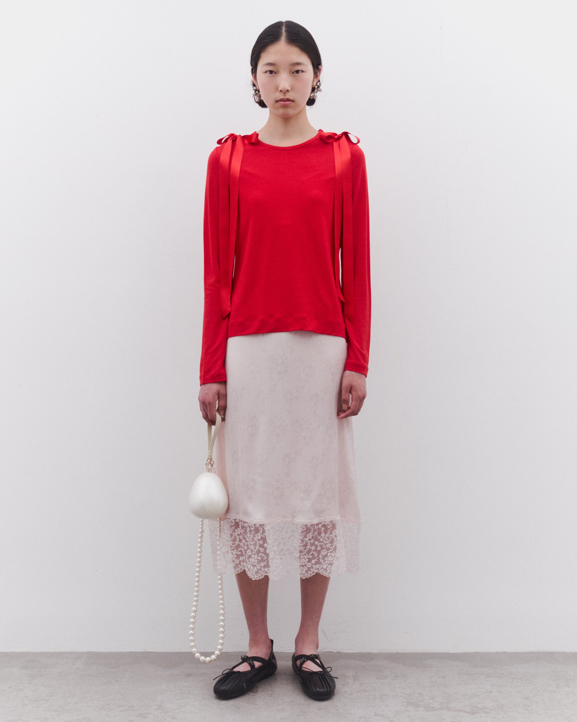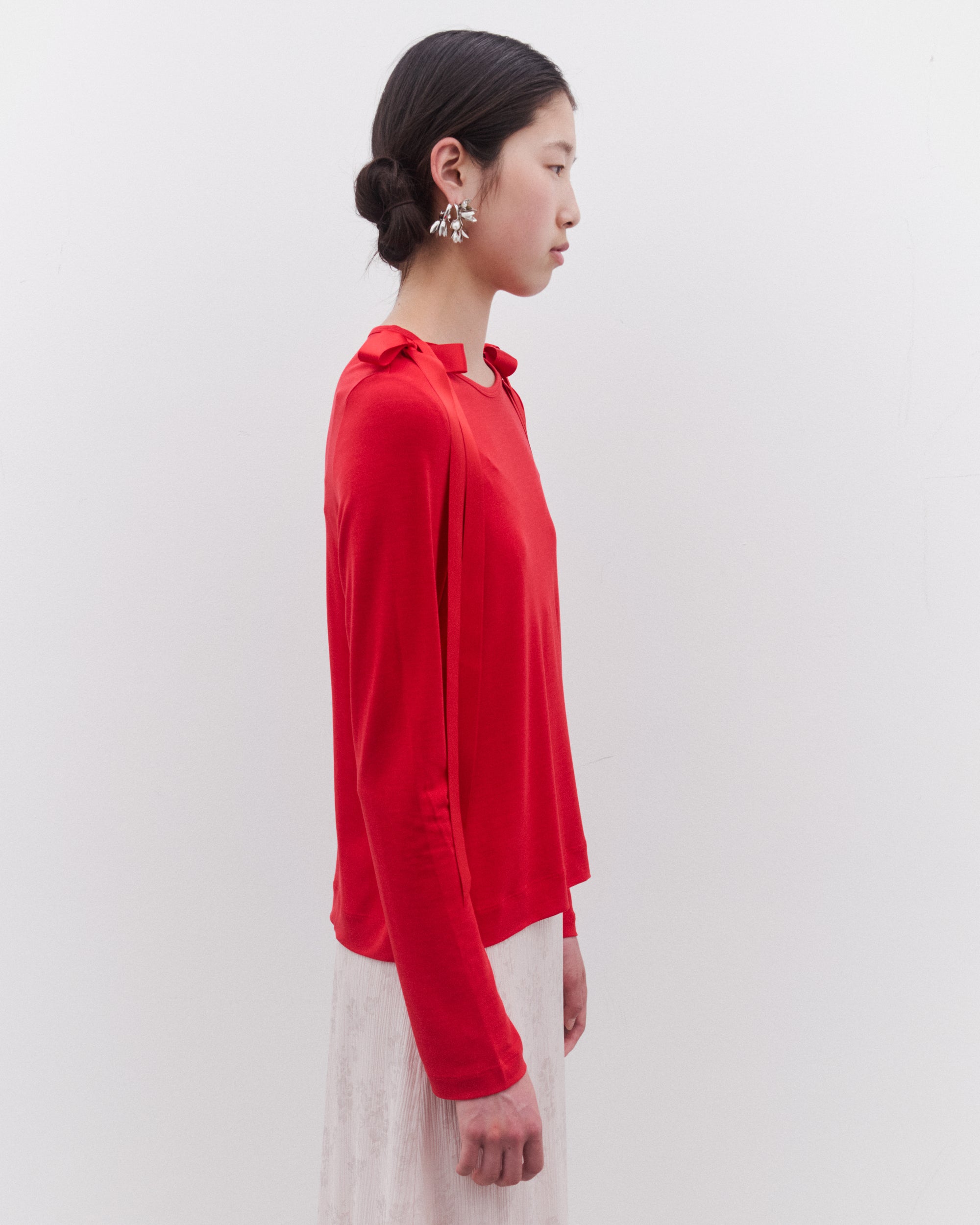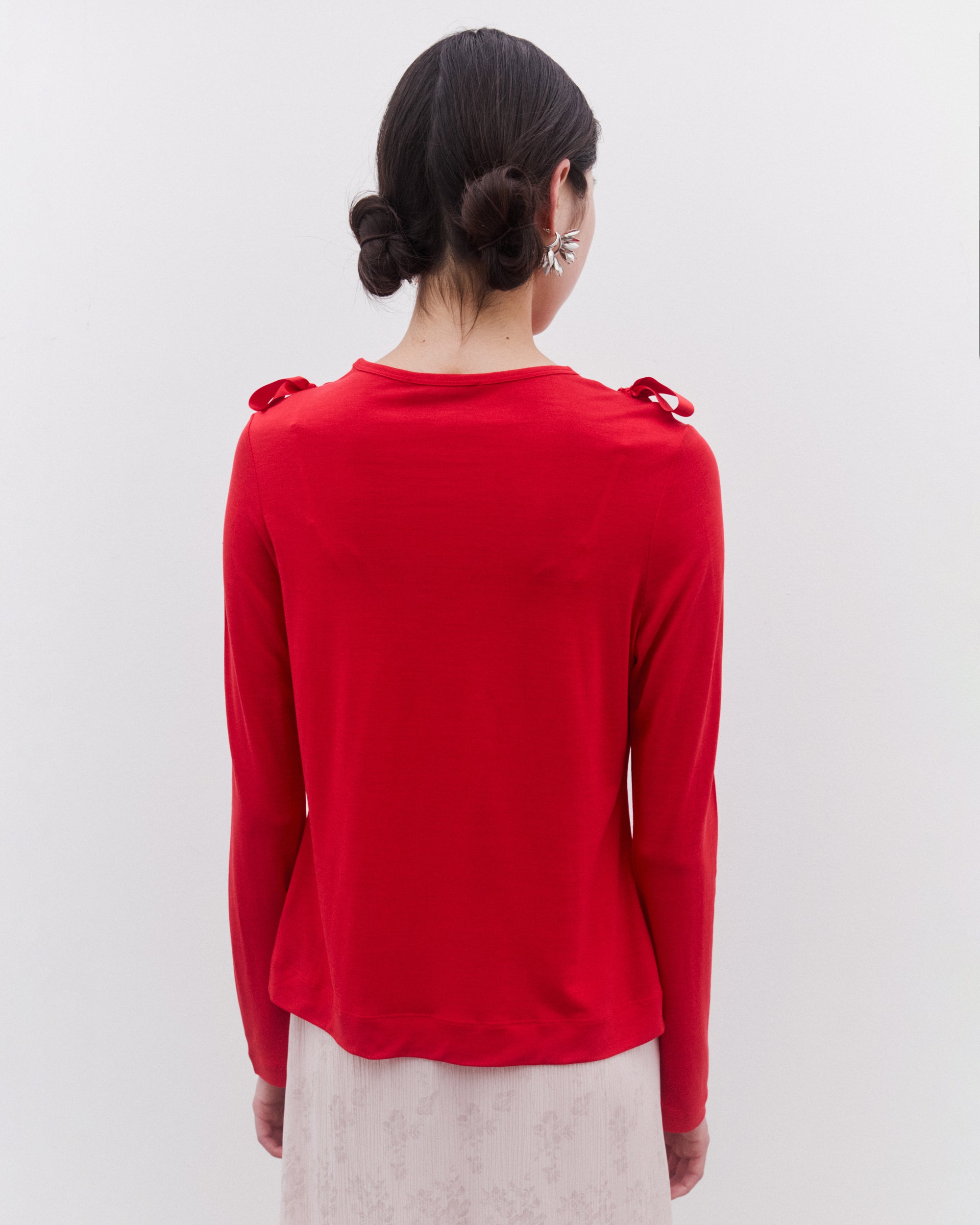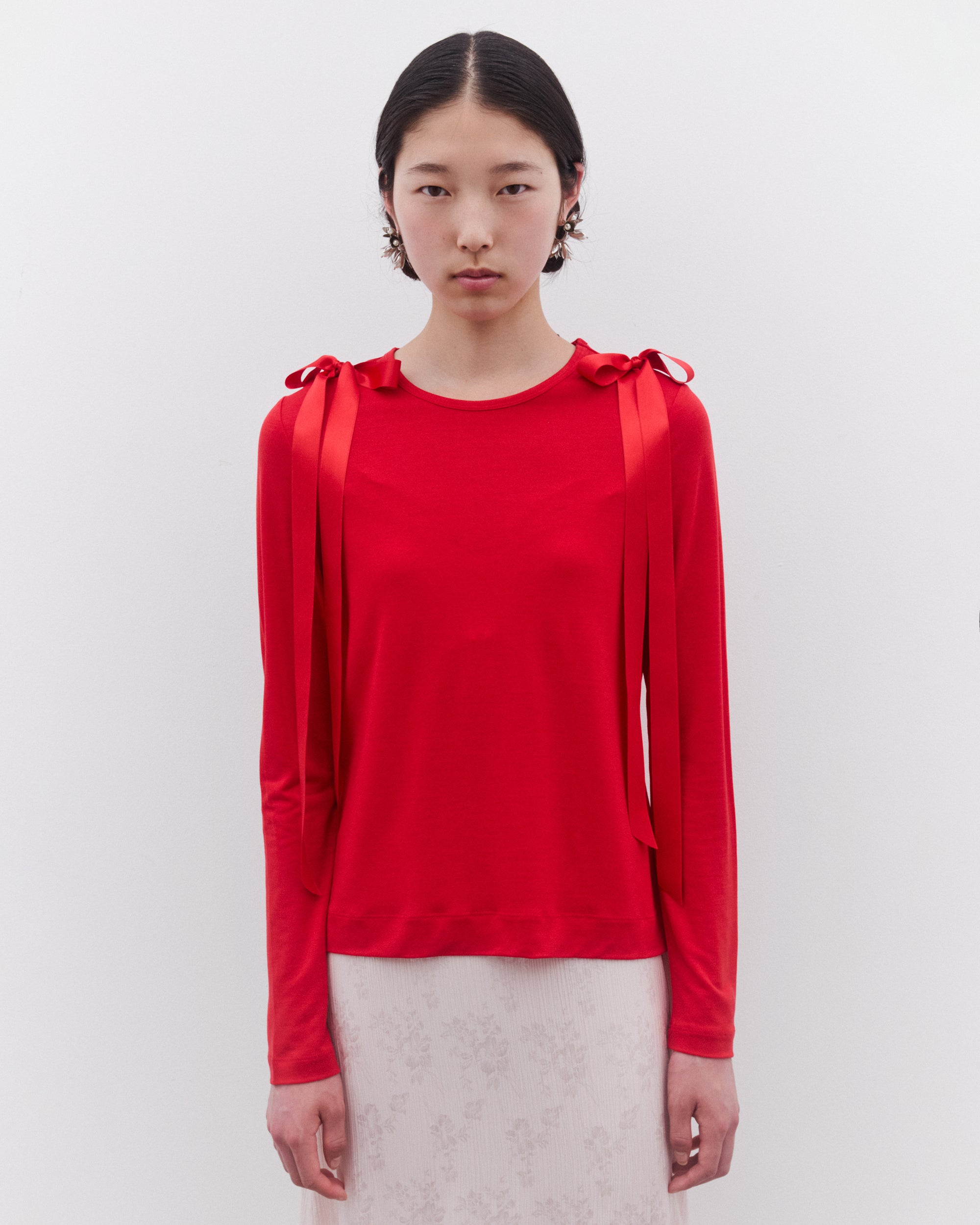 Bow tied ribbon detail at shoulderRound neckLong sleevesStraight hem