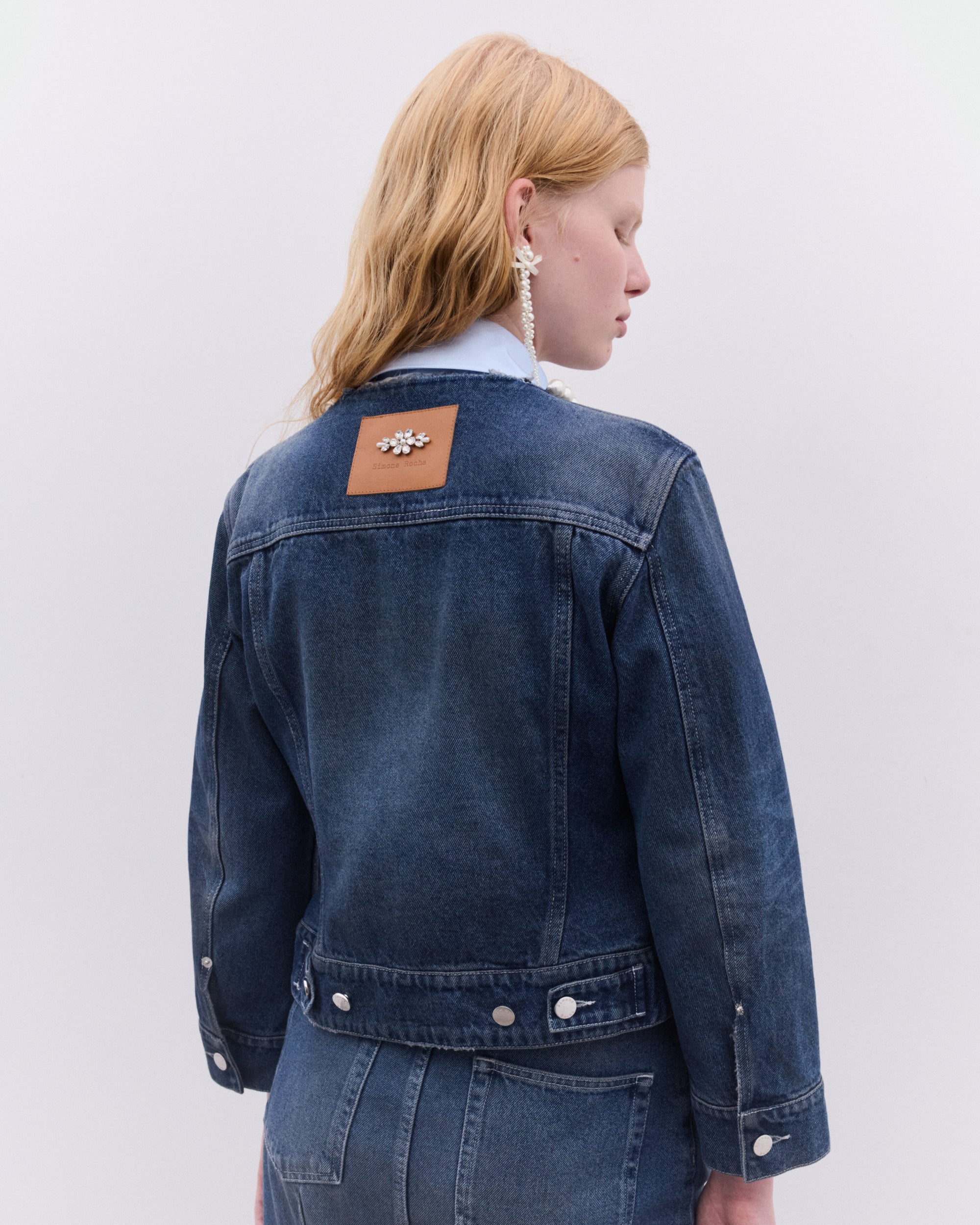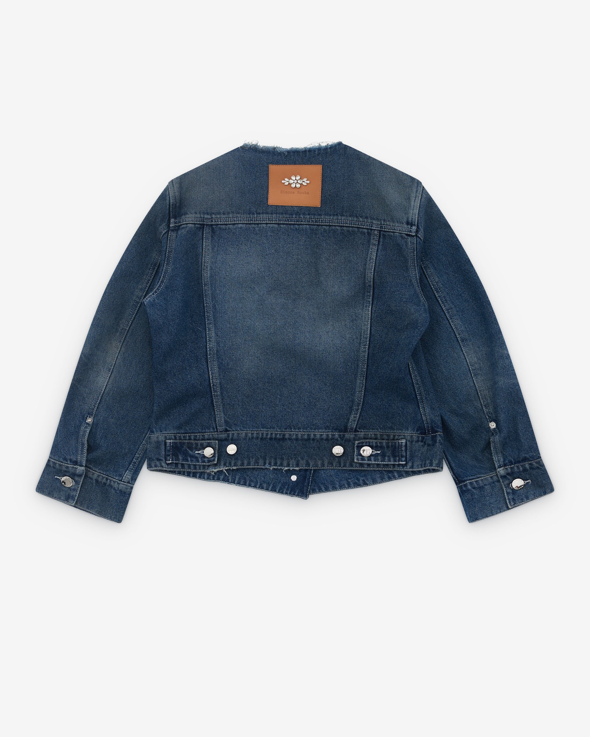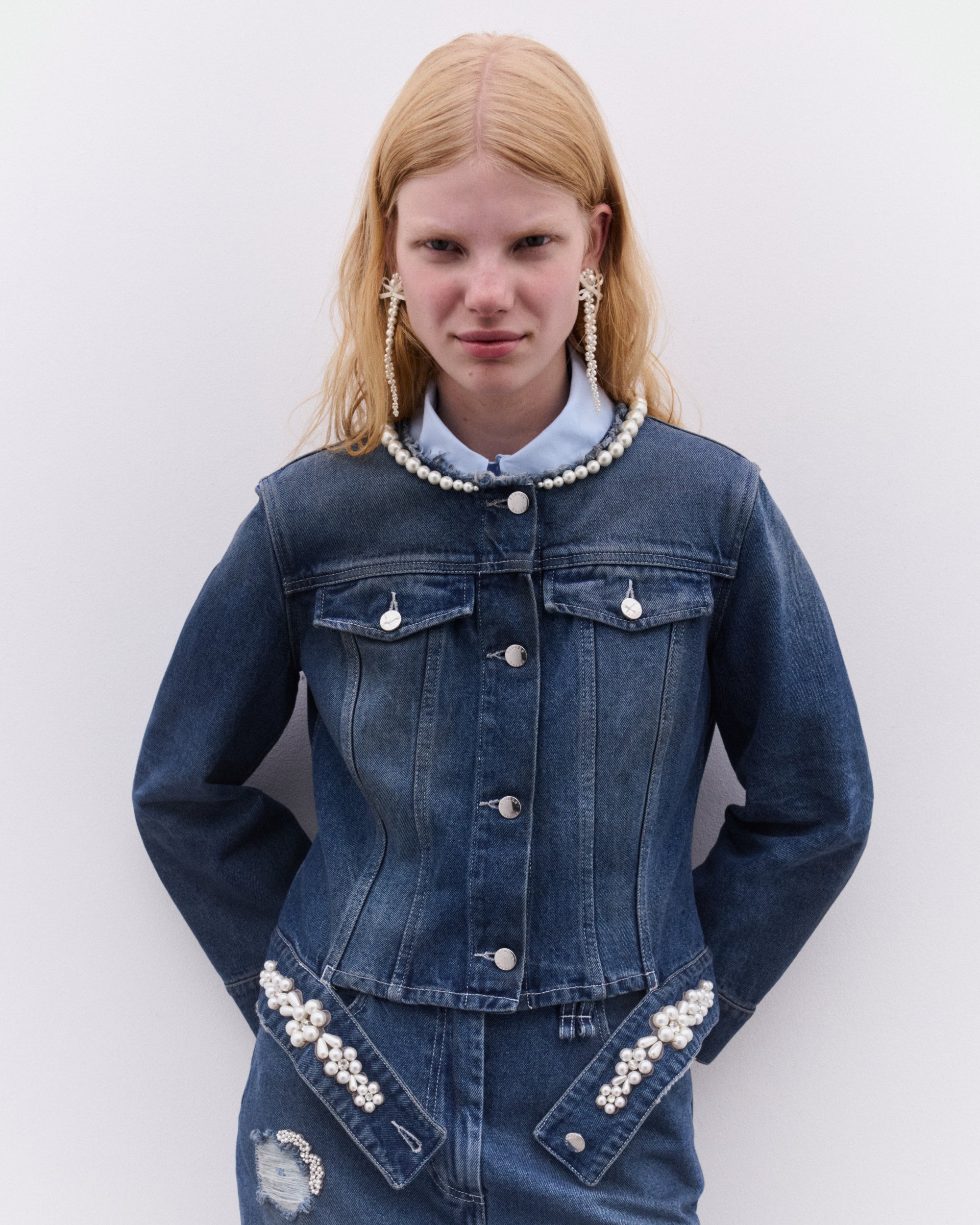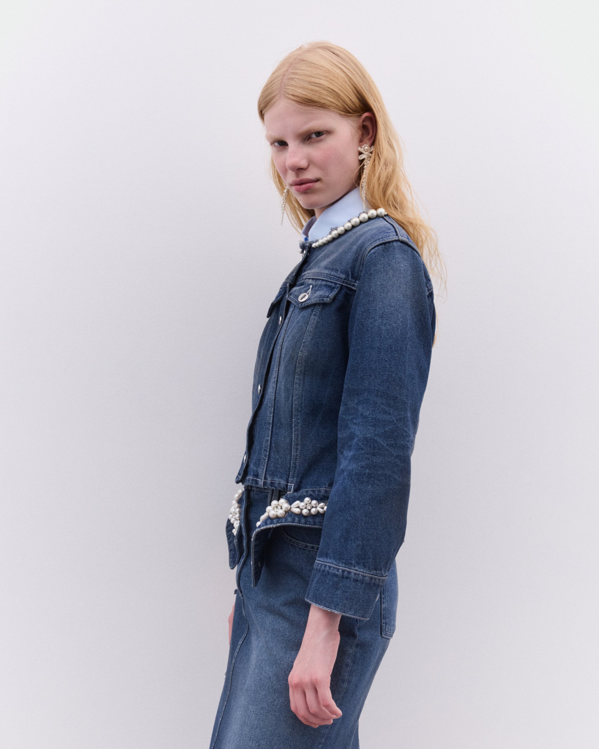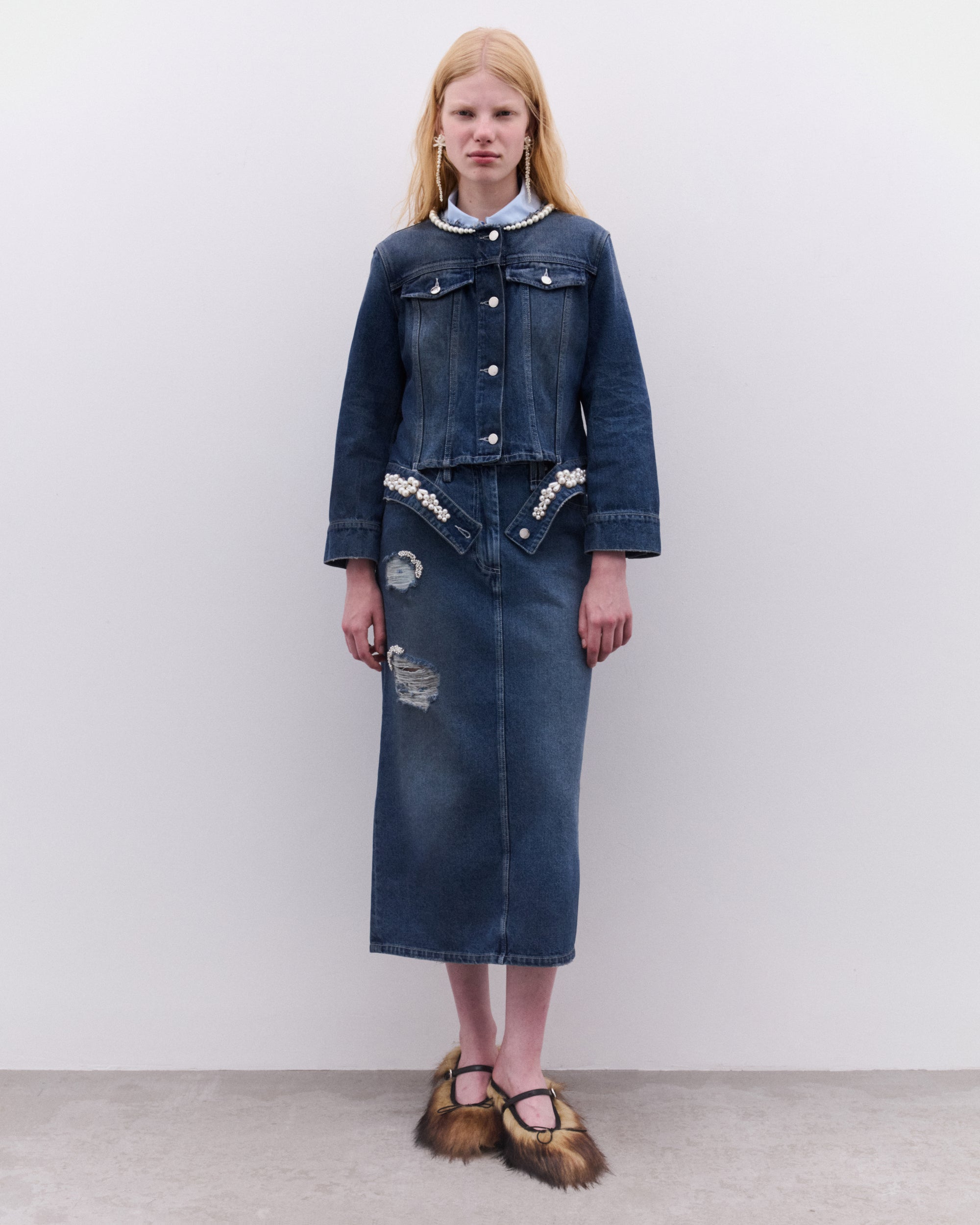 Signature embellishmentBeaded label at backDetachable hem detailFlap and side pocketsButton closureSlim fit