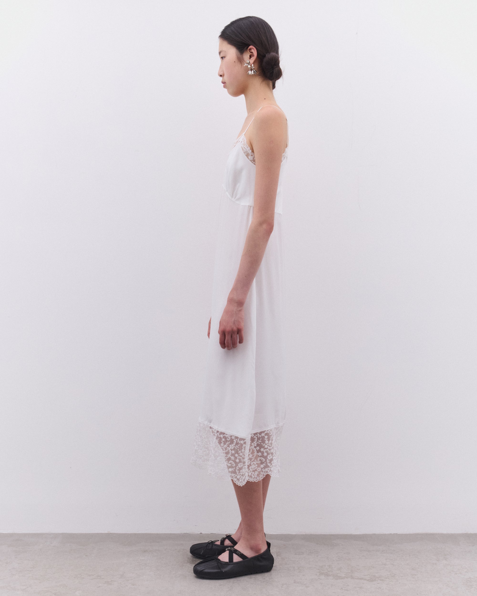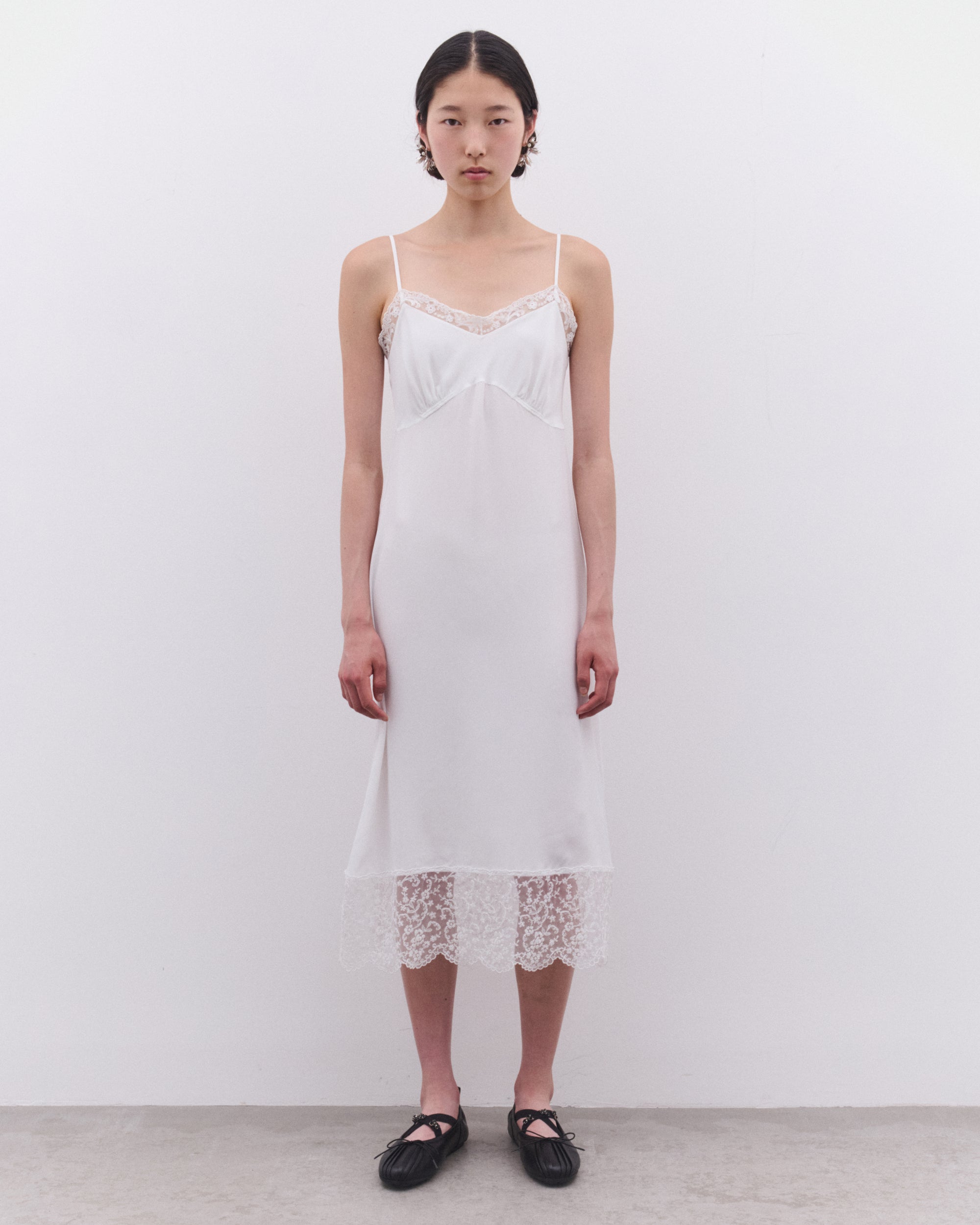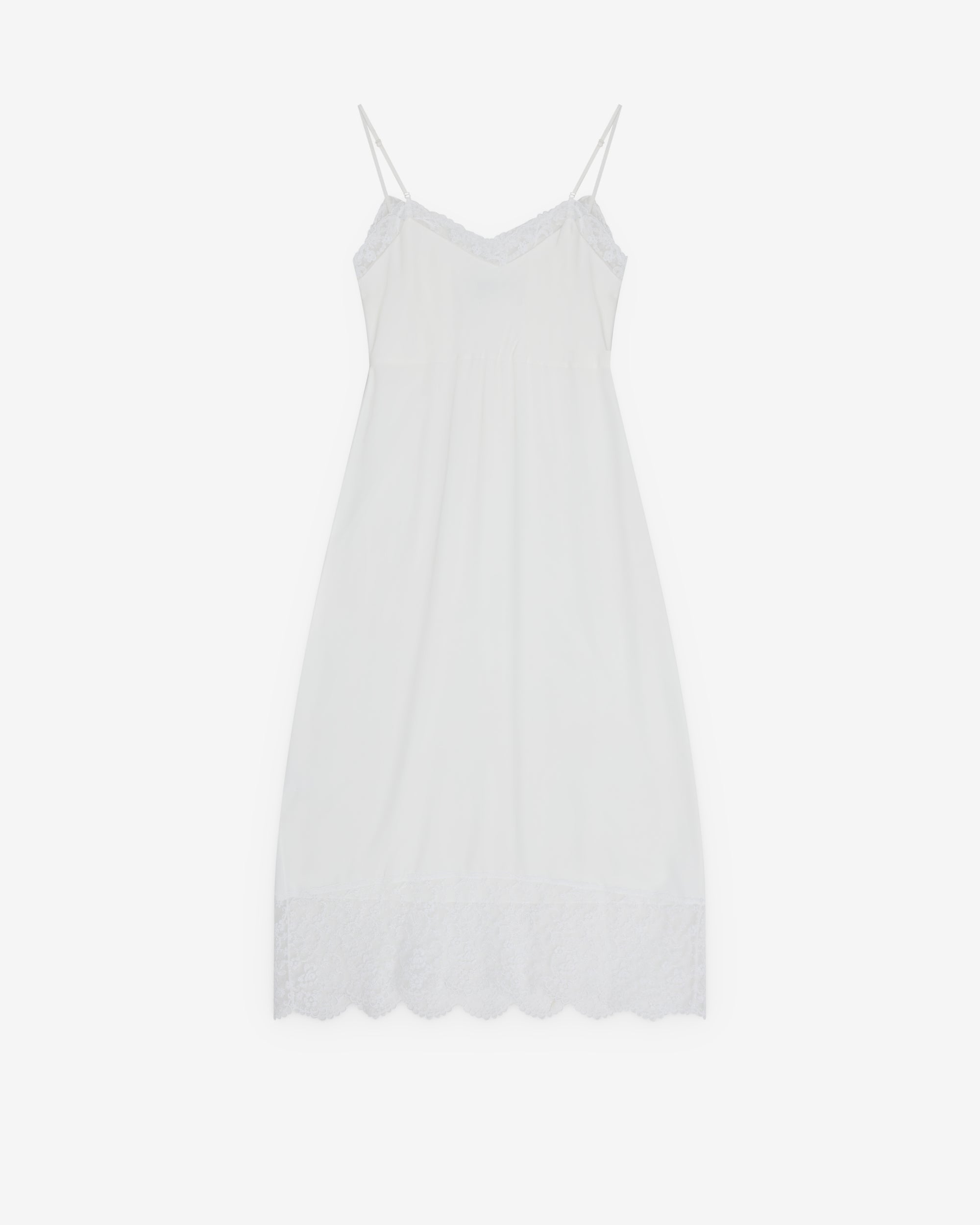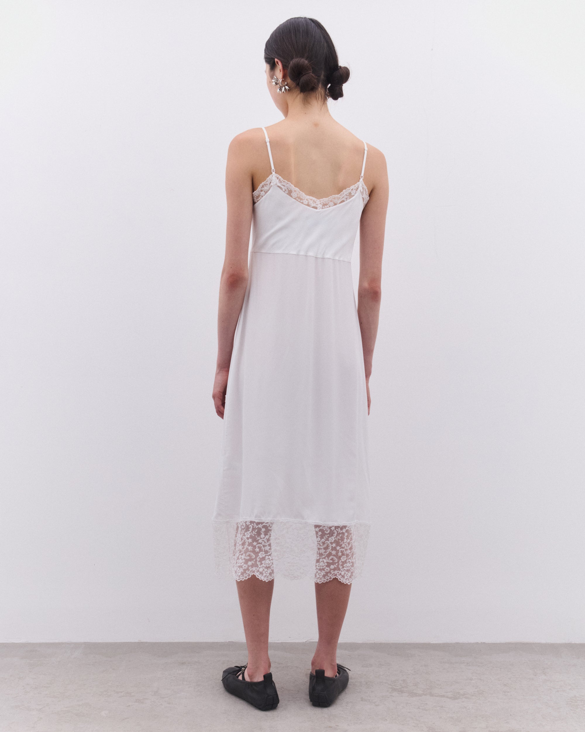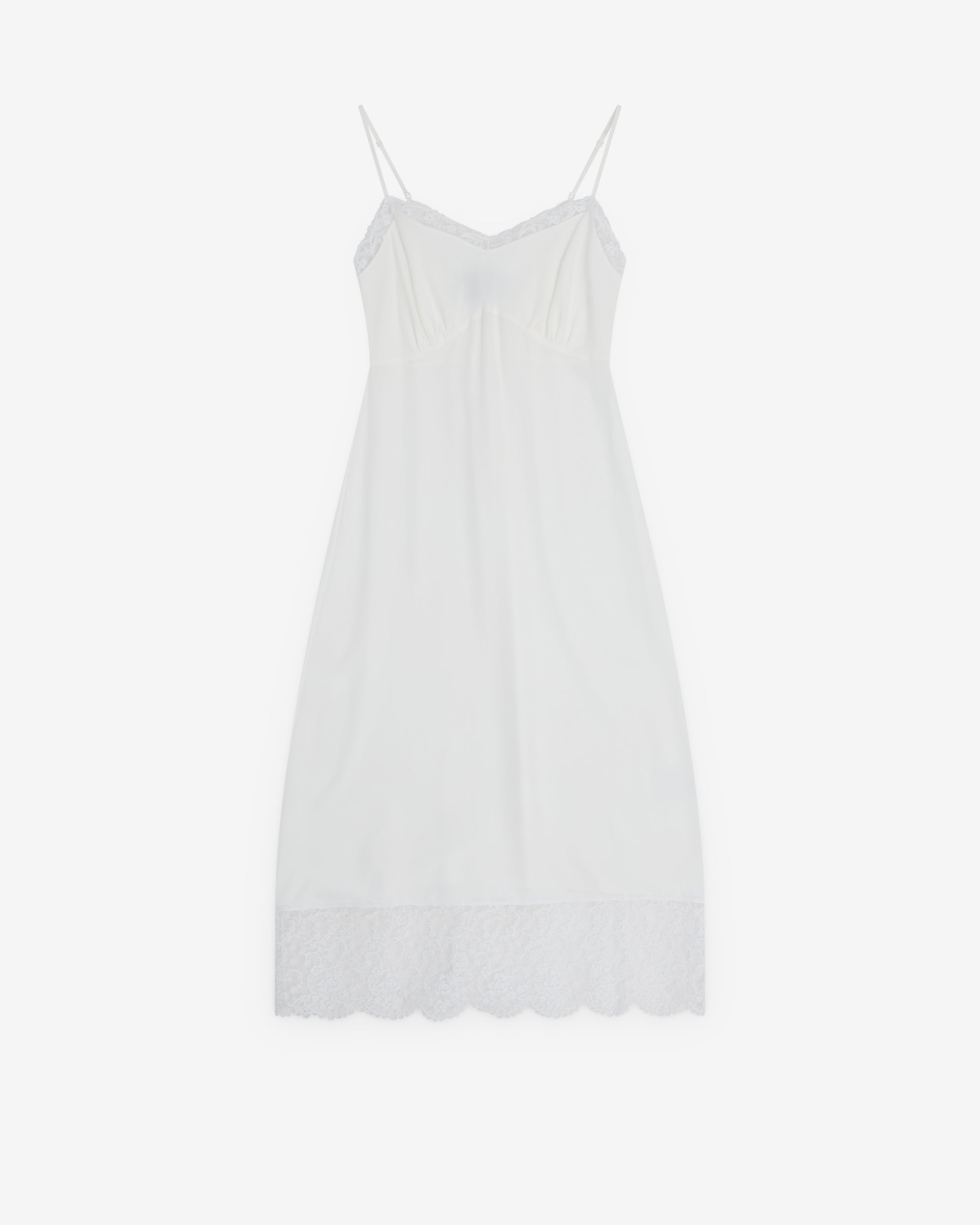 Slim strapsLace trim at neckline and hemEmpire waistline with gathering at bustA-line silhouetteMid-length